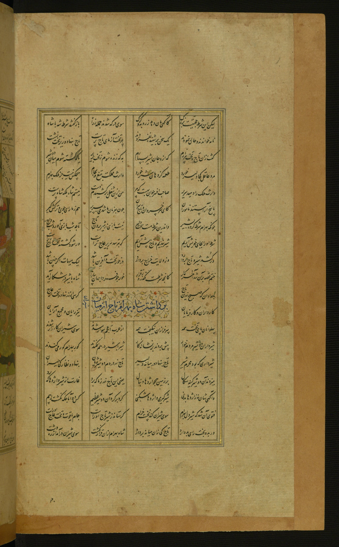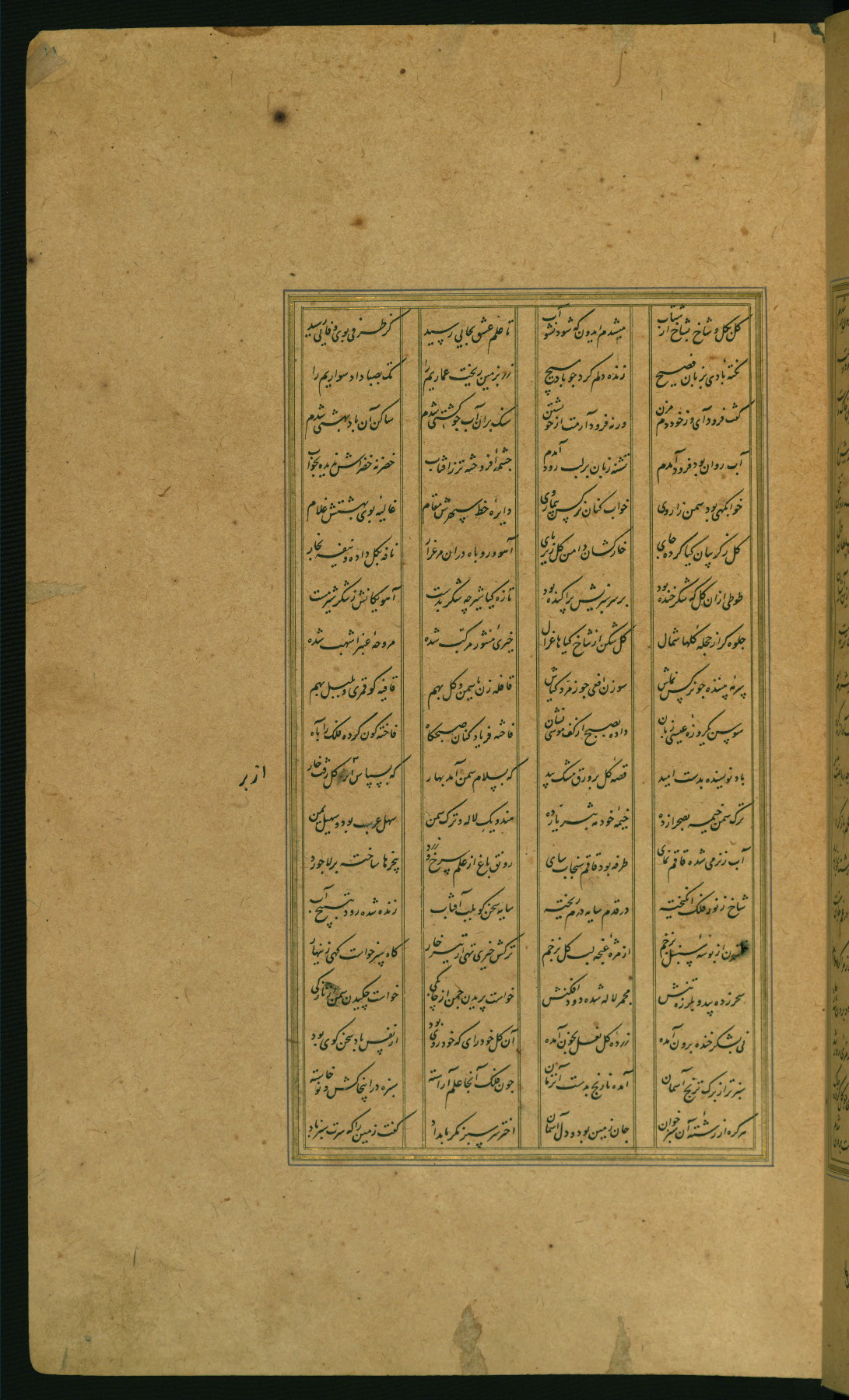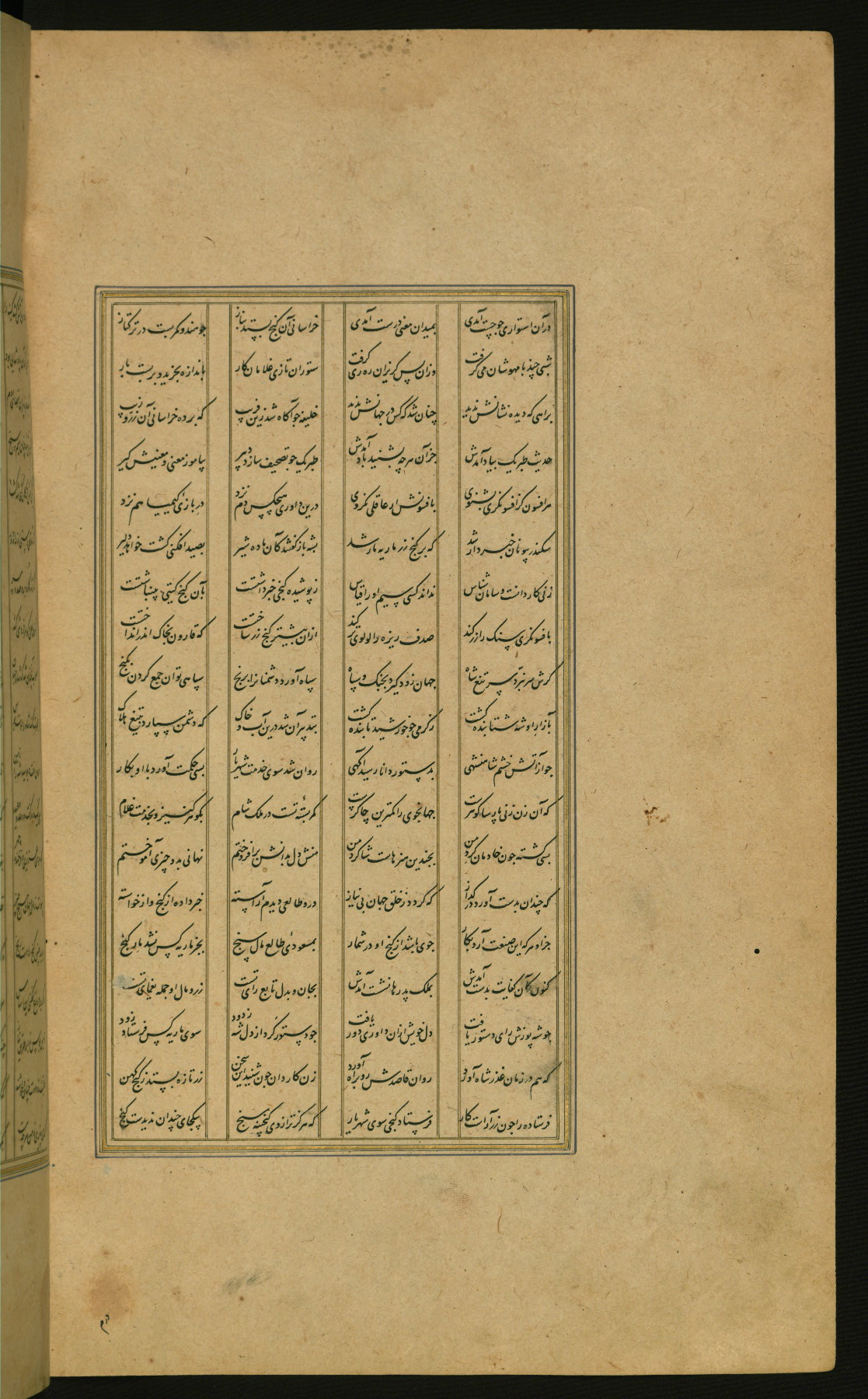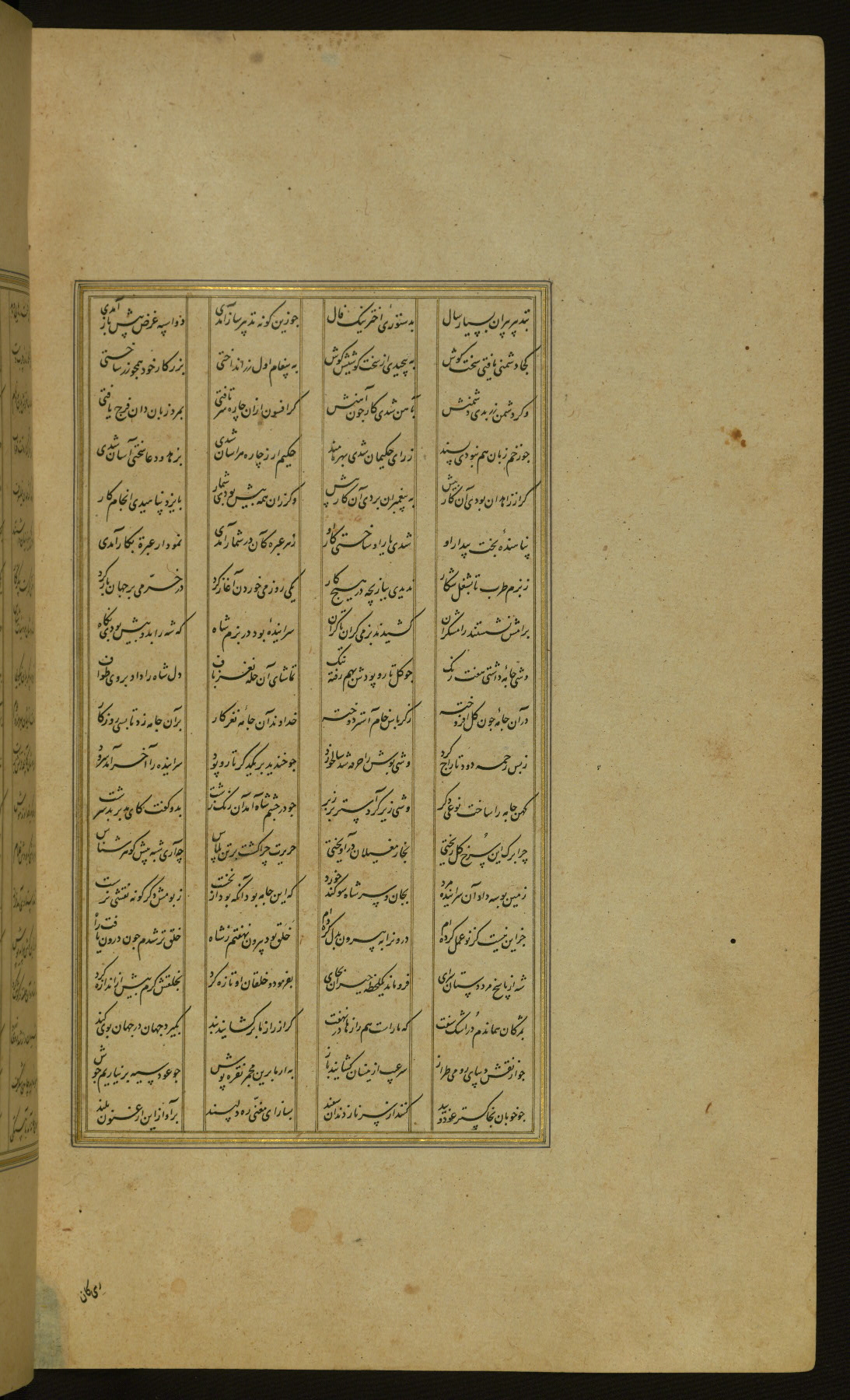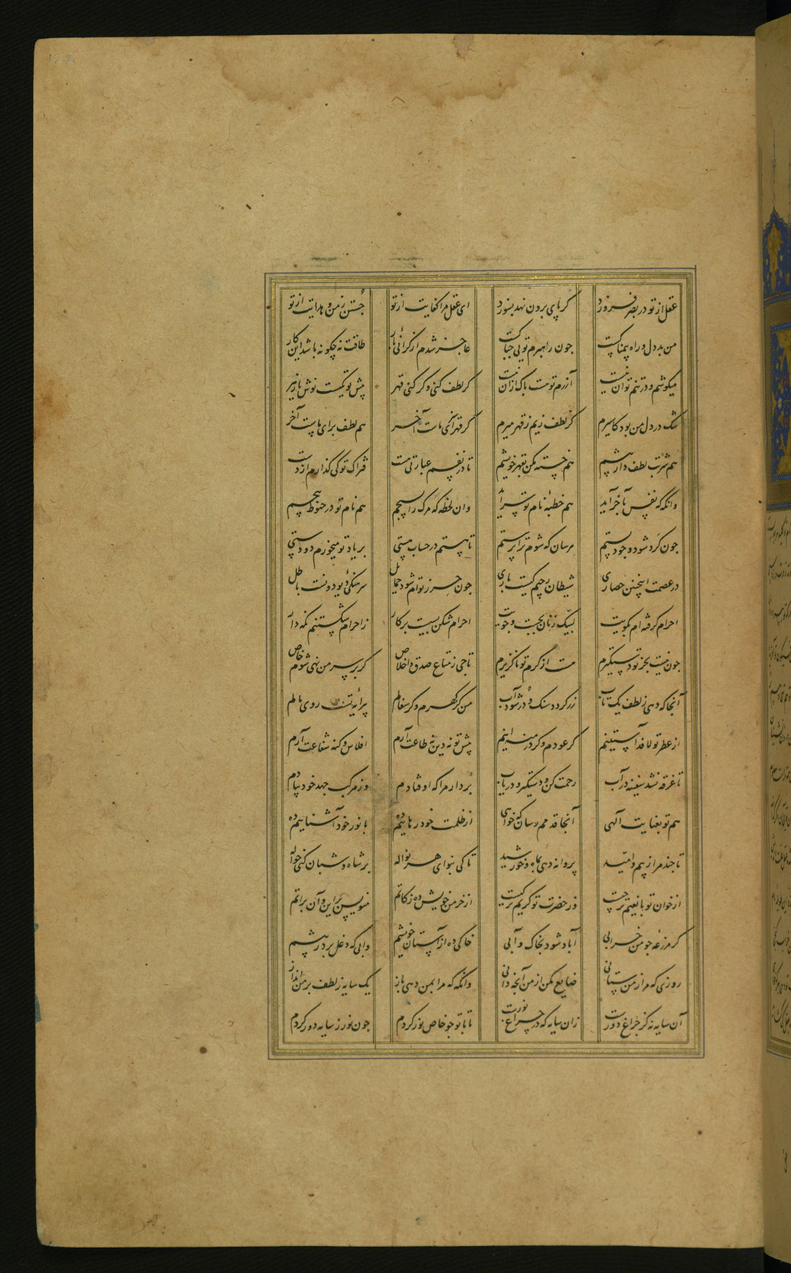 This illuminated and illustrated copy of the Khamsah (quintet) of Niẓāmī Ganjavī (d. 605 AH / 1209 CE) was written by Yār Muḥammad al-Haravī in 922 AH / 1516 CE. Written in four columns in black nastaʿlīq script, this manuscript opens with a double-page illuminated frontispiece signed by ʿAbd al-Wahhāb ibn ʿAbd al-Fattāḥ ibn ʿAlī. It contains thirty-five illustrations that were repainted in India during the twelfth century AH / eighteenth CE. The seal of Muḥammad Asharf ibn Muḥammad Khātam al-Ḥusaynī, dated 1173 AH / 1759-60 CE appears on fols. 1a and 401a. It is possible that the brown leather binding with center and side panels brushed with gold is original to the manuscript but was repaired at a later stage in the codex's history.