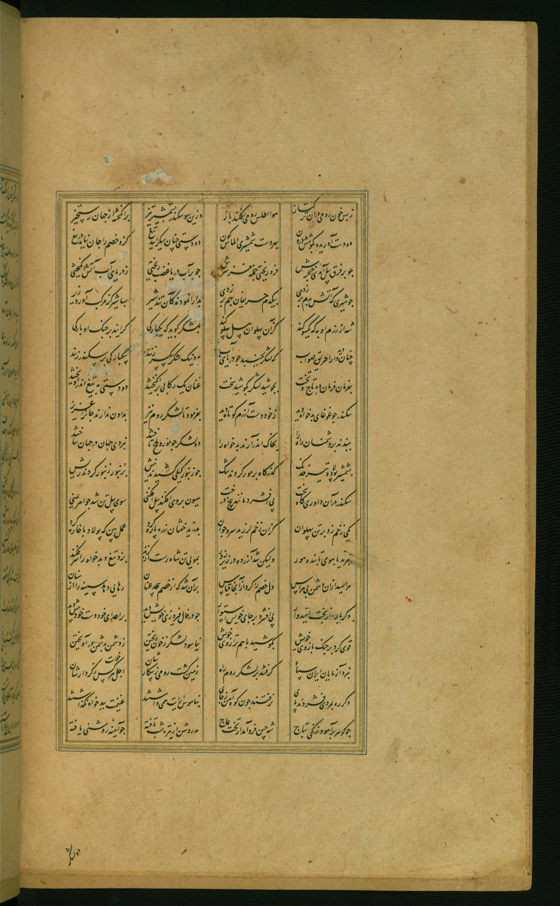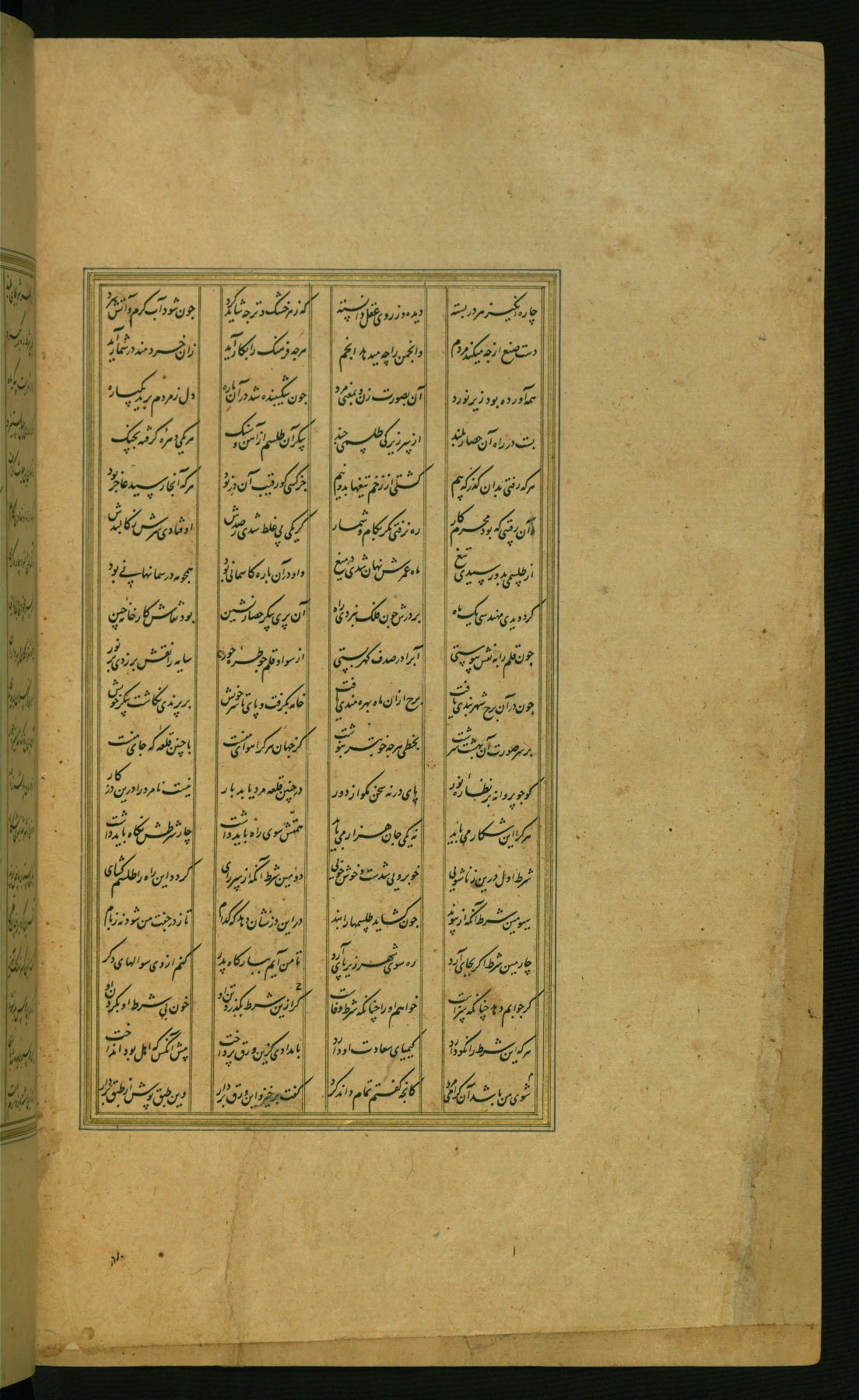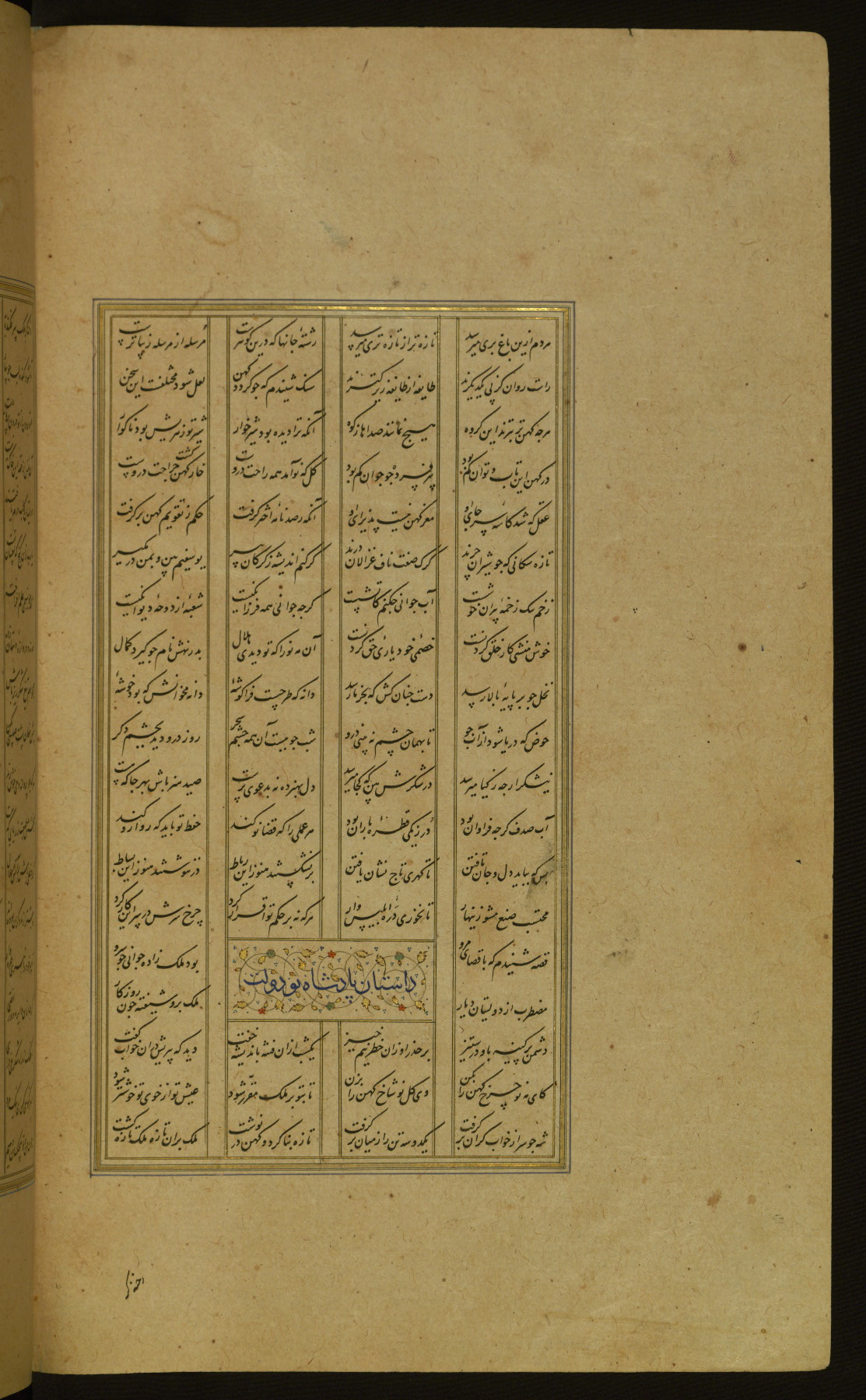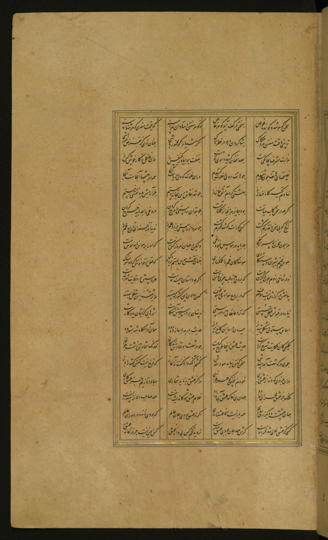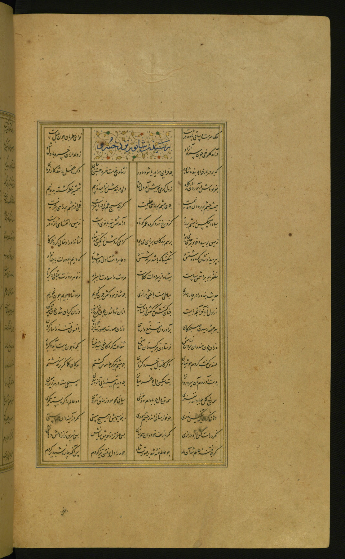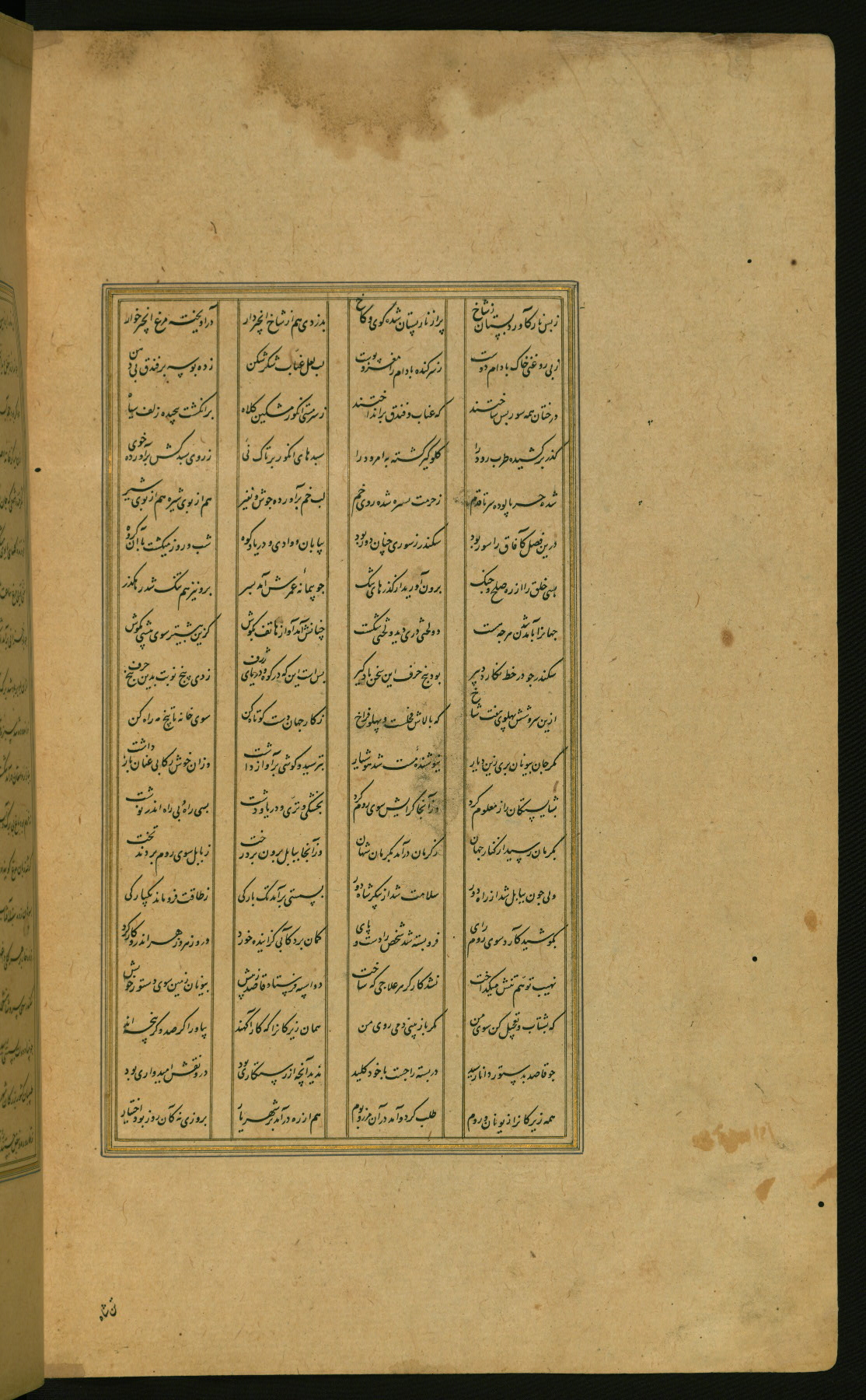 This illuminated and illustrated copy of the Khamsah (quintet) of Niẓāmī Ganjavī (d. 605 AH / 1209 CE) was written by Yār Muḥammad al-Haravī in 922 AH / 1516 CE. Written in four columns in black nastaʿlīq script, this manuscript opens with a double-page illuminated frontispiece signed by ʿAbd al-Wahhāb ibn ʿAbd al-Fattāḥ ibn ʿAlī. It contains thirty-five illustrations that were repainted in India during the twelfth century AH / eighteenth CE. The seal of Muḥammad Asharf ibn Muḥammad Khātam al-Ḥusaynī, dated 1173 AH / 1759-60 CE appears on fols. 1a and 401a. It is possible that the brown leather binding with center and side panels brushed with gold is original to the manuscript but was repaired at a later stage in the codex's history.