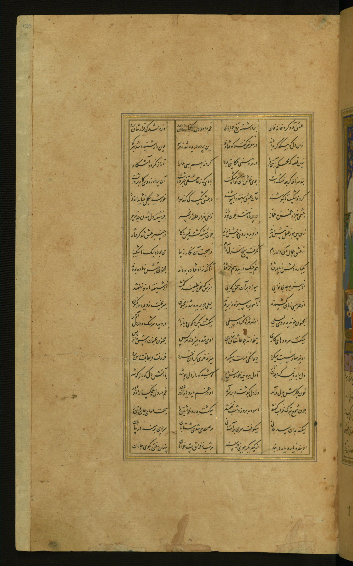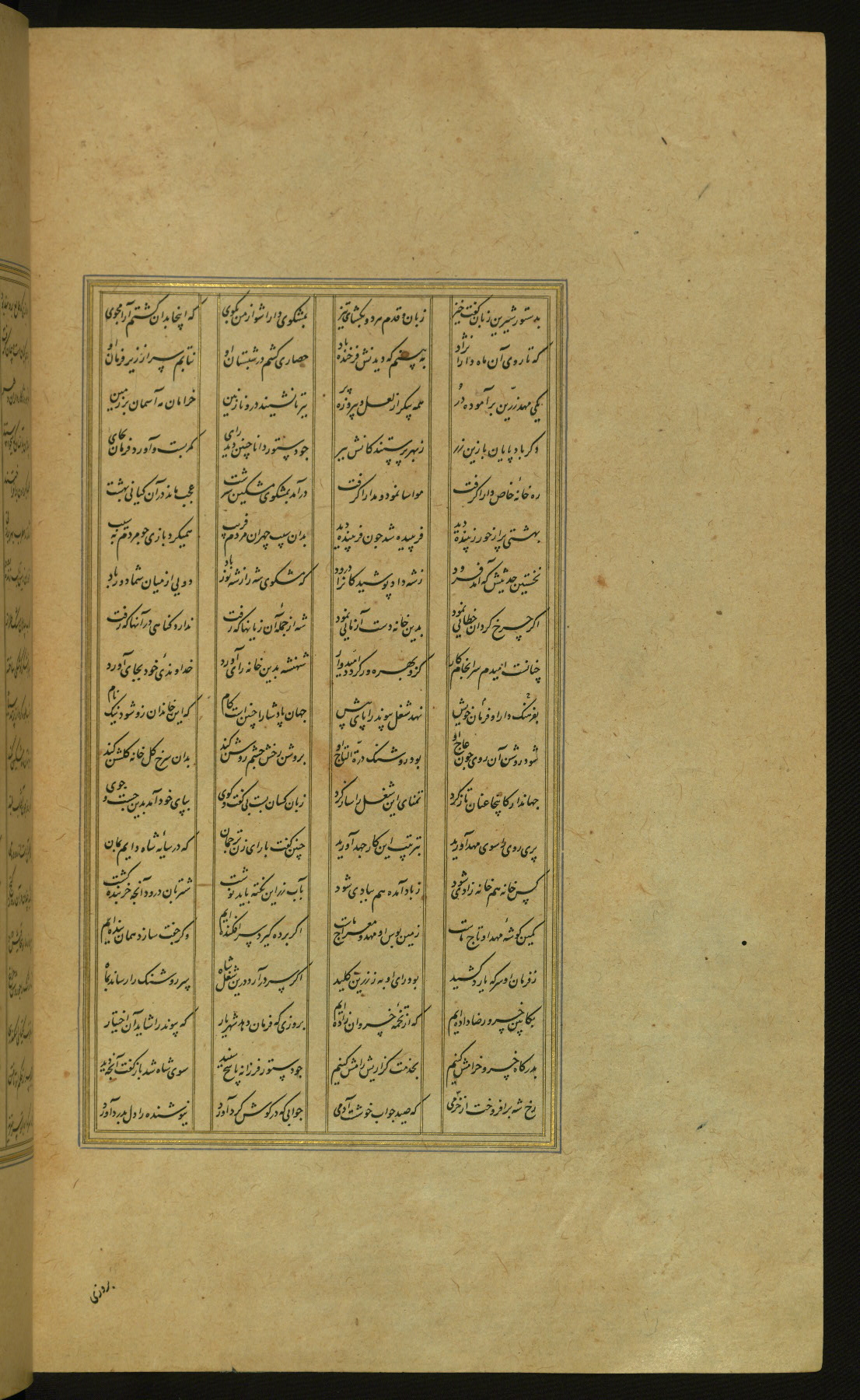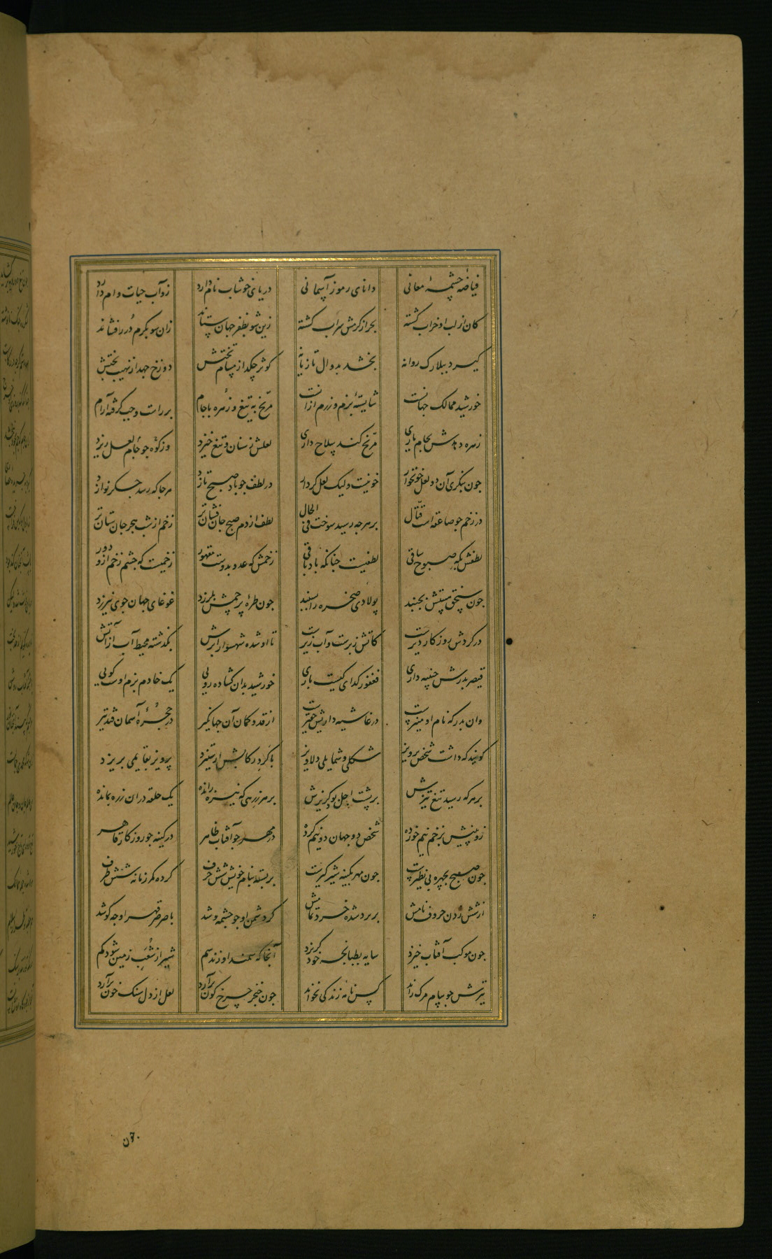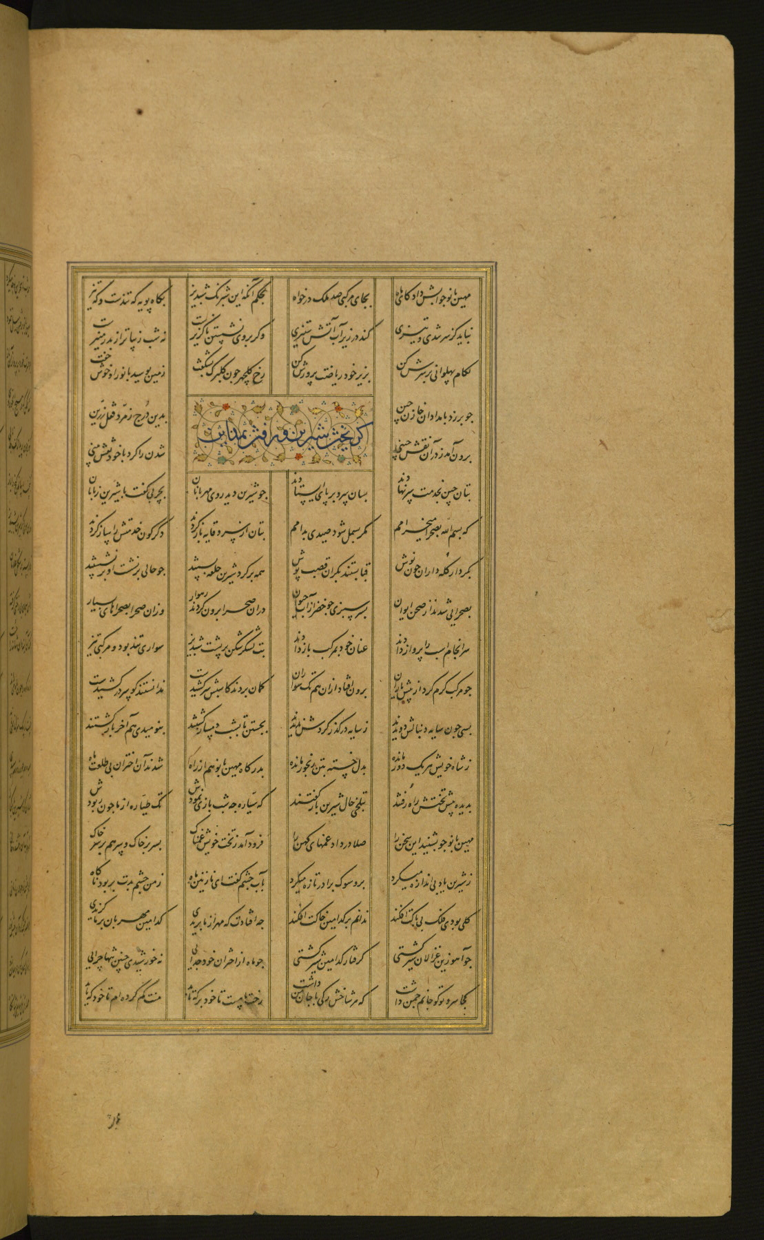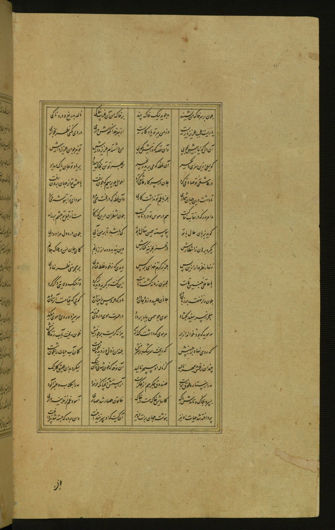 This illuminated and illustrated copy of the Khamsah (quintet) of Niẓāmī Ganjavī (d. 605 AH / 1209 CE) was written by Yār Muḥammad al-Haravī in 922 AH / 1516 CE. Written in four columns in black nastaʿlīq script, this manuscript opens with a double-page illuminated frontispiece signed by ʿAbd al-Wahhāb ibn ʿAbd al-Fattāḥ ibn ʿAlī. It contains thirty-five illustrations that were repainted in India during the twelfth century AH / eighteenth CE. The seal of Muḥammad Asharf ibn Muḥammad Khātam al-Ḥusaynī, dated 1173 AH / 1759-60 CE appears on fols. 1a and 401a. It is possible that the brown leather binding with center and side panels brushed with gold is original to the manuscript but was repaired at a later stage in the codex's history.
