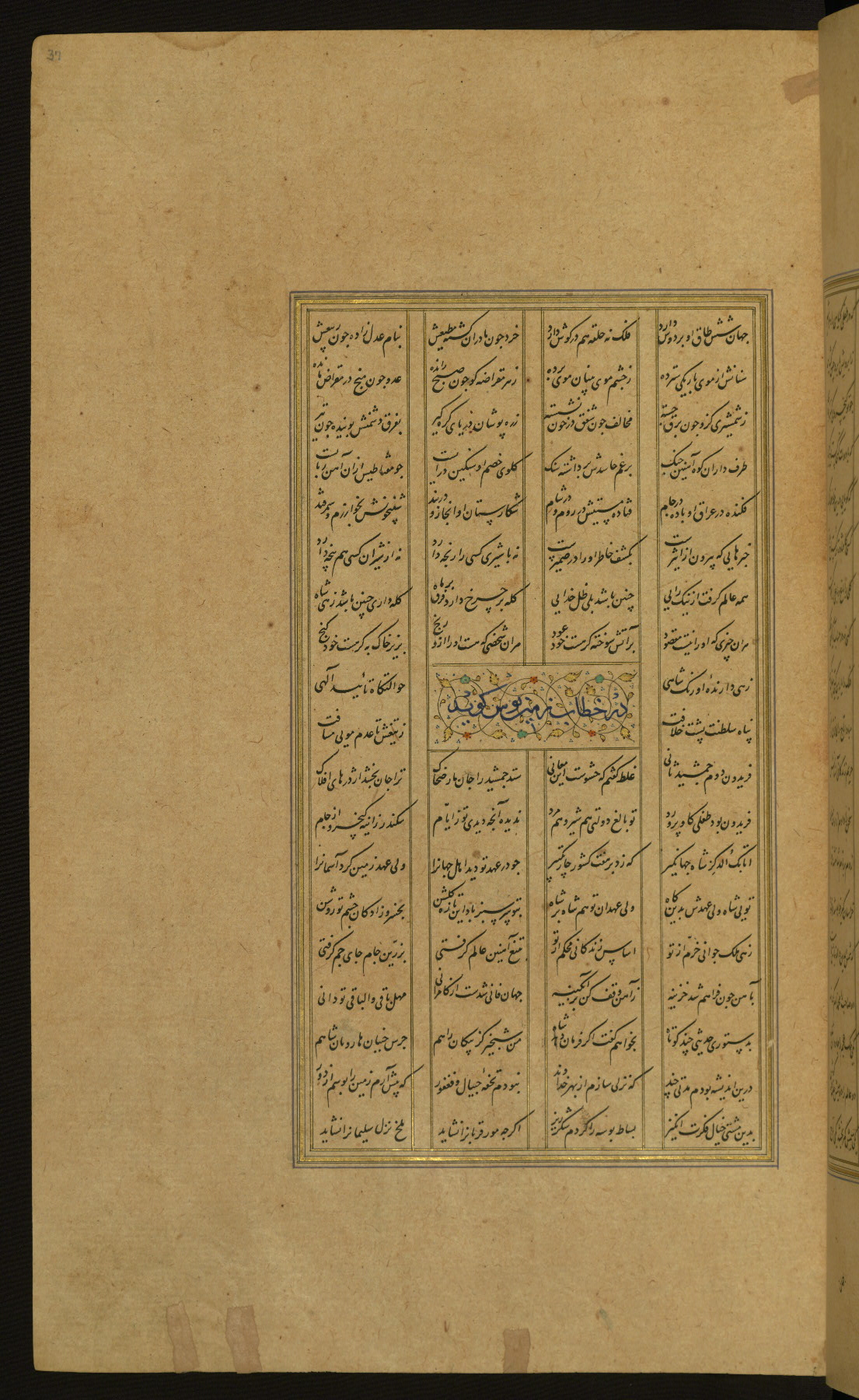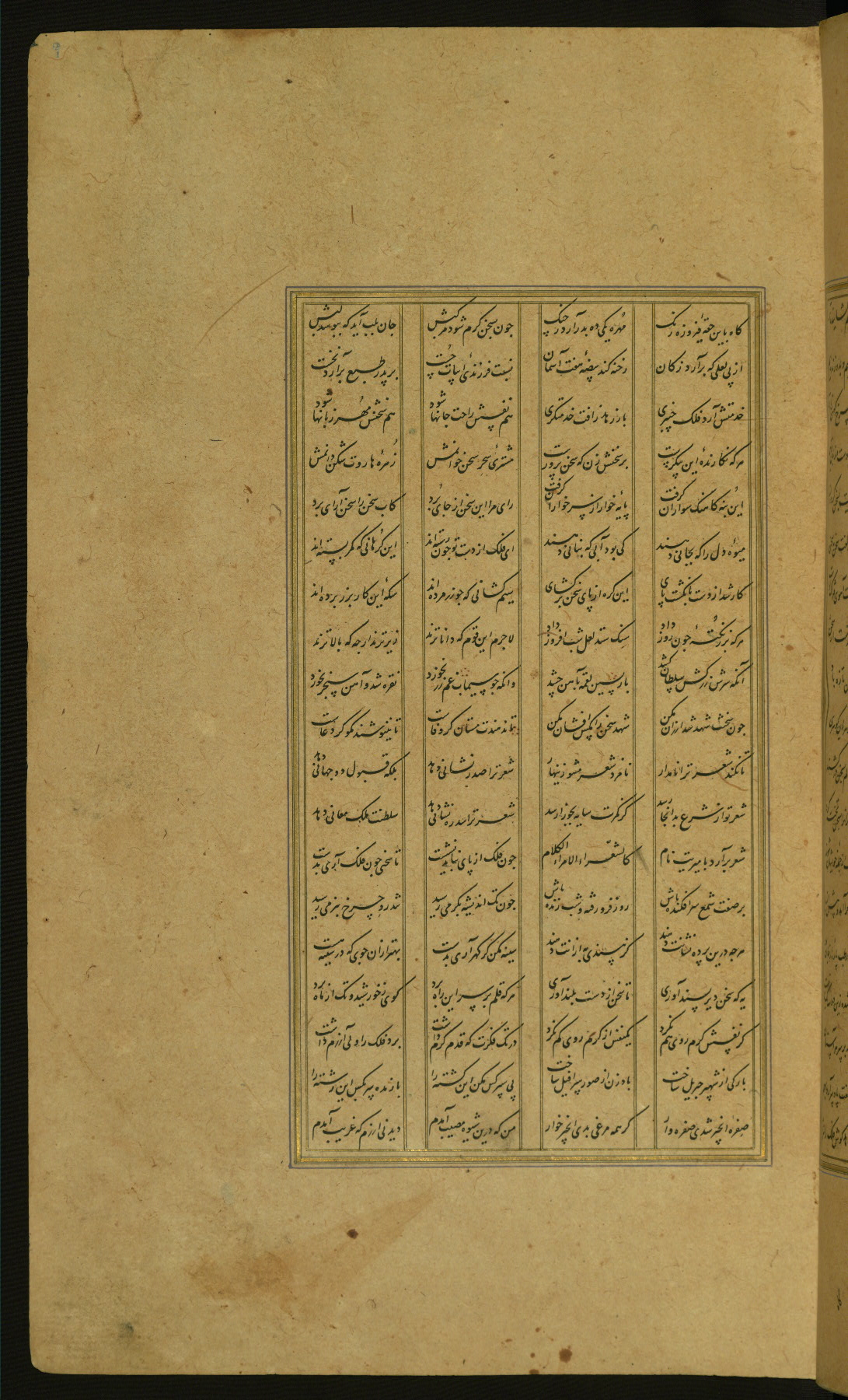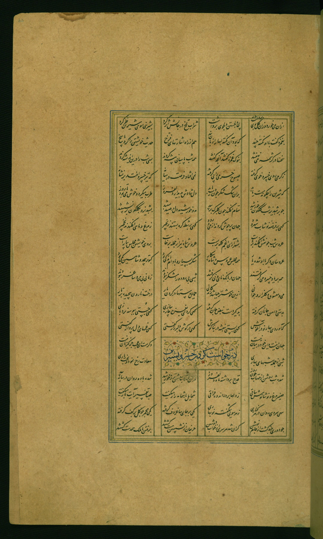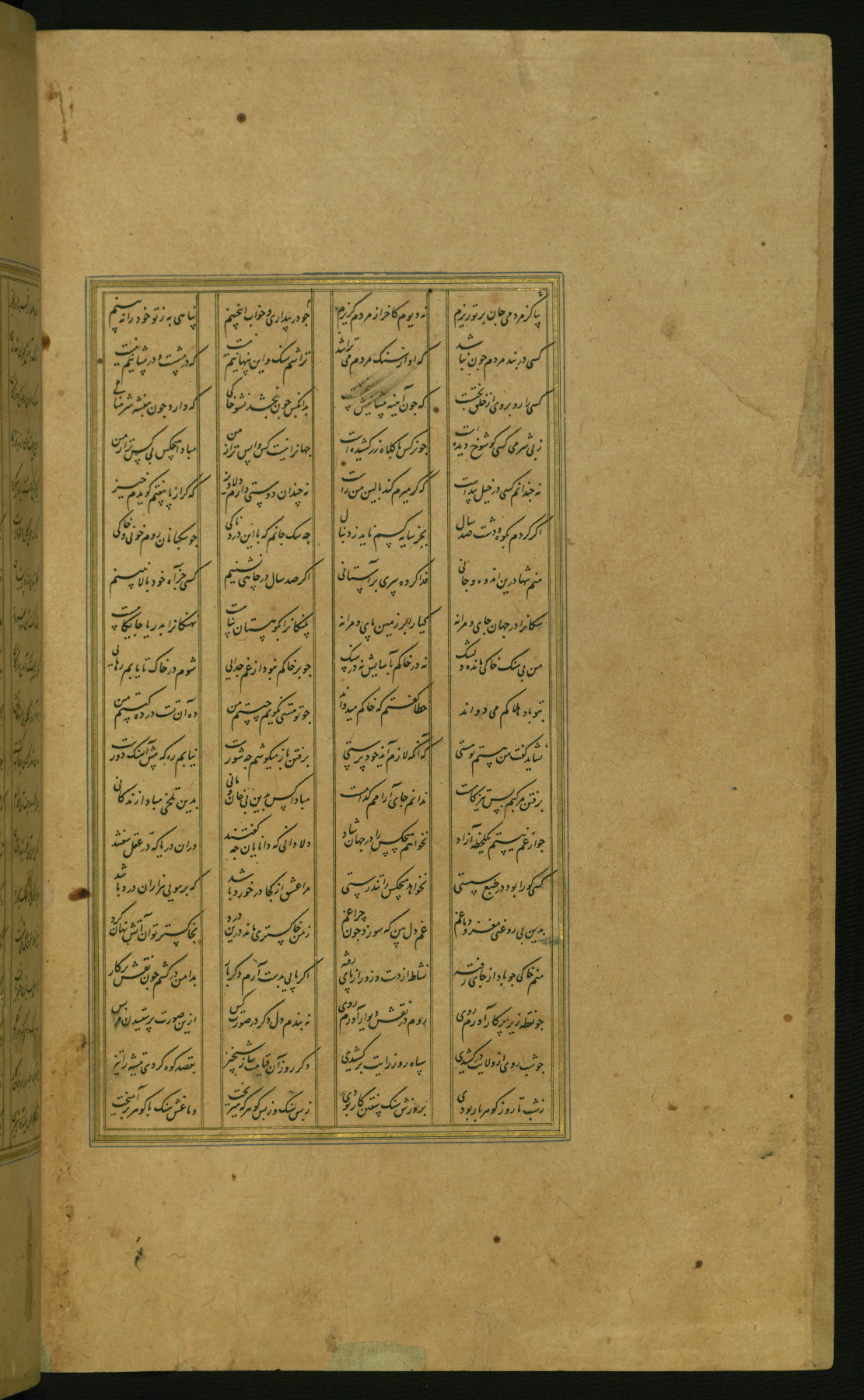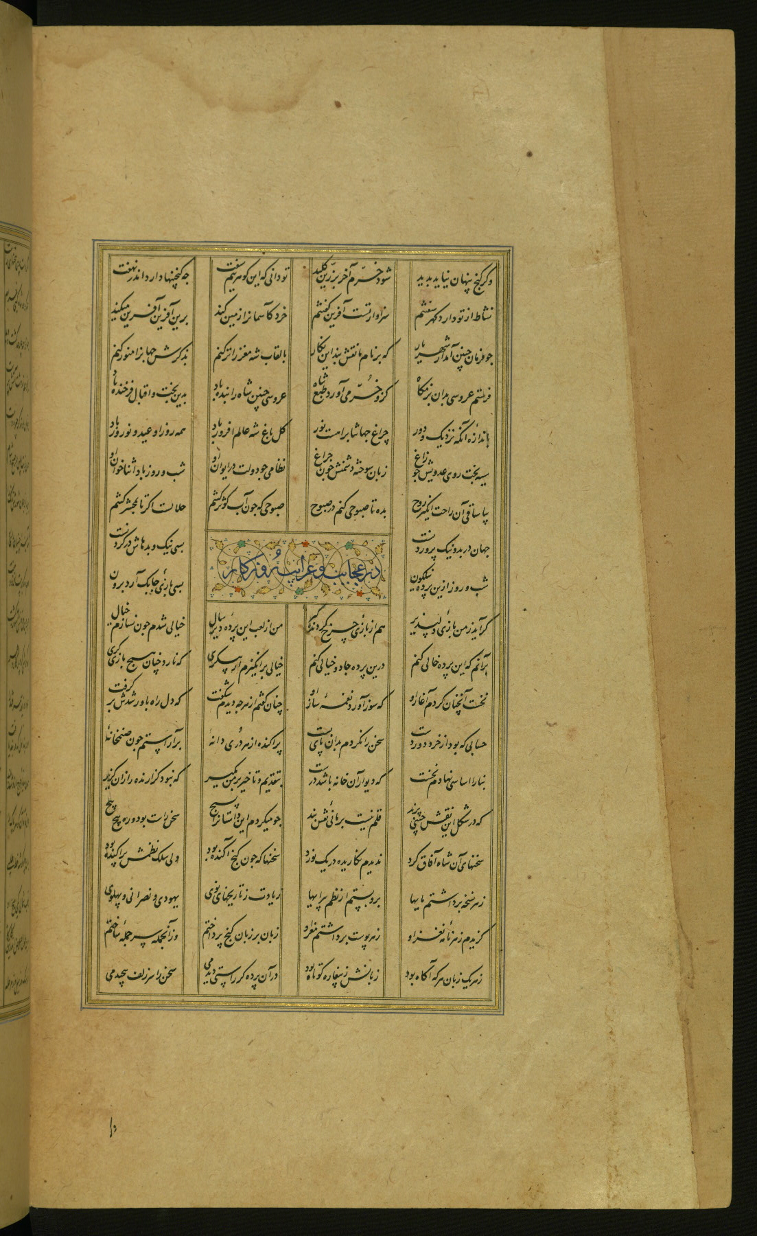 This illuminated and illustrated copy of the Khamsah (quintet) of Niẓāmī Ganjavī (d. 605 AH / 1209 CE) was written by Yār Muḥammad al-Haravī in 922 AH / 1516 CE. Written in four columns in black nastaʿlīq script, this manuscript opens with a double-page illuminated frontispiece signed by ʿAbd al-Wahhāb ibn ʿAbd al-Fattāḥ ibn ʿAlī. It contains thirty-five illustrations that were repainted in India during the twelfth century AH / eighteenth CE. The seal of Muḥammad Asharf ibn Muḥammad Khātam al-Ḥusaynī, dated 1173 AH / 1759-60 CE appears on fols. 1a and 401a. It is possible that the brown leather binding with center and side panels brushed with gold is original to the manuscript but was repaired at a later stage in the codex's history.
