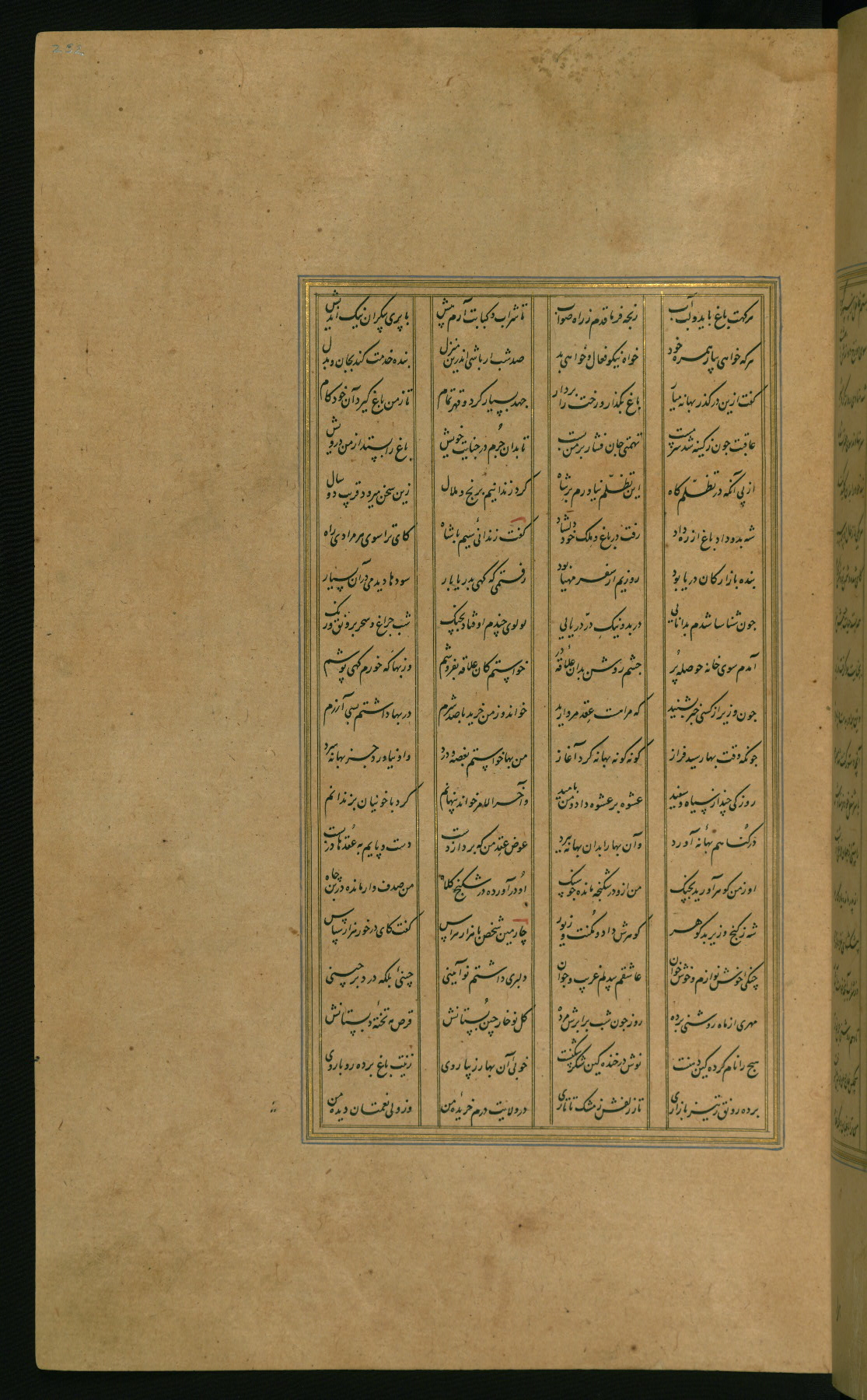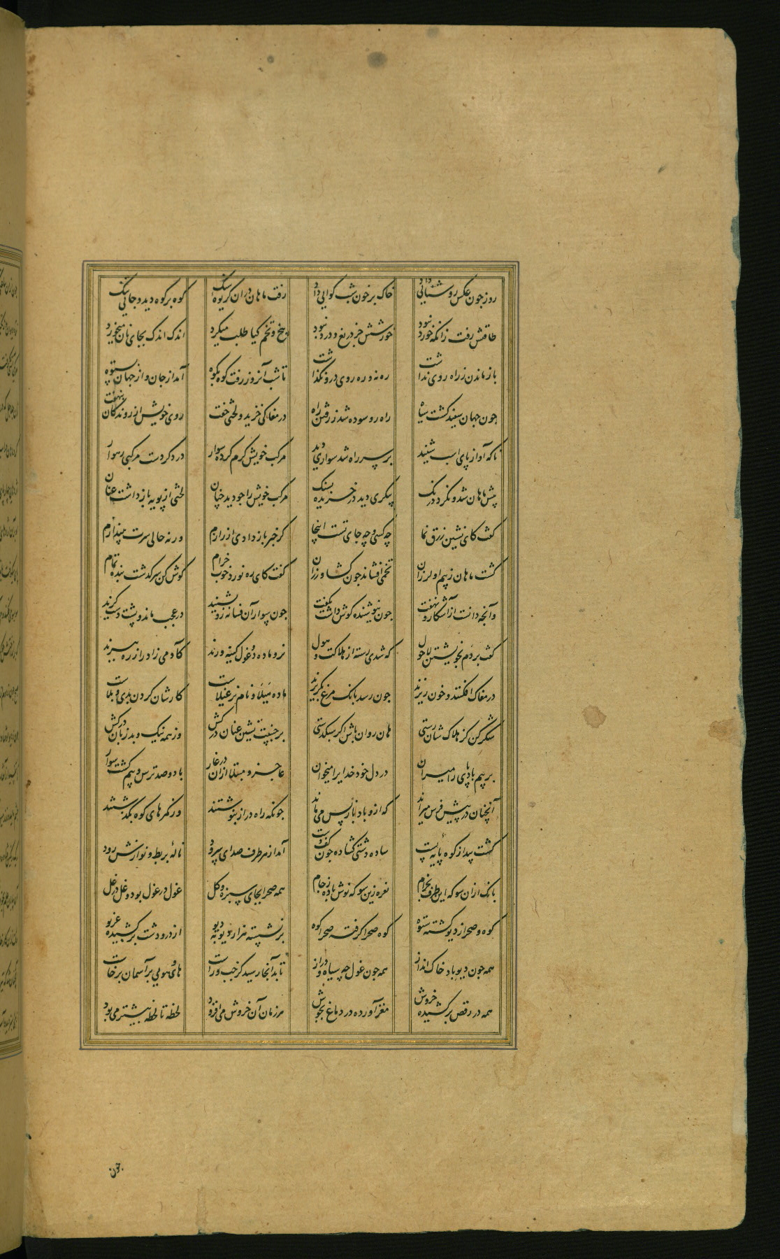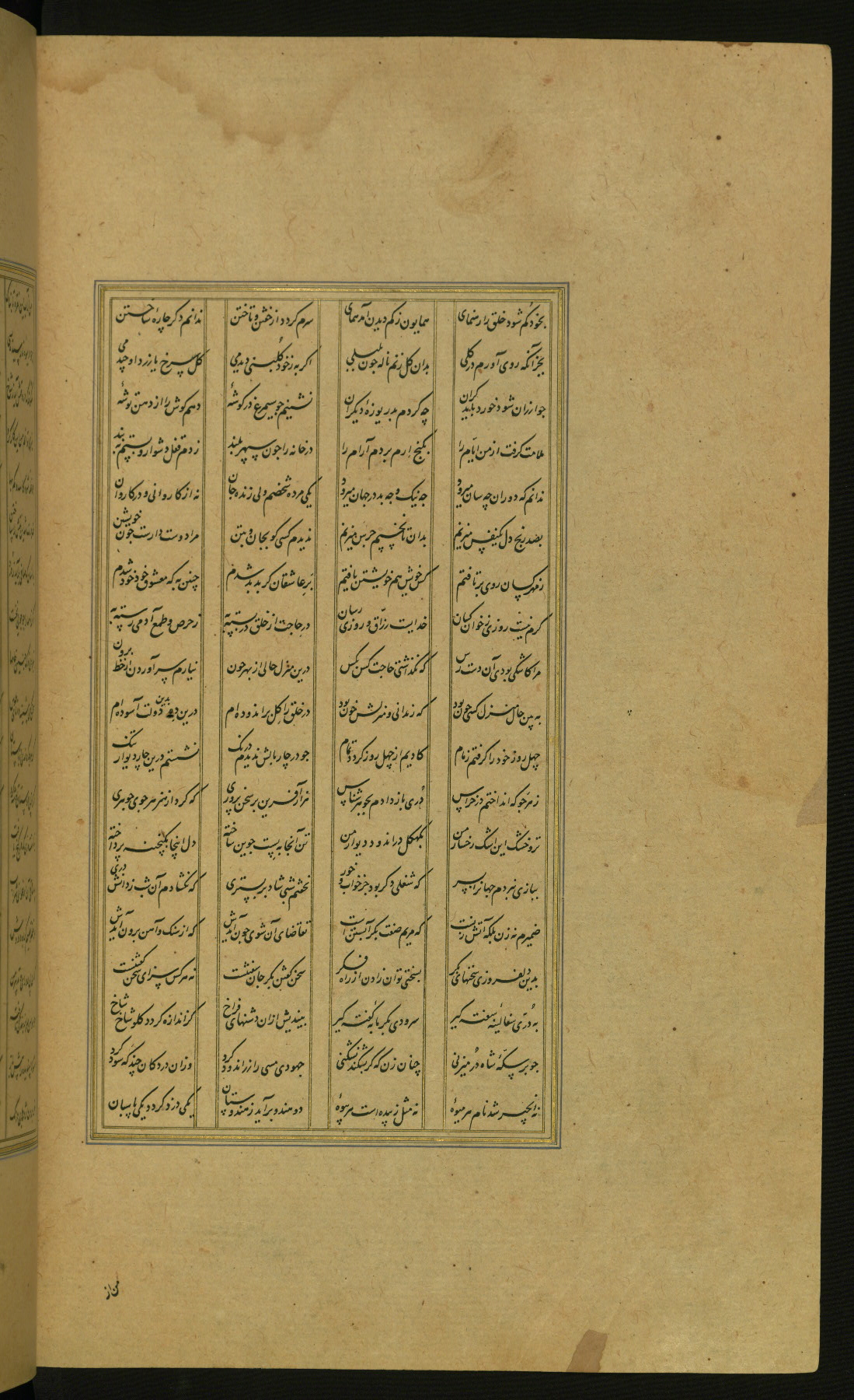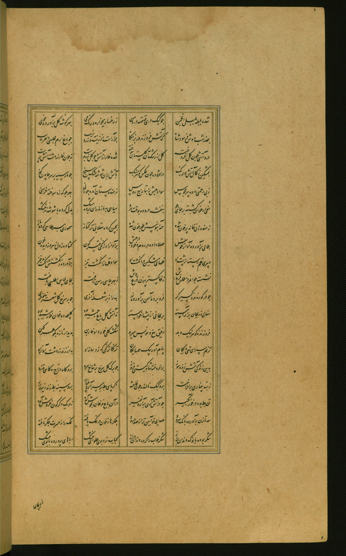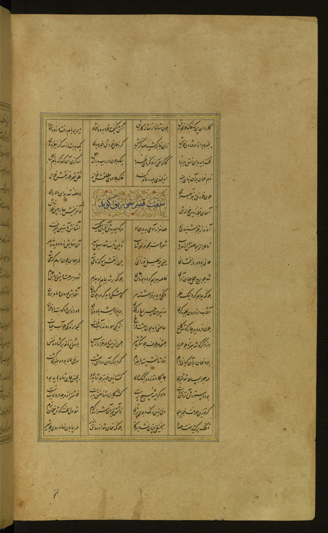 This illuminated and illustrated copy of the Khamsah (quintet) of Niẓāmī Ganjavī (d. 605 AH / 1209 CE) was written by Yār Muḥammad al-Haravī in 922 AH / 1516 CE. Written in four columns in black nastaʿlīq script, this manuscript opens with a double-page illuminated frontispiece signed by ʿAbd al-Wahhāb ibn ʿAbd al-Fattāḥ ibn ʿAlī. It contains thirty-five illustrations that were repainted in India during the twelfth century AH / eighteenth CE. The seal of Muḥammad Asharf ibn Muḥammad Khātam al-Ḥusaynī, dated 1173 AH / 1759-60 CE appears on fols. 1a and 401a. It is possible that the brown leather binding with center and side panels brushed with gold is original to the manuscript but was repaired at a later stage in the codex's history.