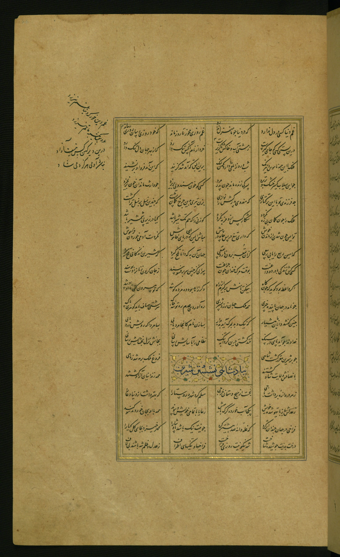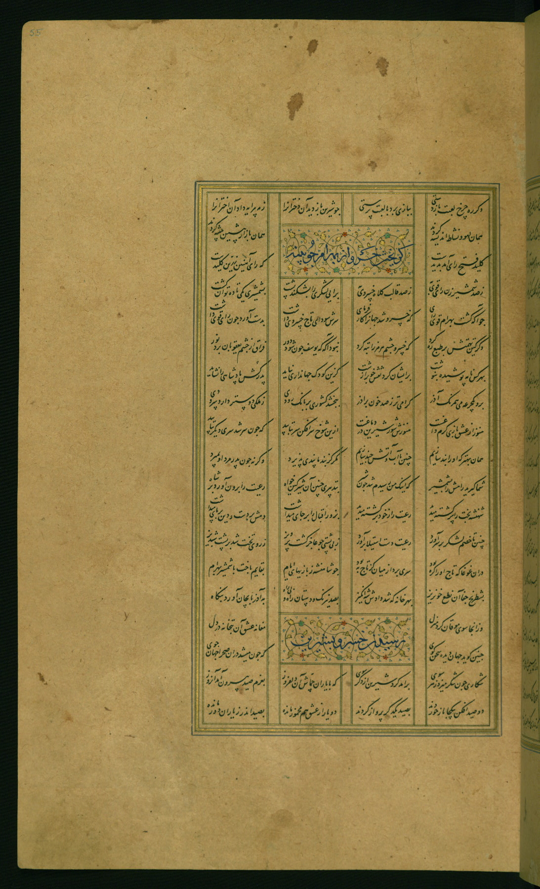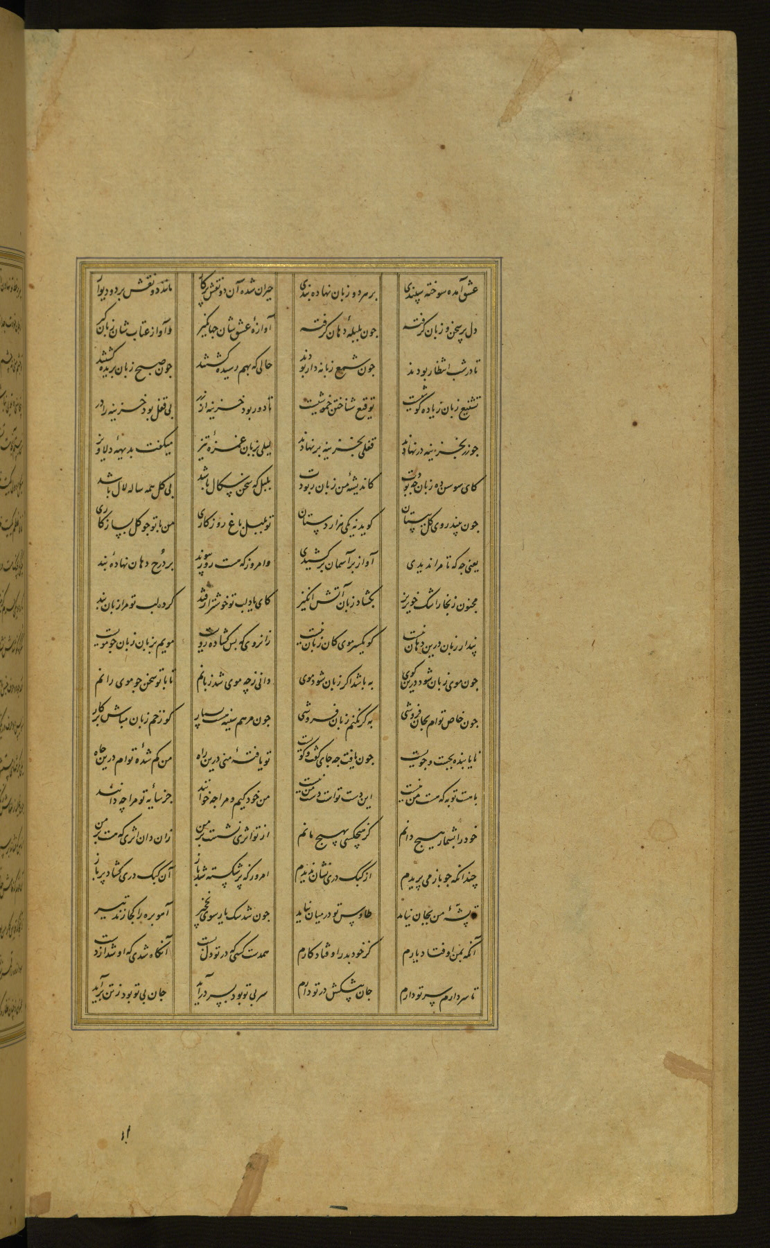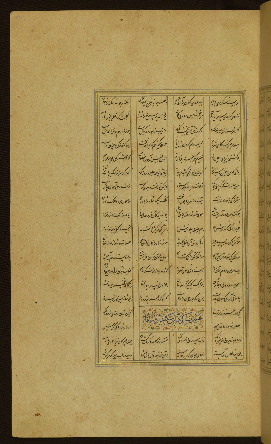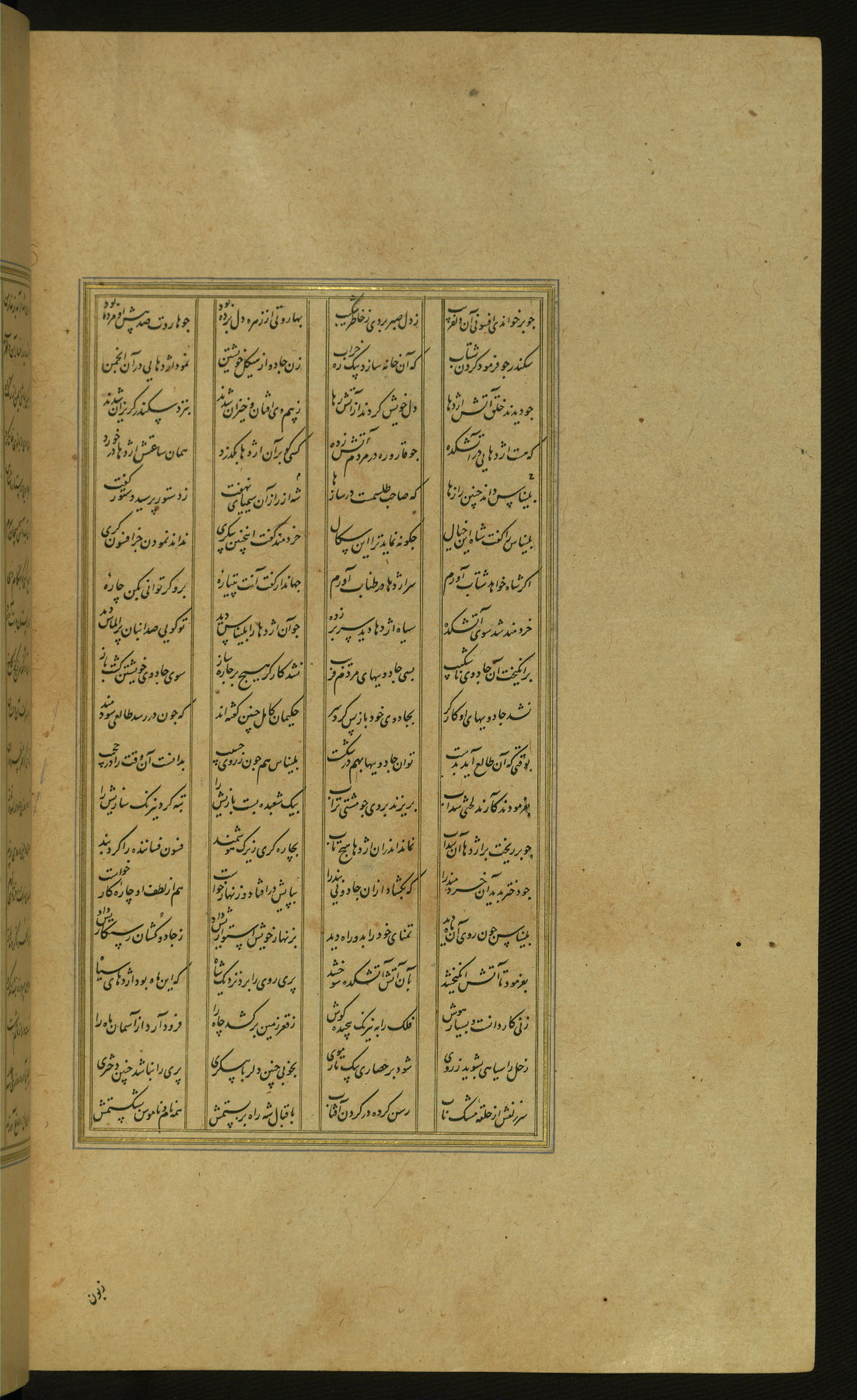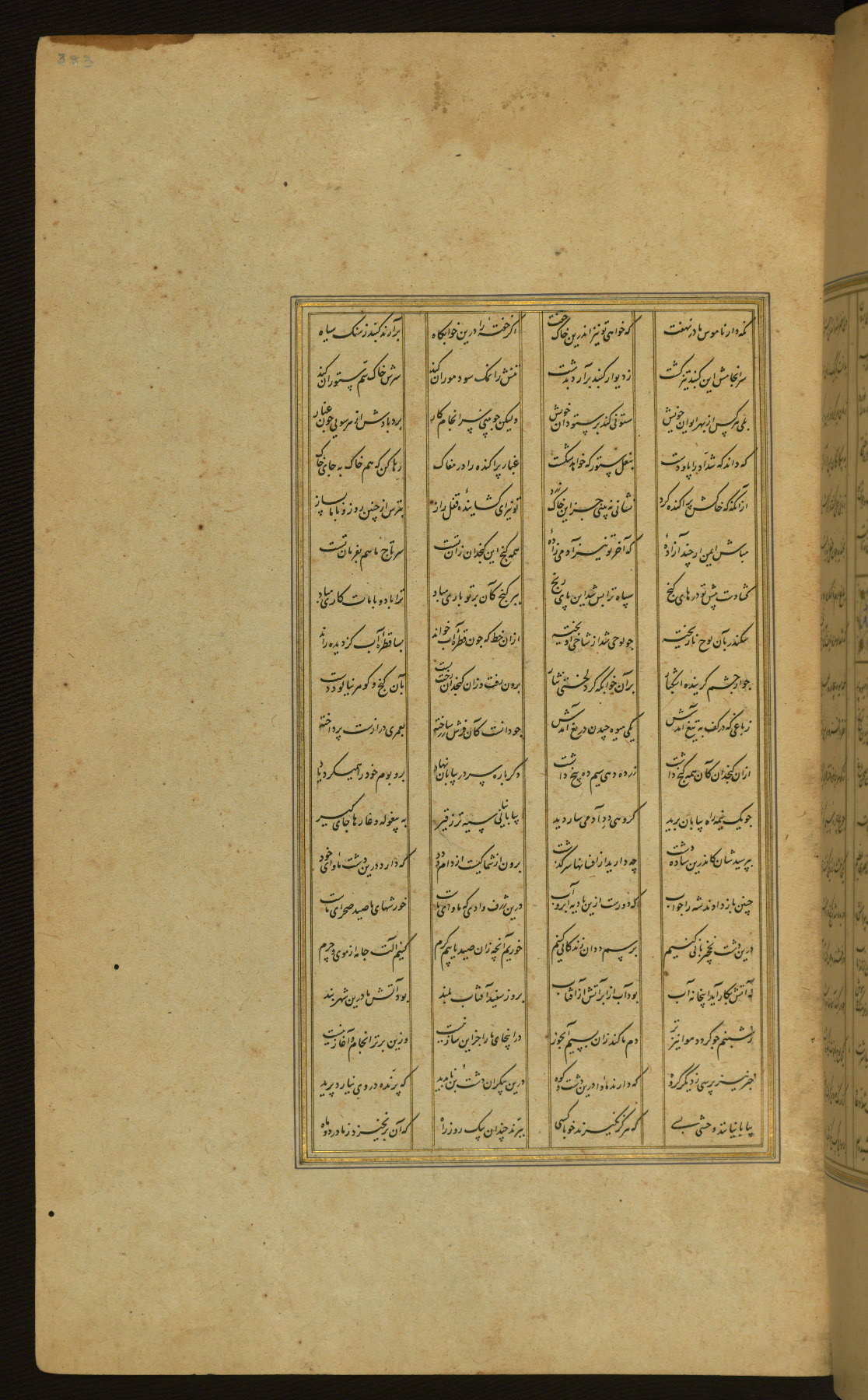 This illuminated and illustrated copy of the Khamsah (quintet) of Niẓāmī Ganjavī (d. 605 AH / 1209 CE) was written by Yār Muḥammad al-Haravī in 922 AH / 1516 CE. Written in four columns in black nastaʿlīq script, this manuscript opens with a double-page illuminated frontispiece signed by ʿAbd al-Wahhāb ibn ʿAbd al-Fattāḥ ibn ʿAlī. It contains thirty-five illustrations that were repainted in India during the twelfth century AH / eighteenth CE. The seal of Muḥammad Asharf ibn Muḥammad Khātam al-Ḥusaynī, dated 1173 AH / 1759-60 CE appears on fols. 1a and 401a. It is possible that the brown leather binding with center and side panels brushed with gold is original to the manuscript but was repaired at a later stage in the codex's history.