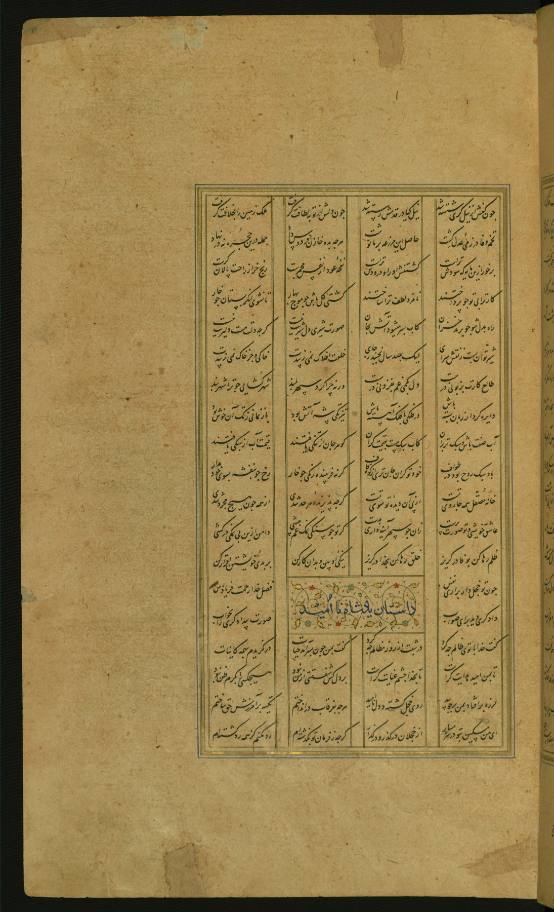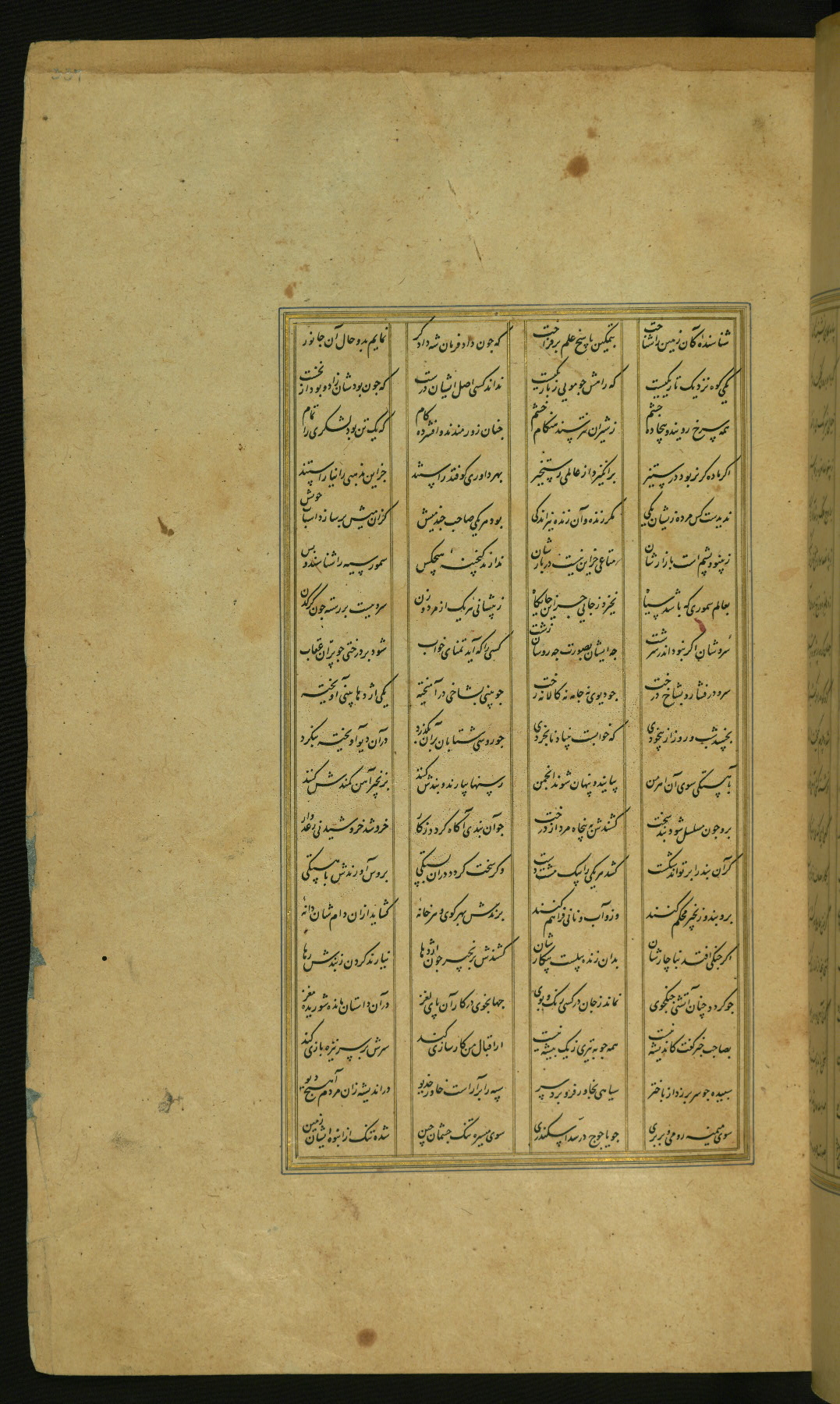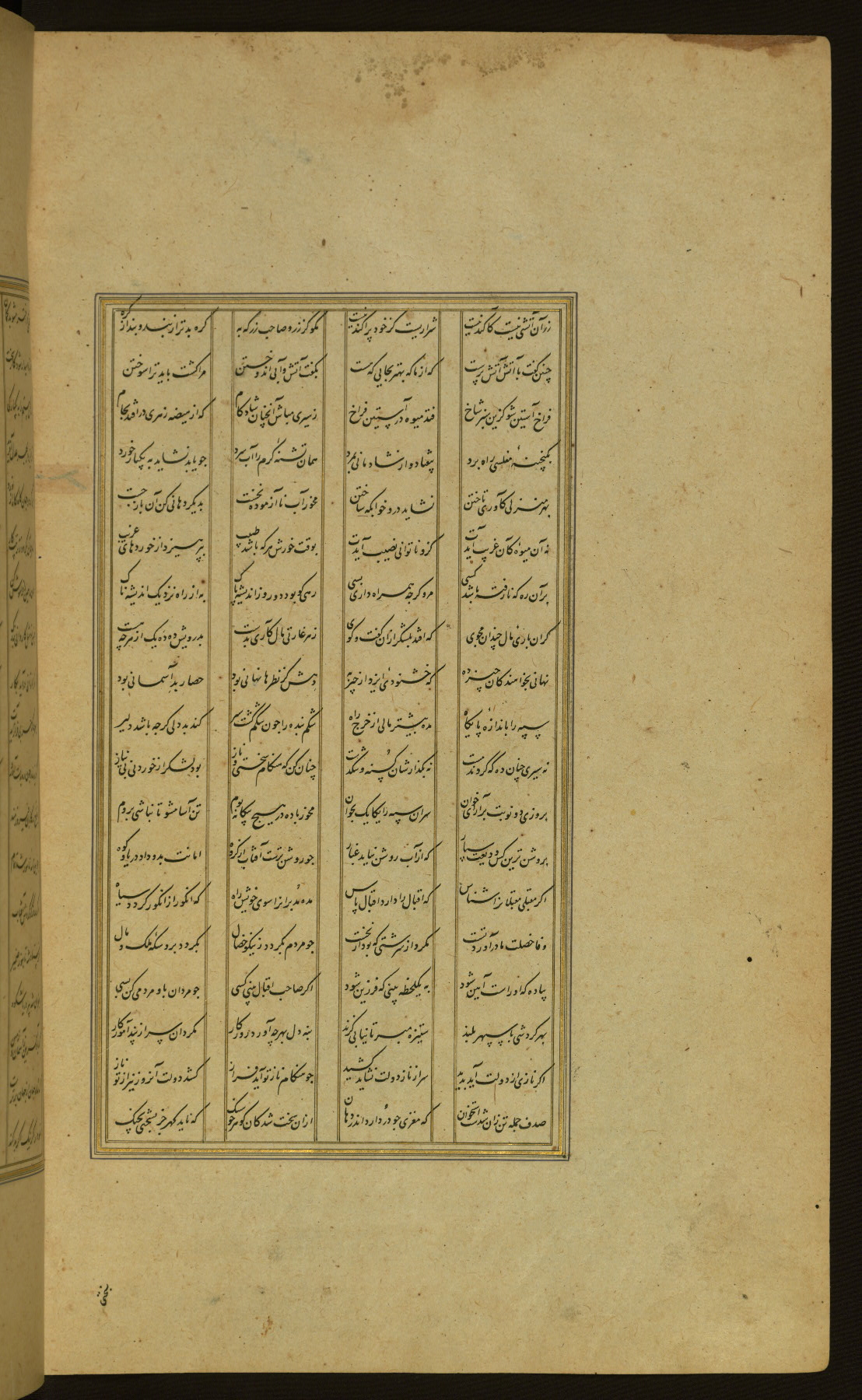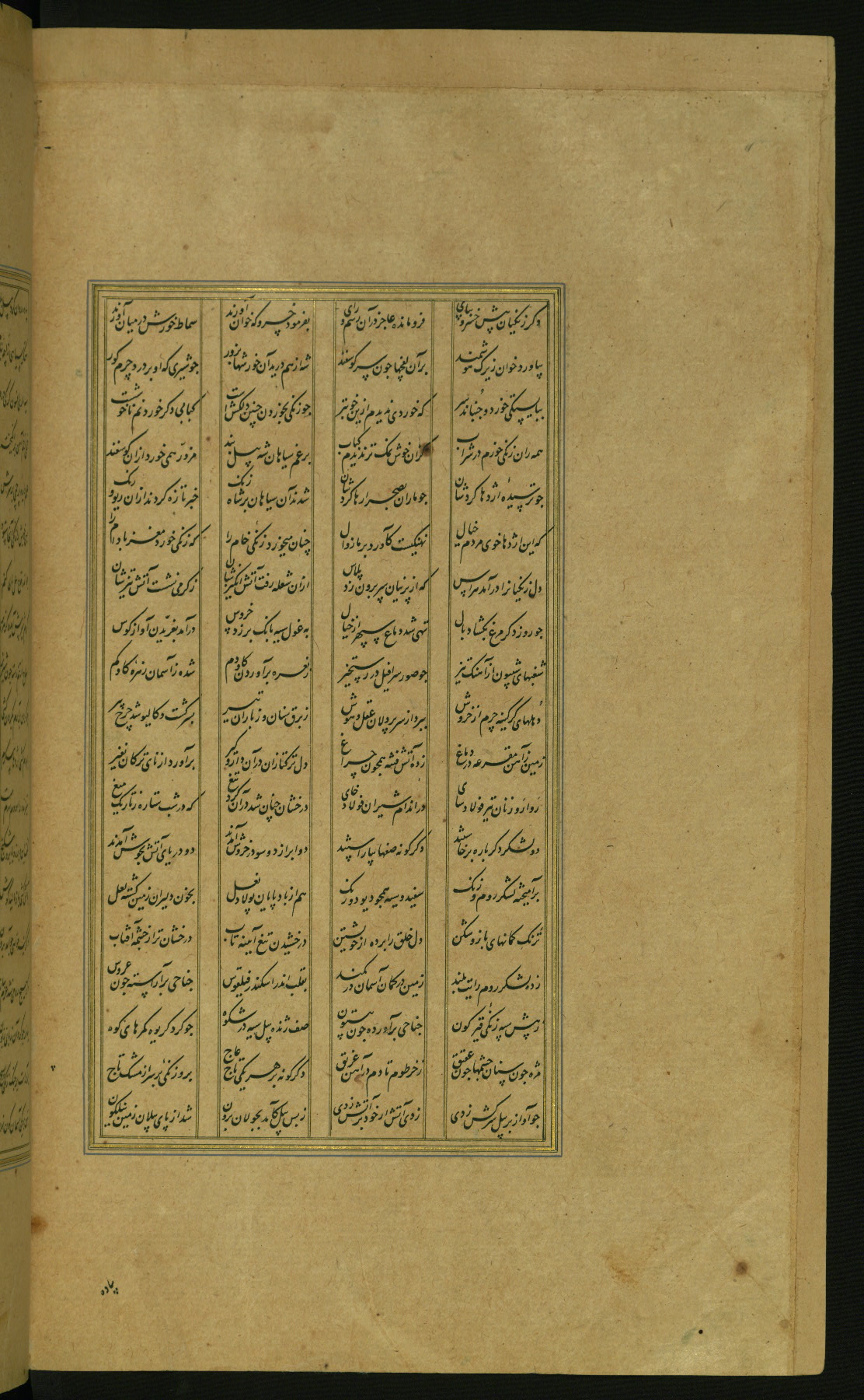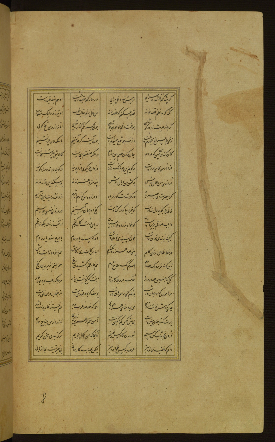 This illuminated and illustrated copy of the Khamsah (quintet) of Niẓāmī Ganjavī (d. 605 AH / 1209 CE) was written by Yār Muḥammad al-Haravī in 922 AH / 1516 CE. Written in four columns in black nastaʿlīq script, this manuscript opens with a double-page illuminated frontispiece signed by ʿAbd al-Wahhāb ibn ʿAbd al-Fattāḥ ibn ʿAlī. It contains thirty-five illustrations that were repainted in India during the twelfth century AH / eighteenth CE. The seal of Muḥammad Asharf ibn Muḥammad Khātam al-Ḥusaynī, dated 1173 AH / 1759-60 CE appears on fols. 1a and 401a. It is possible that the brown leather binding with center and side panels brushed with gold is original to the manuscript but was repaired at a later stage in the codex's history.
