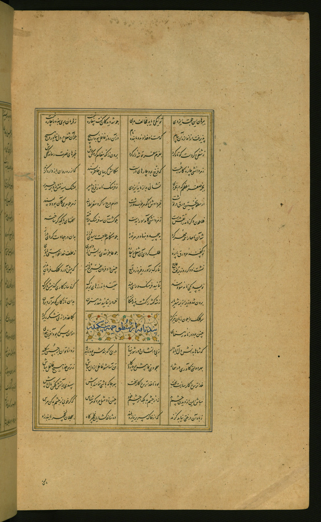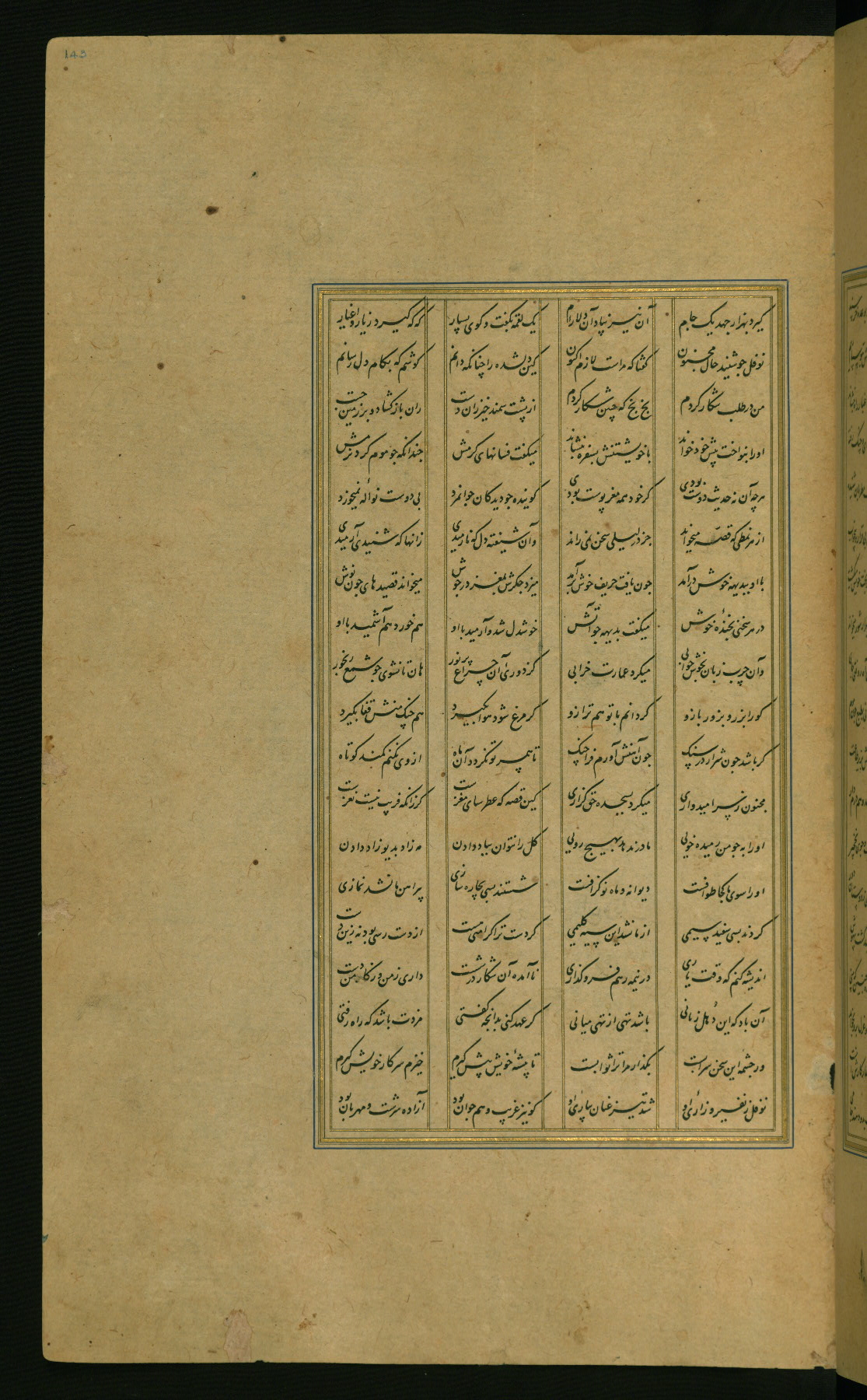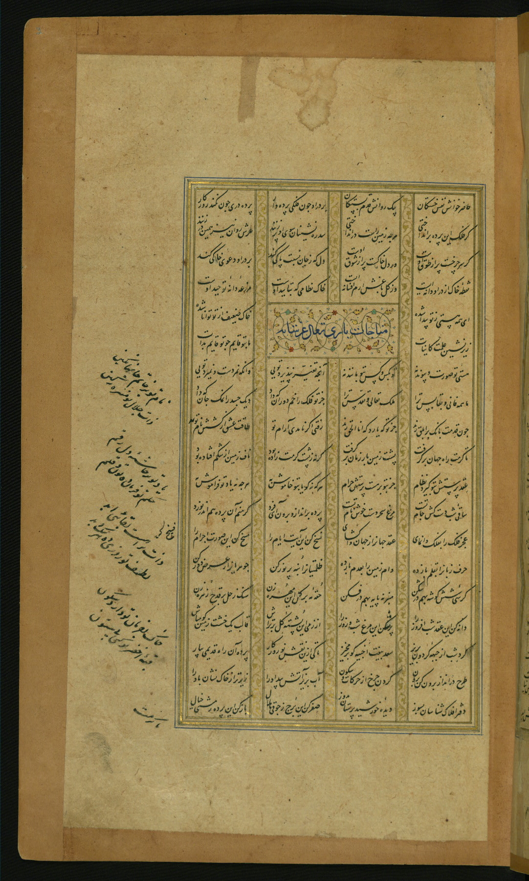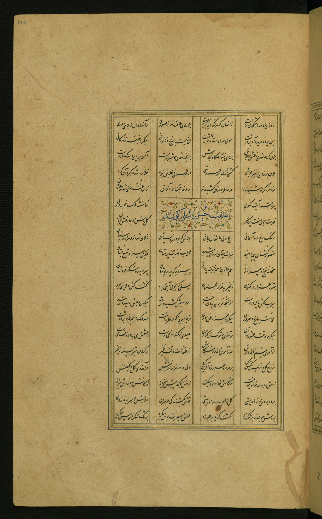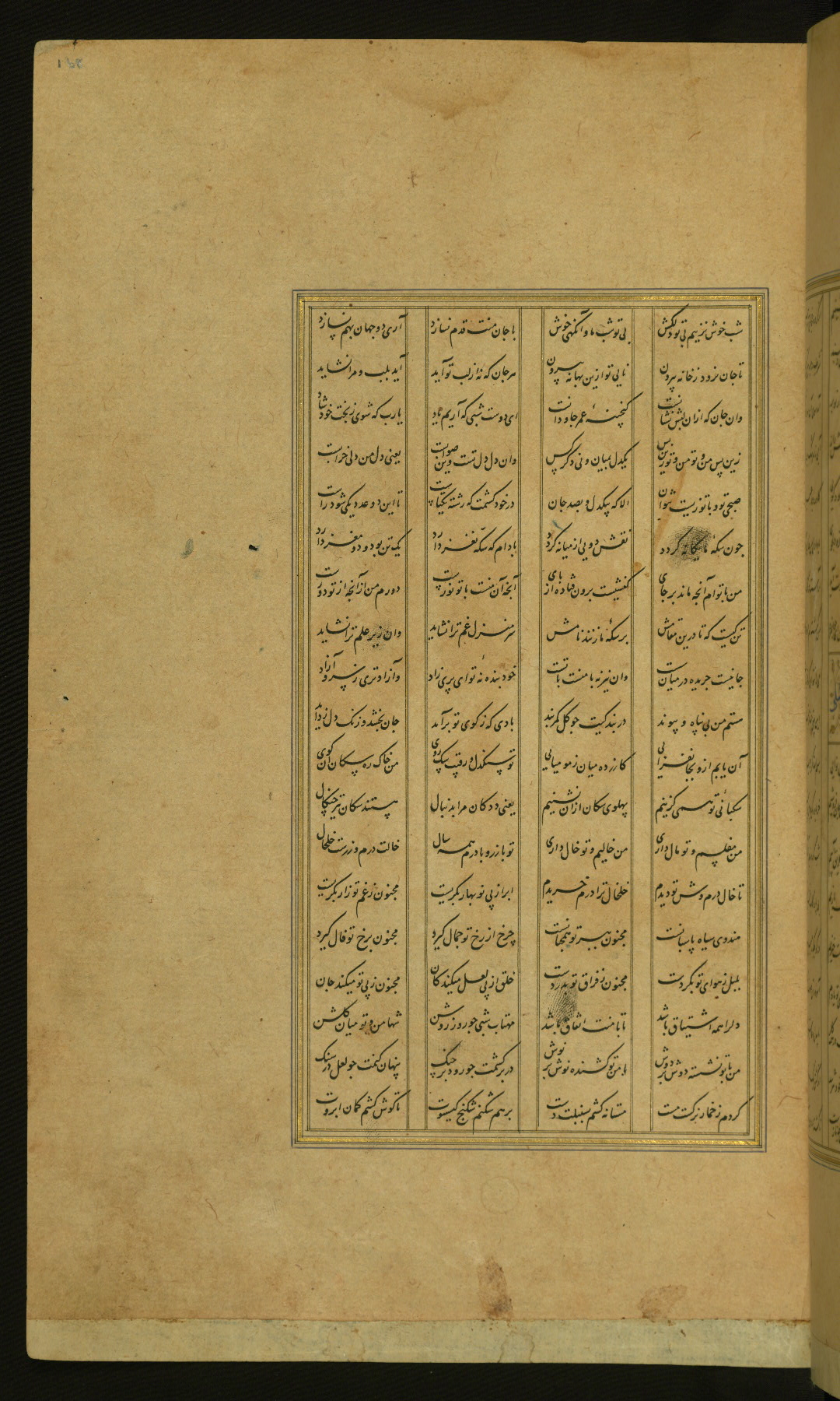This illuminated and illustrated copy of the Khamsah (quintet) of Niẓāmī Ganjavī (d. 605 AH / 1209 CE) was written by Yār Muḥammad al-Haravī in 922 AH / 1516 CE. Written in four columns in black nastaʿlīq script, this manuscript opens with a double-page illuminated frontispiece signed by ʿAbd al-Wahhāb ibn ʿAbd al-Fattāḥ ibn ʿAlī. It contains thirty-five illustrations that were repainted in India during the twelfth century AH / eighteenth CE. The seal of Muḥammad Asharf ibn Muḥammad Khātam al-Ḥusaynī, dated 1173 AH / 1759-60 CE appears on fols. 1a and 401a. It is possible that the brown leather binding with center and side panels brushed with gold is original to the manuscript but was repaired at a later stage in the codex's history.
