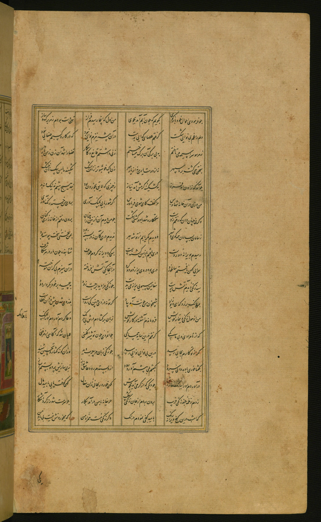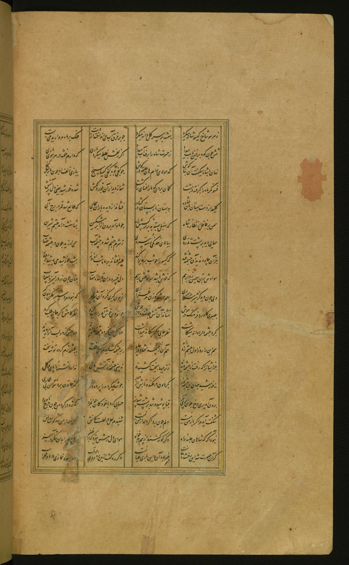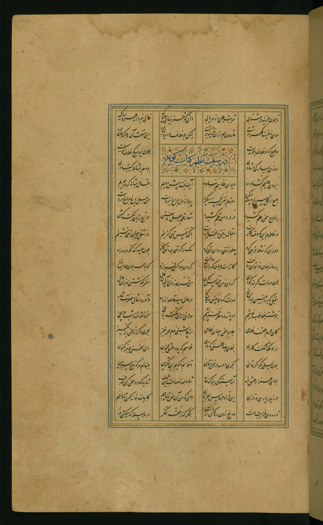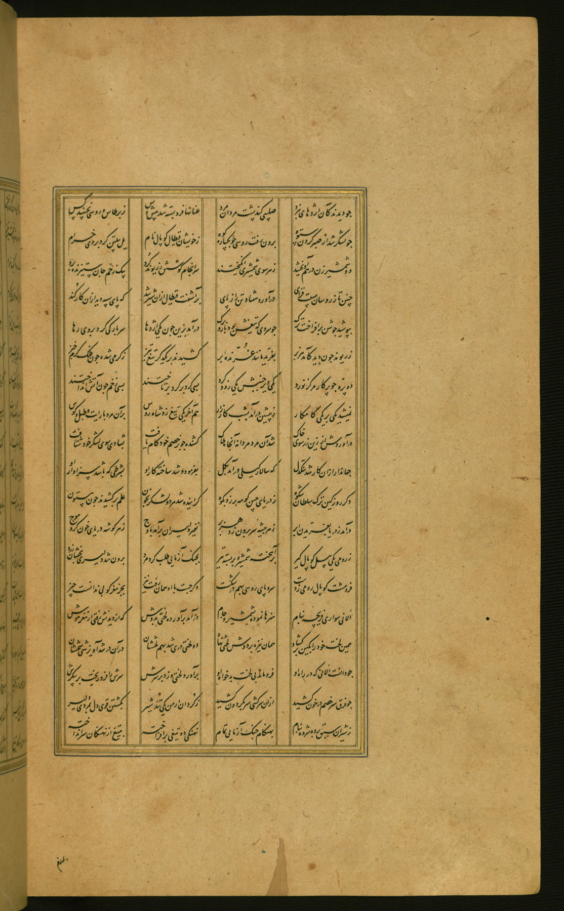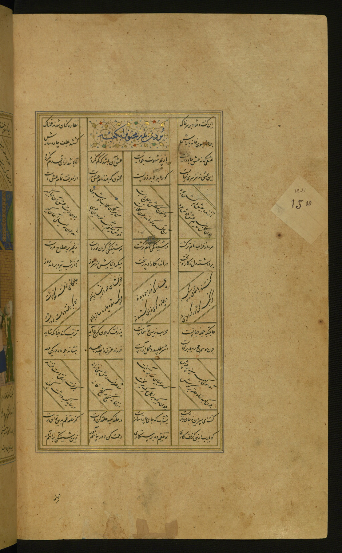 This illuminated and illustrated copy of the Khamsah (quintet) of Niẓāmī Ganjavī (d. 605 AH / 1209 CE) was written by Yār Muḥammad al-Haravī in 922 AH / 1516 CE. Written in four columns in black nastaʿlīq script, this manuscript opens with a double-page illuminated frontispiece signed by ʿAbd al-Wahhāb ibn ʿAbd al-Fattāḥ ibn ʿAlī. It contains thirty-five illustrations that were repainted in India during the twelfth century AH / eighteenth CE. The seal of Muḥammad Asharf ibn Muḥammad Khātam al-Ḥusaynī, dated 1173 AH / 1759-60 CE appears on fols. 1a and 401a. It is possible that the brown leather binding with center and side panels brushed with gold is original to the manuscript but was repaired at a later stage in the codex's history.