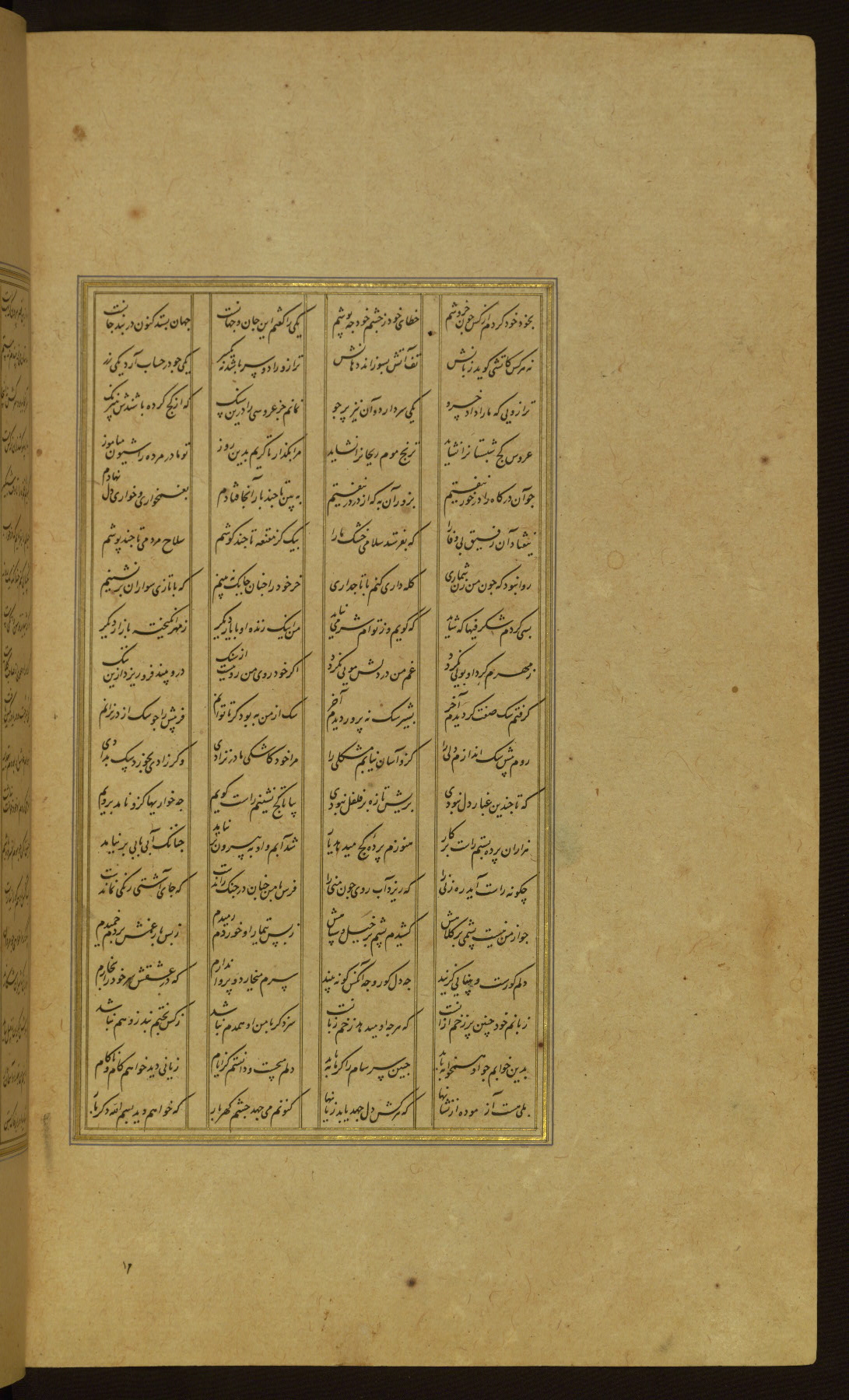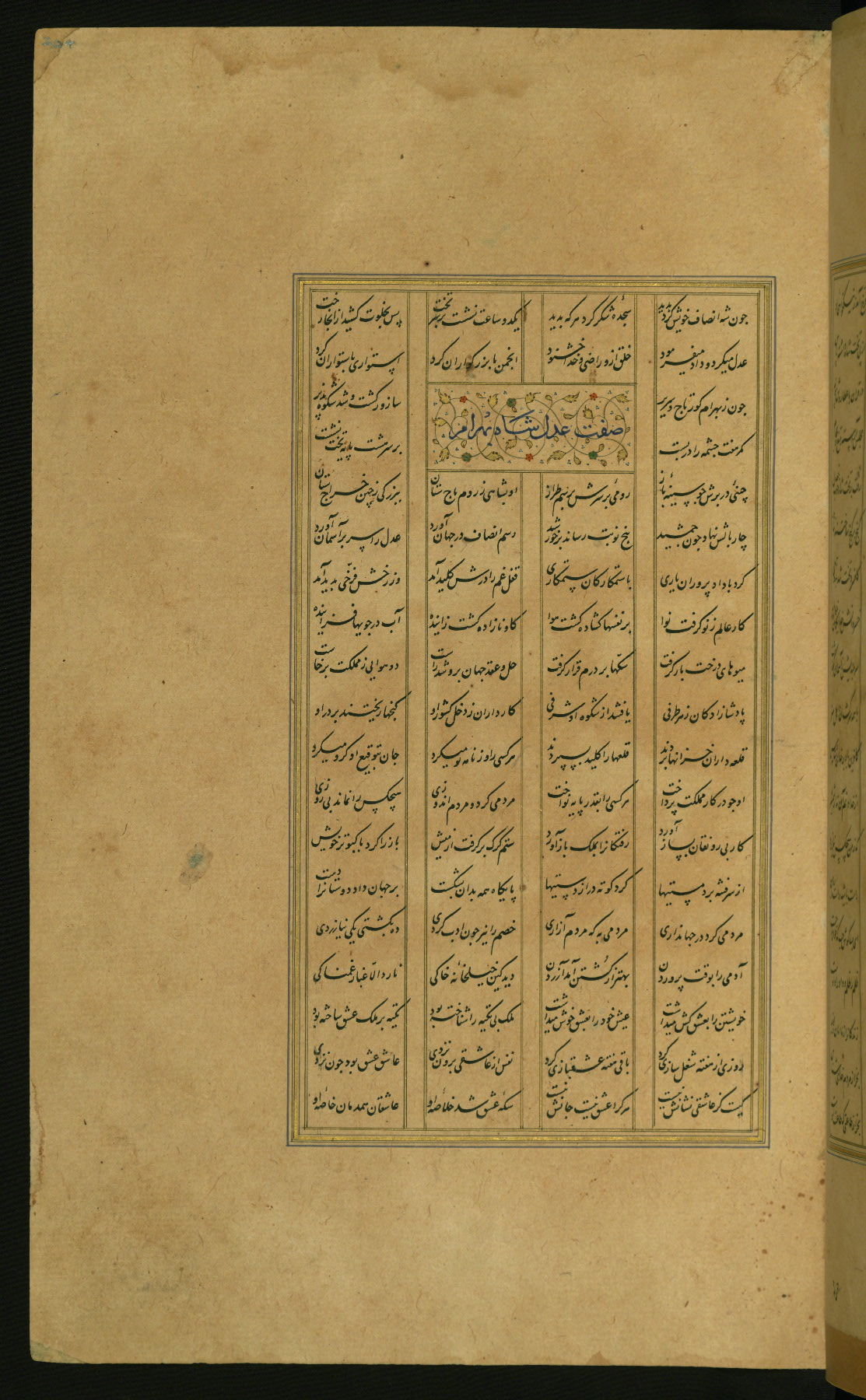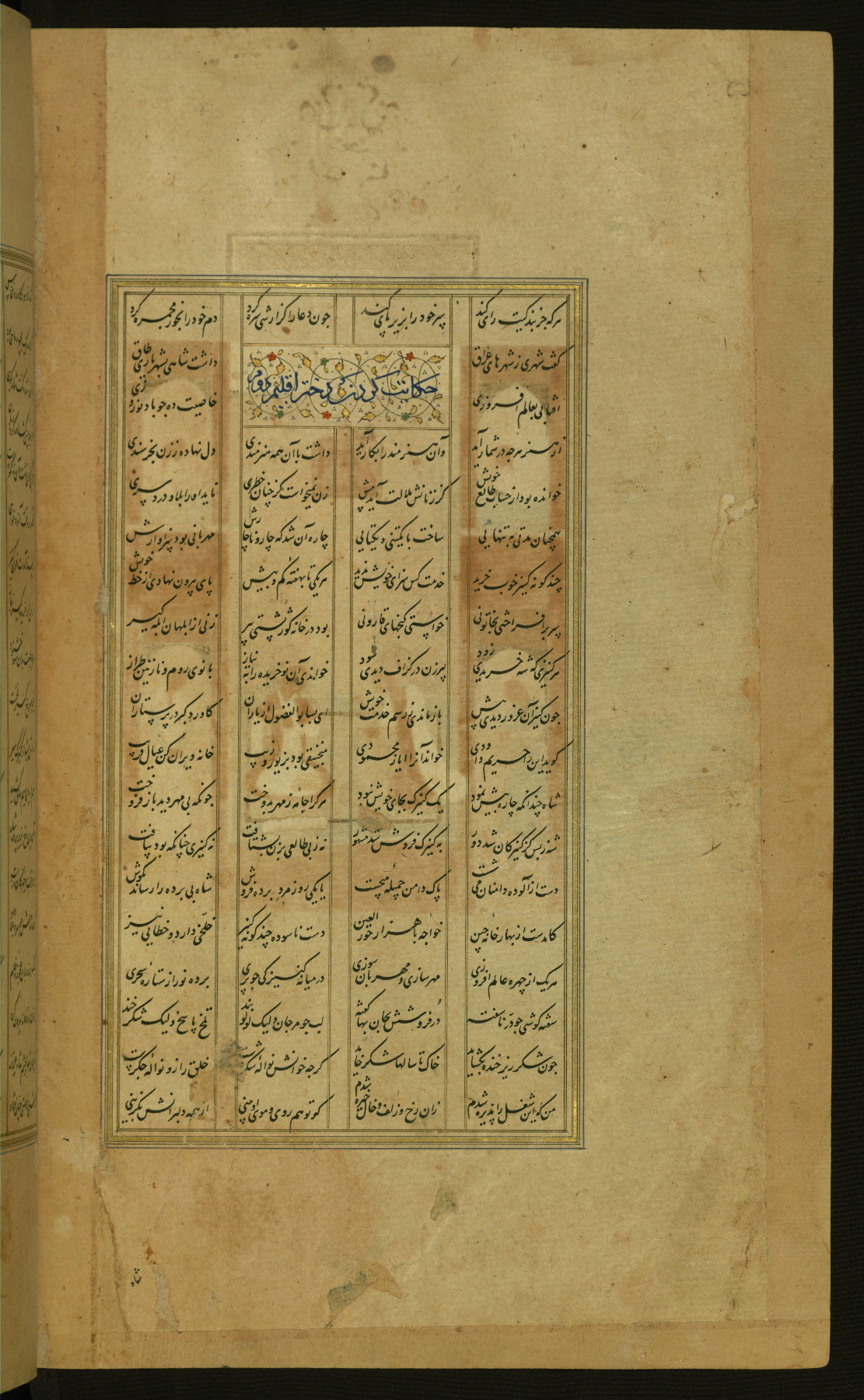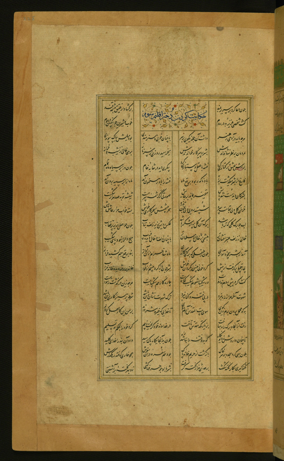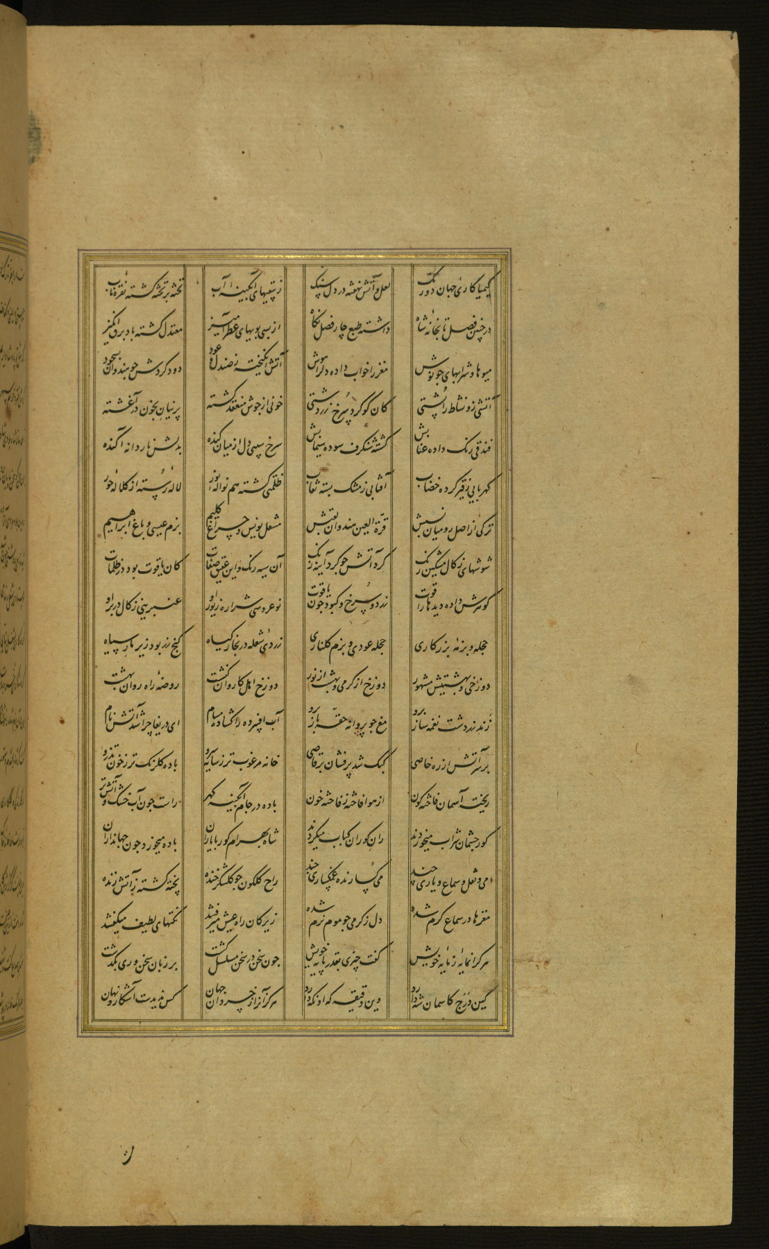 This illuminated and illustrated copy of the Khamsah (quintet) of Niẓāmī Ganjavī (d. 605 AH / 1209 CE) was written by Yār Muḥammad al-Haravī in 922 AH / 1516 CE. Written in four columns in black nastaʿlīq script, this manuscript opens with a double-page illuminated frontispiece signed by ʿAbd al-Wahhāb ibn ʿAbd al-Fattāḥ ibn ʿAlī. It contains thirty-five illustrations that were repainted in India during the twelfth century AH / eighteenth CE. The seal of Muḥammad Asharf ibn Muḥammad Khātam al-Ḥusaynī, dated 1173 AH / 1759-60 CE appears on fols. 1a and 401a. It is possible that the brown leather binding with center and side panels brushed with gold is original to the manuscript but was repaired at a later stage in the codex's history.