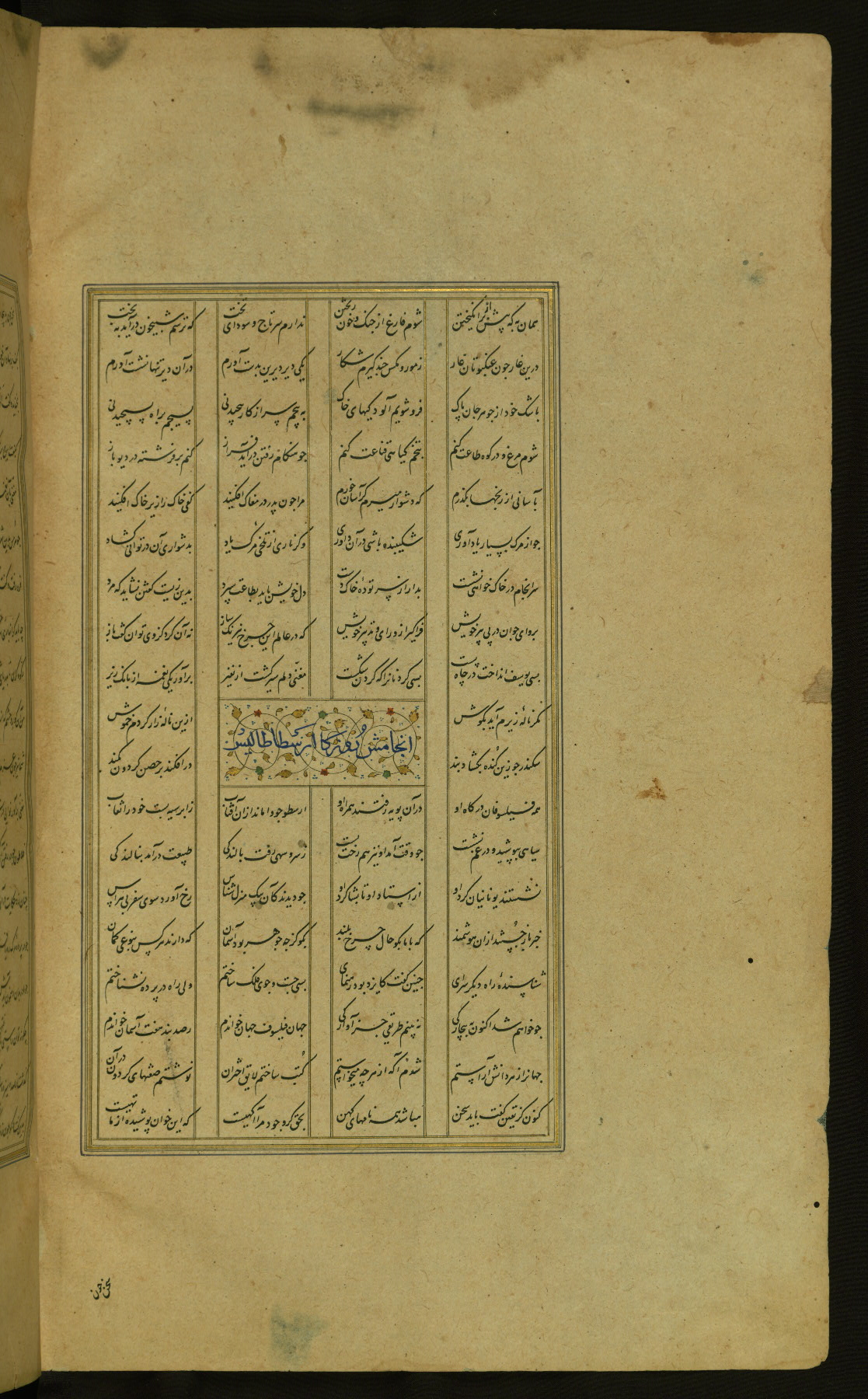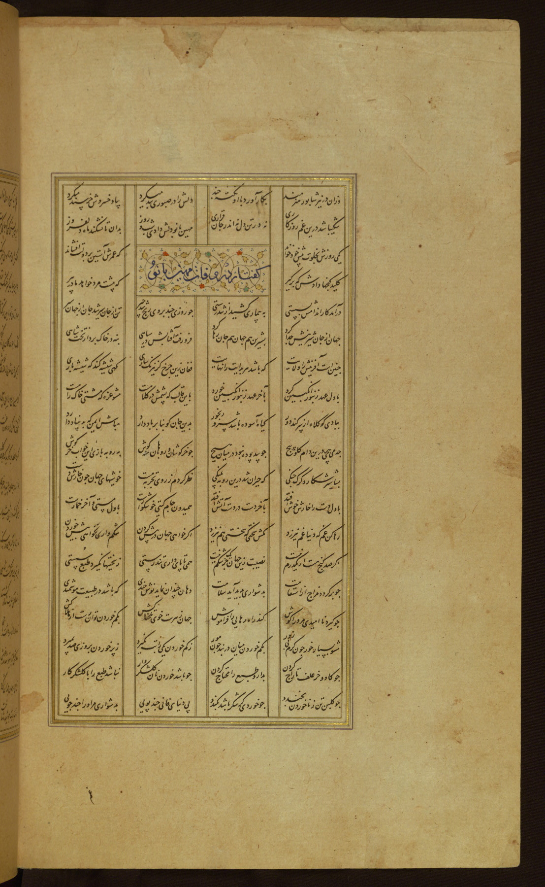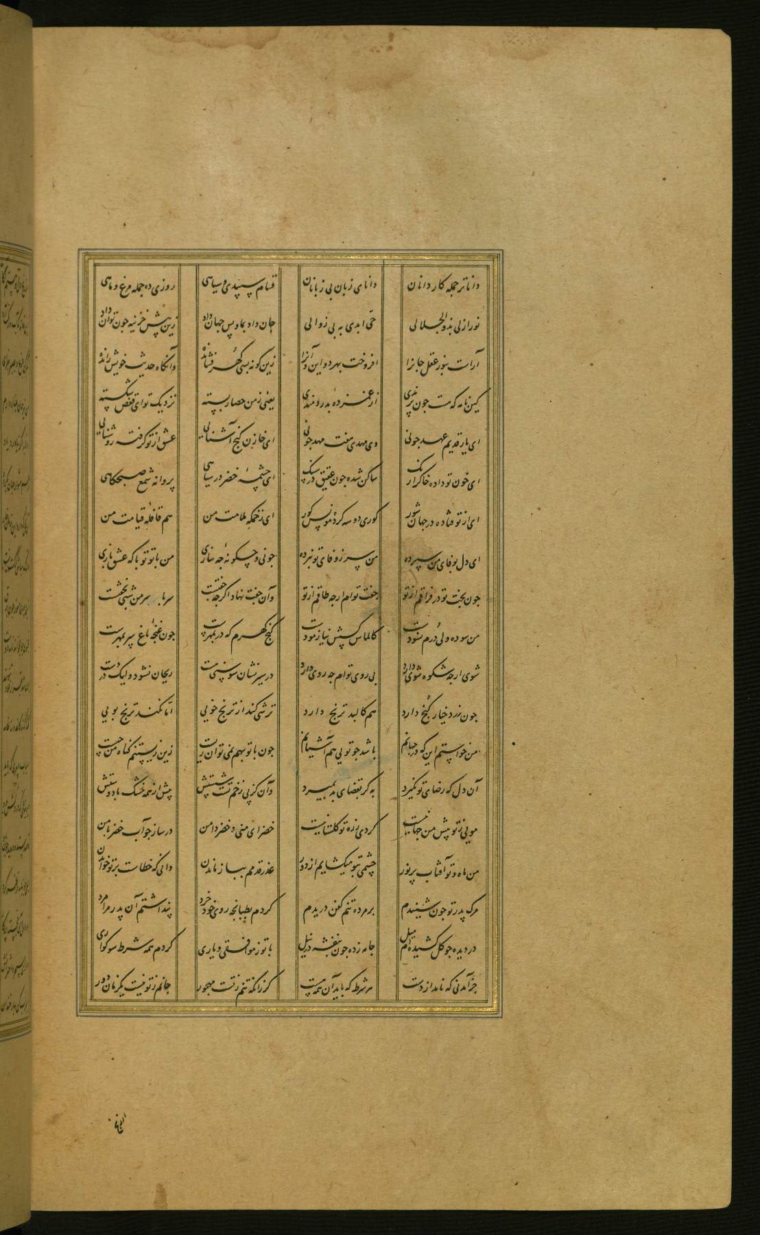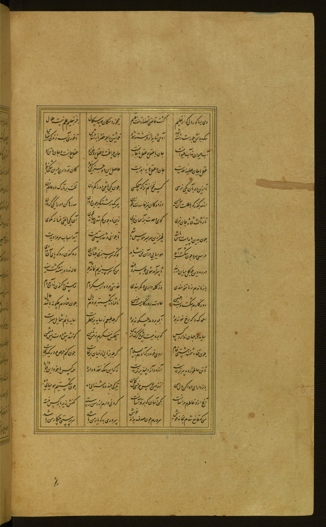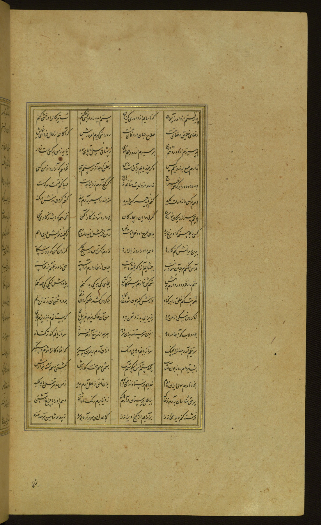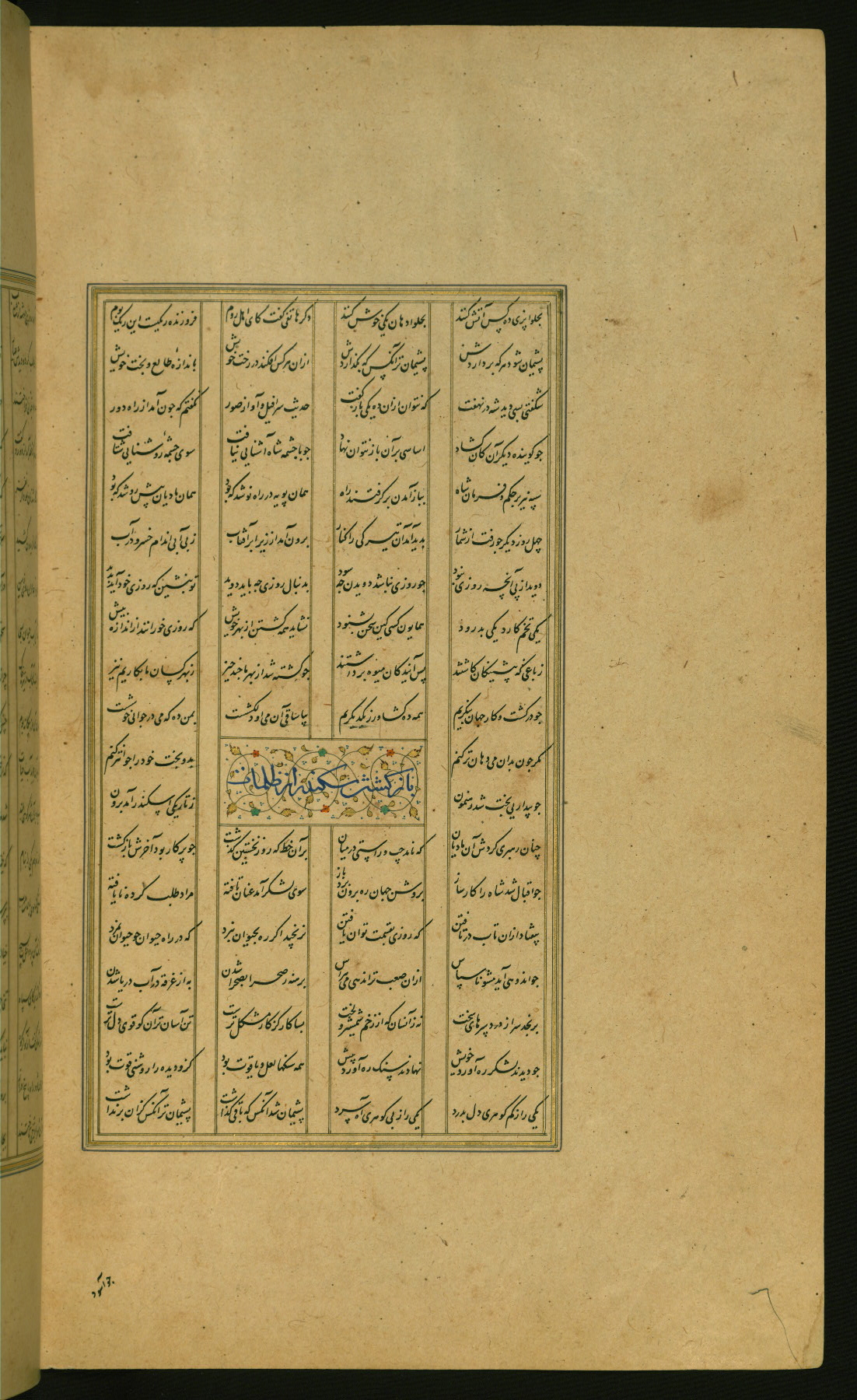 This illuminated and illustrated copy of the Khamsah (quintet) of Niẓāmī Ganjavī (d. 605 AH / 1209 CE) was written by Yār Muḥammad al-Haravī in 922 AH / 1516 CE. Written in four columns in black nastaʿlīq script, this manuscript opens with a double-page illuminated frontispiece signed by ʿAbd al-Wahhāb ibn ʿAbd al-Fattāḥ ibn ʿAlī. It contains thirty-five illustrations that were repainted in India during the twelfth century AH / eighteenth CE. The seal of Muḥammad Asharf ibn Muḥammad Khātam al-Ḥusaynī, dated 1173 AH / 1759-60 CE appears on fols. 1a and 401a. It is possible that the brown leather binding with center and side panels brushed with gold is original to the manuscript but was repaired at a later stage in the codex's history.