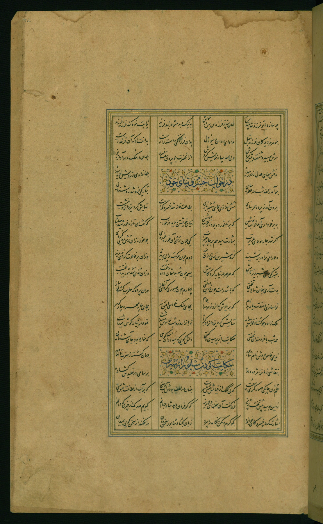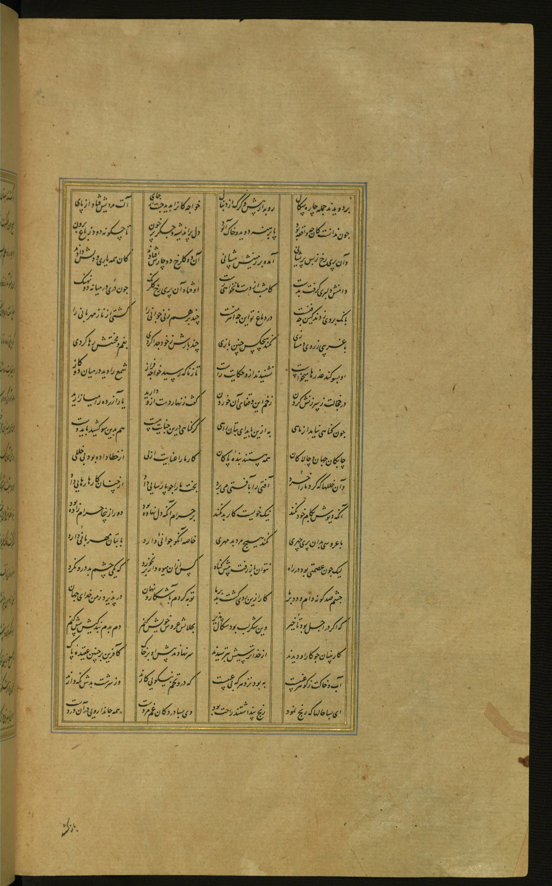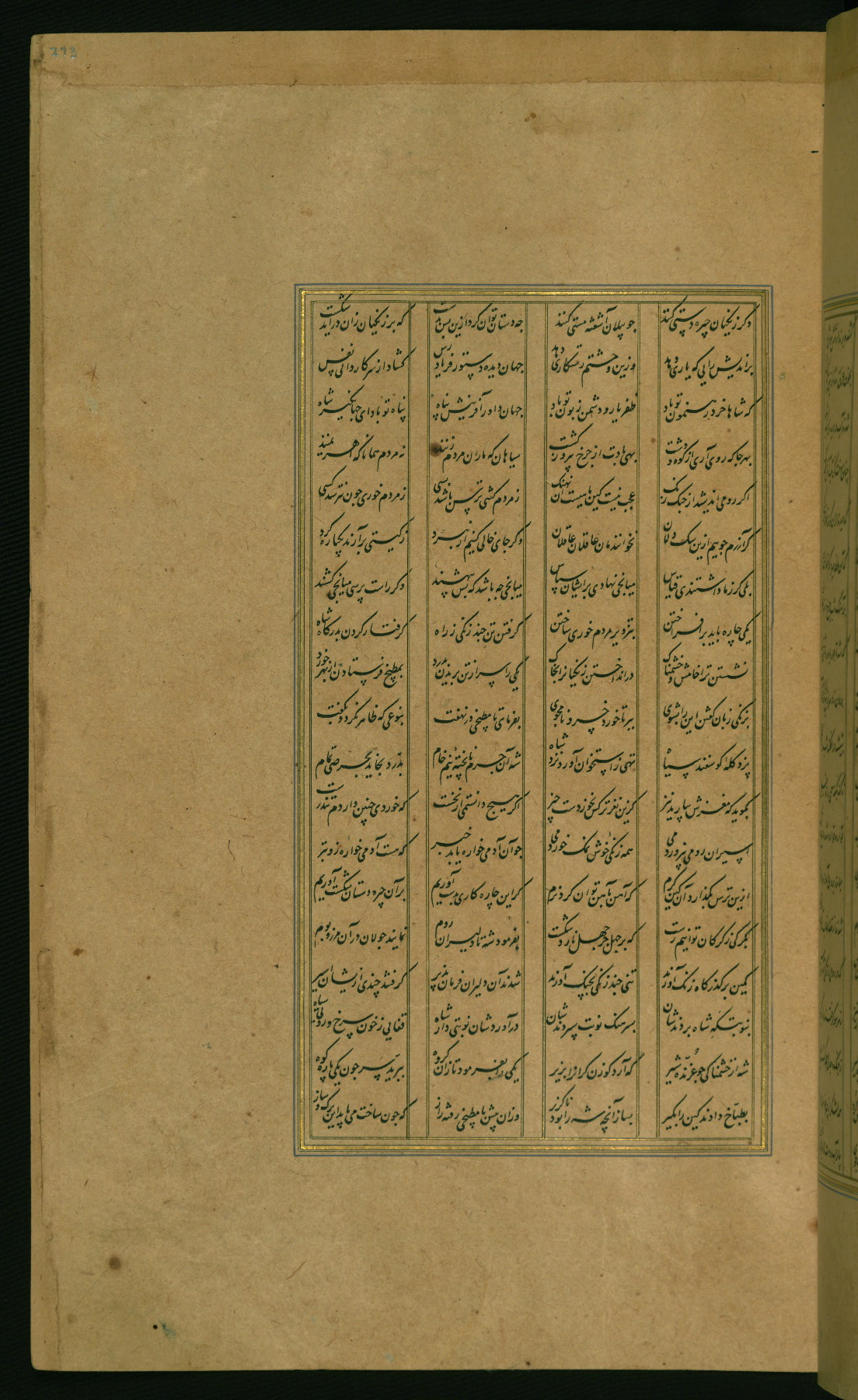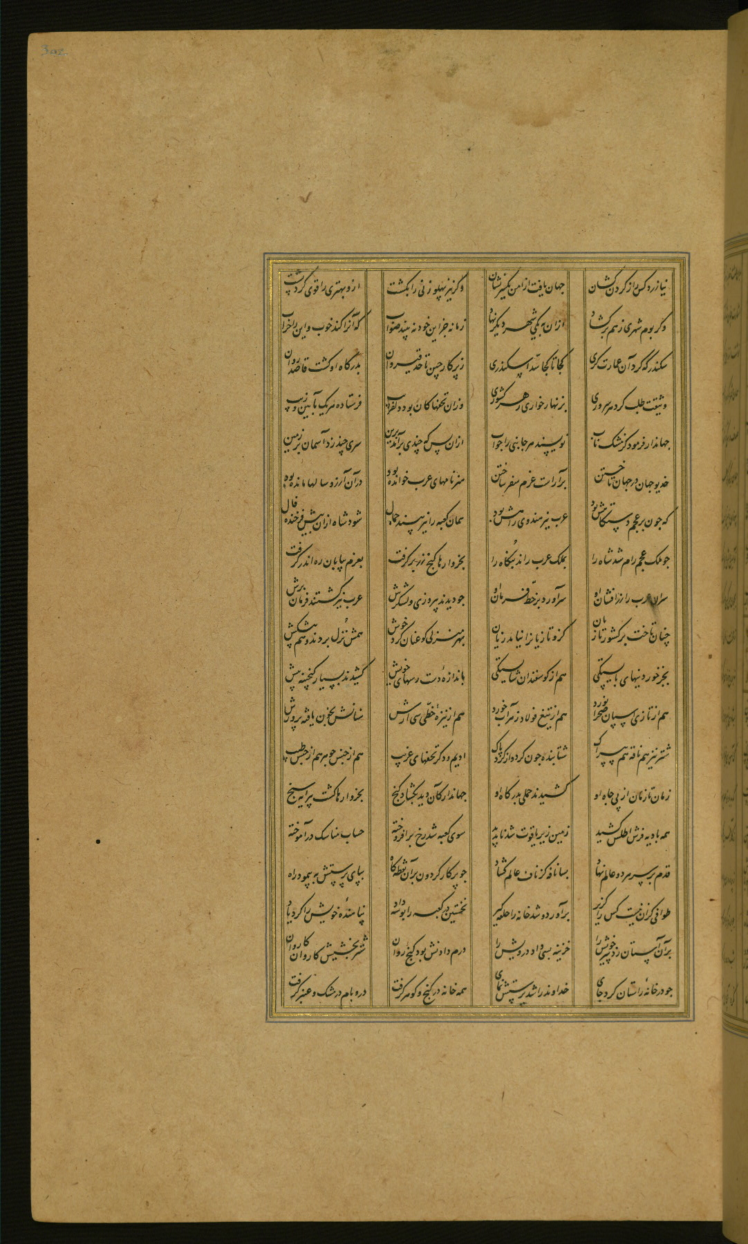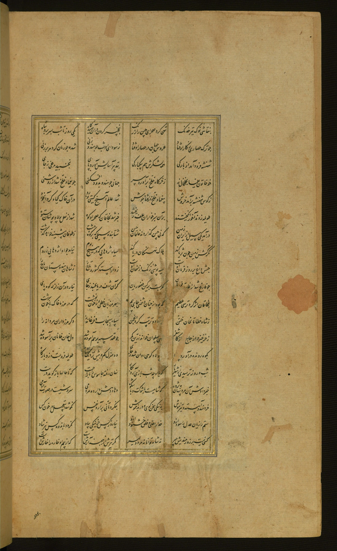 This illuminated and illustrated copy of the Khamsah (quintet) of Niẓāmī Ganjavī (d. 605 AH / 1209 CE) was written by Yār Muḥammad al-Haravī in 922 AH / 1516 CE. Written in four columns in black nastaʿlīq script, this manuscript opens with a double-page illuminated frontispiece signed by ʿAbd al-Wahhāb ibn ʿAbd al-Fattāḥ ibn ʿAlī. It contains thirty-five illustrations that were repainted in India during the twelfth century AH / eighteenth CE. The seal of Muḥammad Asharf ibn Muḥammad Khātam al-Ḥusaynī, dated 1173 AH / 1759-60 CE appears on fols. 1a and 401a. It is possible that the brown leather binding with center and side panels brushed with gold is original to the manuscript but was repaired at a later stage in the codex's history.