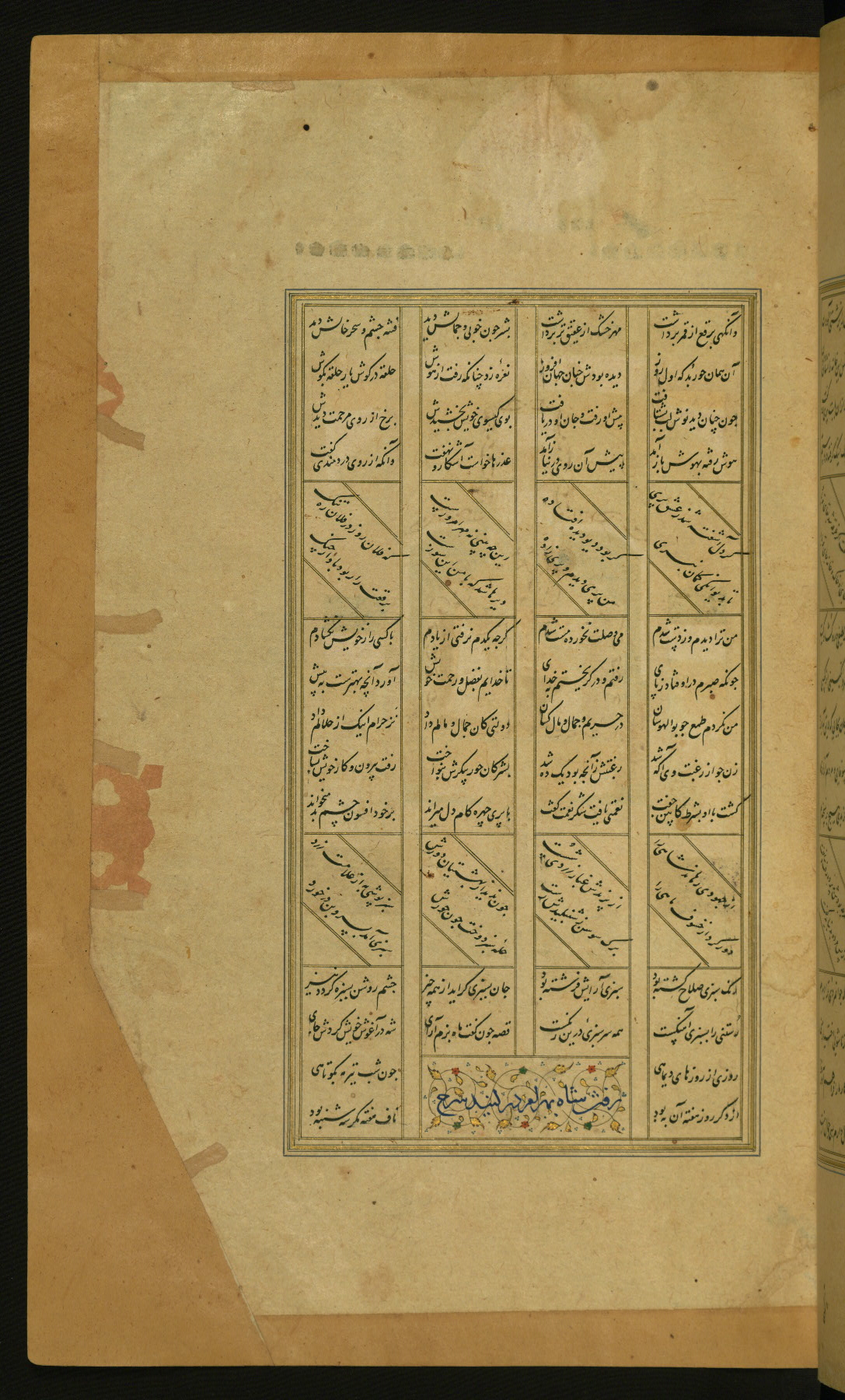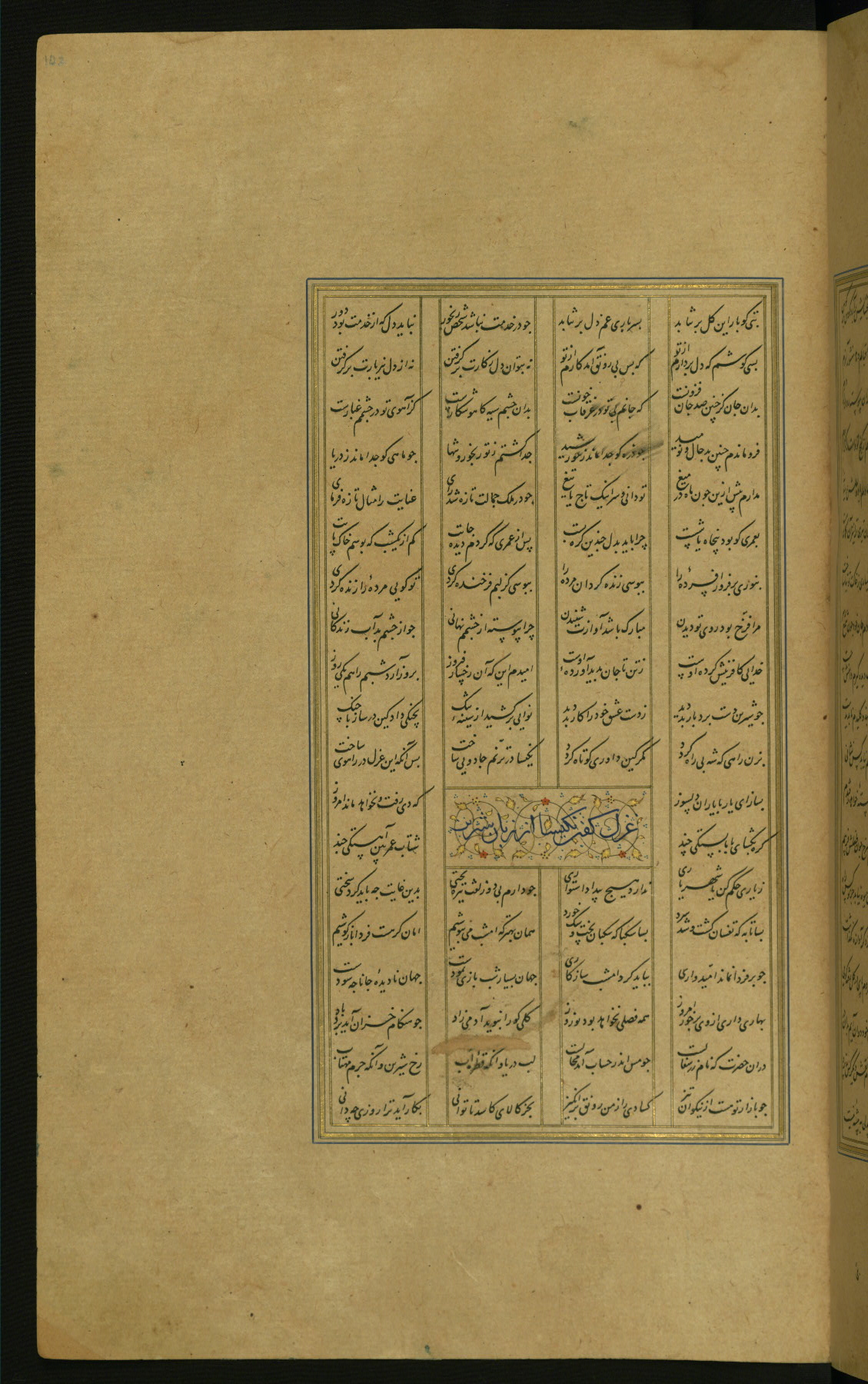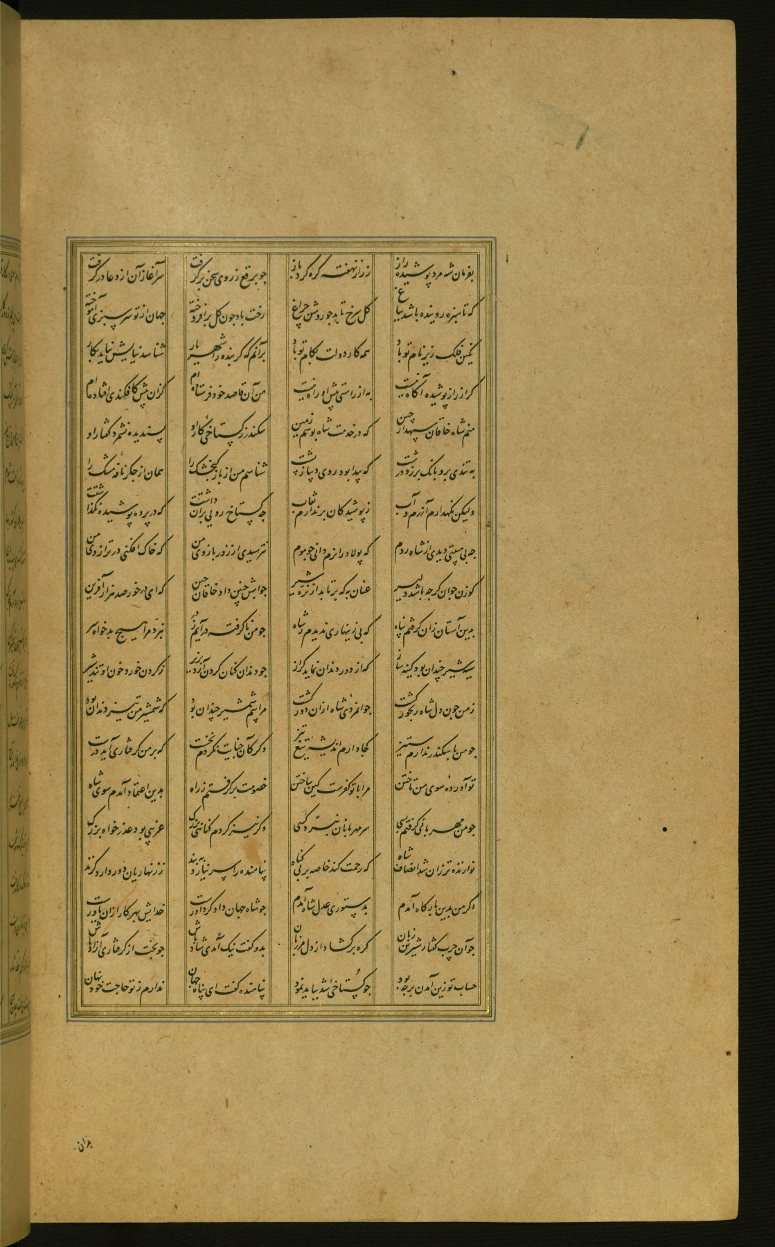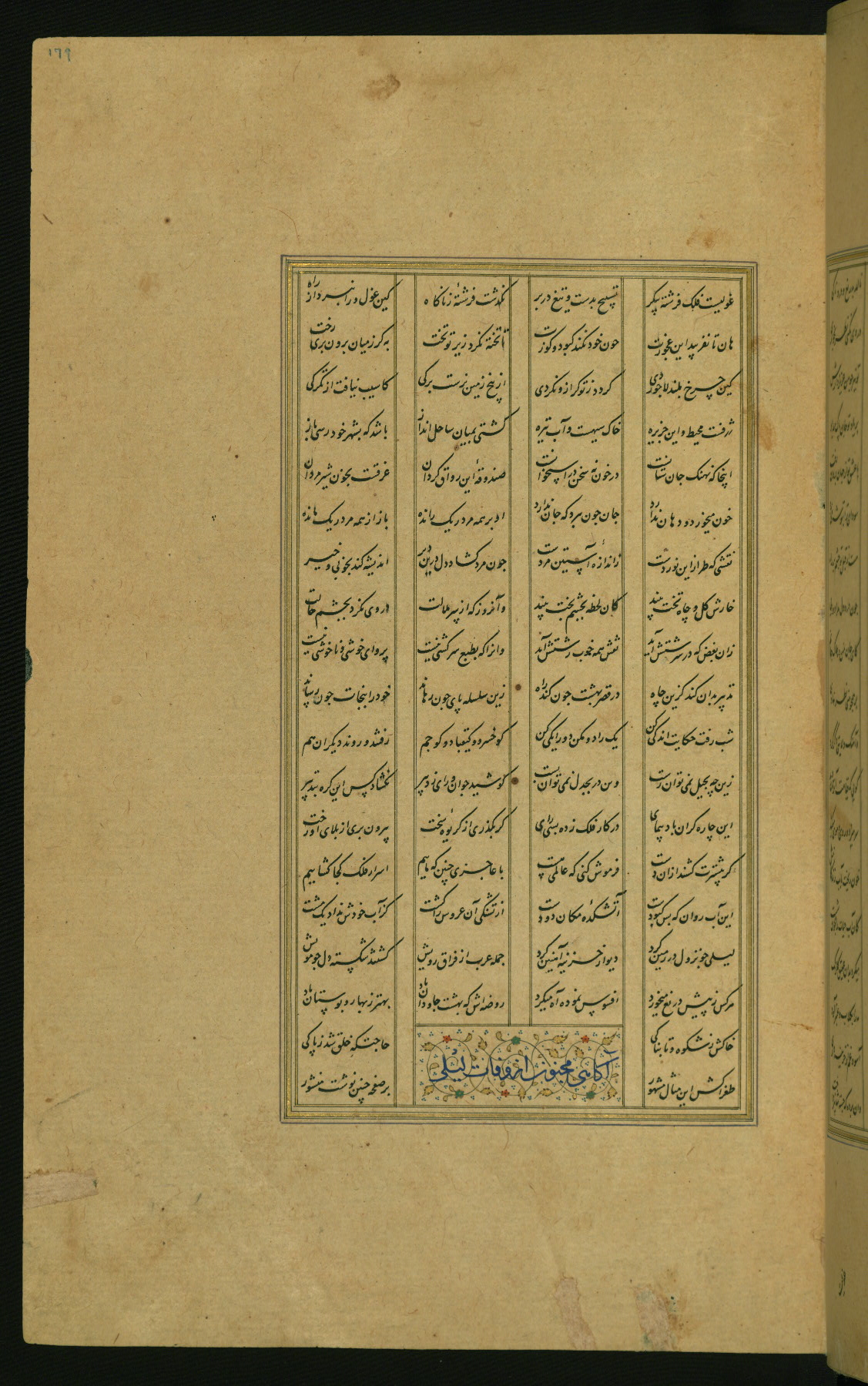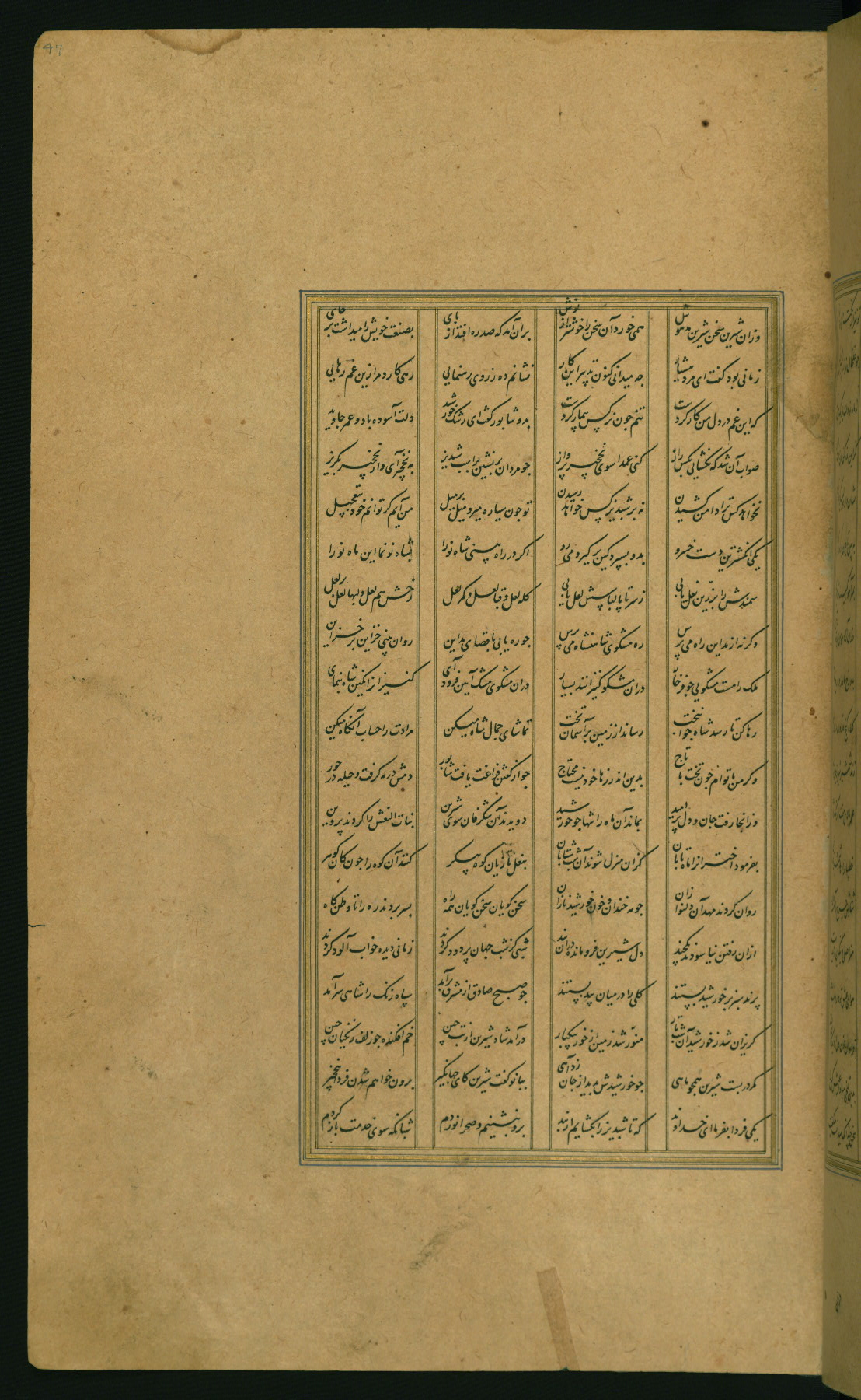 This illuminated and illustrated copy of the Khamsah (quintet) of Niẓāmī Ganjavī (d. 605 AH / 1209 CE) was written by Yār Muḥammad al-Haravī in 922 AH / 1516 CE. Written in four columns in black nastaʿlīq script, this manuscript opens with a double-page illuminated frontispiece signed by ʿAbd al-Wahhāb ibn ʿAbd al-Fattāḥ ibn ʿAlī. It contains thirty-five illustrations that were repainted in India during the twelfth century AH / eighteenth CE. The seal of Muḥammad Asharf ibn Muḥammad Khātam al-Ḥusaynī, dated 1173 AH / 1759-60 CE appears on fols. 1a and 401a. It is possible that the brown leather binding with center and side panels brushed with gold is original to the manuscript but was repaired at a later stage in the codex's history.