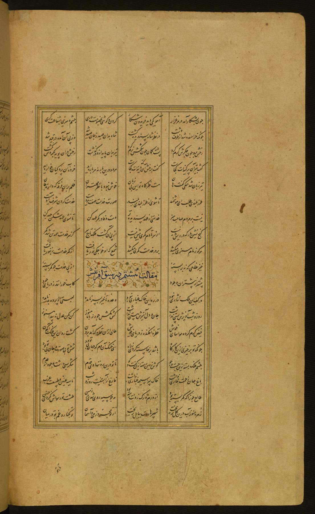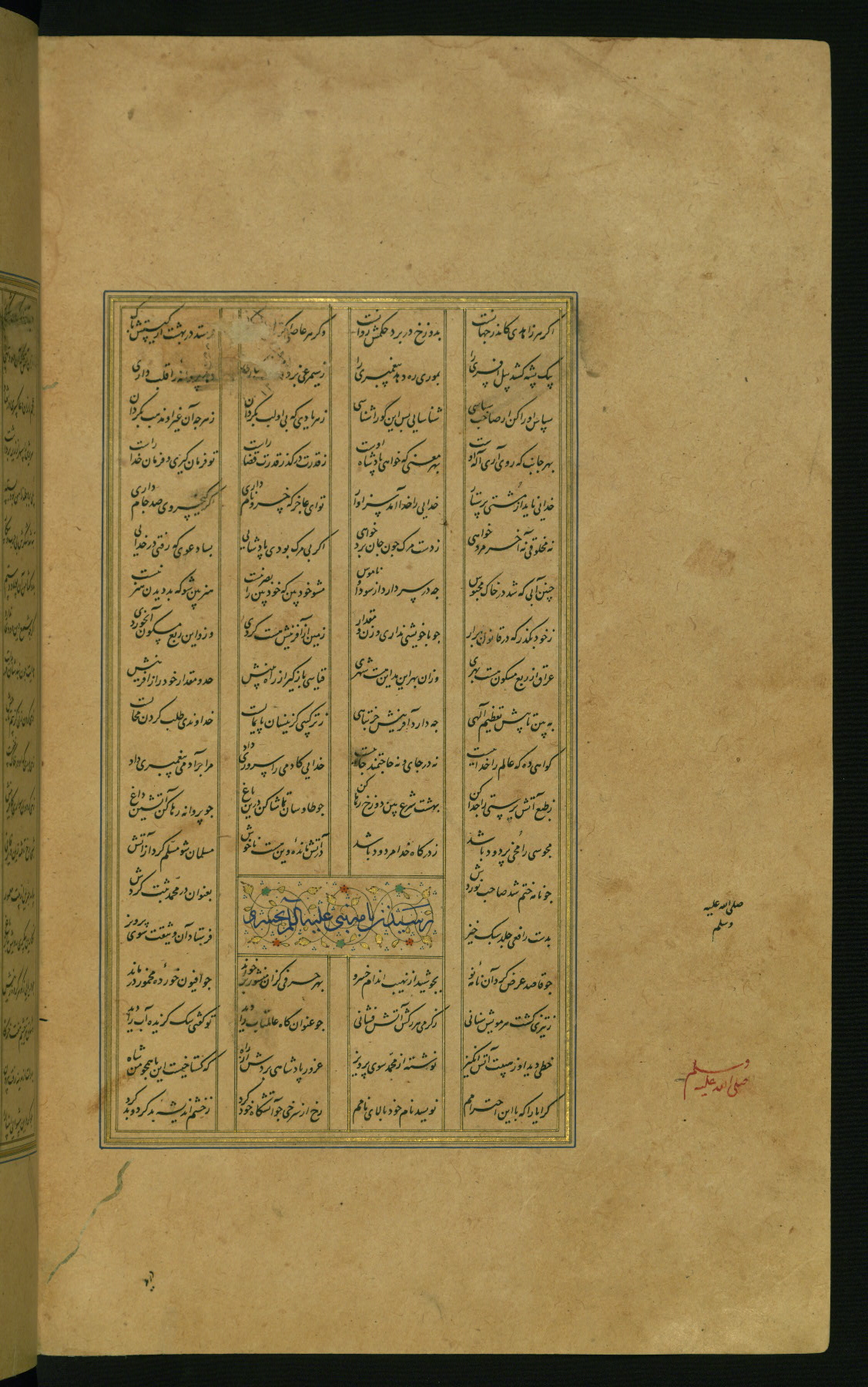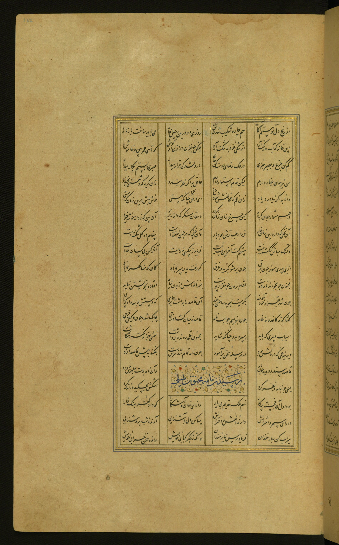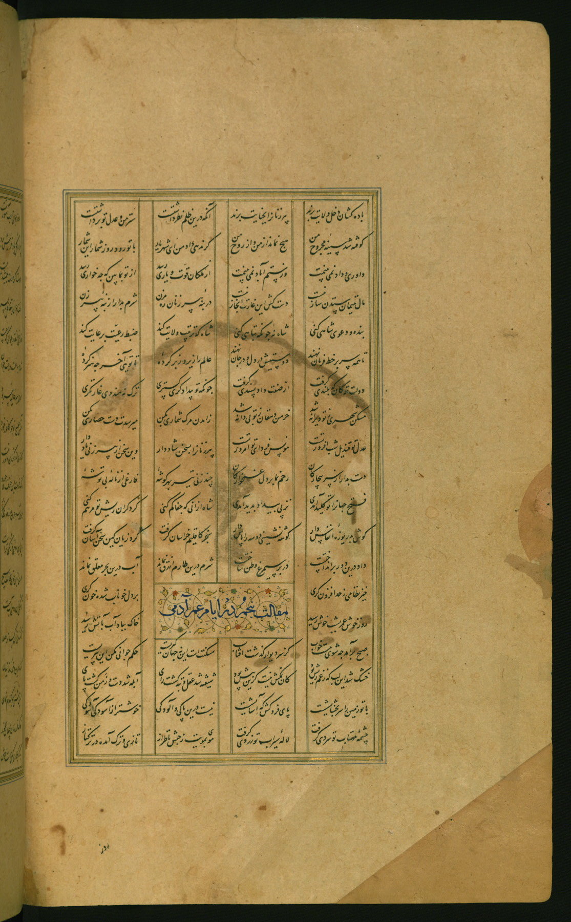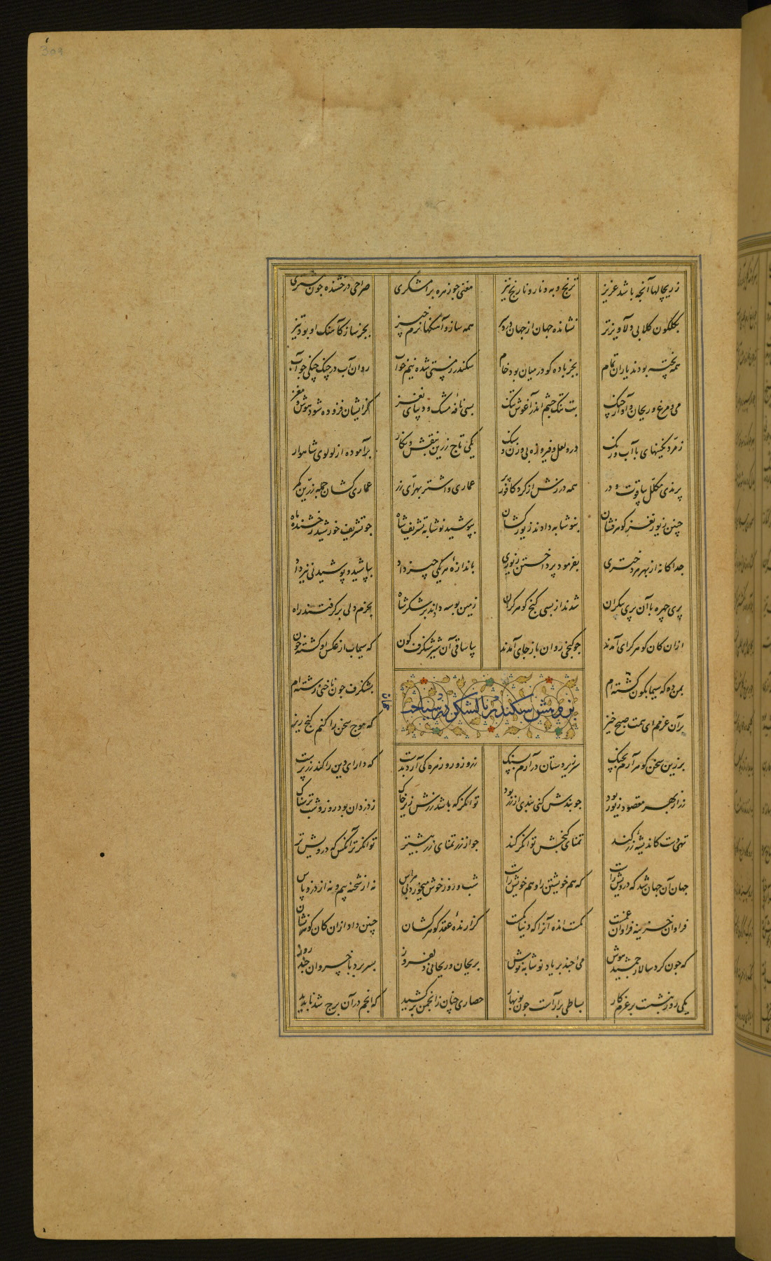 This illuminated and illustrated copy of the Khamsah (quintet) of Niẓāmī Ganjavī (d. 605 AH / 1209 CE) was written by Yār Muḥammad al-Haravī in 922 AH / 1516 CE. Written in four columns in black nastaʿlīq script, this manuscript opens with a double-page illuminated frontispiece signed by ʿAbd al-Wahhāb ibn ʿAbd al-Fattāḥ ibn ʿAlī. It contains thirty-five illustrations that were repainted in India during the twelfth century AH / eighteenth CE. The seal of Muḥammad Asharf ibn Muḥammad Khātam al-Ḥusaynī, dated 1173 AH / 1759-60 CE appears on fols. 1a and 401a. It is possible that the brown leather binding with center and side panels brushed with gold is original to the manuscript but was repaired at a later stage in the codex's history.