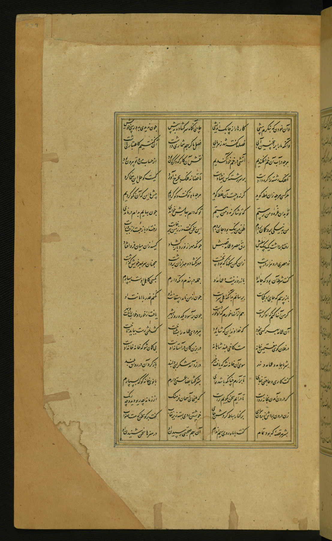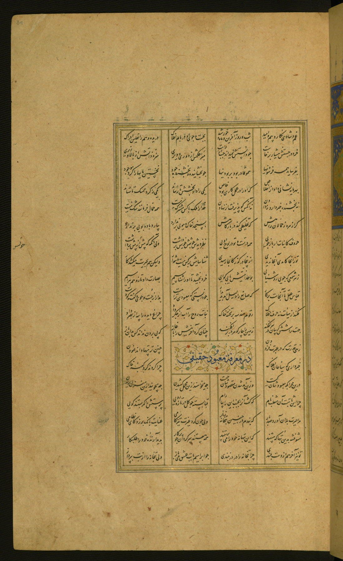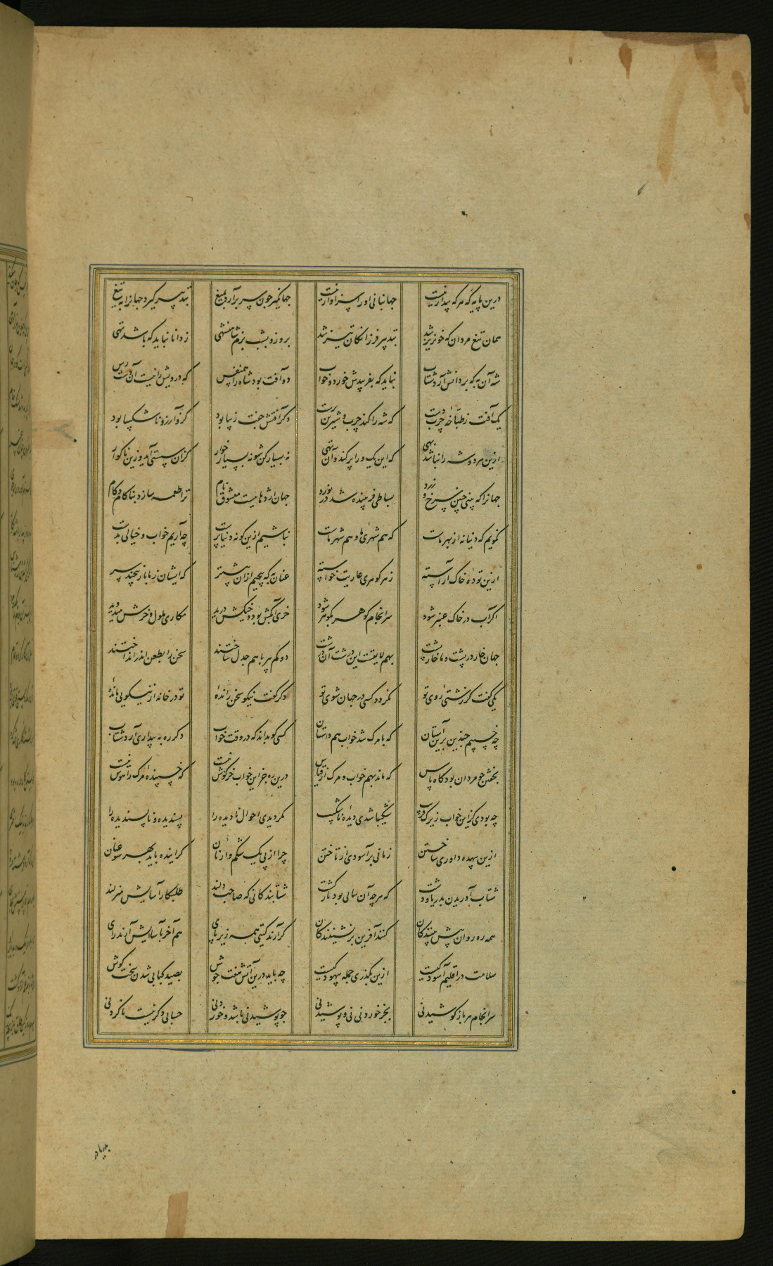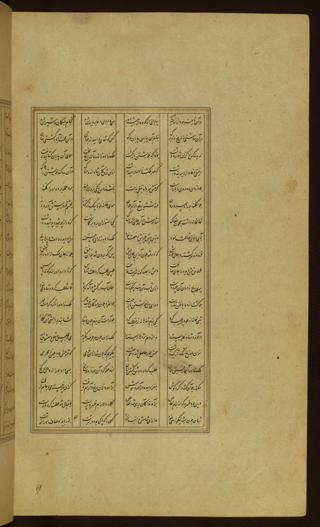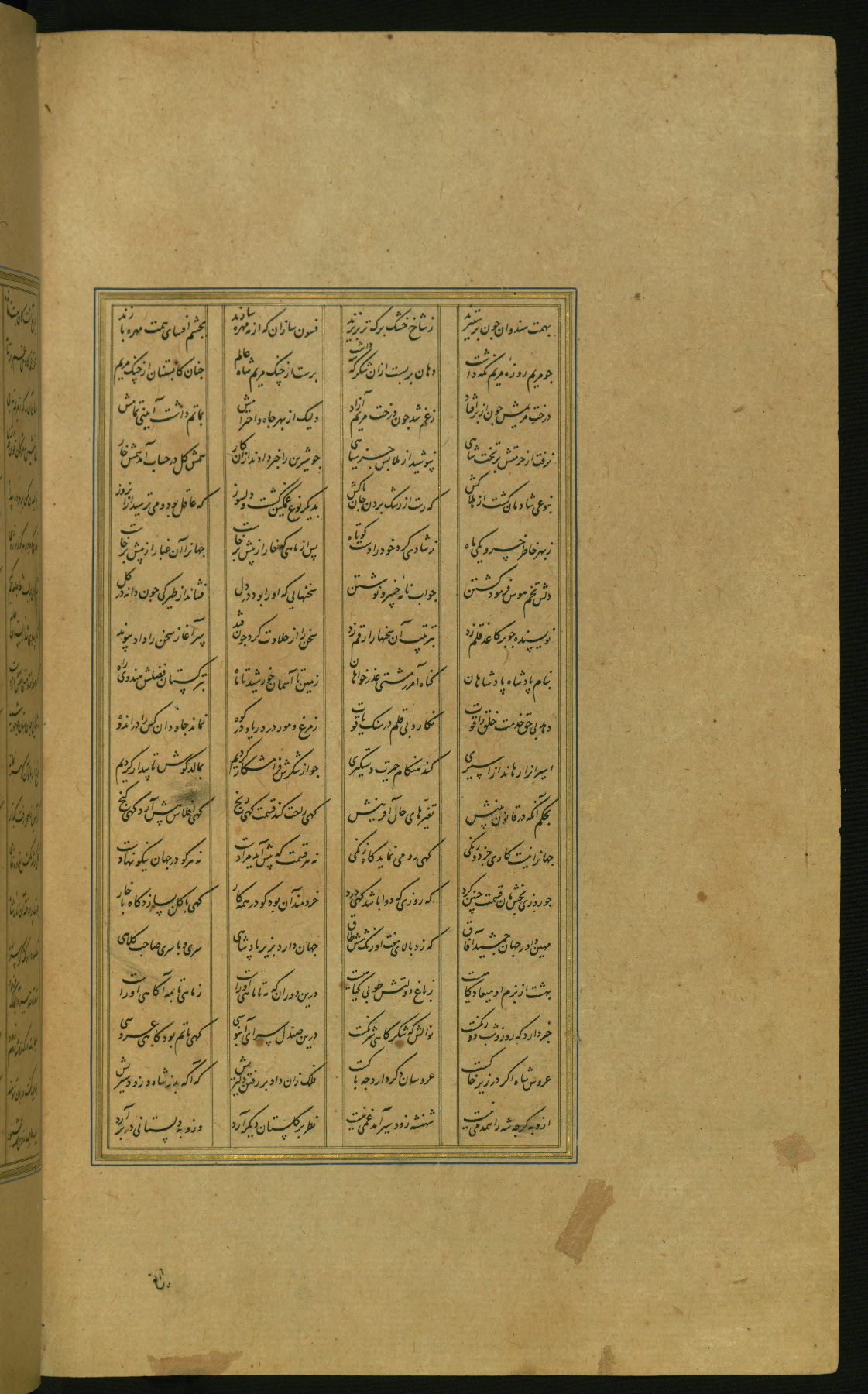 This illuminated and illustrated copy of the Khamsah (quintet) of Niẓāmī Ganjavī (d. 605 AH / 1209 CE) was written by Yār Muḥammad al-Haravī in 922 AH / 1516 CE. Written in four columns in black nastaʿlīq script, this manuscript opens with a double-page illuminated frontispiece signed by ʿAbd al-Wahhāb ibn ʿAbd al-Fattāḥ ibn ʿAlī. It contains thirty-five illustrations that were repainted in India during the twelfth century AH / eighteenth CE. The seal of Muḥammad Asharf ibn Muḥammad Khātam al-Ḥusaynī, dated 1173 AH / 1759-60 CE appears on fols. 1a and 401a. It is possible that the brown leather binding with center and side panels brushed with gold is original to the manuscript but was repaired at a later stage in the codex's history.