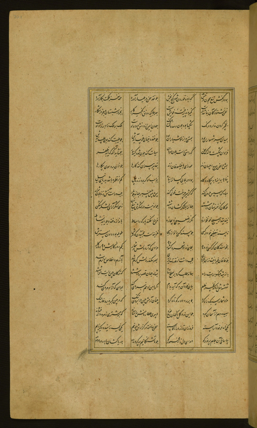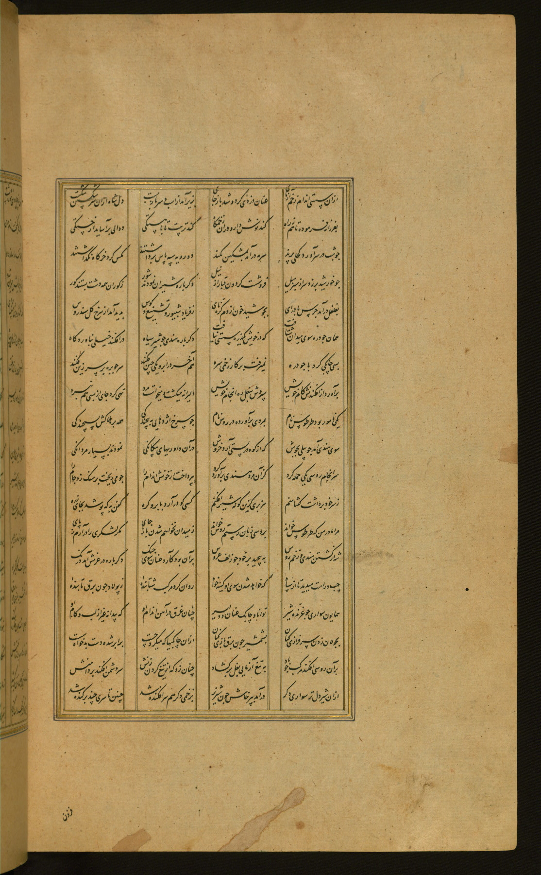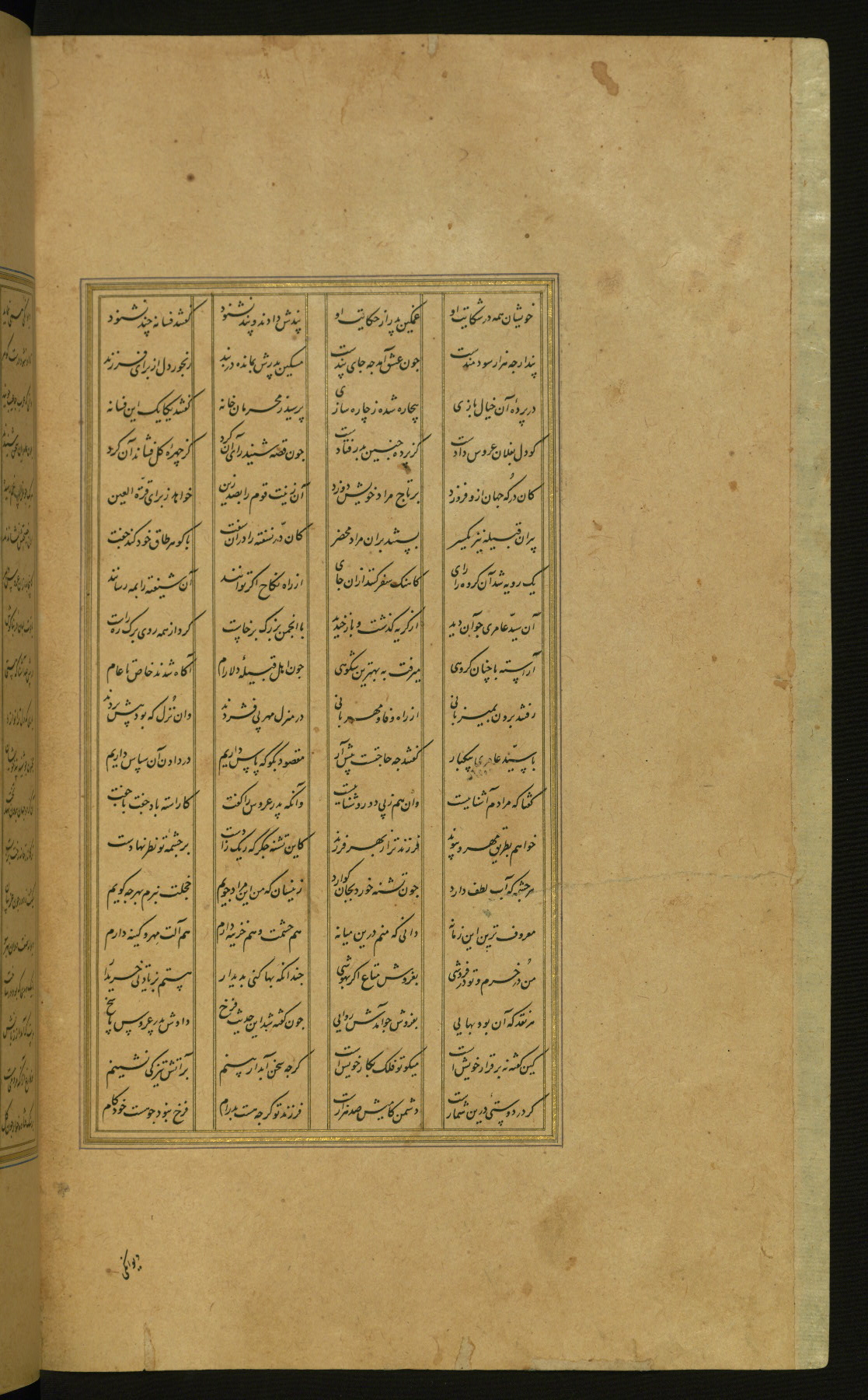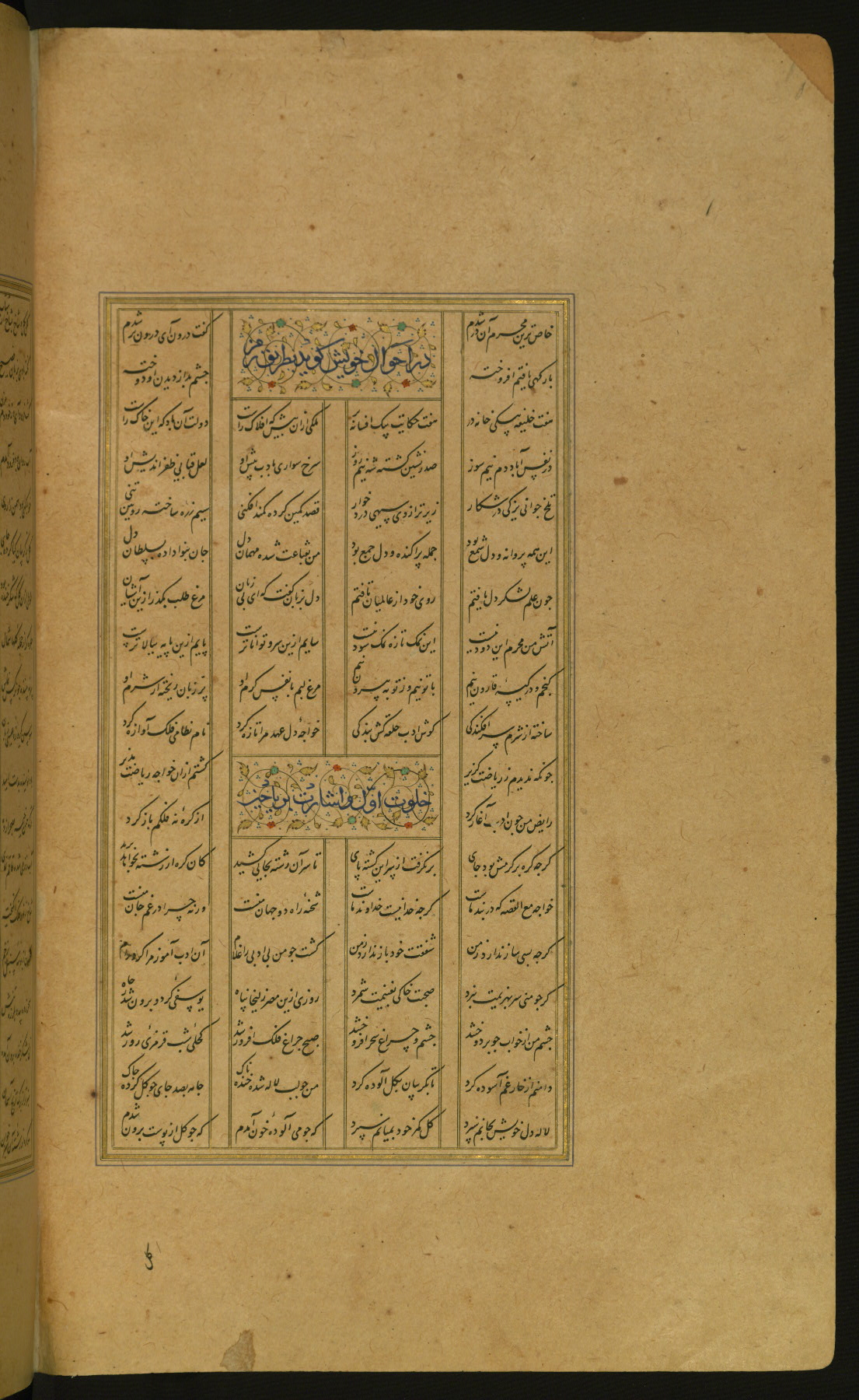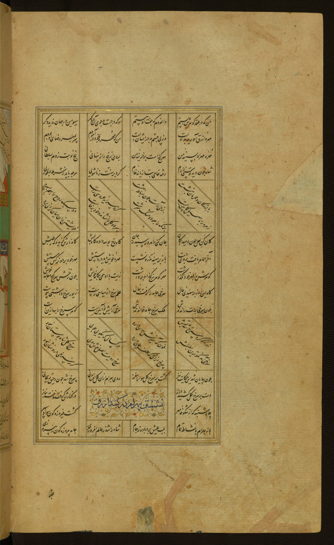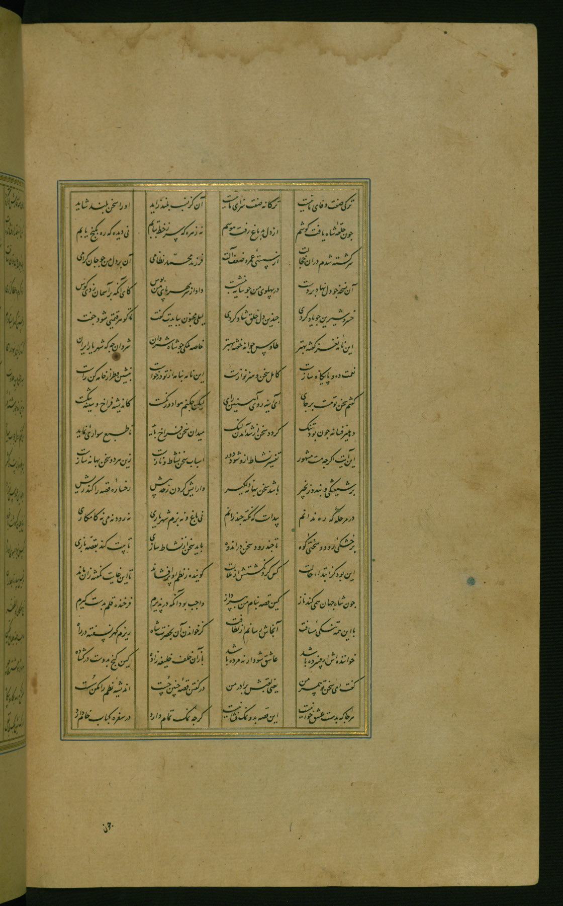 This illuminated and illustrated copy of the Khamsah (quintet) of Niẓāmī Ganjavī (d. 605 AH / 1209 CE) was written by Yār Muḥammad al-Haravī in 922 AH / 1516 CE. Written in four columns in black nastaʿlīq script, this manuscript opens with a double-page illuminated frontispiece signed by ʿAbd al-Wahhāb ibn ʿAbd al-Fattāḥ ibn ʿAlī. It contains thirty-five illustrations that were repainted in India during the twelfth century AH / eighteenth CE. The seal of Muḥammad Asharf ibn Muḥammad Khātam al-Ḥusaynī, dated 1173 AH / 1759-60 CE appears on fols. 1a and 401a. It is possible that the brown leather binding with center and side panels brushed with gold is original to the manuscript but was repaired at a later stage in the codex's history.