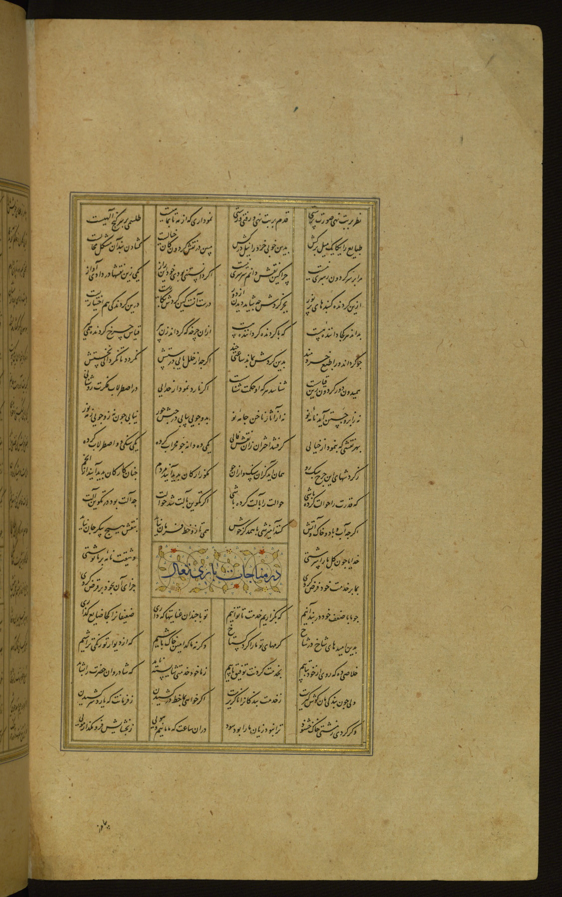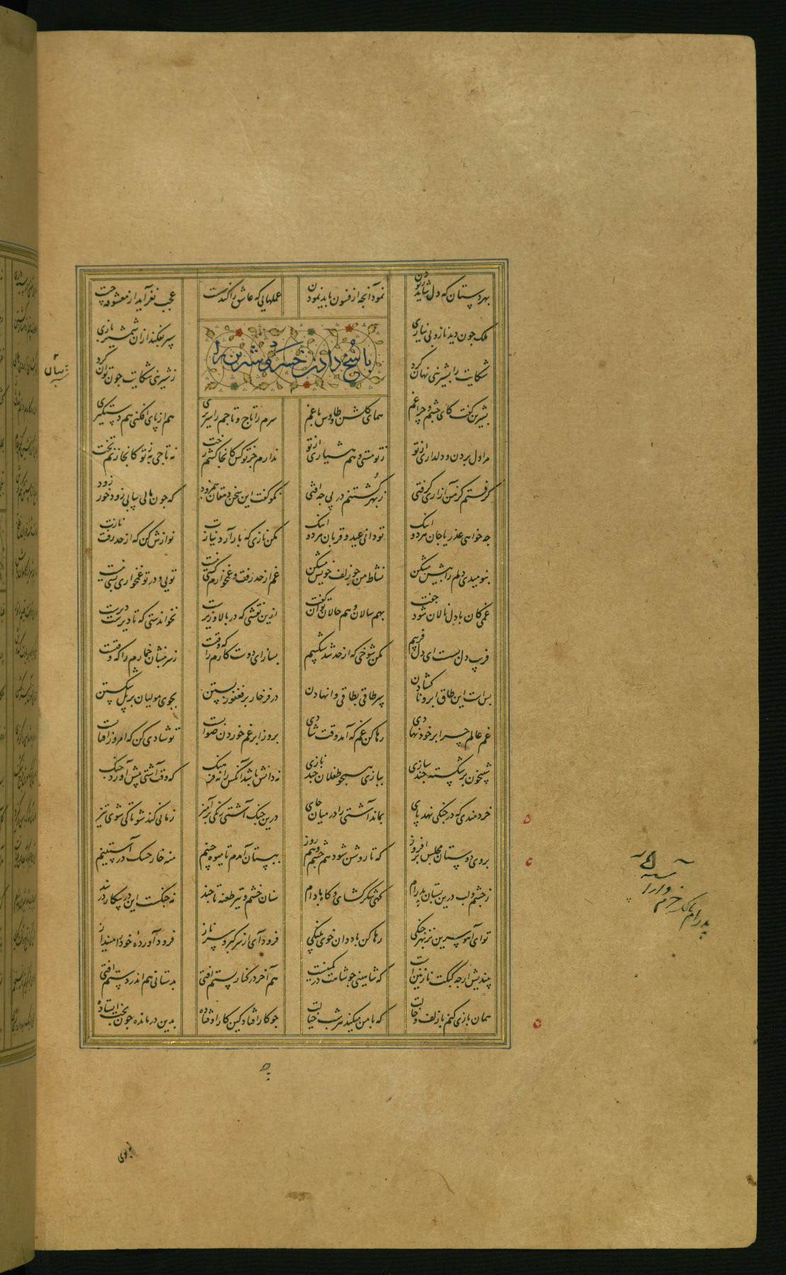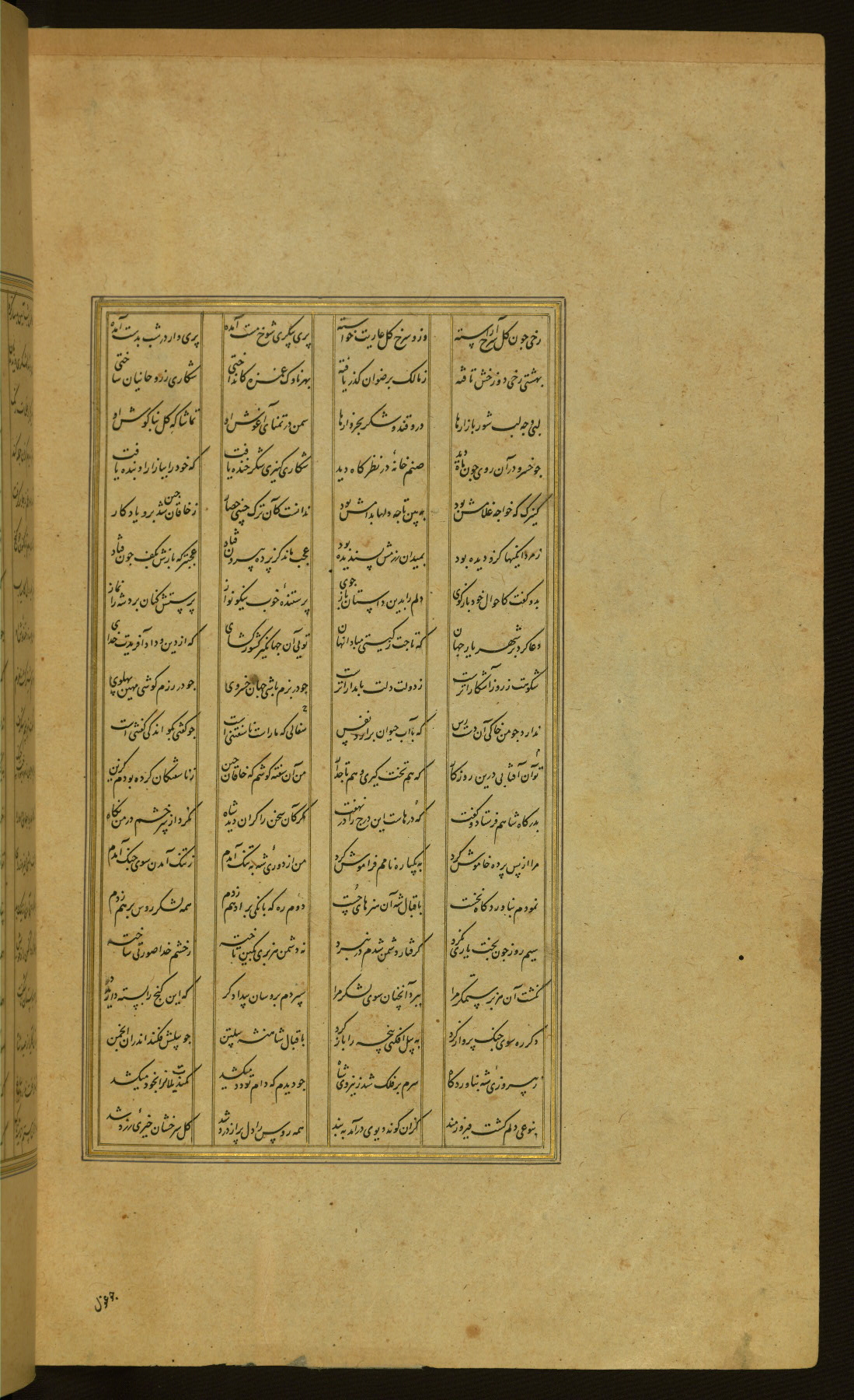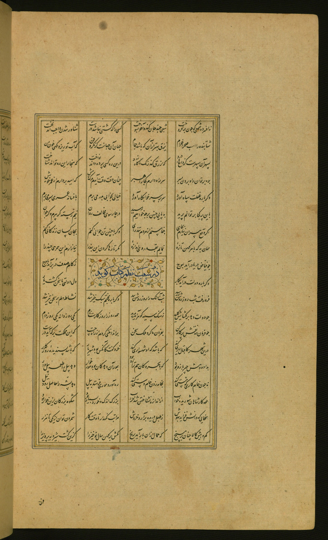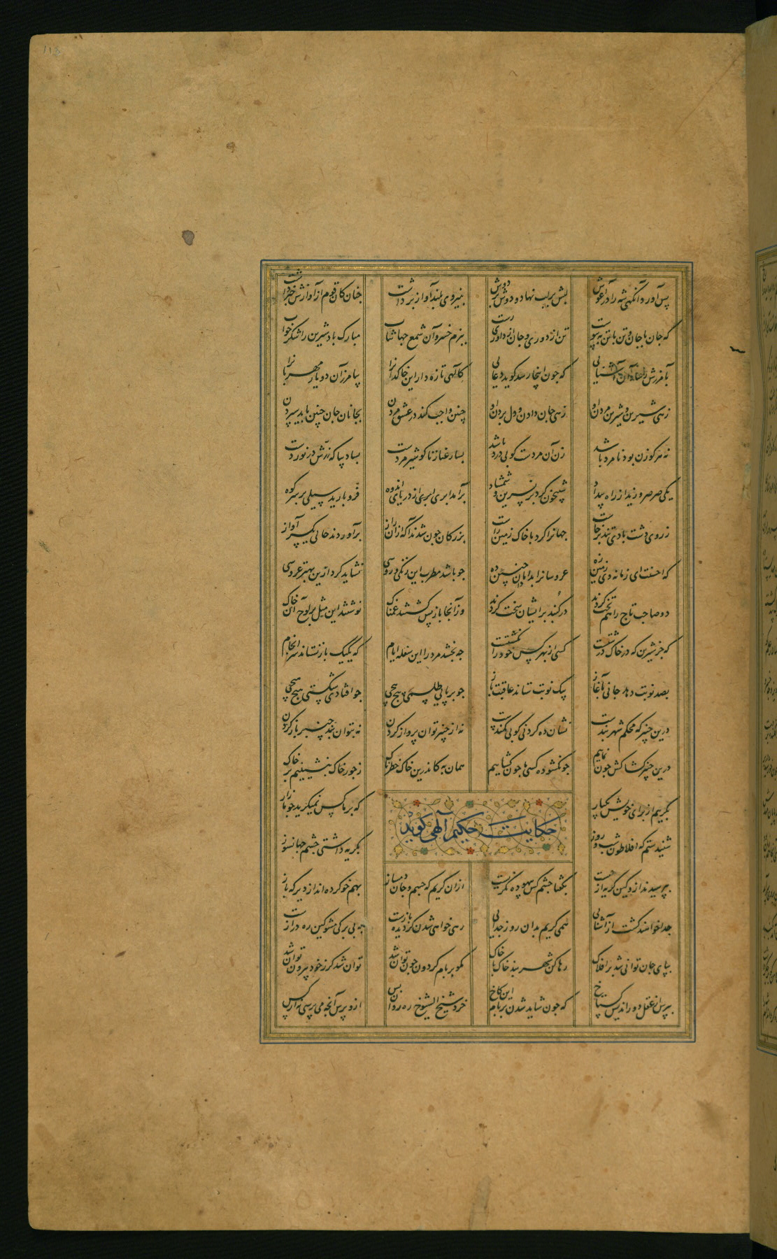 This illuminated and illustrated copy of the Khamsah (quintet) of Niẓāmī Ganjavī (d. 605 AH / 1209 CE) was written by Yār Muḥammad al-Haravī in 922 AH / 1516 CE. Written in four columns in black nastaʿlīq script, this manuscript opens with a double-page illuminated frontispiece signed by ʿAbd al-Wahhāb ibn ʿAbd al-Fattāḥ ibn ʿAlī. It contains thirty-five illustrations that were repainted in India during the twelfth century AH / eighteenth CE. The seal of Muḥammad Asharf ibn Muḥammad Khātam al-Ḥusaynī, dated 1173 AH / 1759-60 CE appears on fols. 1a and 401a. It is possible that the brown leather binding with center and side panels brushed with gold is original to the manuscript but was repaired at a later stage in the codex's history.