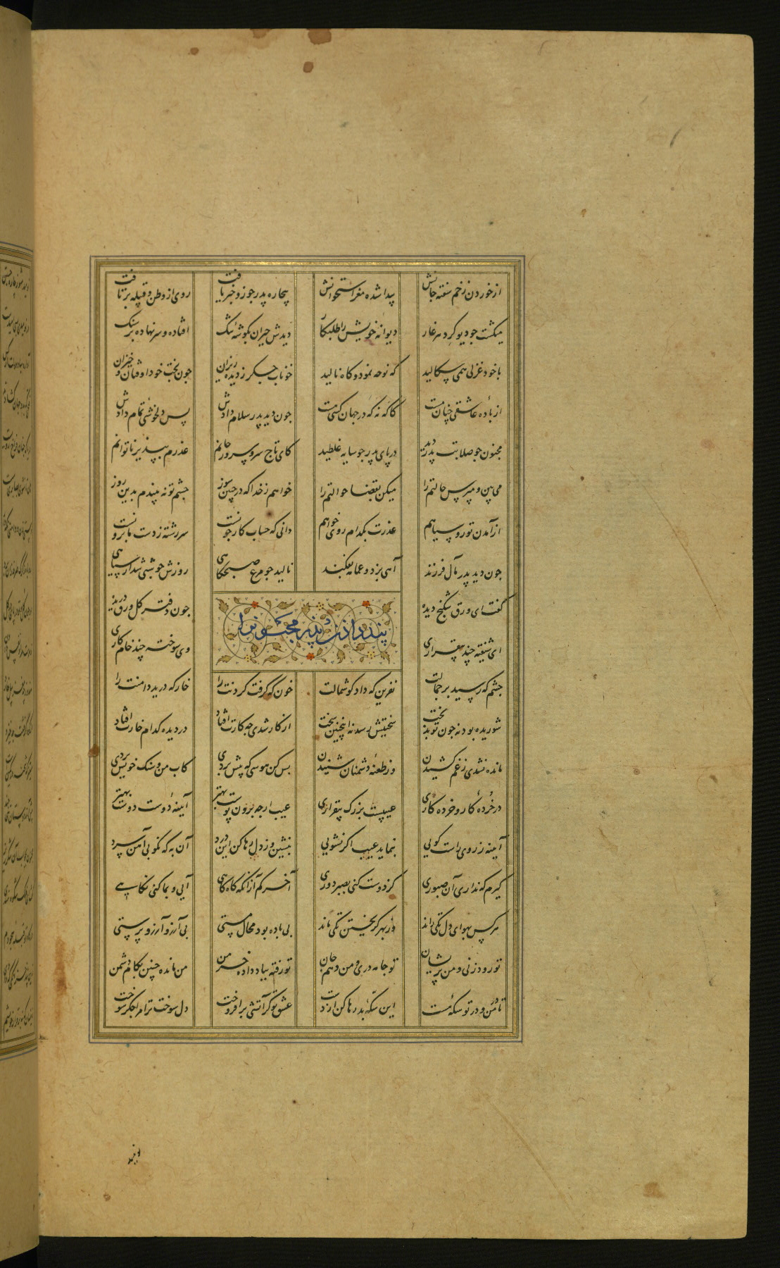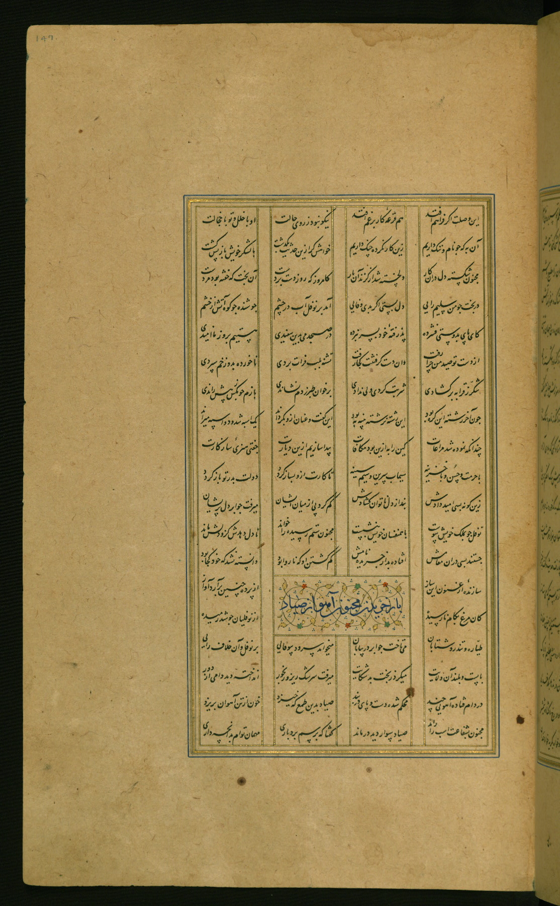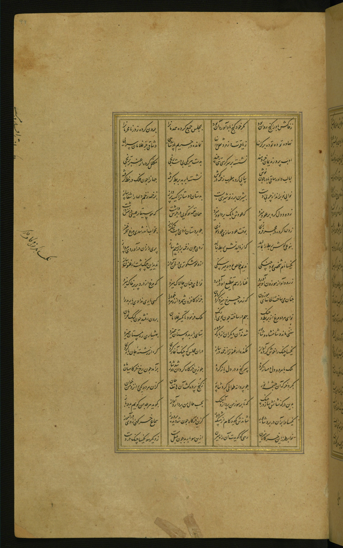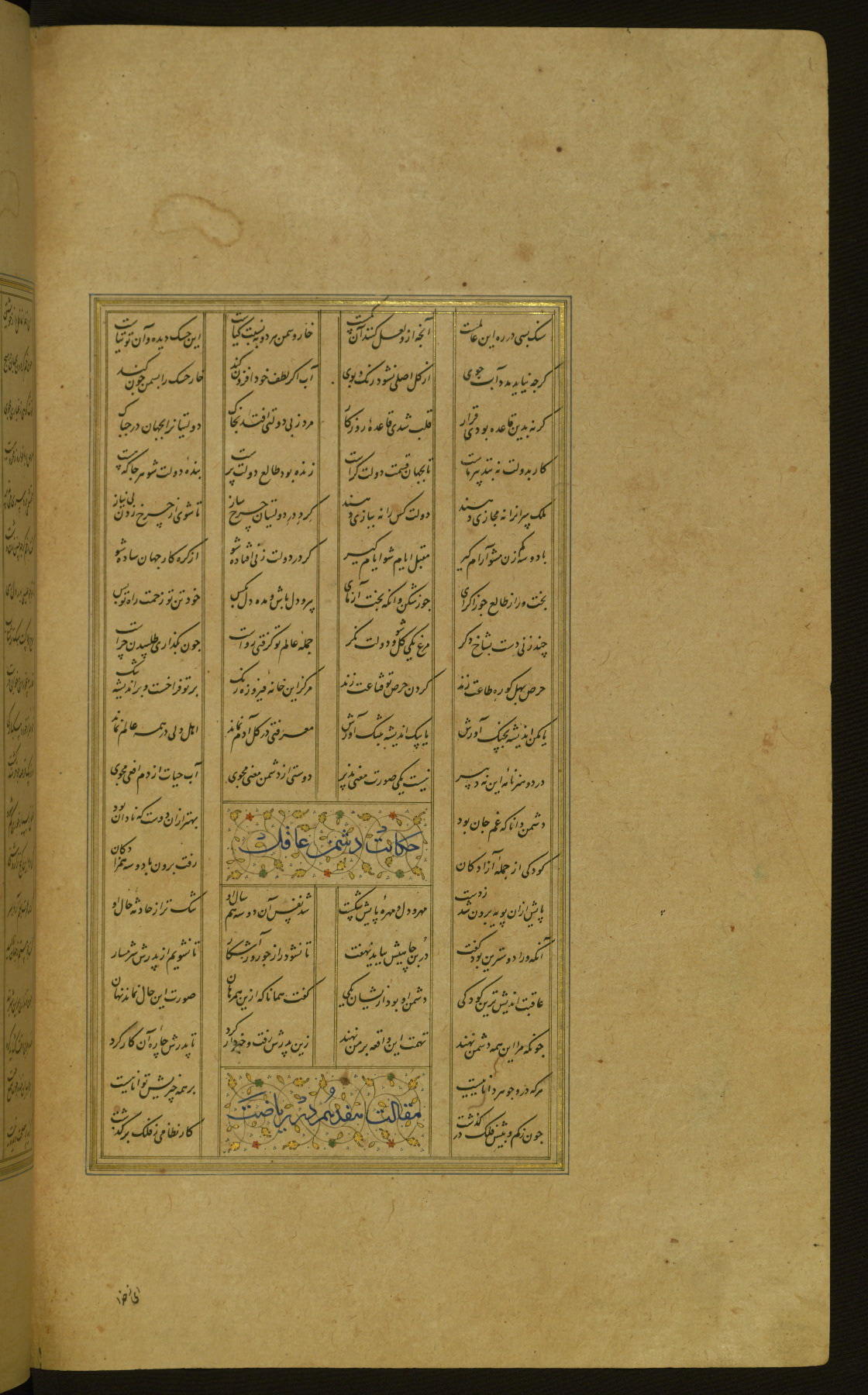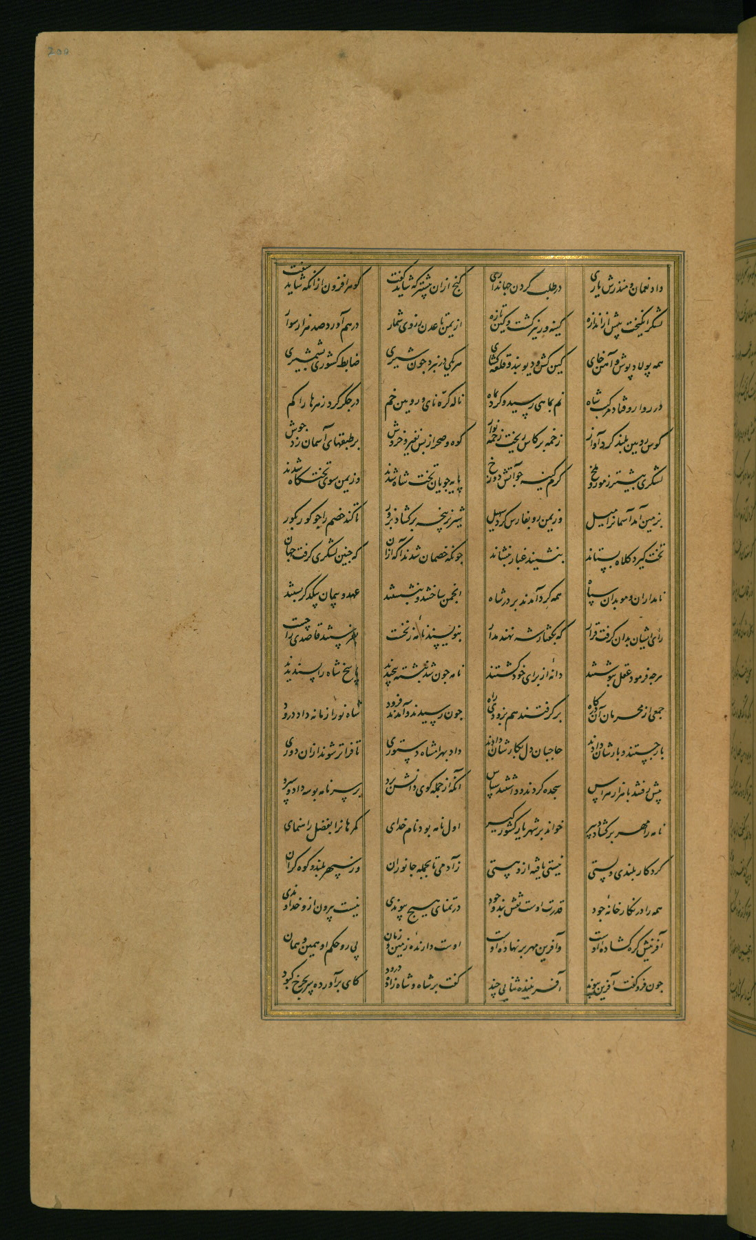 This illuminated and illustrated copy of the Khamsah (quintet) of Niẓāmī Ganjavī (d. 605 AH / 1209 CE) was written by Yār Muḥammad al-Haravī in 922 AH / 1516 CE. Written in four columns in black nastaʿlīq script, this manuscript opens with a double-page illuminated frontispiece signed by ʿAbd al-Wahhāb ibn ʿAbd al-Fattāḥ ibn ʿAlī. It contains thirty-five illustrations that were repainted in India during the twelfth century AH / eighteenth CE. The seal of Muḥammad Asharf ibn Muḥammad Khātam al-Ḥusaynī, dated 1173 AH / 1759-60 CE appears on fols. 1a and 401a. It is possible that the brown leather binding with center and side panels brushed with gold is original to the manuscript but was repaired at a later stage in the codex's history.