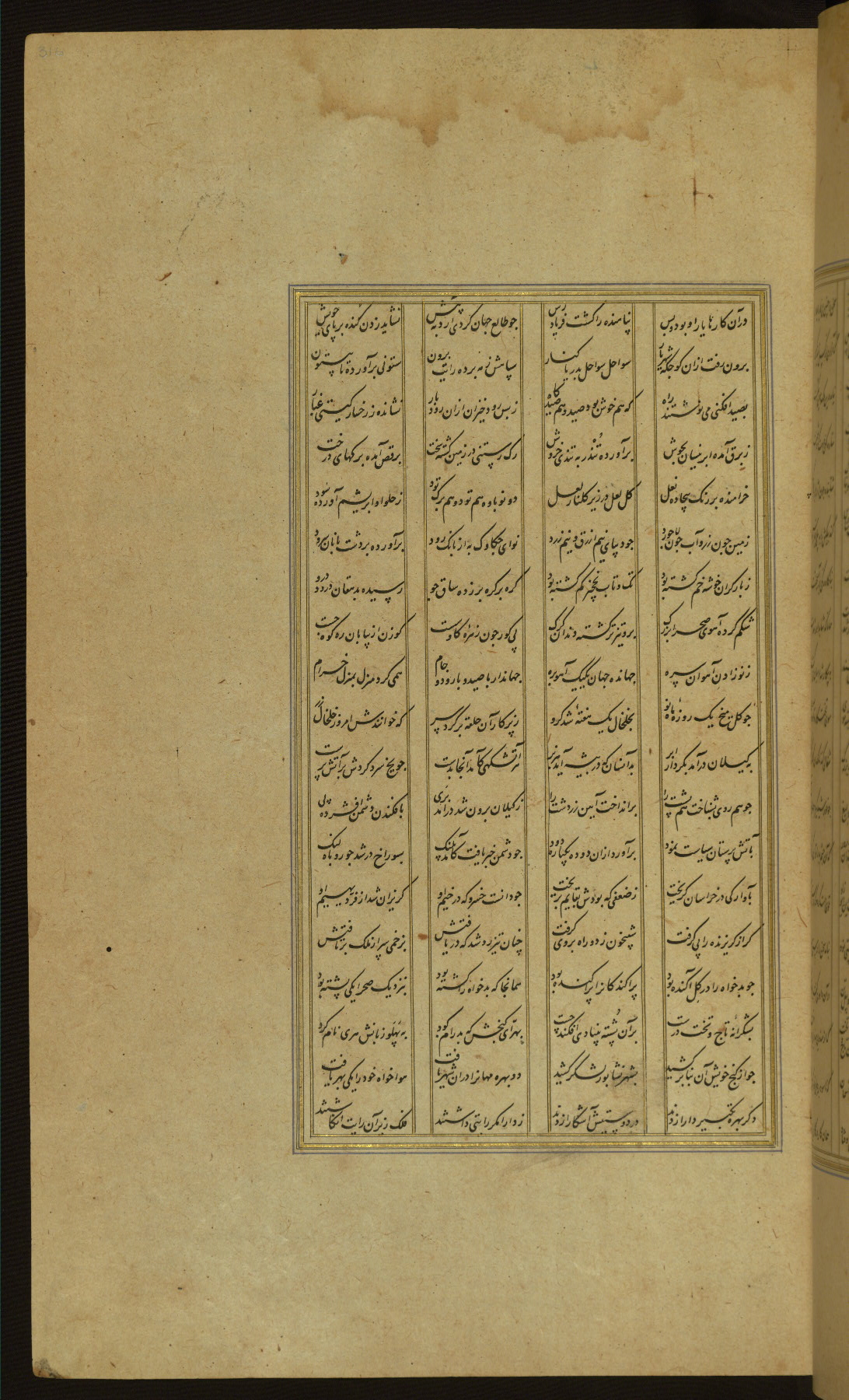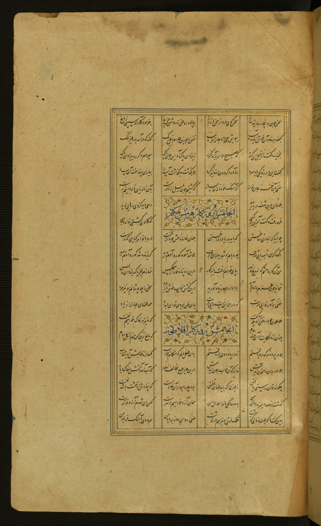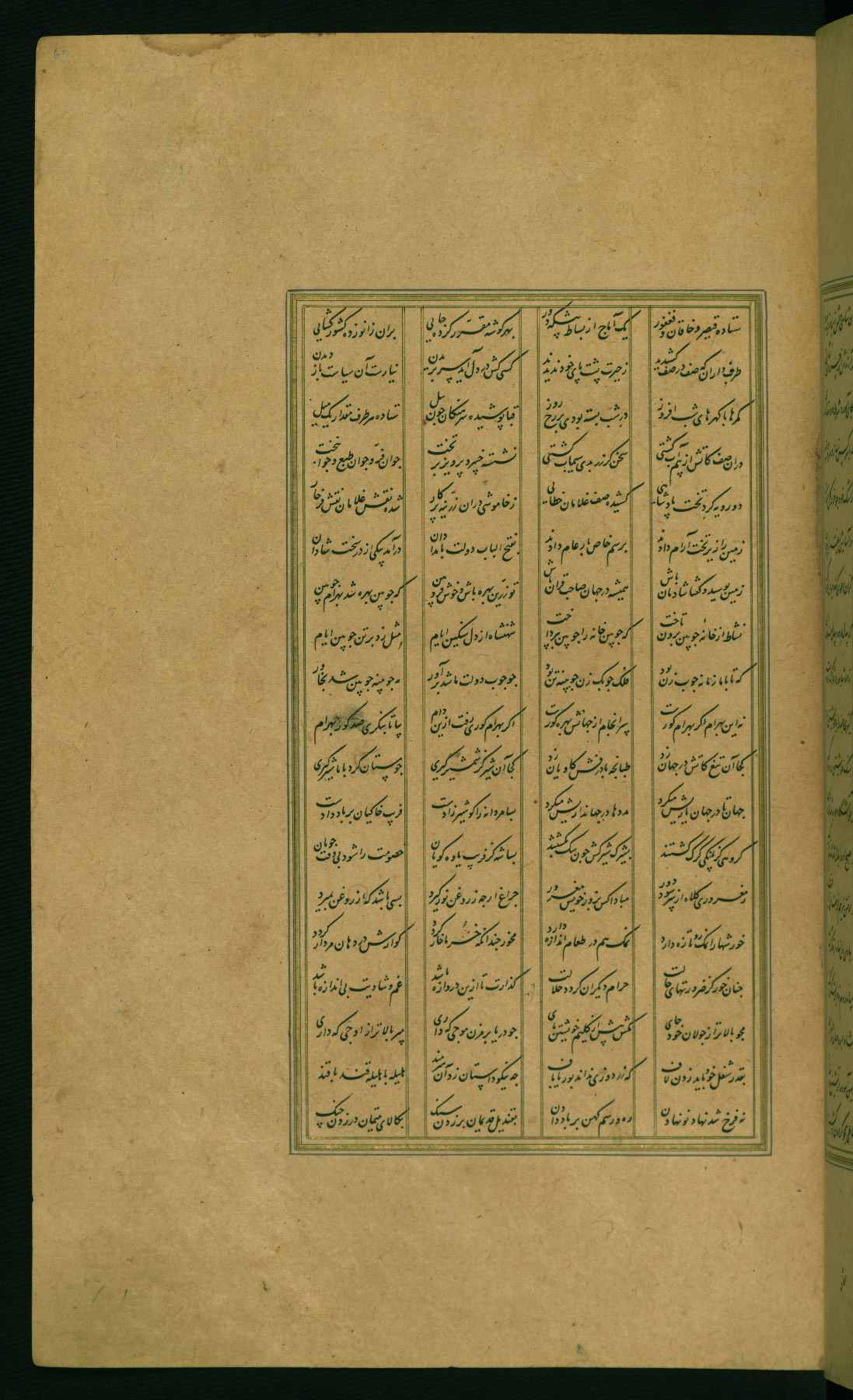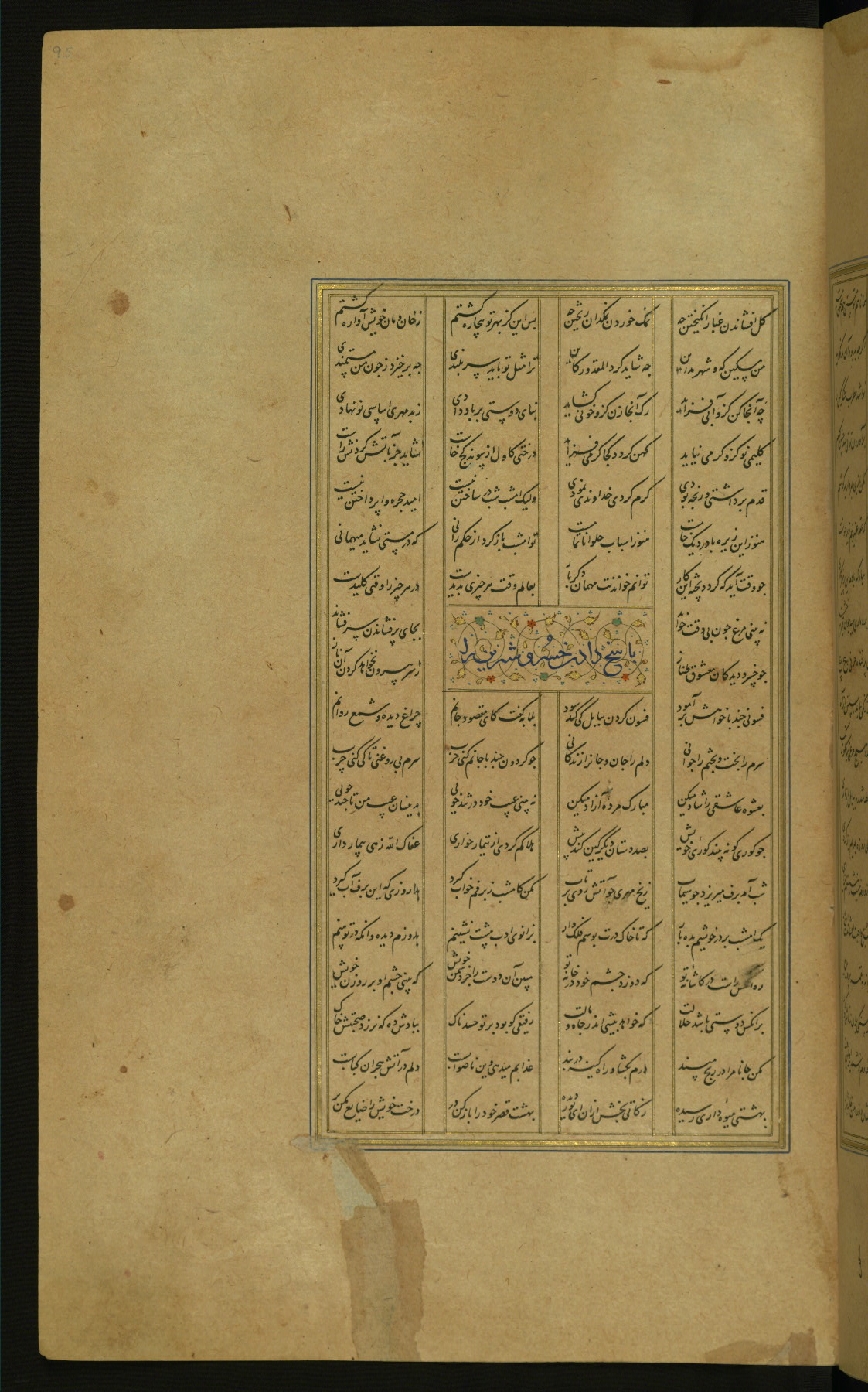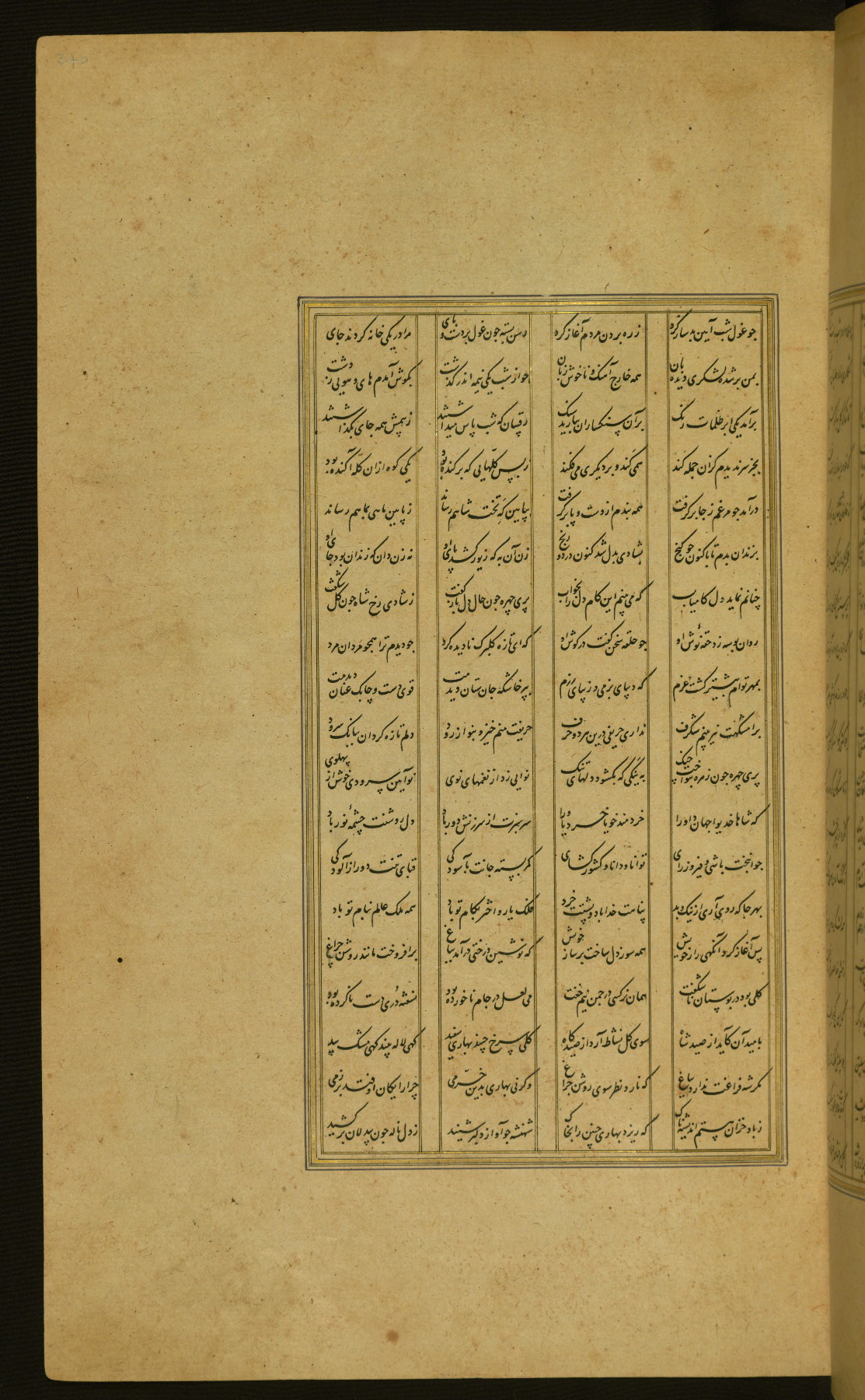 This illuminated and illustrated copy of the Khamsah (quintet) of Niẓāmī Ganjavī (d. 605 AH / 1209 CE) was written by Yār Muḥammad al-Haravī in 922 AH / 1516 CE. Written in four columns in black nastaʿlīq script, this manuscript opens with a double-page illuminated frontispiece signed by ʿAbd al-Wahhāb ibn ʿAbd al-Fattāḥ ibn ʿAlī. It contains thirty-five illustrations that were repainted in India during the twelfth century AH / eighteenth CE. The seal of Muḥammad Asharf ibn Muḥammad Khātam al-Ḥusaynī, dated 1173 AH / 1759-60 CE appears on fols. 1a and 401a. It is possible that the brown leather binding with center and side panels brushed with gold is original to the manuscript but was repaired at a later stage in the codex's history.
