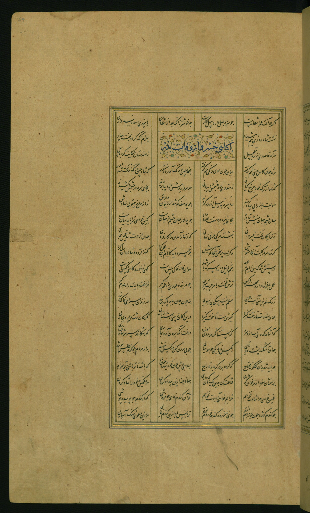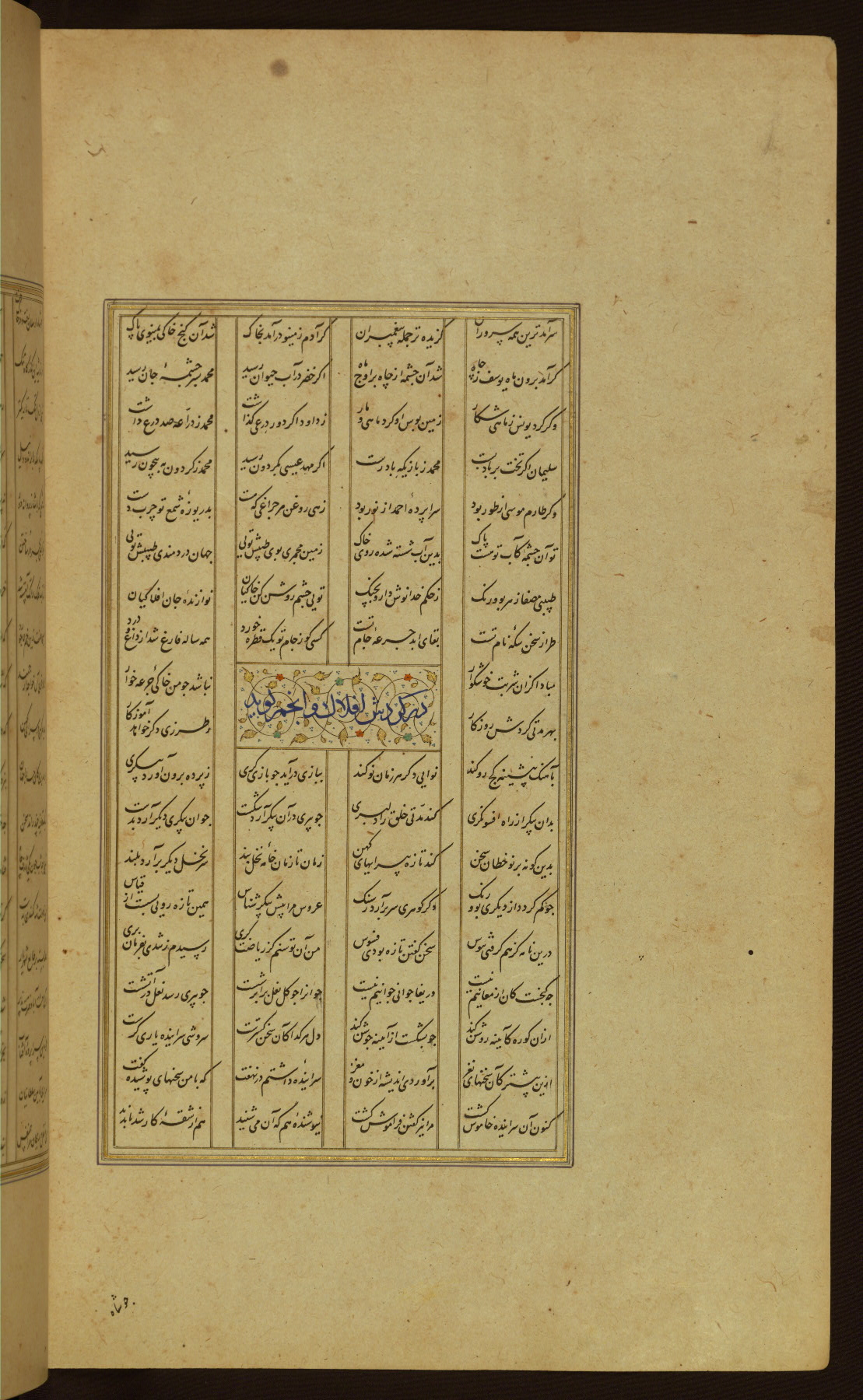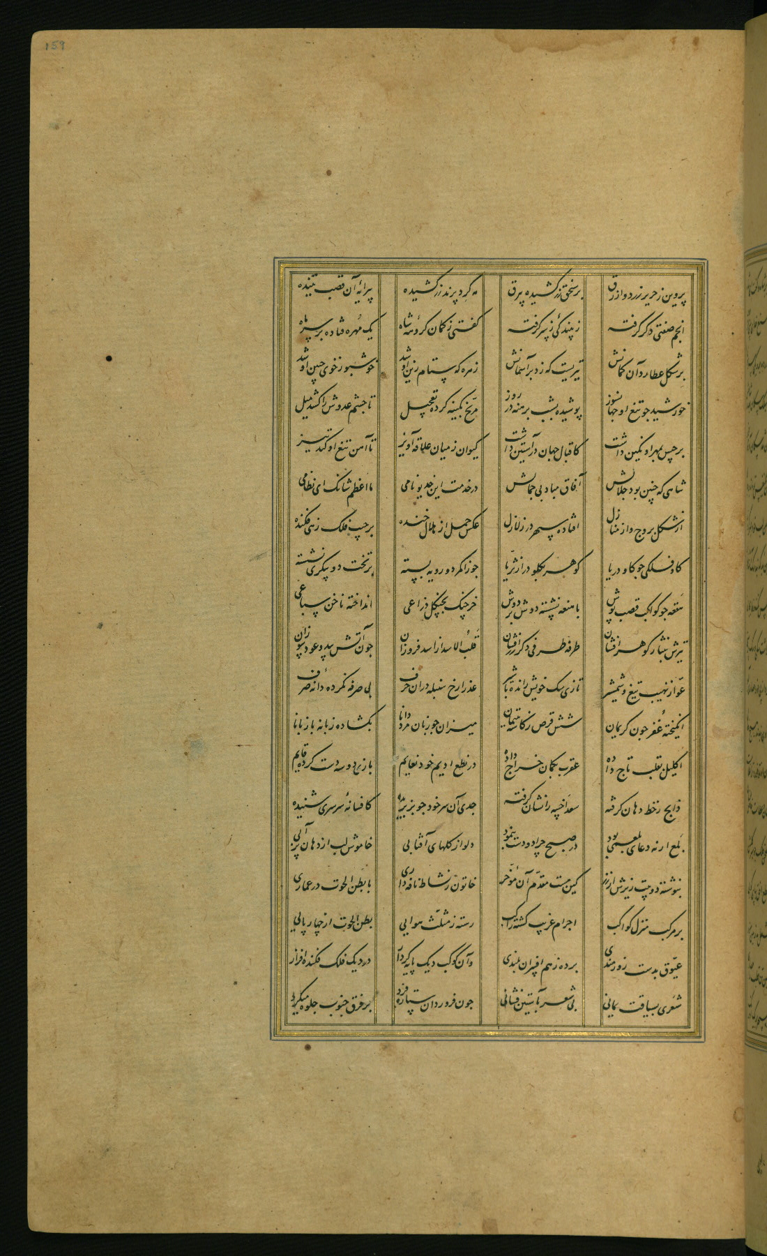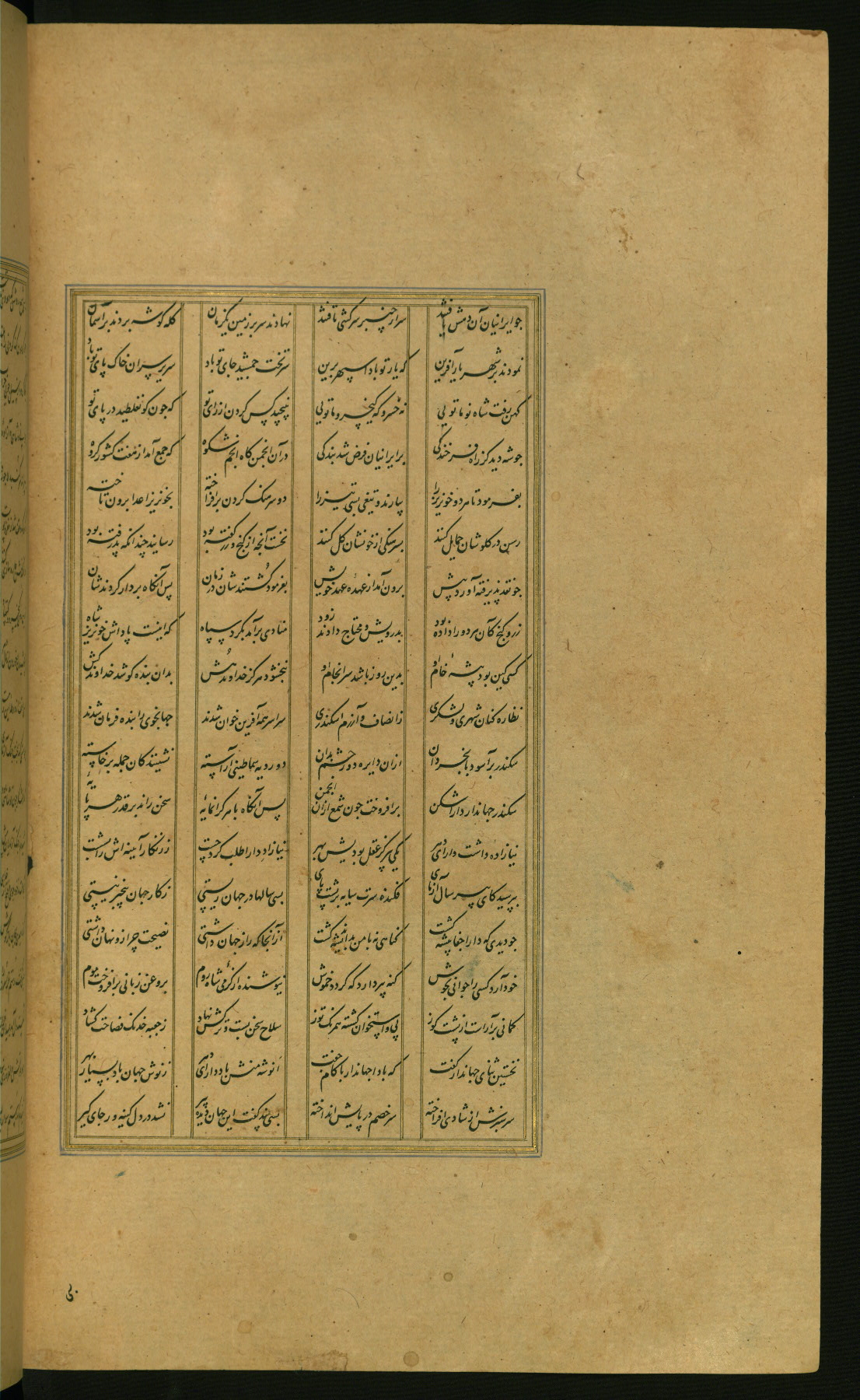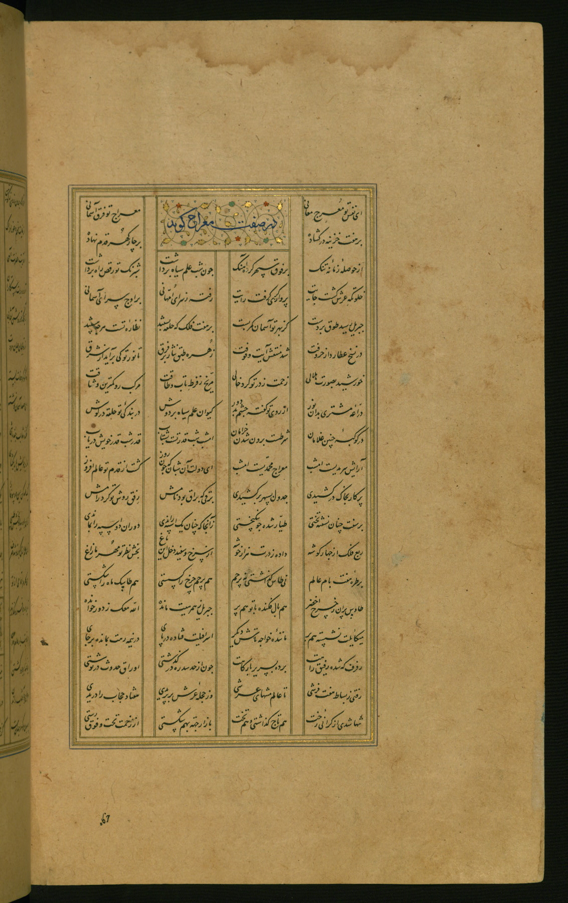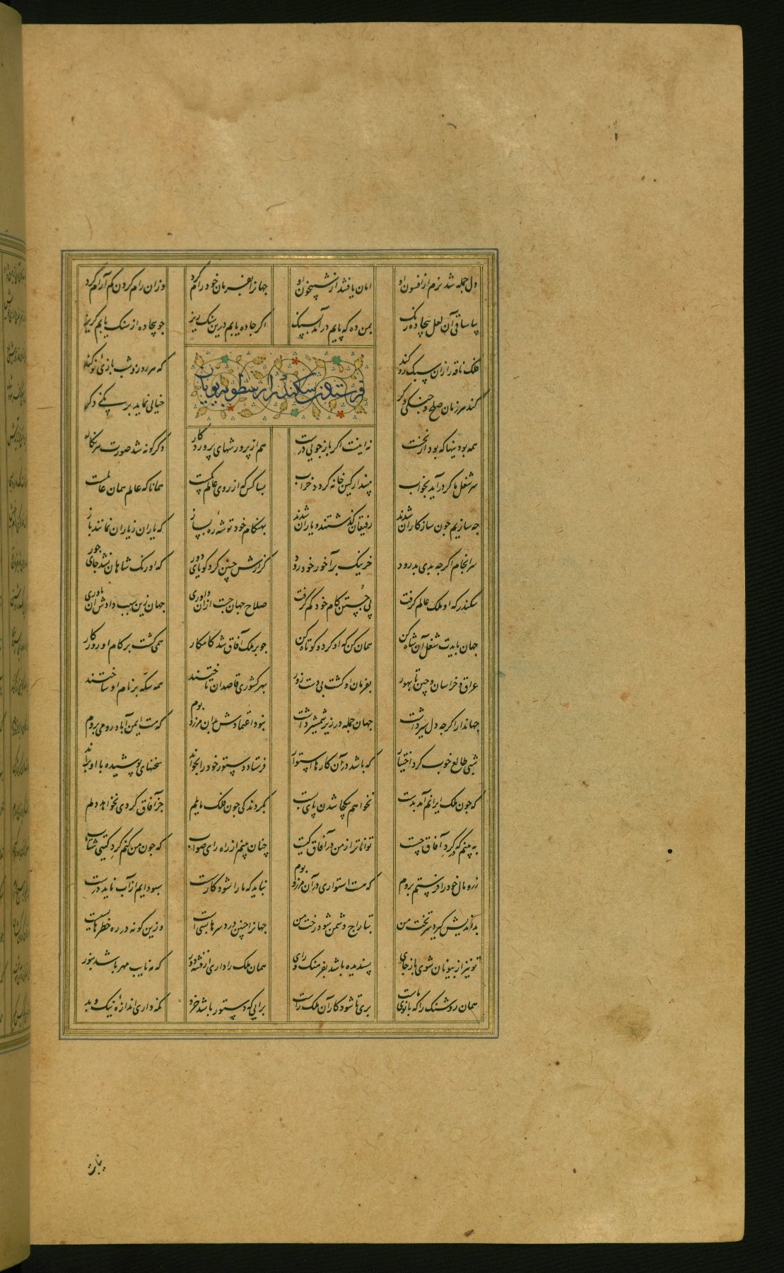 This illuminated and illustrated copy of the Khamsah (quintet) of Niẓāmī Ganjavī (d. 605 AH / 1209 CE) was written by Yār Muḥammad al-Haravī in 922 AH / 1516 CE. Written in four columns in black nastaʿlīq script, this manuscript opens with a double-page illuminated frontispiece signed by ʿAbd al-Wahhāb ibn ʿAbd al-Fattāḥ ibn ʿAlī. It contains thirty-five illustrations that were repainted in India during the twelfth century AH / eighteenth CE. The seal of Muḥammad Asharf ibn Muḥammad Khātam al-Ḥusaynī, dated 1173 AH / 1759-60 CE appears on fols. 1a and 401a. It is possible that the brown leather binding with center and side panels brushed with gold is original to the manuscript but was repaired at a later stage in the codex's history.