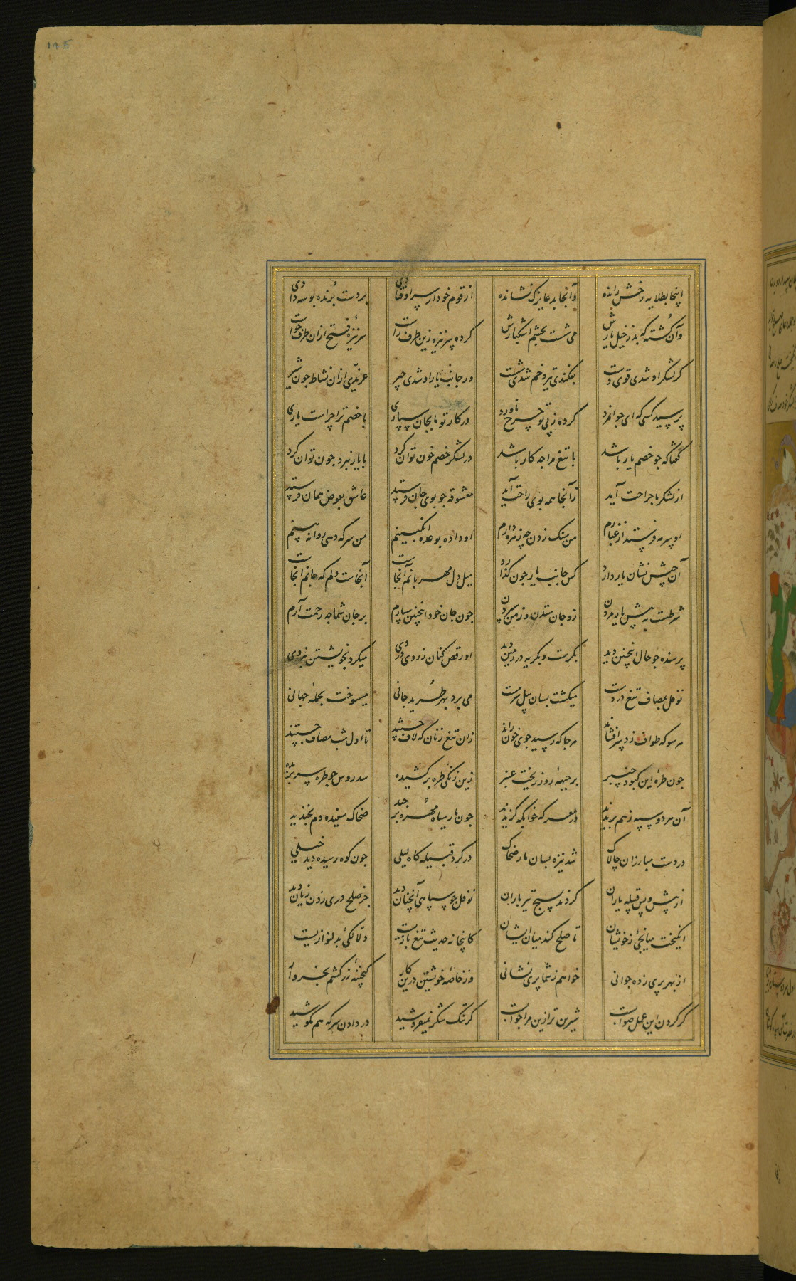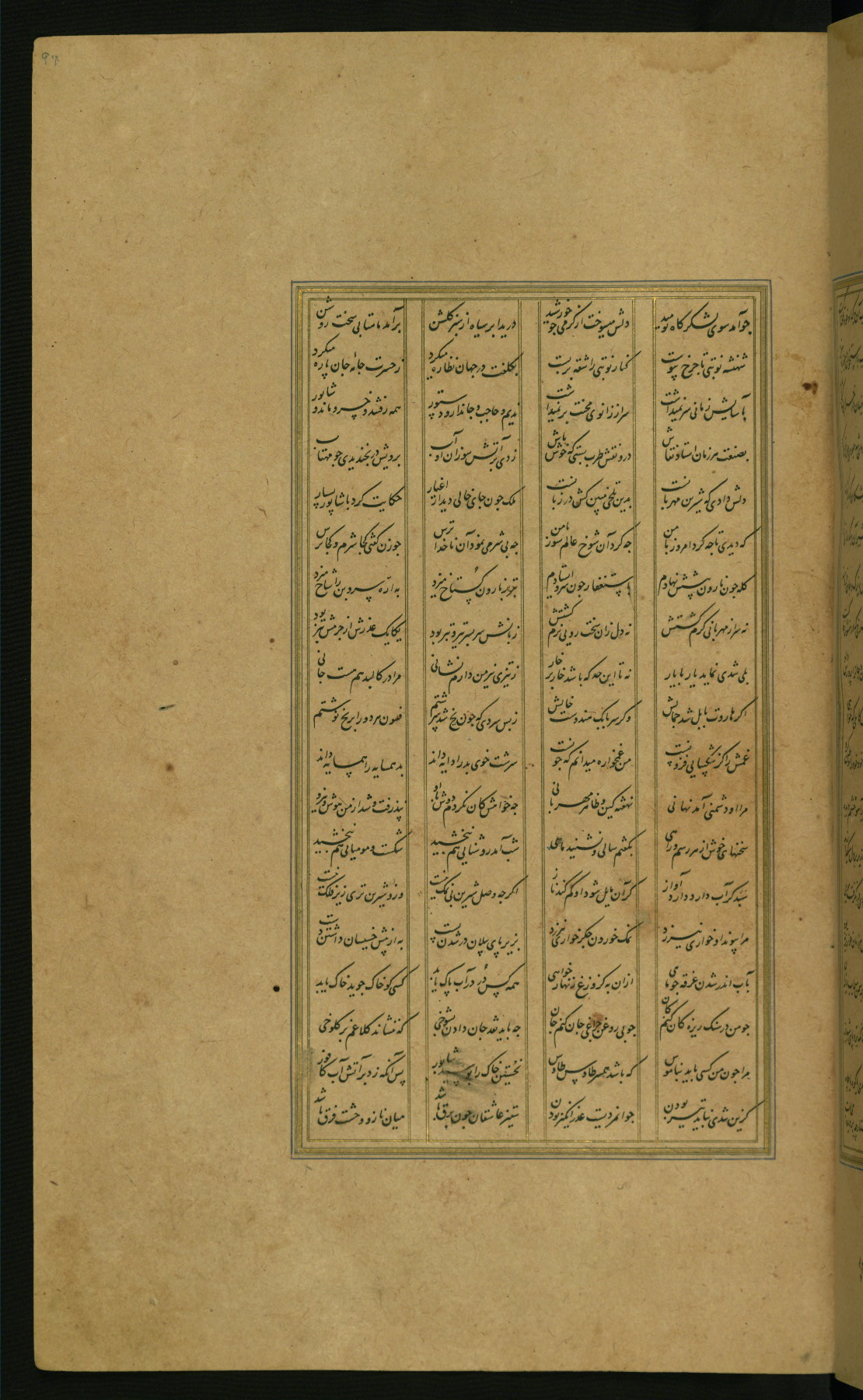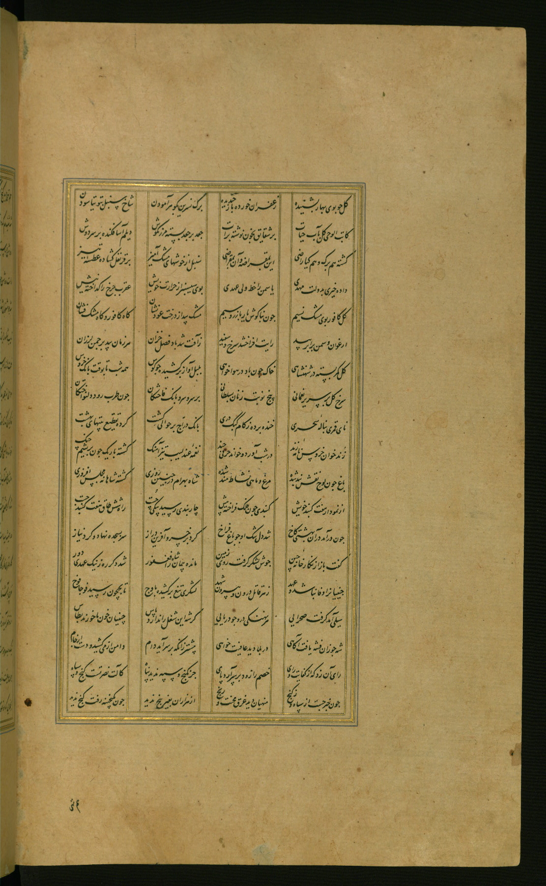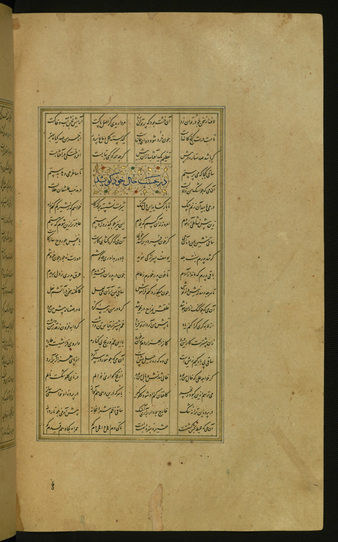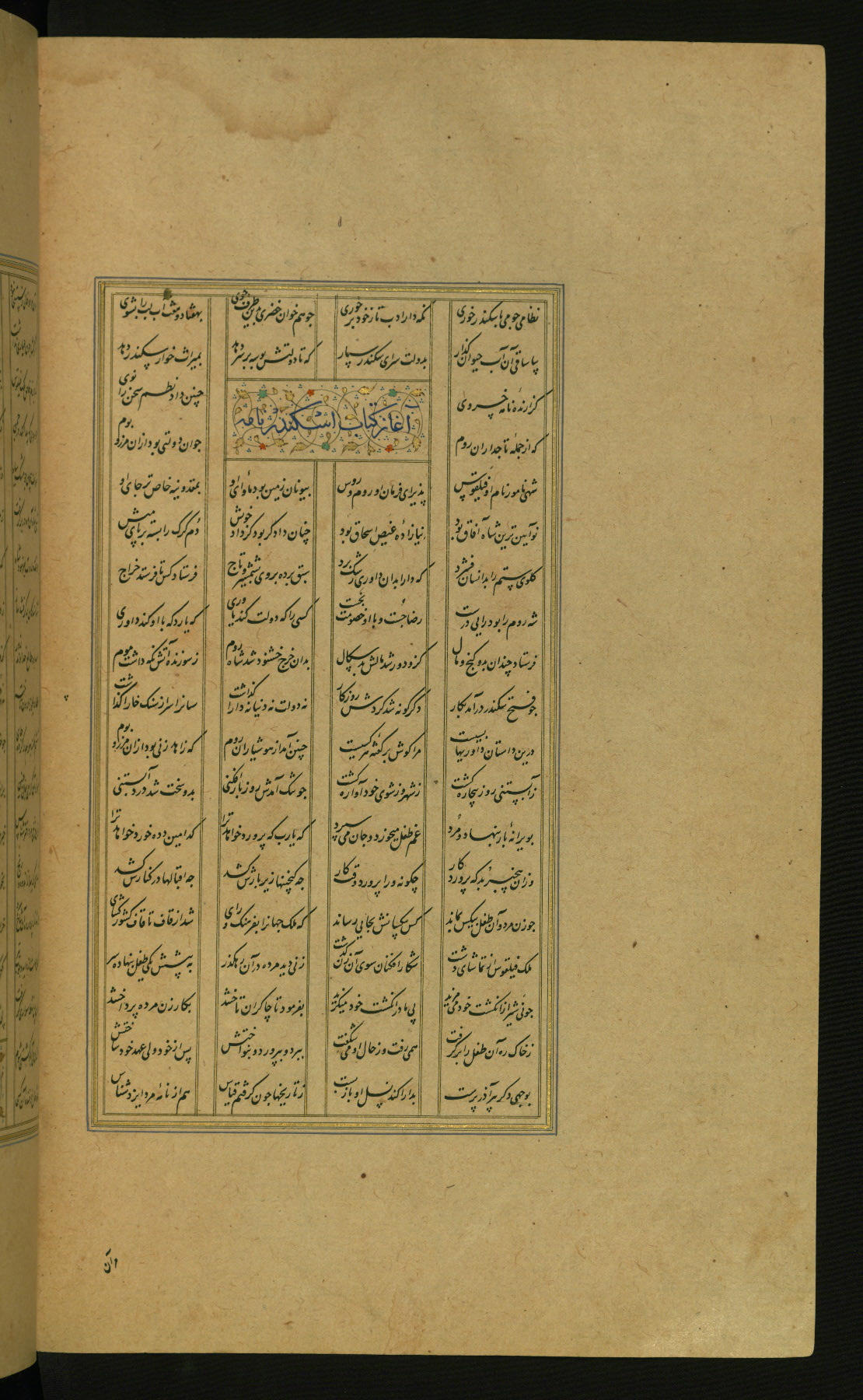 This illuminated and illustrated copy of the Khamsah (quintet) of Niẓāmī Ganjavī (d. 605 AH / 1209 CE) was written by Yār Muḥammad al-Haravī in 922 AH / 1516 CE. Written in four columns in black nastaʿlīq script, this manuscript opens with a double-page illuminated frontispiece signed by ʿAbd al-Wahhāb ibn ʿAbd al-Fattāḥ ibn ʿAlī. It contains thirty-five illustrations that were repainted in India during the twelfth century AH / eighteenth CE. The seal of Muḥammad Asharf ibn Muḥammad Khātam al-Ḥusaynī, dated 1173 AH / 1759-60 CE appears on fols. 1a and 401a. It is possible that the brown leather binding with center and side panels brushed with gold is original to the manuscript but was repaired at a later stage in the codex's history.