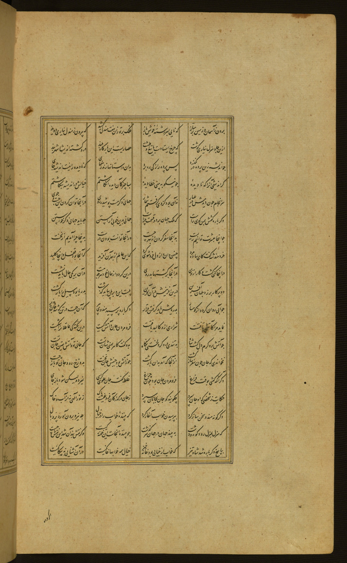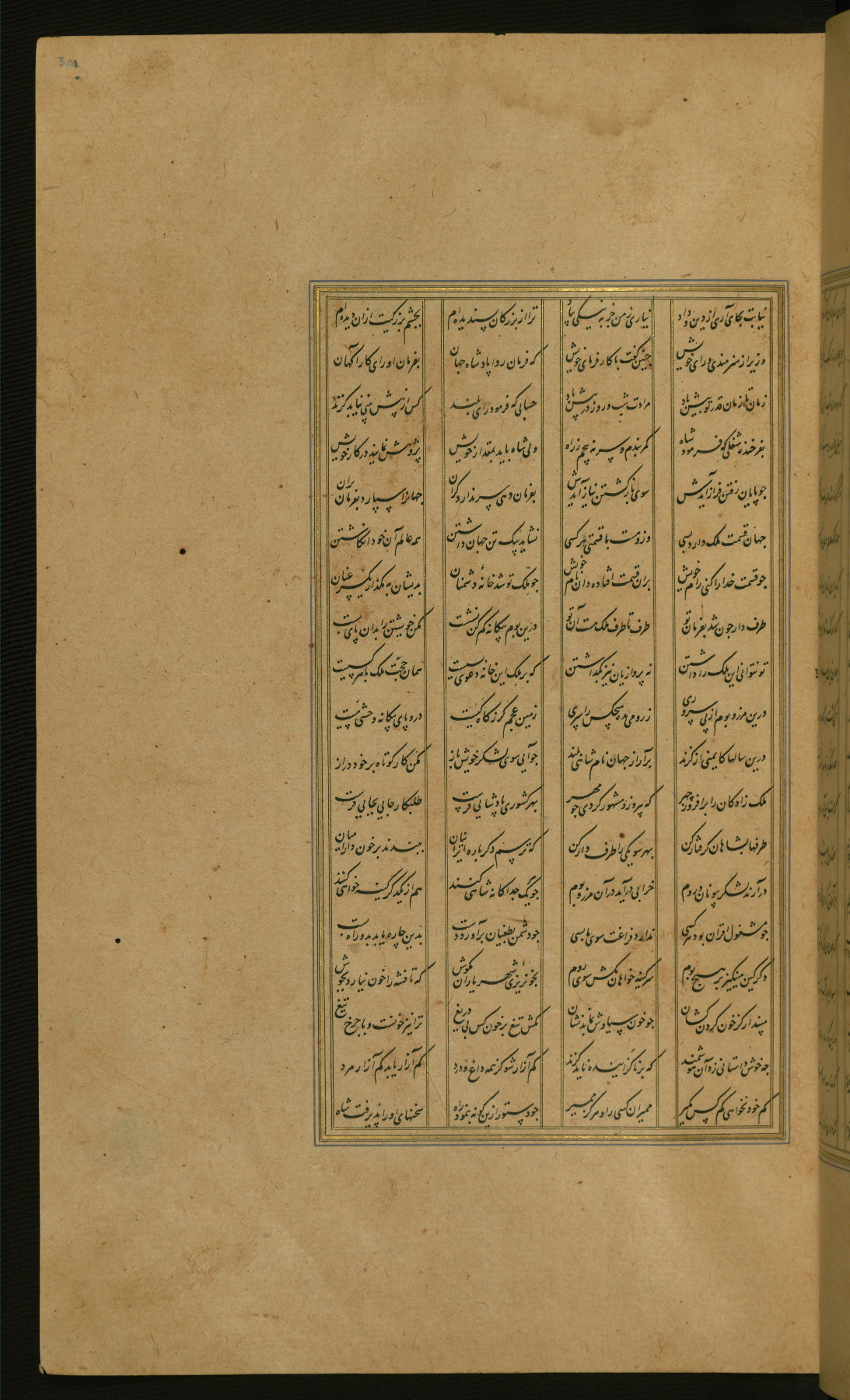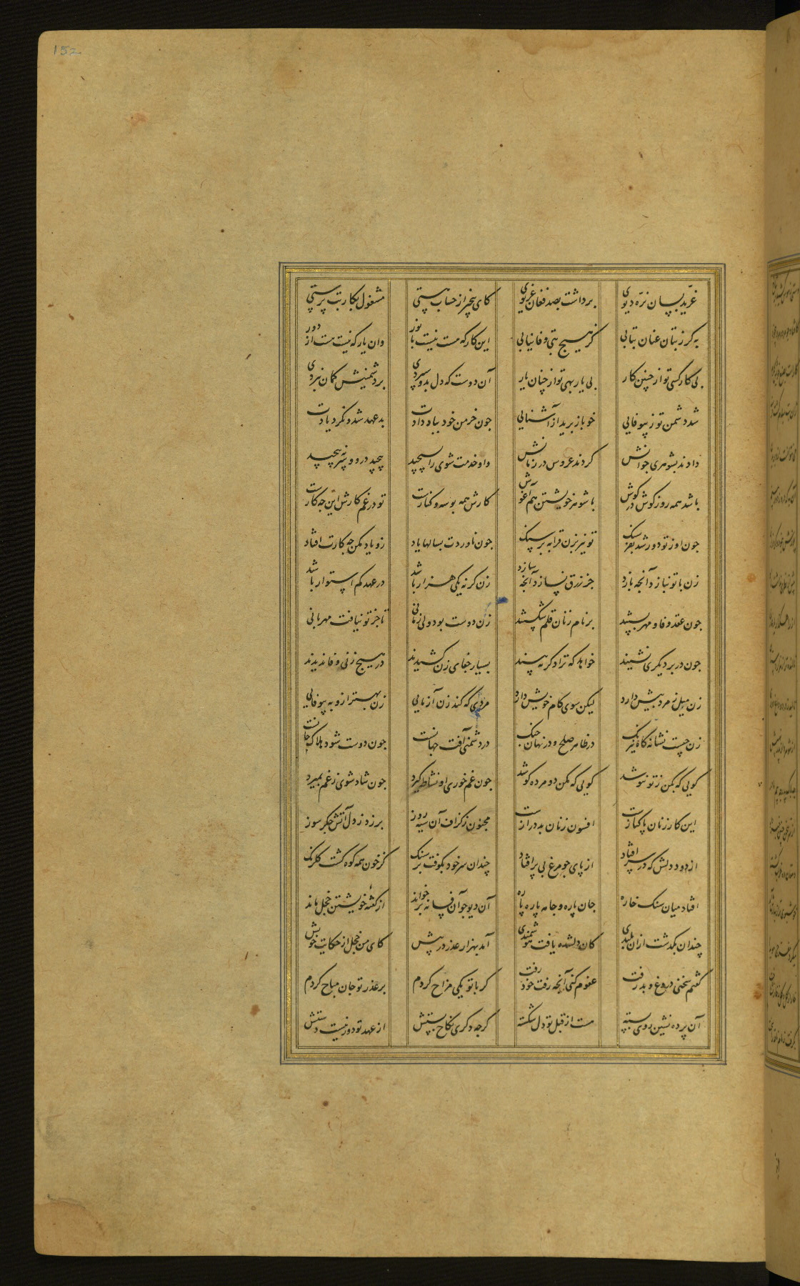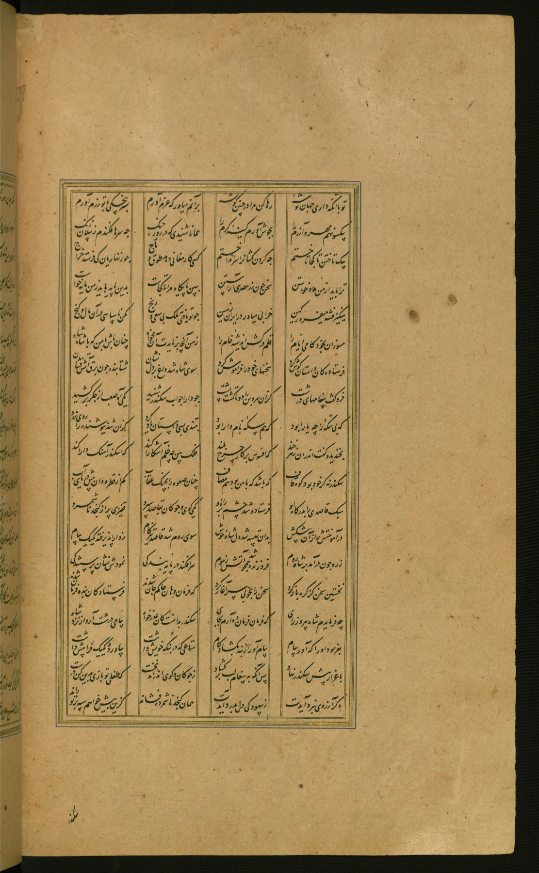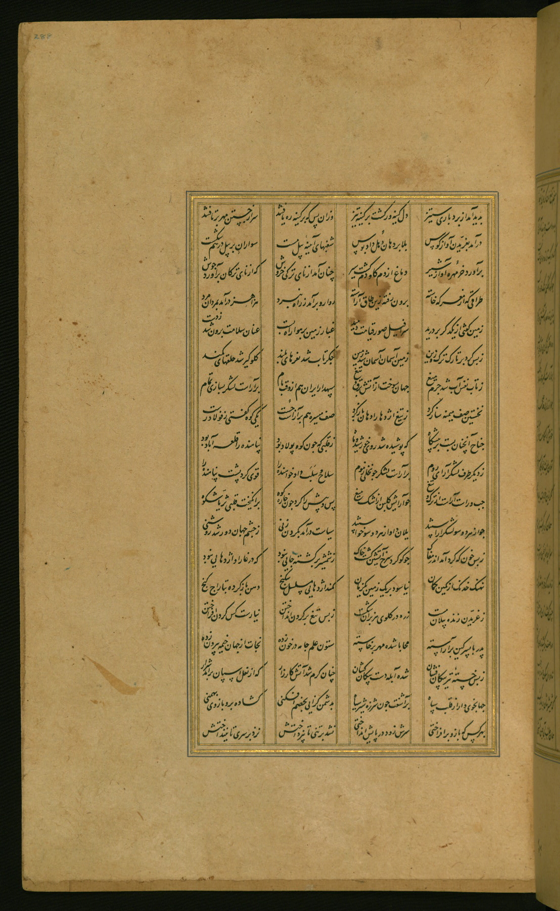 This illuminated and illustrated copy of the Khamsah (quintet) of Niẓāmī Ganjavī (d. 605 AH / 1209 CE) was written by Yār Muḥammad al-Haravī in 922 AH / 1516 CE. Written in four columns in black nastaʿlīq script, this manuscript opens with a double-page illuminated frontispiece signed by ʿAbd al-Wahhāb ibn ʿAbd al-Fattāḥ ibn ʿAlī. It contains thirty-five illustrations that were repainted in India during the twelfth century AH / eighteenth CE. The seal of Muḥammad Asharf ibn Muḥammad Khātam al-Ḥusaynī, dated 1173 AH / 1759-60 CE appears on fols. 1a and 401a. It is possible that the brown leather binding with center and side panels brushed with gold is original to the manuscript but was repaired at a later stage in the codex's history.