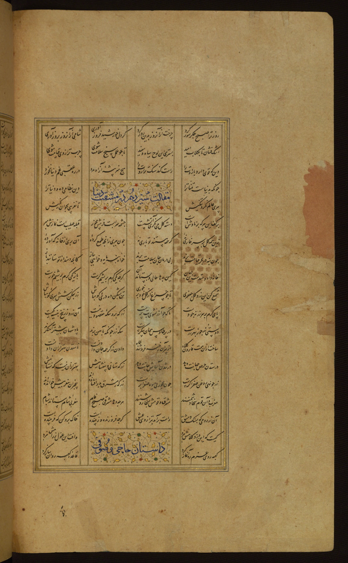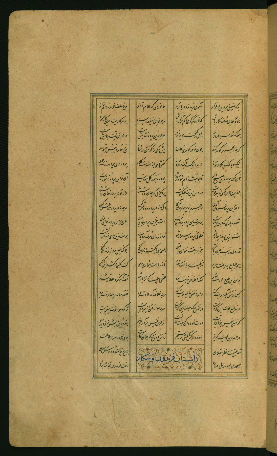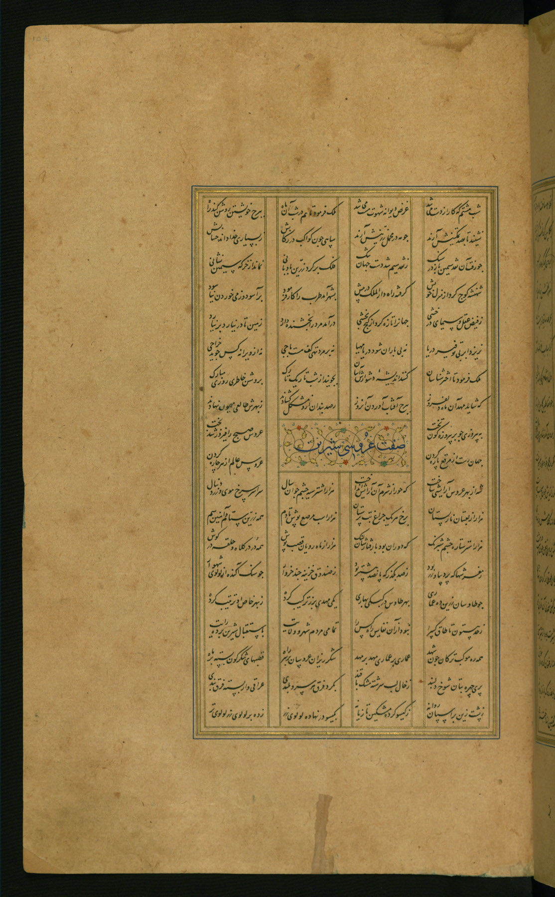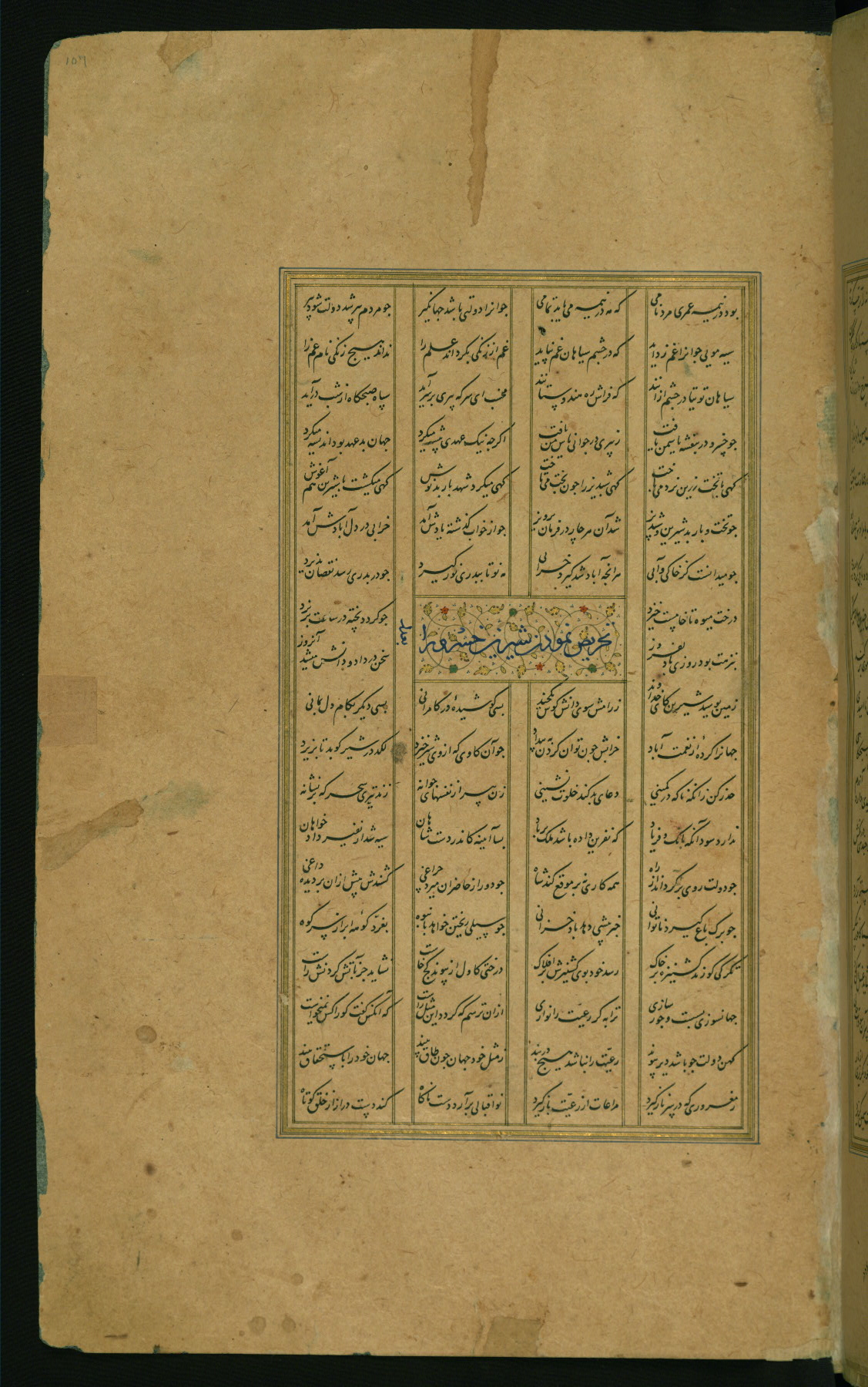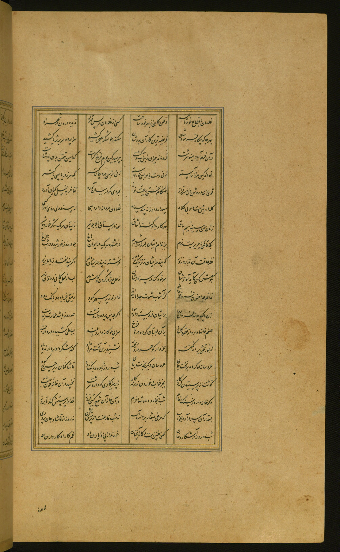 This illuminated and illustrated copy of the Khamsah (quintet) of Niẓāmī Ganjavī (d. 605 AH / 1209 CE) was written by Yār Muḥammad al-Haravī in 922 AH / 1516 CE. Written in four columns in black nastaʿlīq script, this manuscript opens with a double-page illuminated frontispiece signed by ʿAbd al-Wahhāb ibn ʿAbd al-Fattāḥ ibn ʿAlī. It contains thirty-five illustrations that were repainted in India during the twelfth century AH / eighteenth CE. The seal of Muḥammad Asharf ibn Muḥammad Khātam al-Ḥusaynī, dated 1173 AH / 1759-60 CE appears on fols. 1a and 401a. It is possible that the brown leather binding with center and side panels brushed with gold is original to the manuscript but was repaired at a later stage in the codex's history.