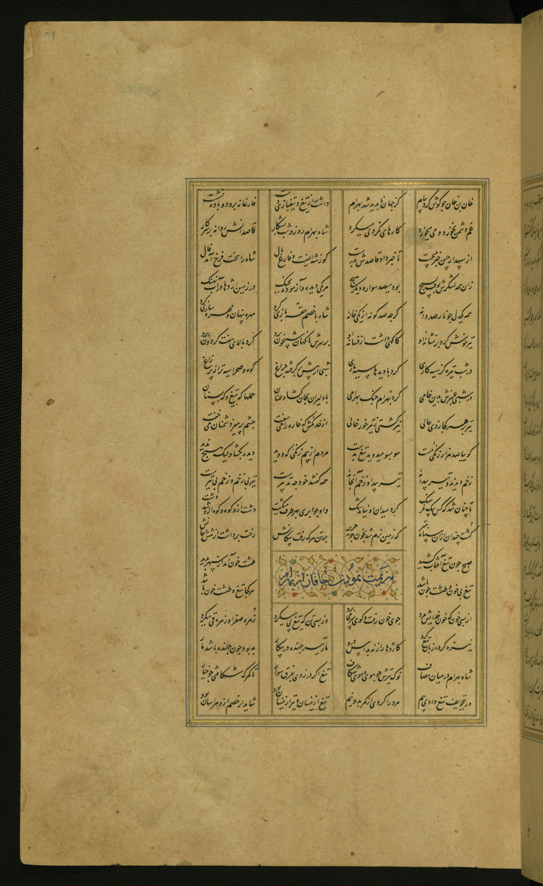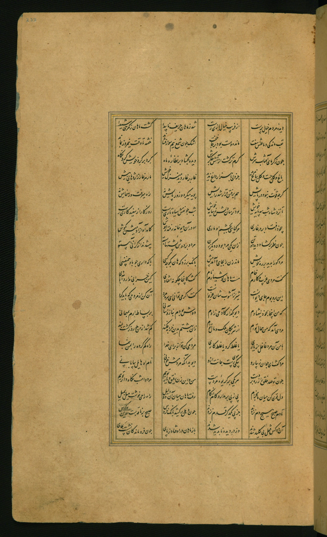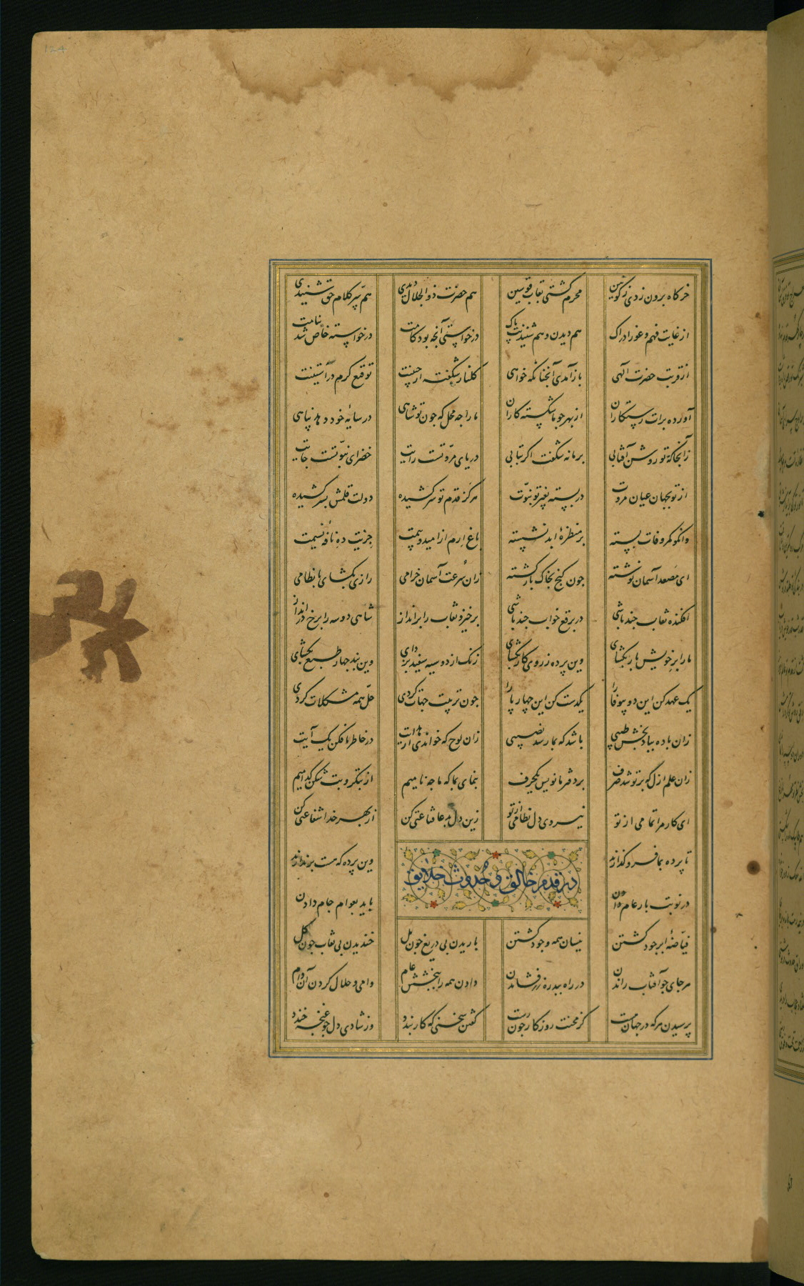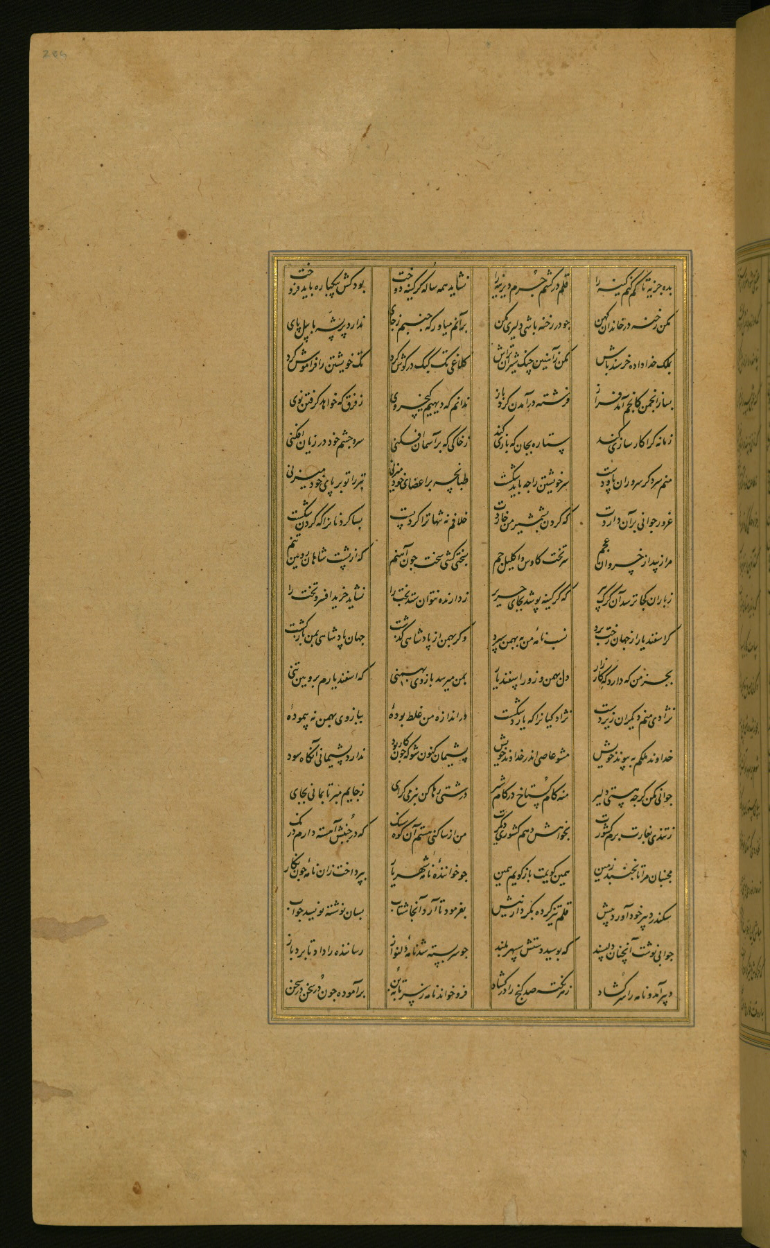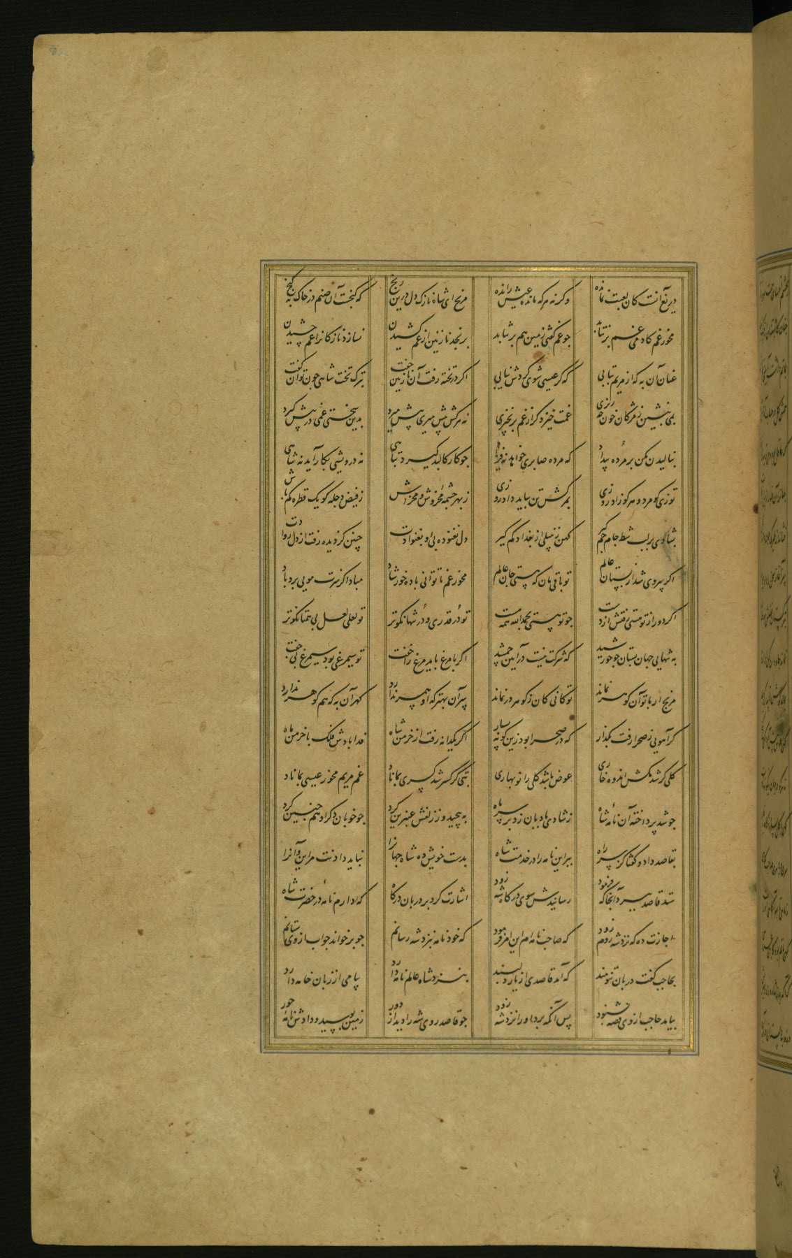 This illuminated and illustrated copy of the Khamsah (quintet) of Niẓāmī Ganjavī (d. 605 AH / 1209 CE) was written by Yār Muḥammad al-Haravī in 922 AH / 1516 CE. Written in four columns in black nastaʿlīq script, this manuscript opens with a double-page illuminated frontispiece signed by ʿAbd al-Wahhāb ibn ʿAbd al-Fattāḥ ibn ʿAlī. It contains thirty-five illustrations that were repainted in India during the twelfth century AH / eighteenth CE. The seal of Muḥammad Asharf ibn Muḥammad Khātam al-Ḥusaynī, dated 1173 AH / 1759-60 CE appears on fols. 1a and 401a. It is possible that the brown leather binding with center and side panels brushed with gold is original to the manuscript but was repaired at a later stage in the codex's history.