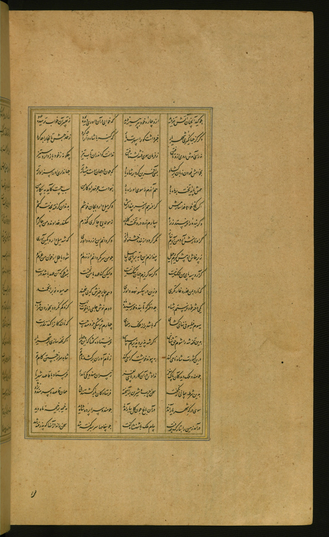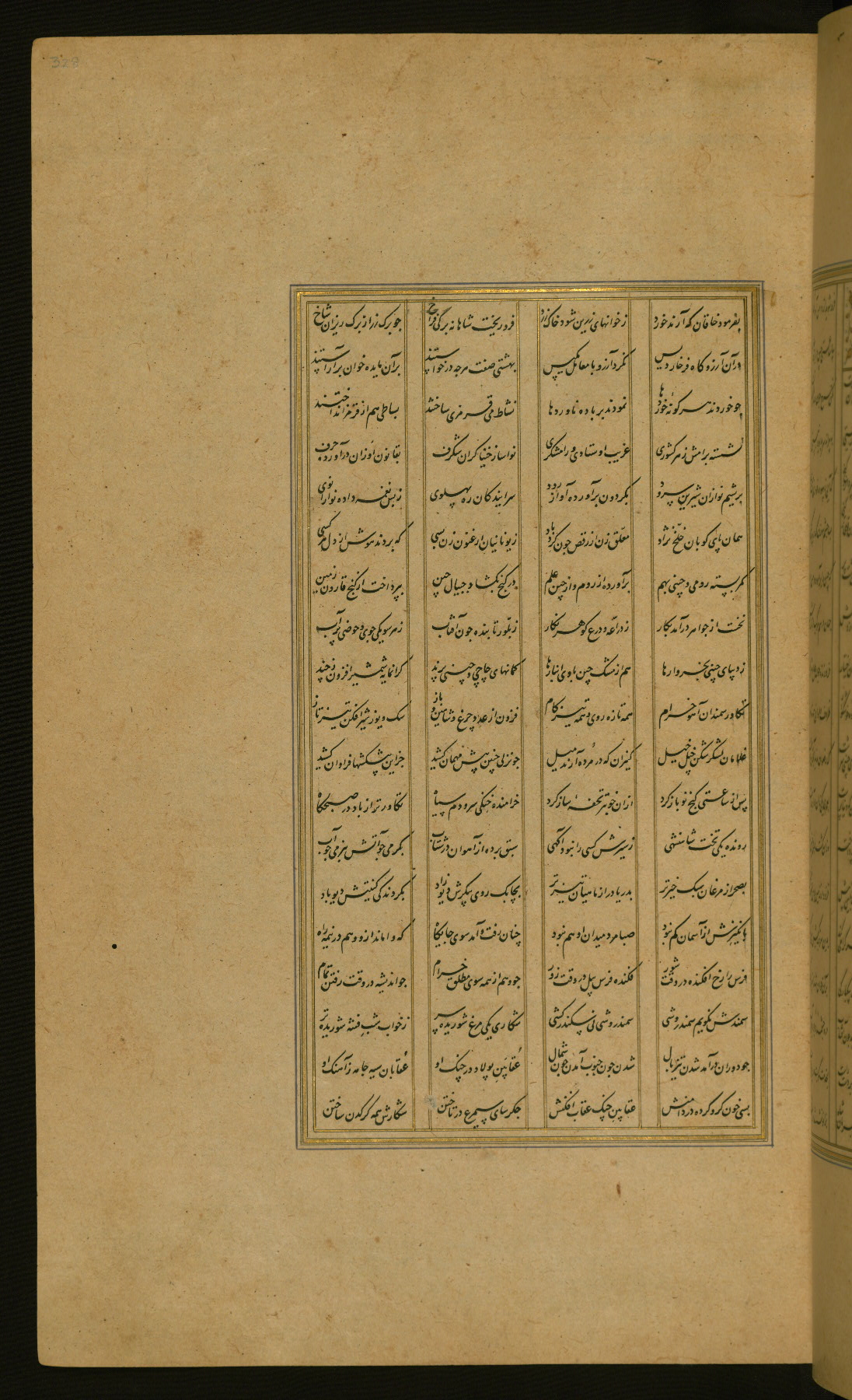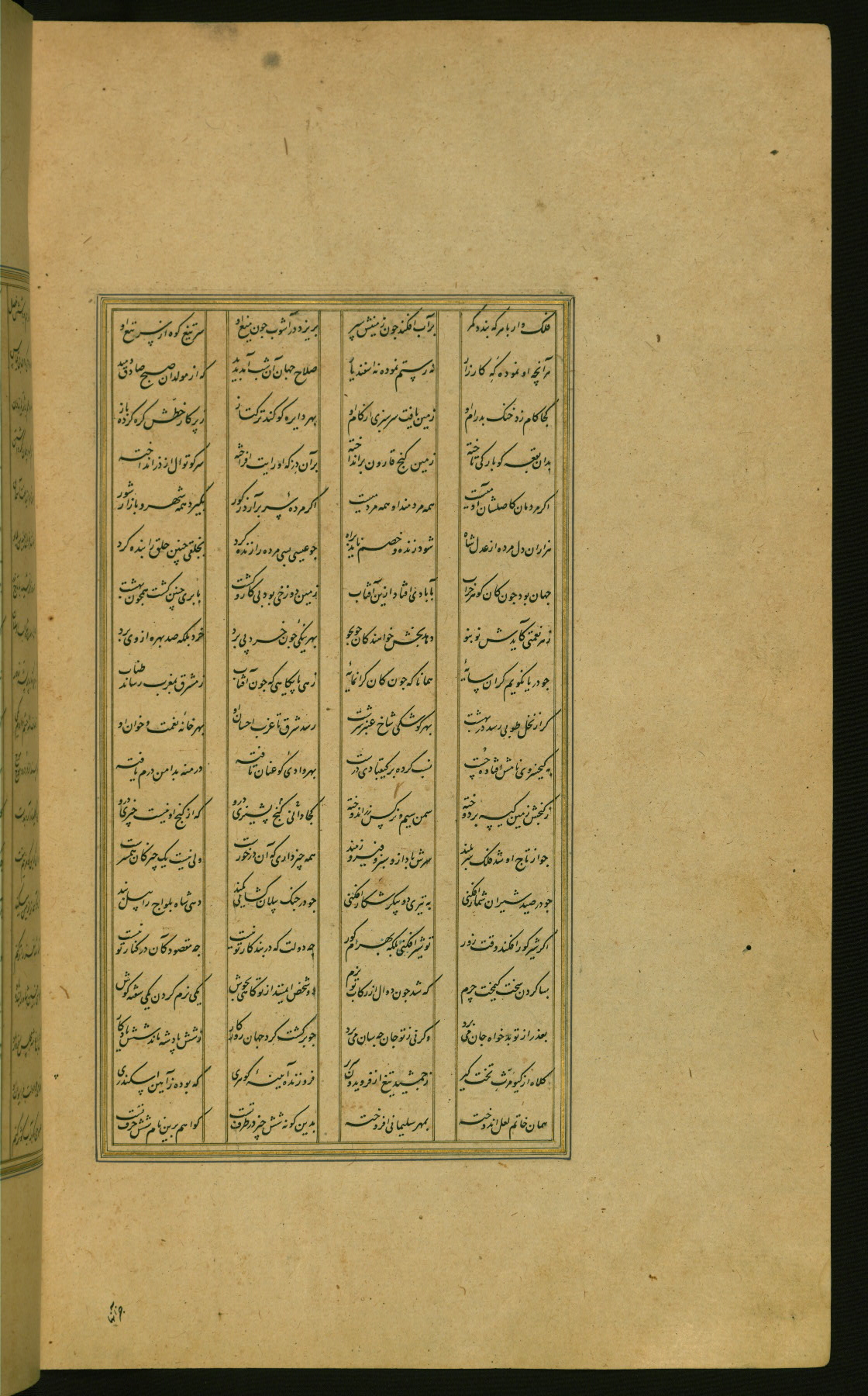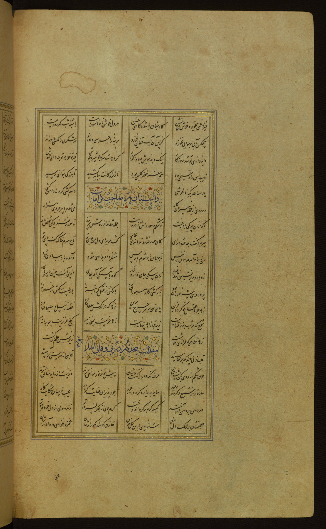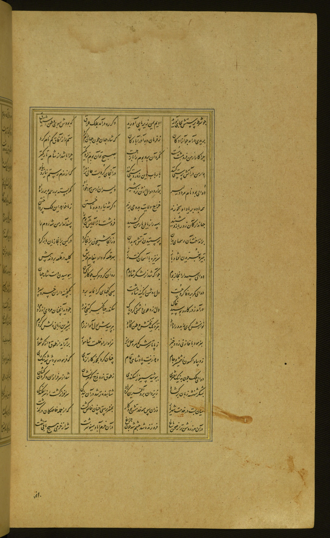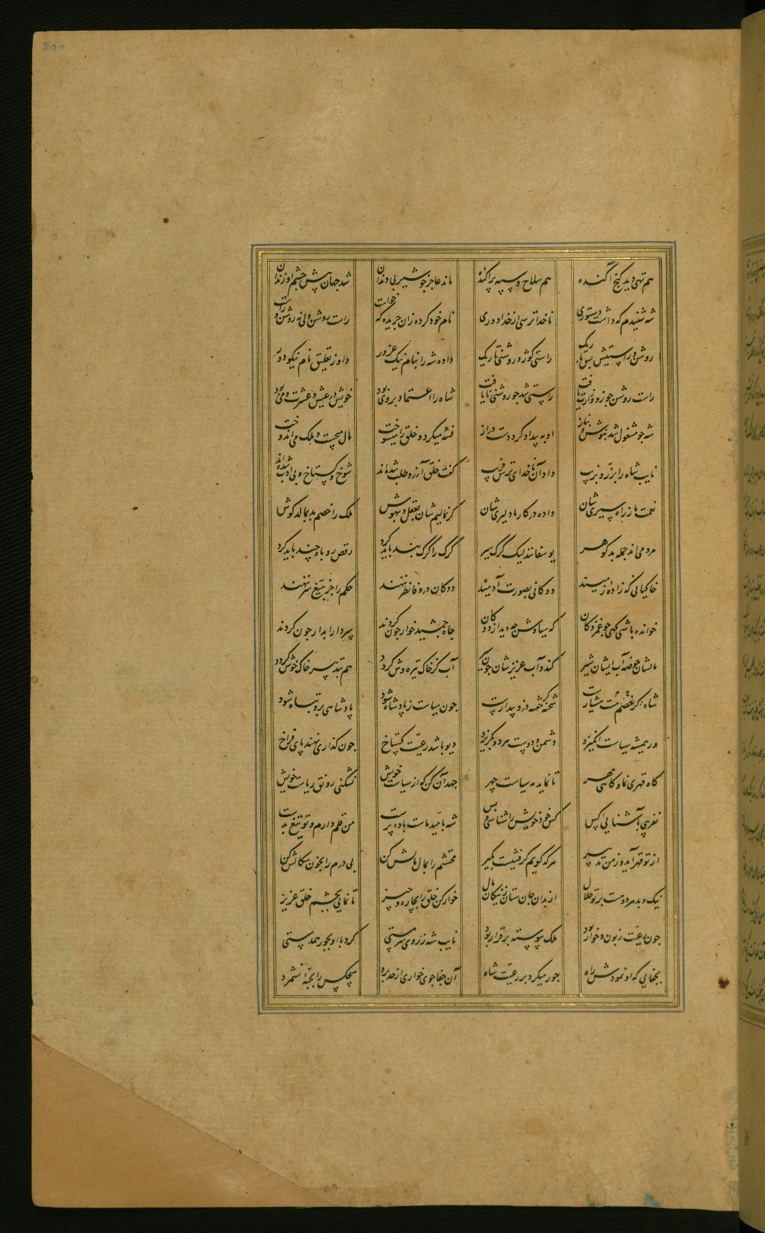 This illuminated and illustrated copy of the Khamsah (quintet) of Niẓāmī Ganjavī (d. 605 AH / 1209 CE) was written by Yār Muḥammad al-Haravī in 922 AH / 1516 CE. Written in four columns in black nastaʿlīq script, this manuscript opens with a double-page illuminated frontispiece signed by ʿAbd al-Wahhāb ibn ʿAbd al-Fattāḥ ibn ʿAlī. It contains thirty-five illustrations that were repainted in India during the twelfth century AH / eighteenth CE. The seal of Muḥammad Asharf ibn Muḥammad Khātam al-Ḥusaynī, dated 1173 AH / 1759-60 CE appears on fols. 1a and 401a. It is possible that the brown leather binding with center and side panels brushed with gold is original to the manuscript but was repaired at a later stage in the codex's history.