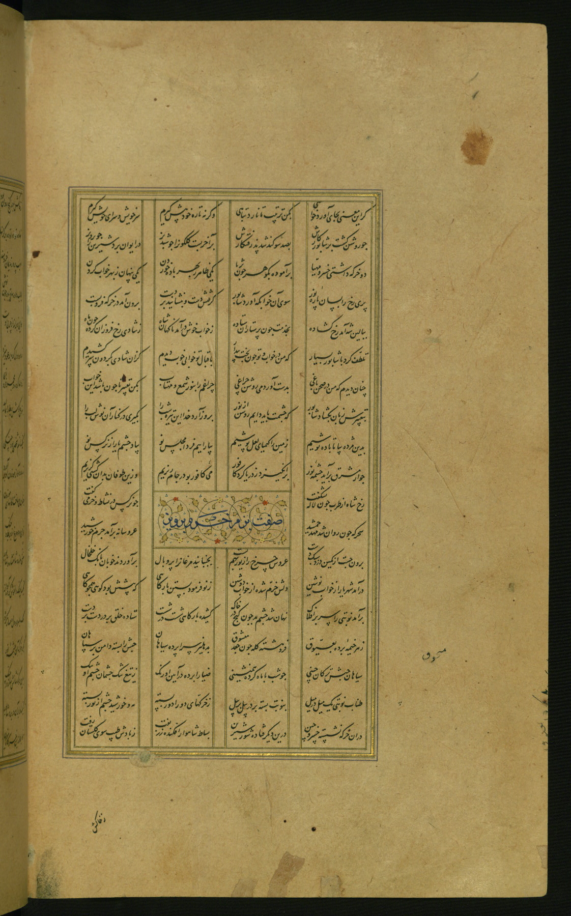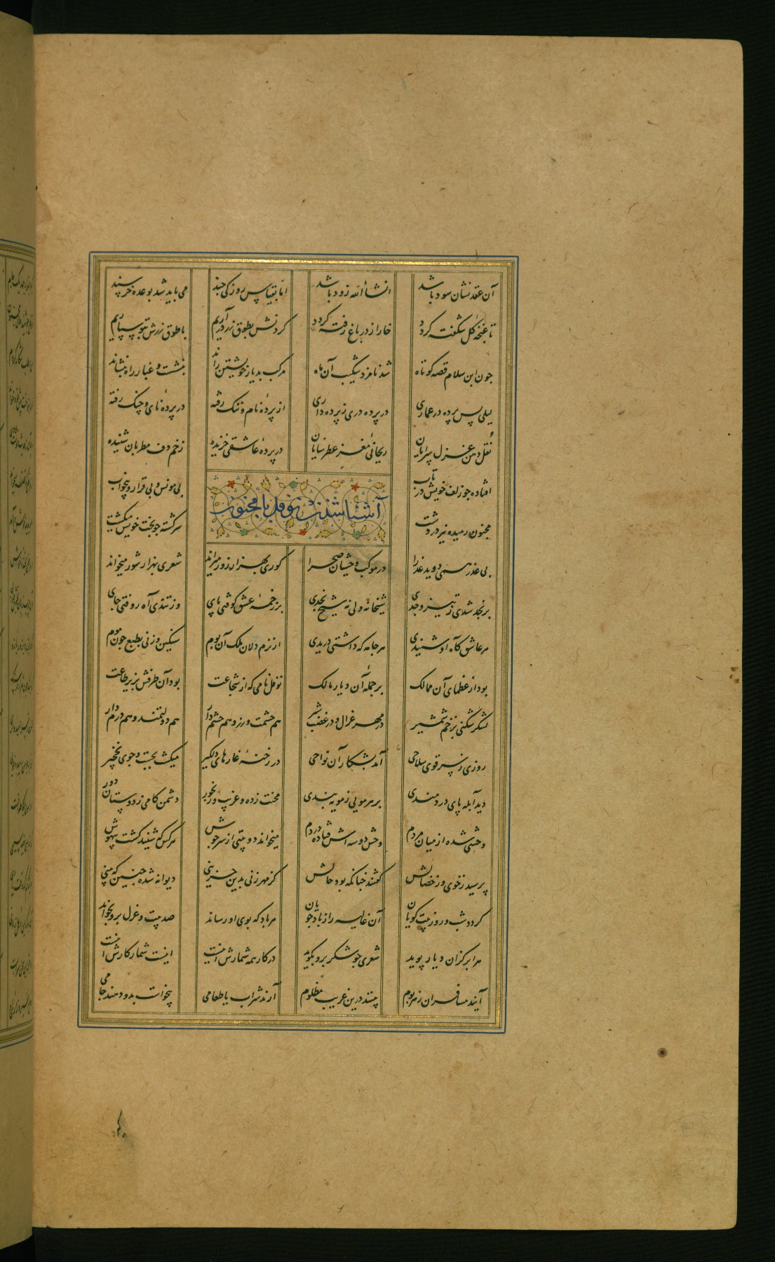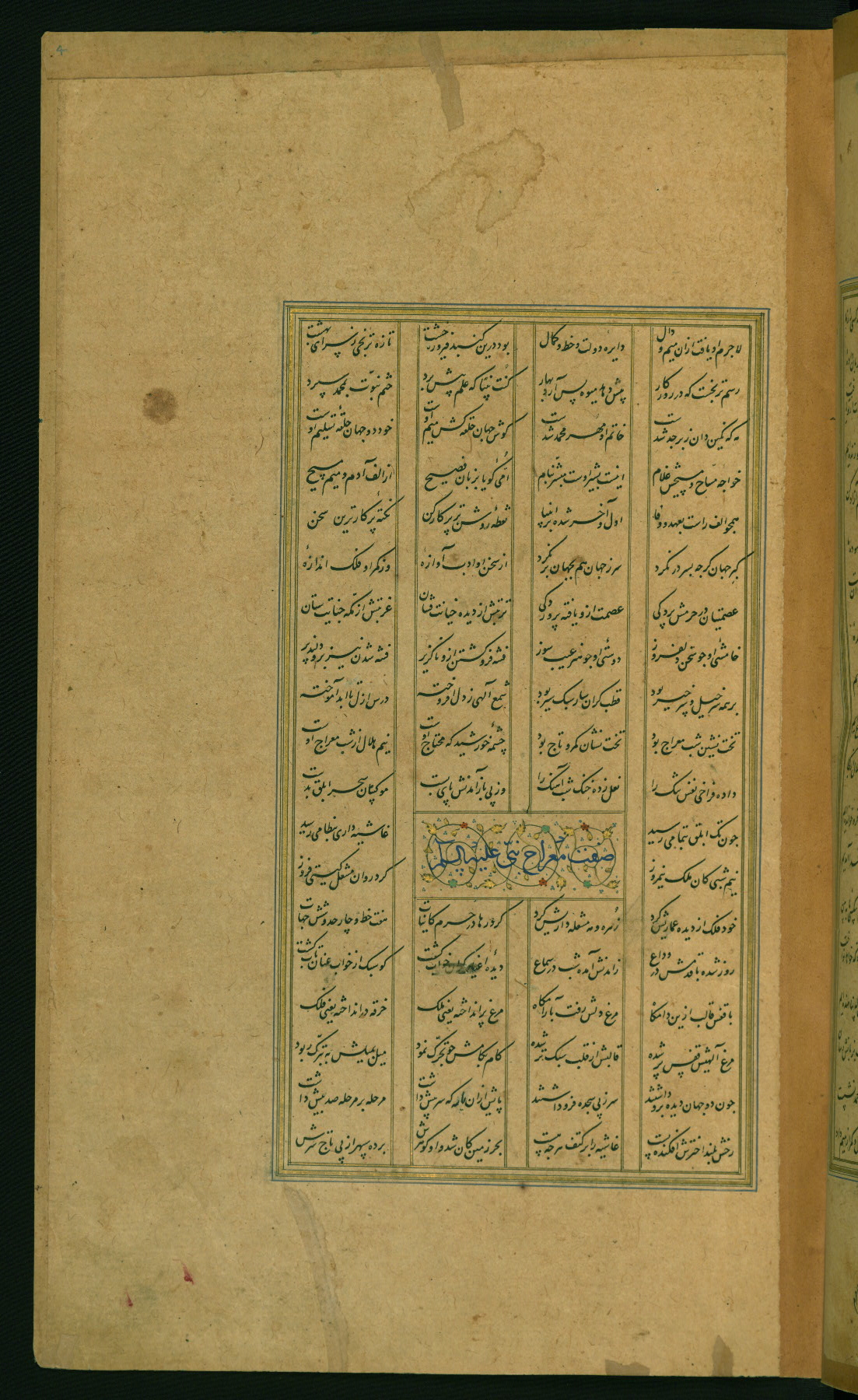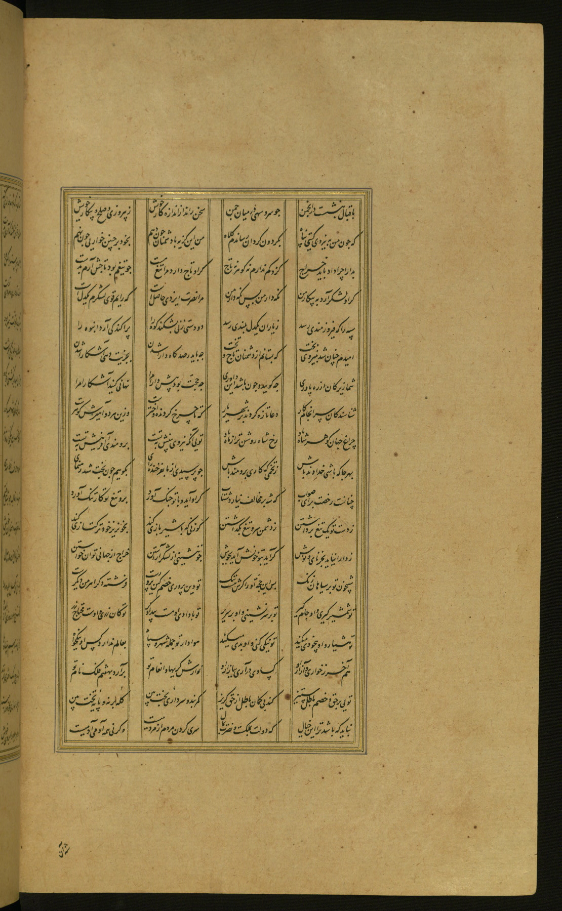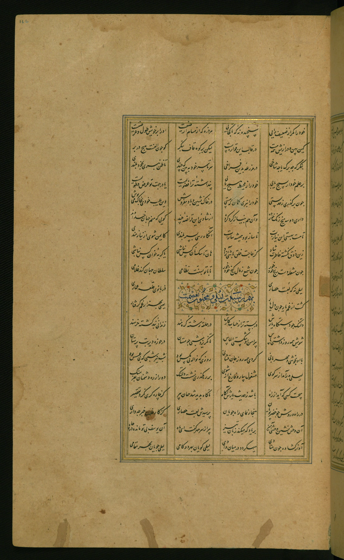 This illuminated and illustrated copy of the Khamsah (quintet) of Niẓāmī Ganjavī (d. 605 AH / 1209 CE) was written by Yār Muḥammad al-Haravī in 922 AH / 1516 CE. Written in four columns in black nastaʿlīq script, this manuscript opens with a double-page illuminated frontispiece signed by ʿAbd al-Wahhāb ibn ʿAbd al-Fattāḥ ibn ʿAlī. It contains thirty-five illustrations that were repainted in India during the twelfth century AH / eighteenth CE. The seal of Muḥammad Asharf ibn Muḥammad Khātam al-Ḥusaynī, dated 1173 AH / 1759-60 CE appears on fols. 1a and 401a. It is possible that the brown leather binding with center and side panels brushed with gold is original to the manuscript but was repaired at a later stage in the codex's history.
