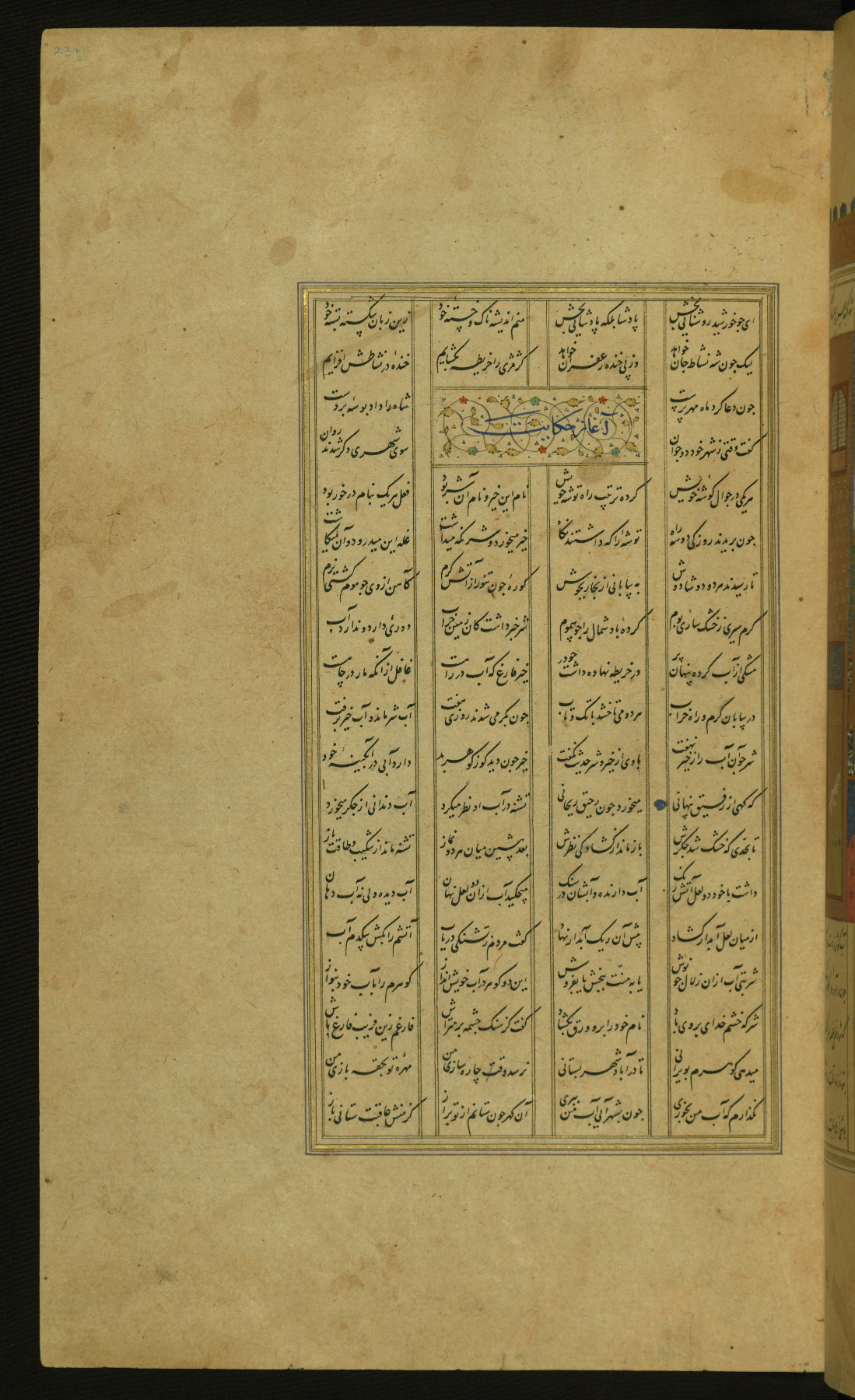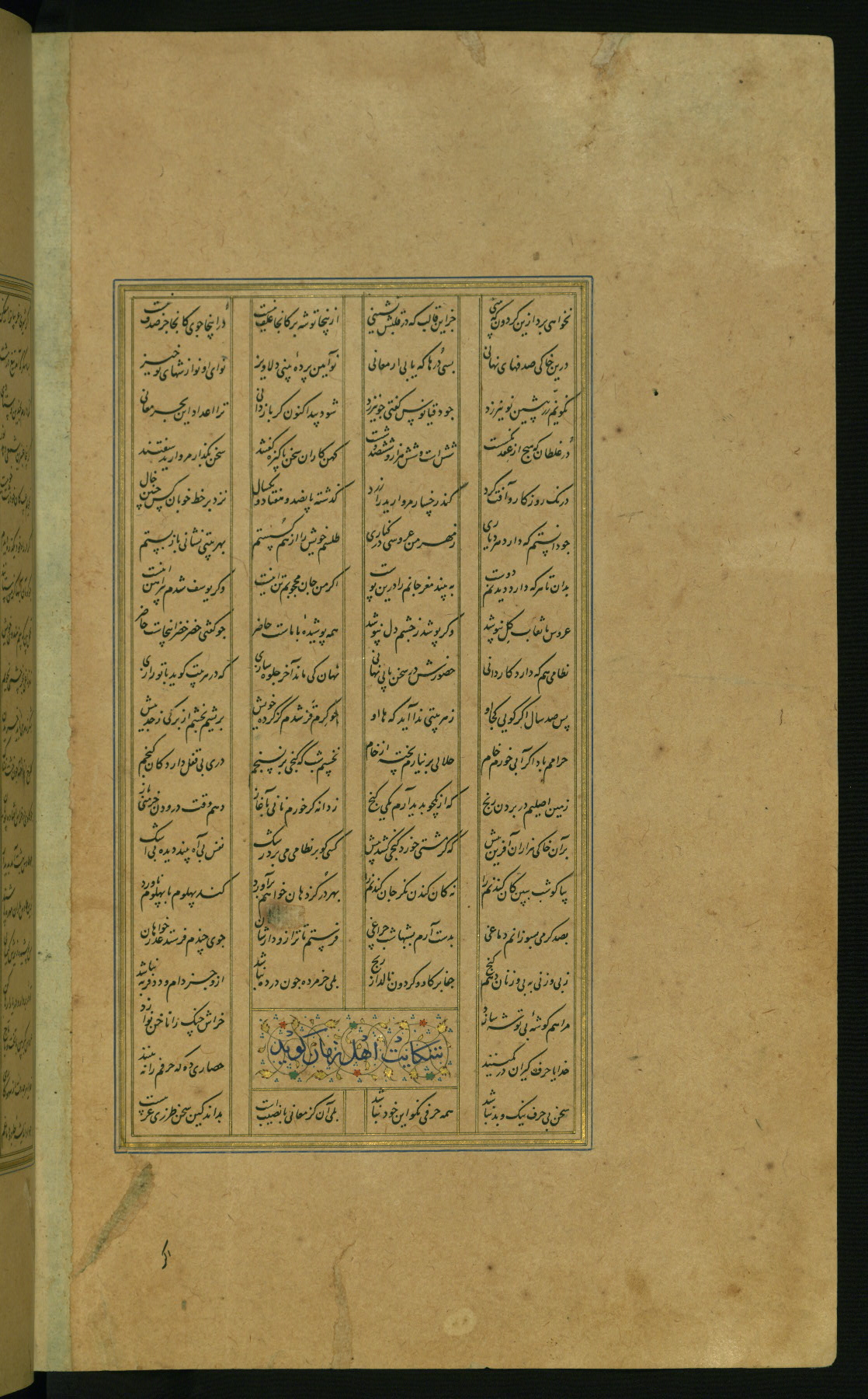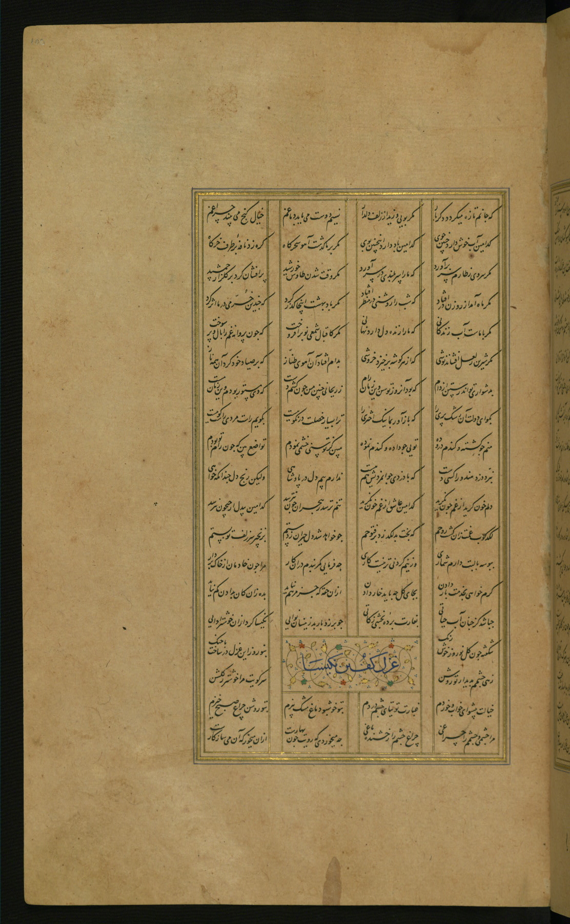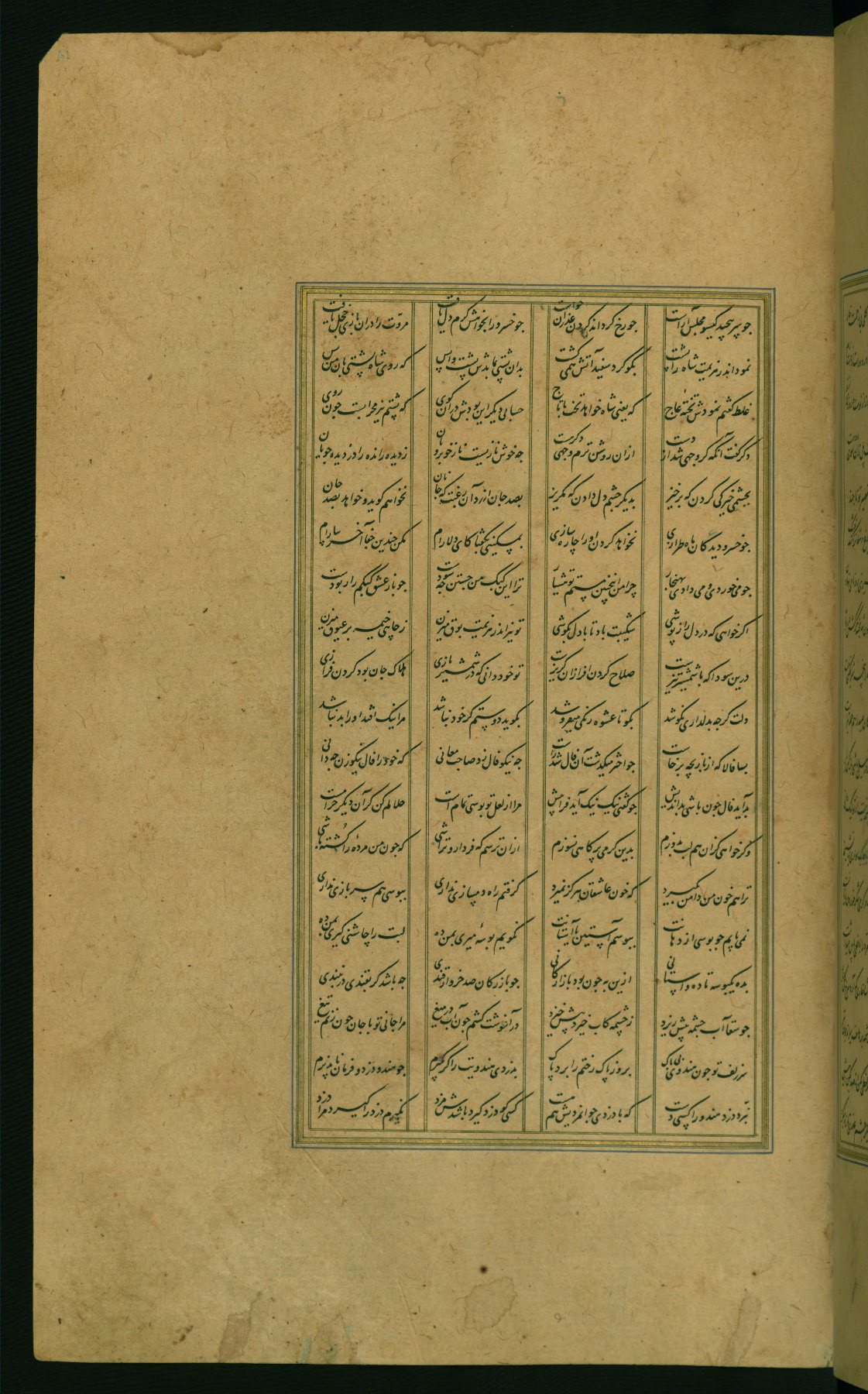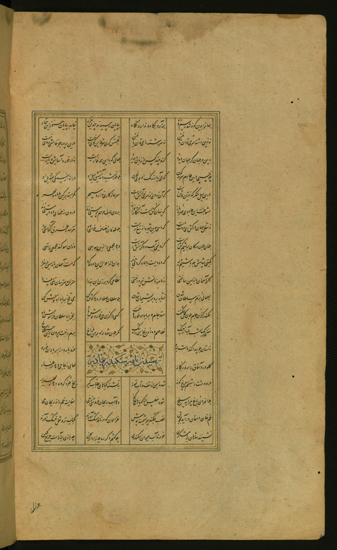 This illuminated and illustrated copy of the Khamsah (quintet) of Niẓāmī Ganjavī (d. 605 AH / 1209 CE) was written by Yār Muḥammad al-Haravī in 922 AH / 1516 CE. Written in four columns in black nastaʿlīq script, this manuscript opens with a double-page illuminated frontispiece signed by ʿAbd al-Wahhāb ibn ʿAbd al-Fattāḥ ibn ʿAlī. It contains thirty-five illustrations that were repainted in India during the twelfth century AH / eighteenth CE. The seal of Muḥammad Asharf ibn Muḥammad Khātam al-Ḥusaynī, dated 1173 AH / 1759-60 CE appears on fols. 1a and 401a. It is possible that the brown leather binding with center and side panels brushed with gold is original to the manuscript but was repaired at a later stage in the codex's history.
