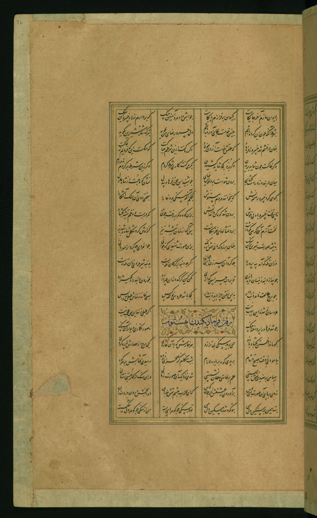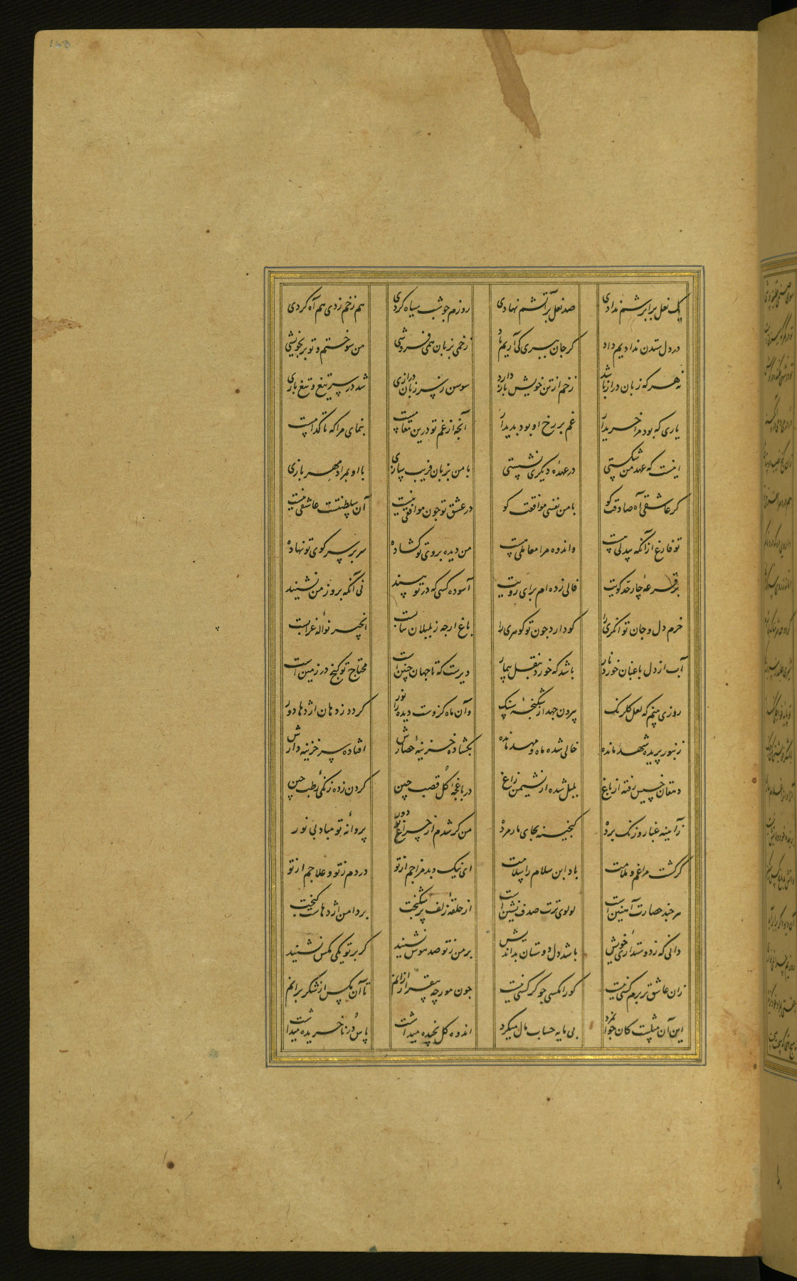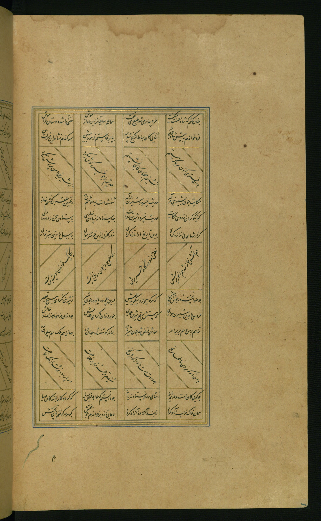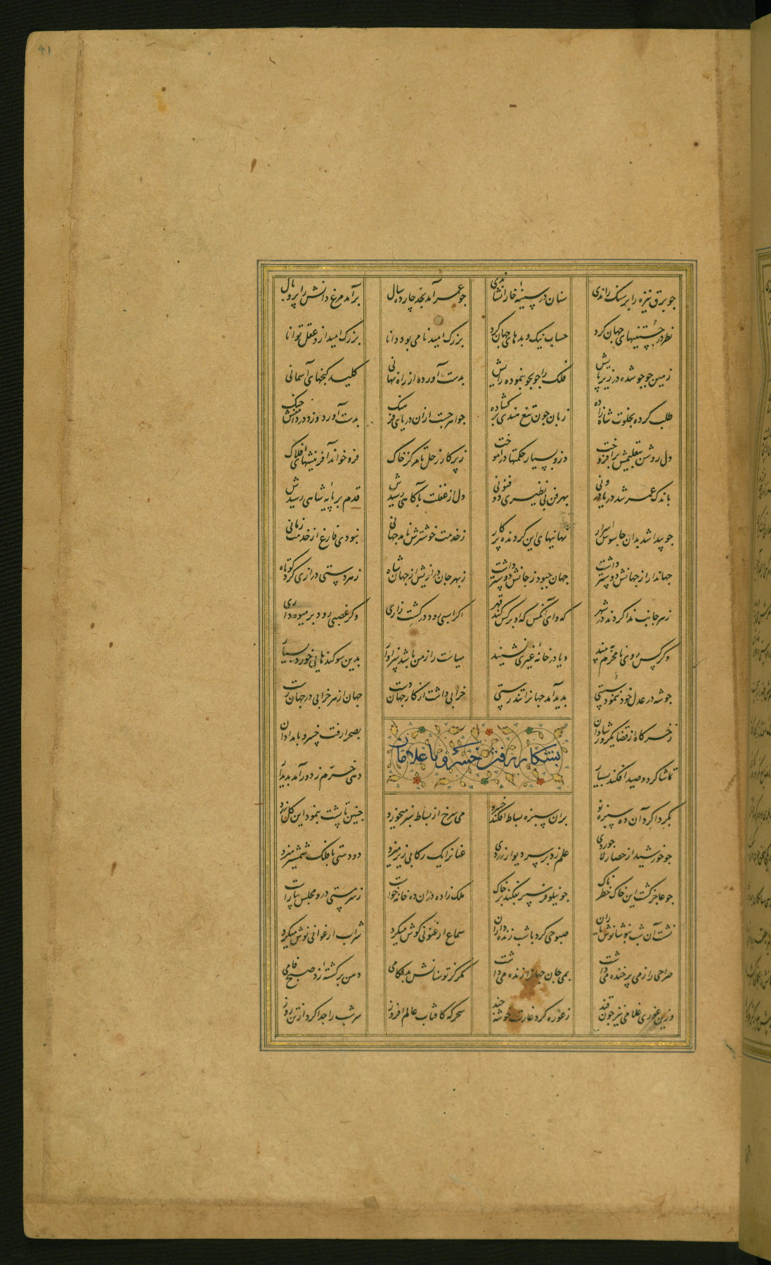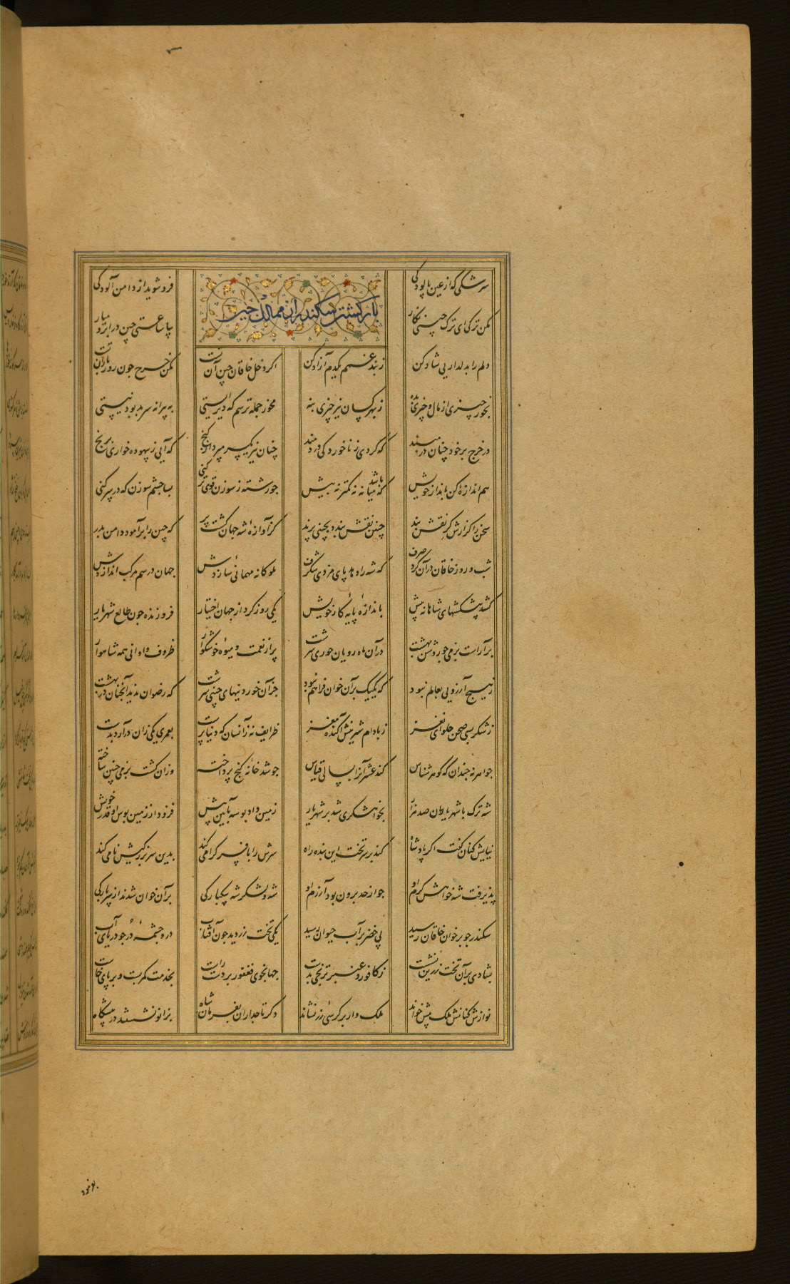 This illuminated and illustrated copy of the Khamsah (quintet) of Niẓāmī Ganjavī (d. 605 AH / 1209 CE) was written by Yār Muḥammad al-Haravī in 922 AH / 1516 CE. Written in four columns in black nastaʿlīq script, this manuscript opens with a double-page illuminated frontispiece signed by ʿAbd al-Wahhāb ibn ʿAbd al-Fattāḥ ibn ʿAlī. It contains thirty-five illustrations that were repainted in India during the twelfth century AH / eighteenth CE. The seal of Muḥammad Asharf ibn Muḥammad Khātam al-Ḥusaynī, dated 1173 AH / 1759-60 CE appears on fols. 1a and 401a. It is possible that the brown leather binding with center and side panels brushed with gold is original to the manuscript but was repaired at a later stage in the codex's history.