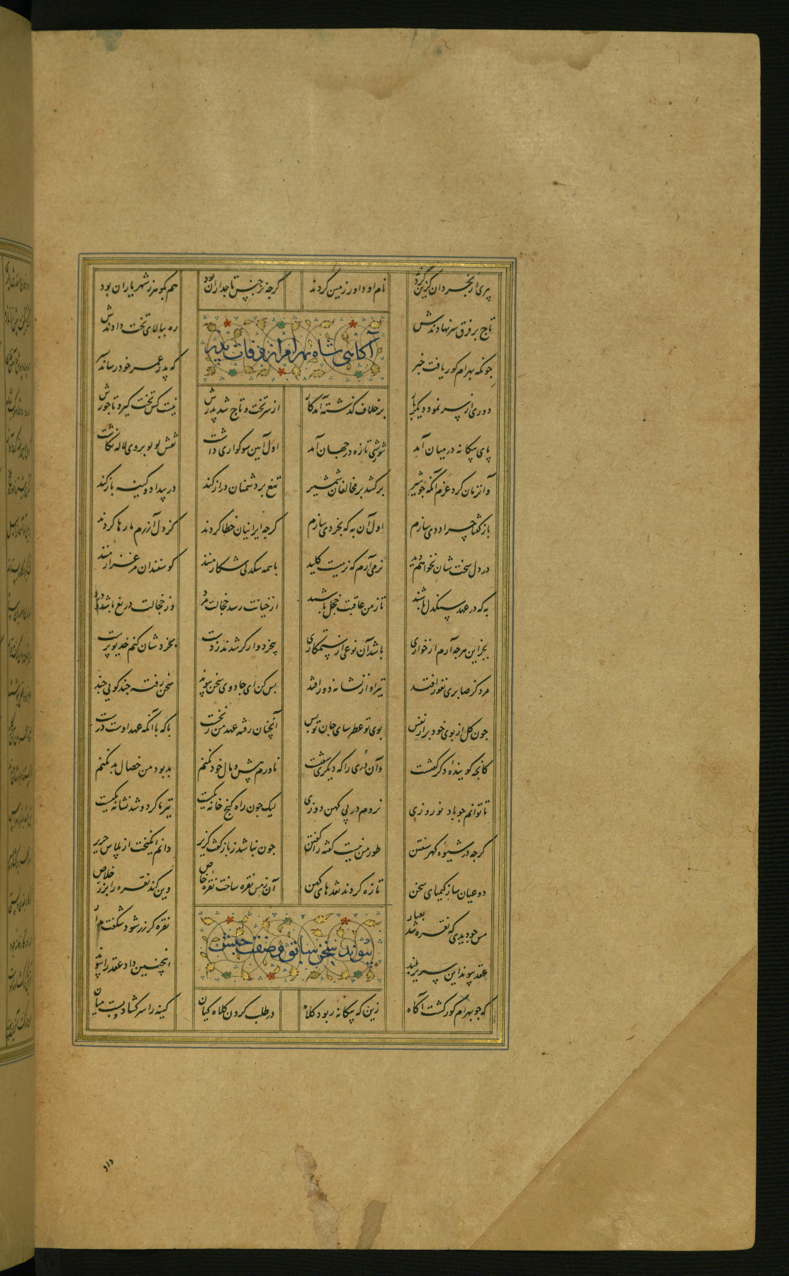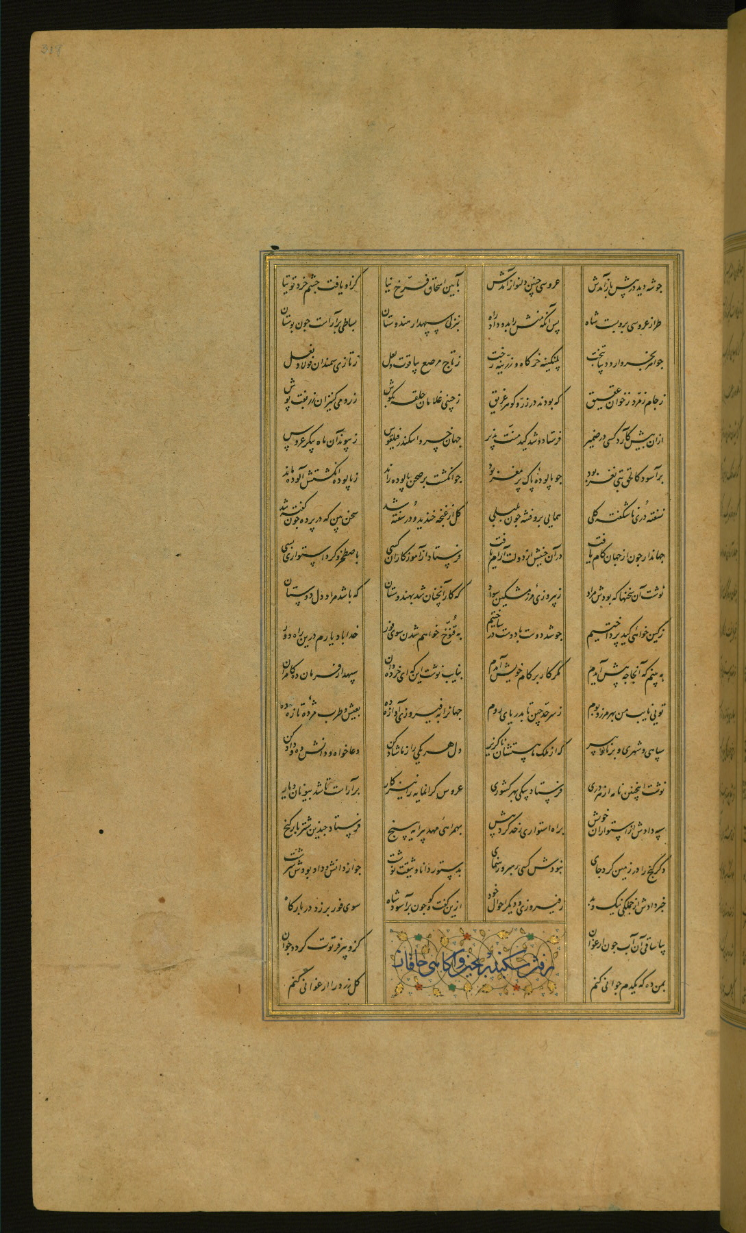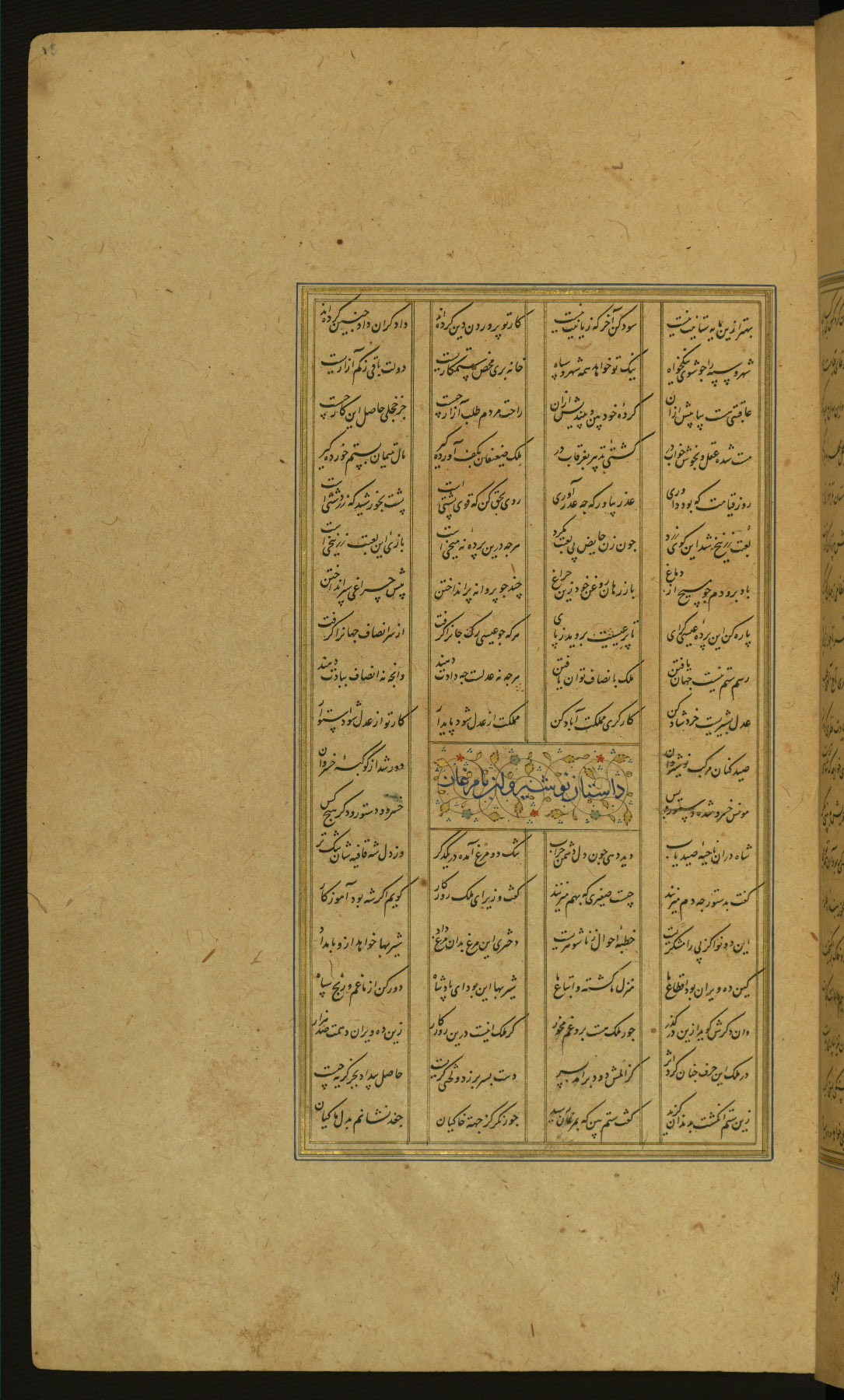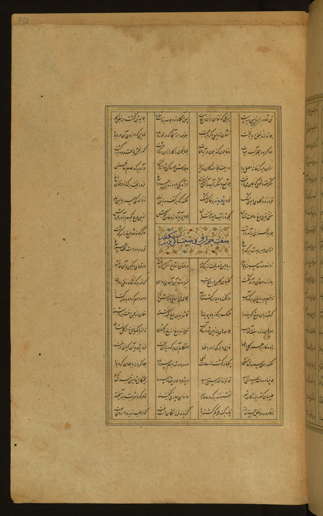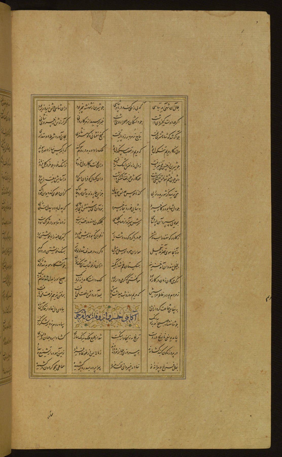 This illuminated and illustrated copy of the Khamsah (quintet) of Niẓāmī Ganjavī (d. 605 AH / 1209 CE) was written by Yār Muḥammad al-Haravī in 922 AH / 1516 CE. Written in four columns in black nastaʿlīq script, this manuscript opens with a double-page illuminated frontispiece signed by ʿAbd al-Wahhāb ibn ʿAbd al-Fattāḥ ibn ʿAlī. It contains thirty-five illustrations that were repainted in India during the twelfth century AH / eighteenth CE. The seal of Muḥammad Asharf ibn Muḥammad Khātam al-Ḥusaynī, dated 1173 AH / 1759-60 CE appears on fols. 1a and 401a. It is possible that the brown leather binding with center and side panels brushed with gold is original to the manuscript but was repaired at a later stage in the codex's history.