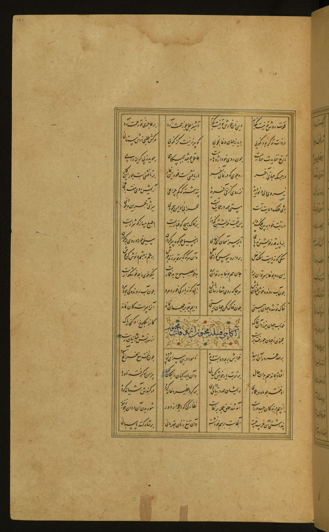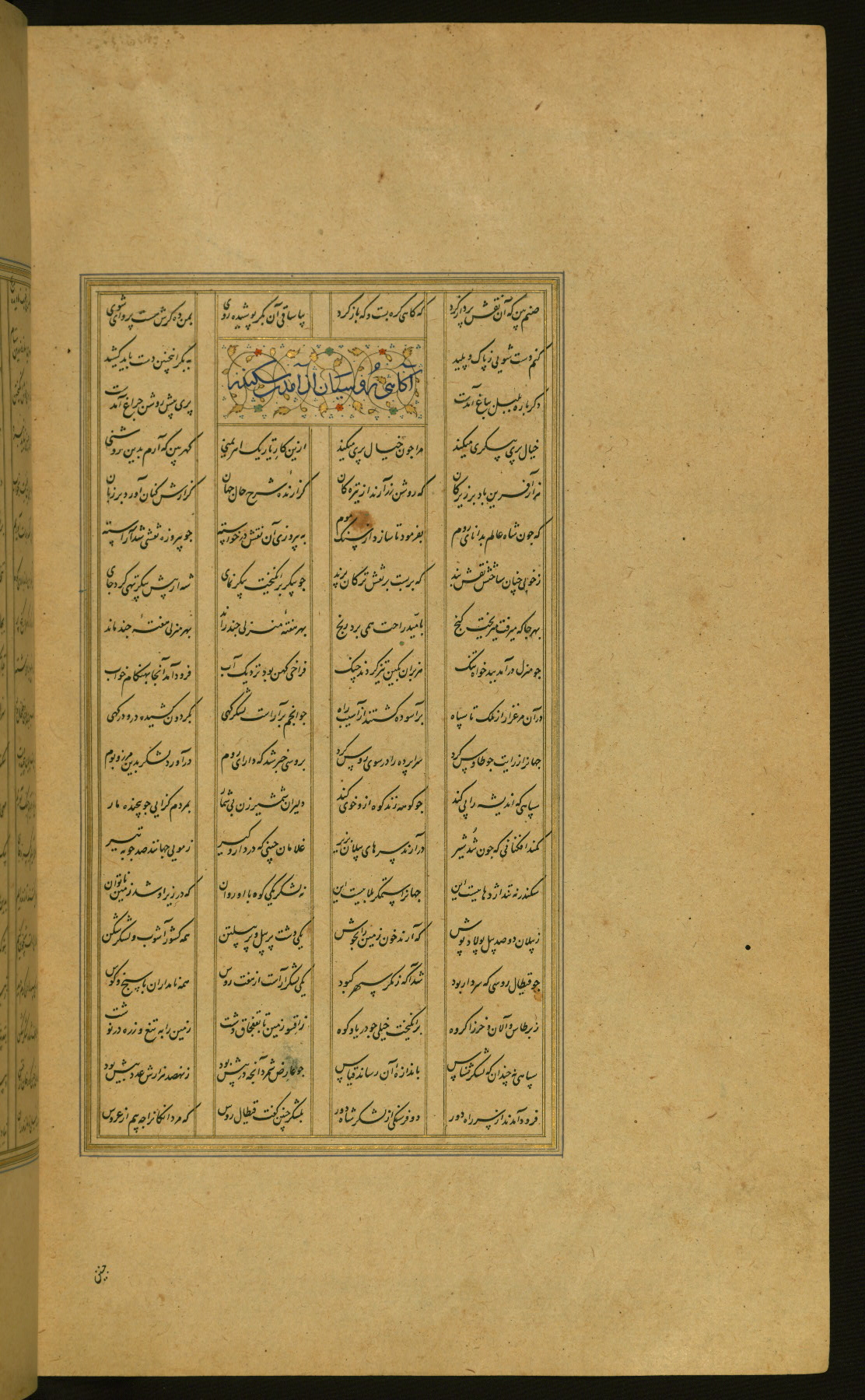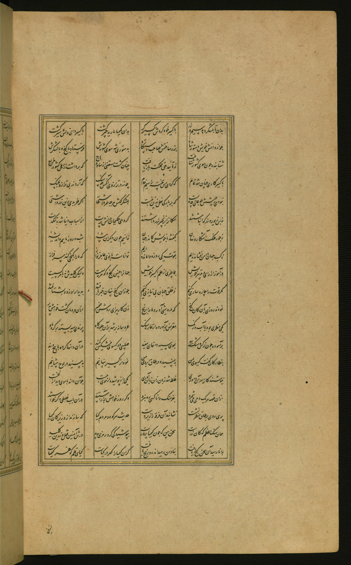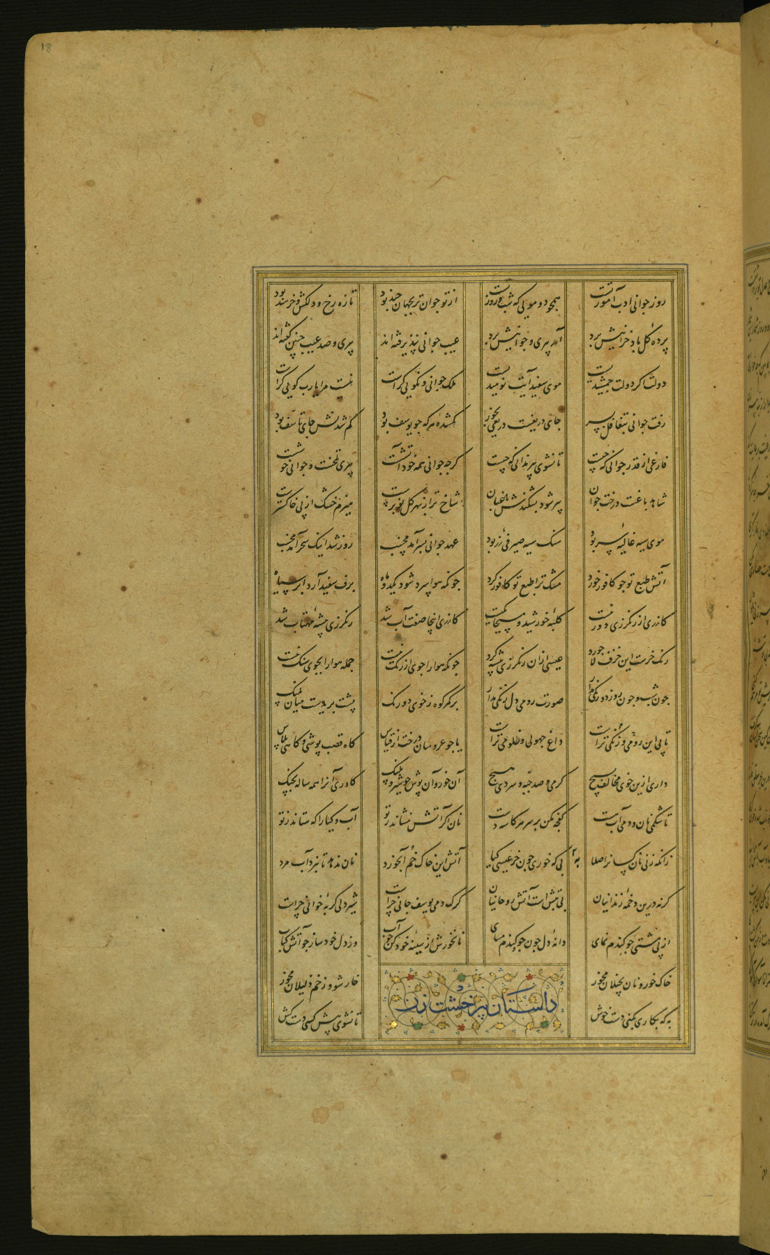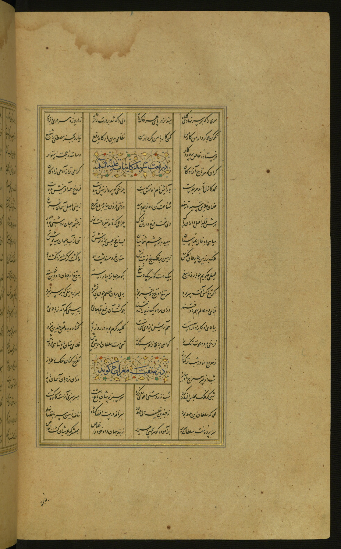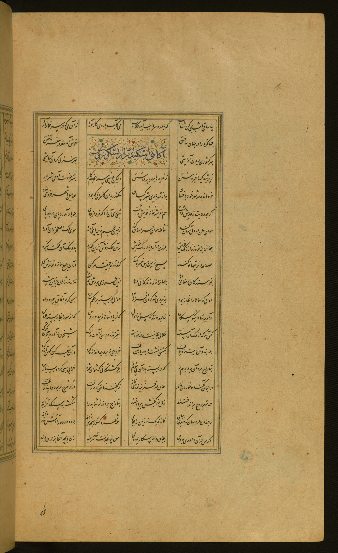 This illuminated and illustrated copy of the Khamsah (quintet) of Niẓāmī Ganjavī (d. 605 AH / 1209 CE) was written by Yār Muḥammad al-Haravī in 922 AH / 1516 CE. Written in four columns in black nastaʿlīq script, this manuscript opens with a double-page illuminated frontispiece signed by ʿAbd al-Wahhāb ibn ʿAbd al-Fattāḥ ibn ʿAlī. It contains thirty-five illustrations that were repainted in India during the twelfth century AH / eighteenth CE. The seal of Muḥammad Asharf ibn Muḥammad Khātam al-Ḥusaynī, dated 1173 AH / 1759-60 CE appears on fols. 1a and 401a. It is possible that the brown leather binding with center and side panels brushed with gold is original to the manuscript but was repaired at a later stage in the codex's history.