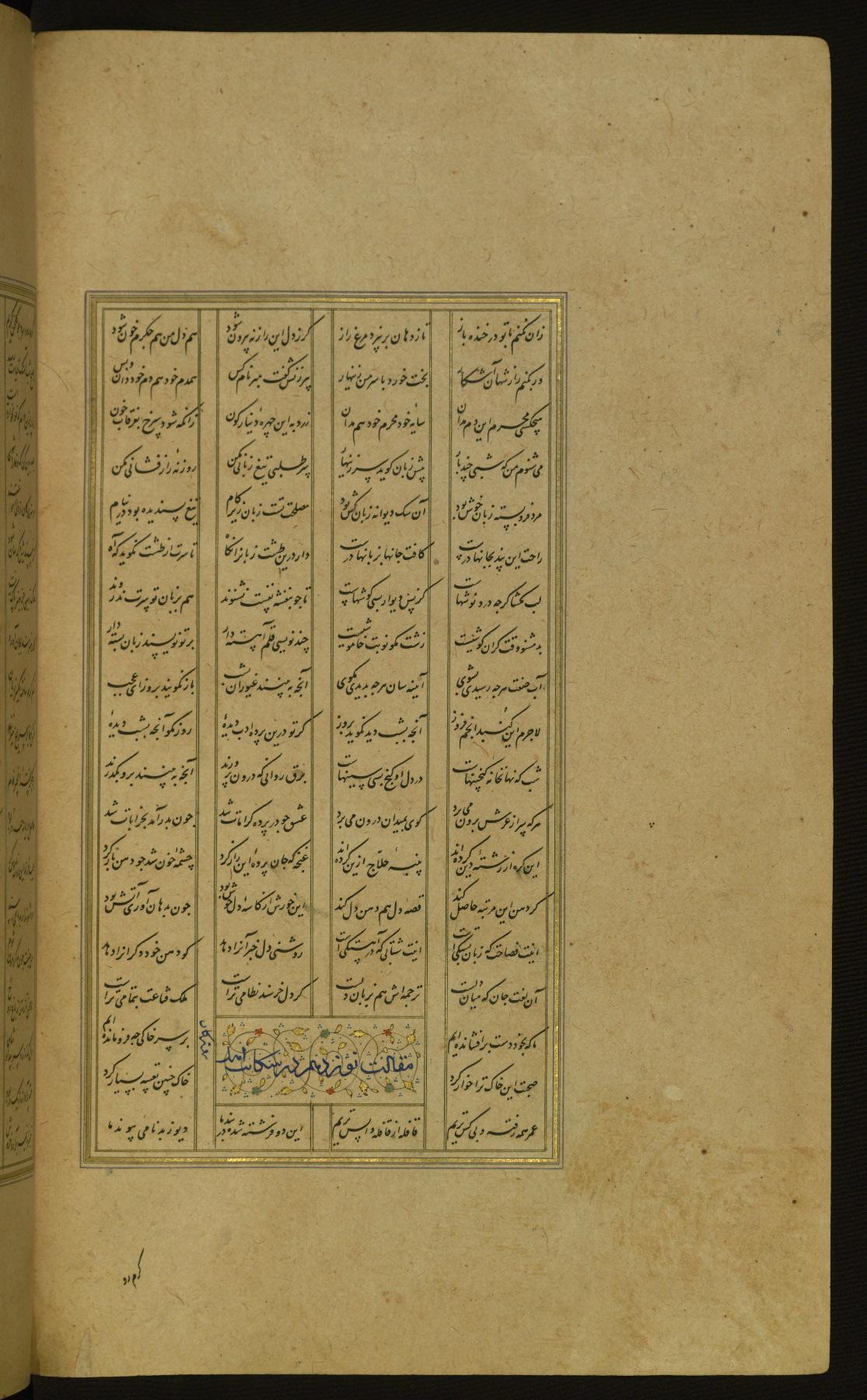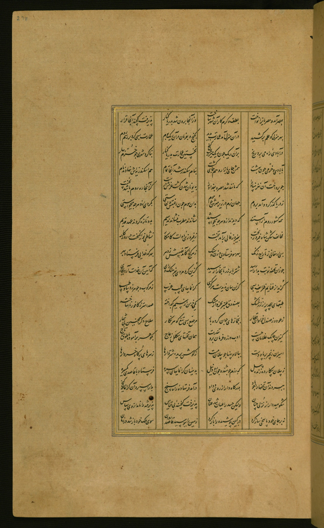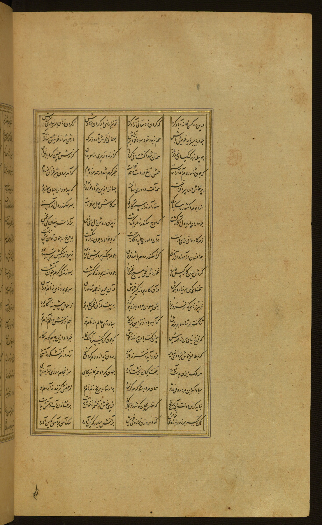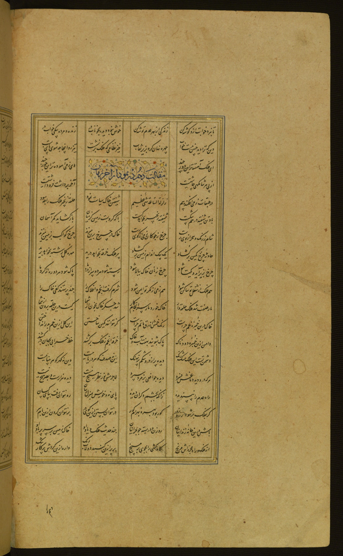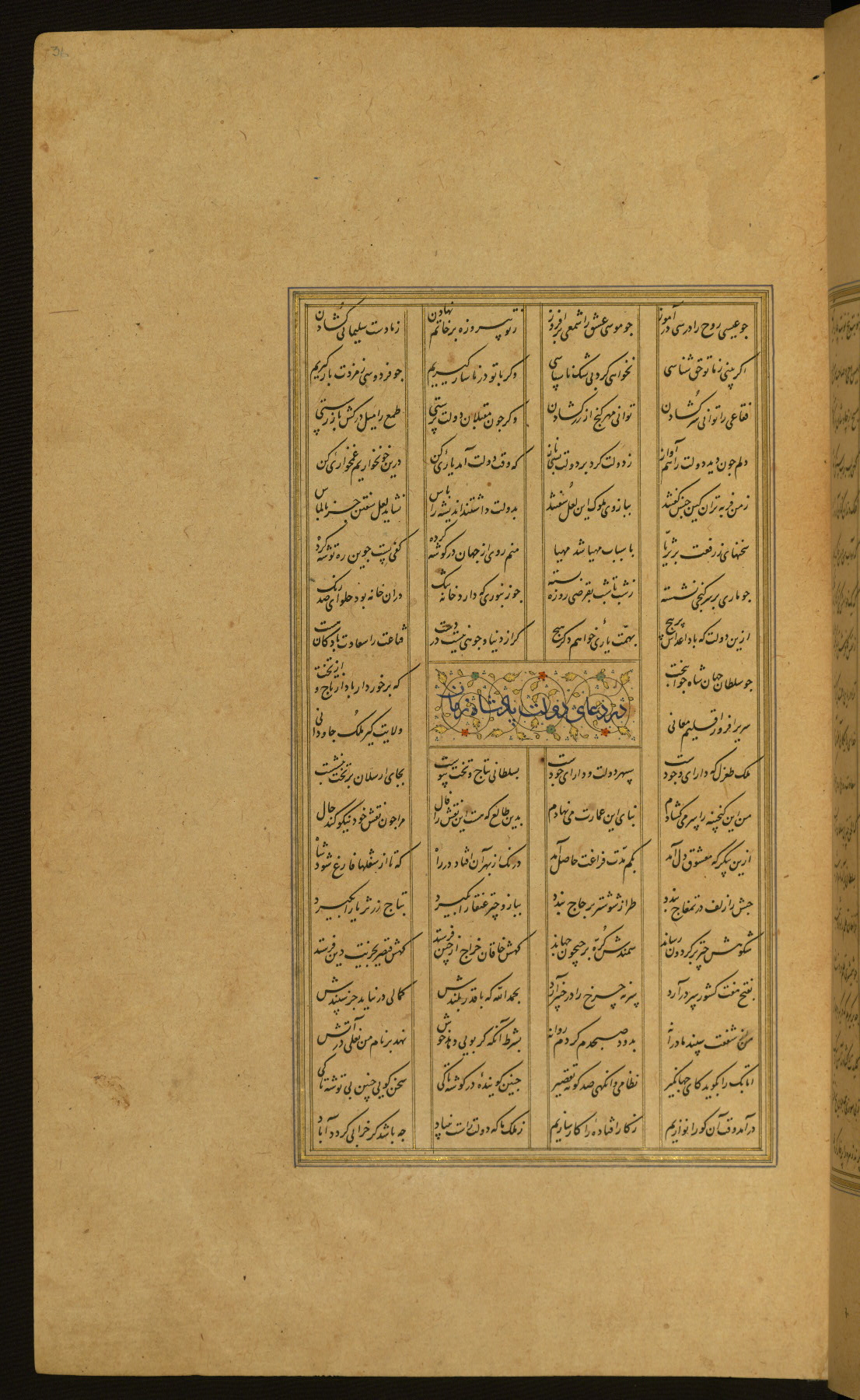 This illuminated and illustrated copy of the Khamsah (quintet) of Niẓāmī Ganjavī (d. 605 AH / 1209 CE) was written by Yār Muḥammad al-Haravī in 922 AH / 1516 CE. Written in four columns in black nastaʿlīq script, this manuscript opens with a double-page illuminated frontispiece signed by ʿAbd al-Wahhāb ibn ʿAbd al-Fattāḥ ibn ʿAlī. It contains thirty-five illustrations that were repainted in India during the twelfth century AH / eighteenth CE. The seal of Muḥammad Asharf ibn Muḥammad Khātam al-Ḥusaynī, dated 1173 AH / 1759-60 CE appears on fols. 1a and 401a. It is possible that the brown leather binding with center and side panels brushed with gold is original to the manuscript but was repaired at a later stage in the codex's history.