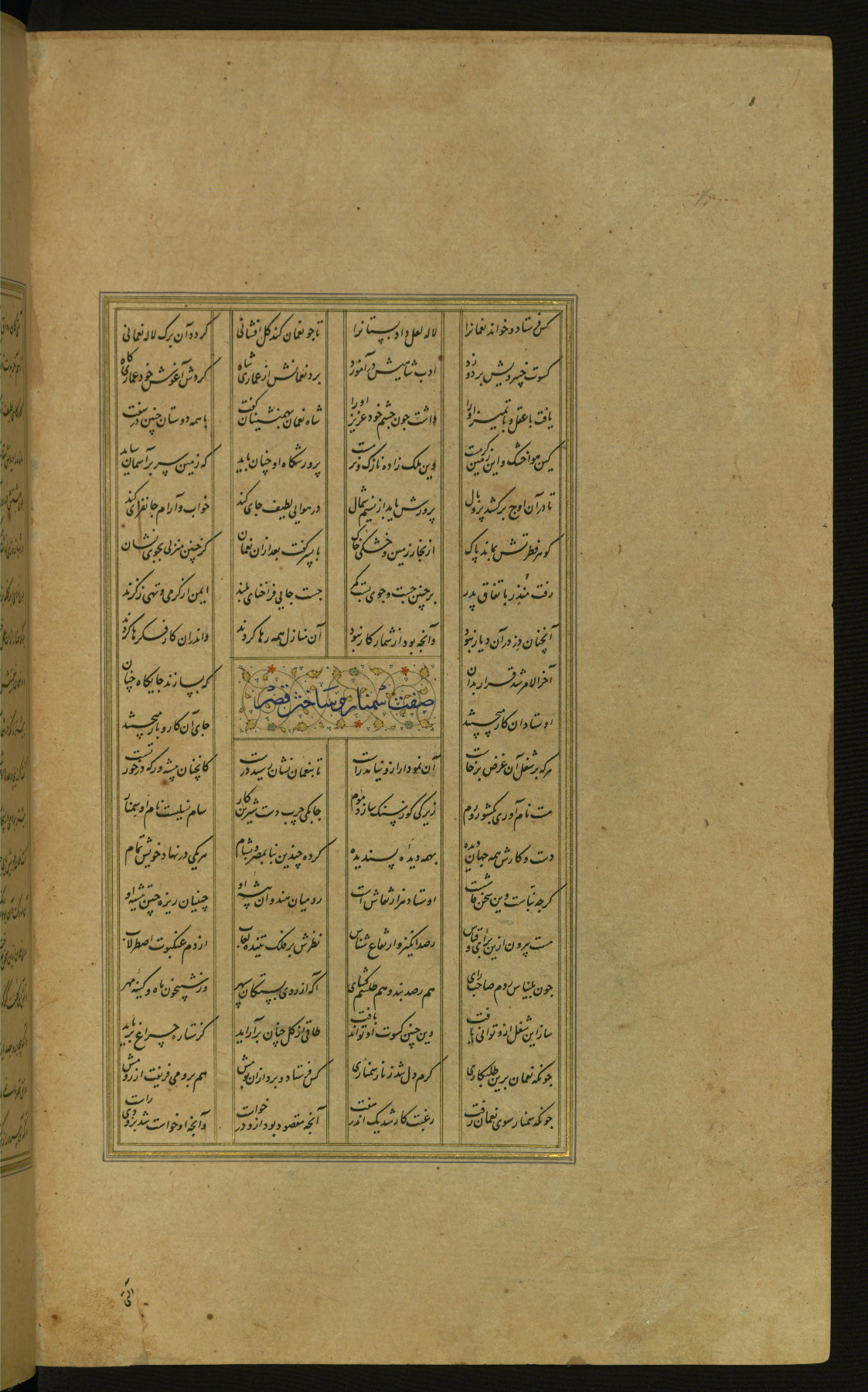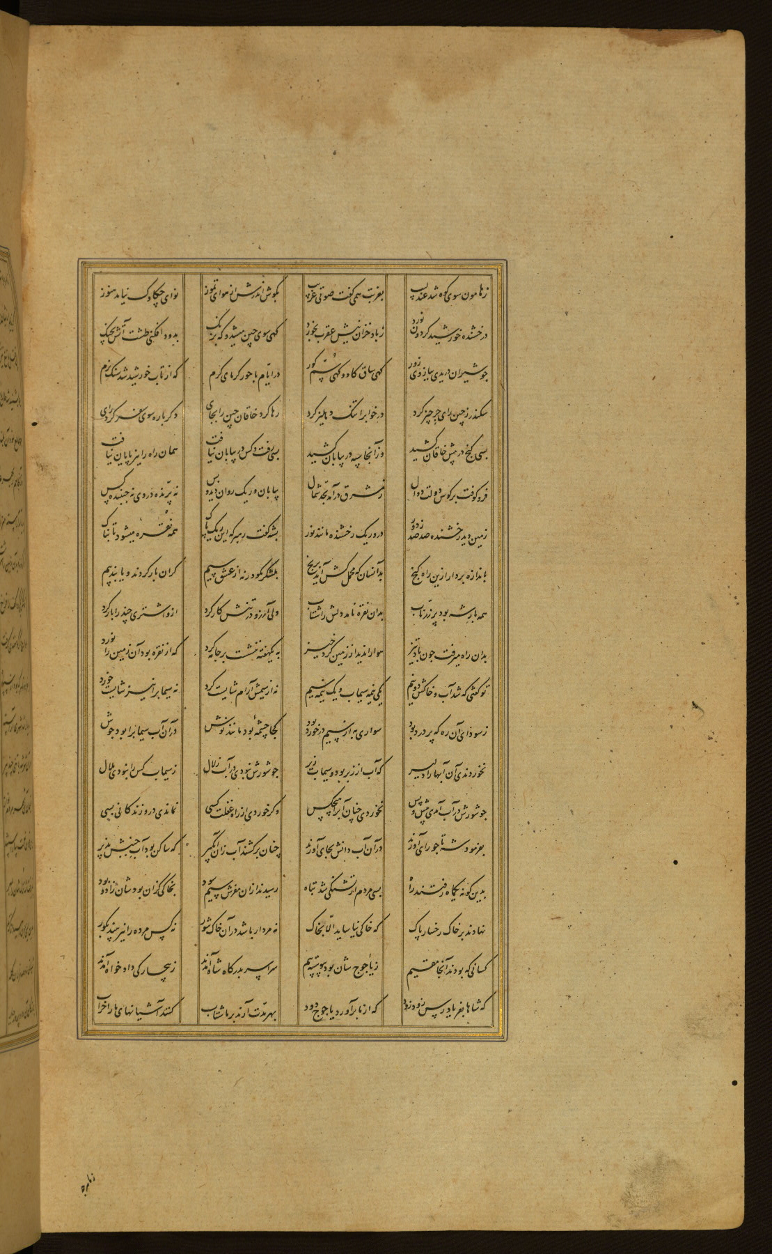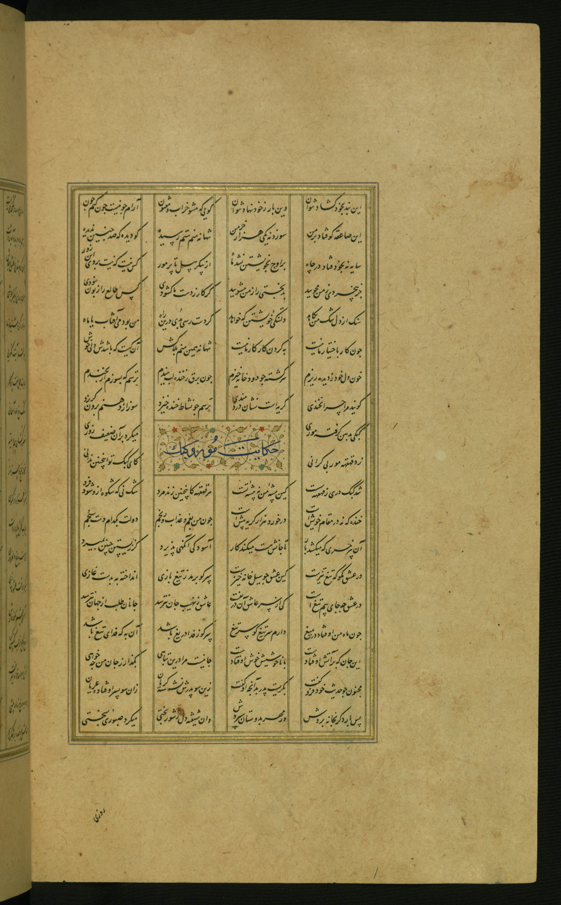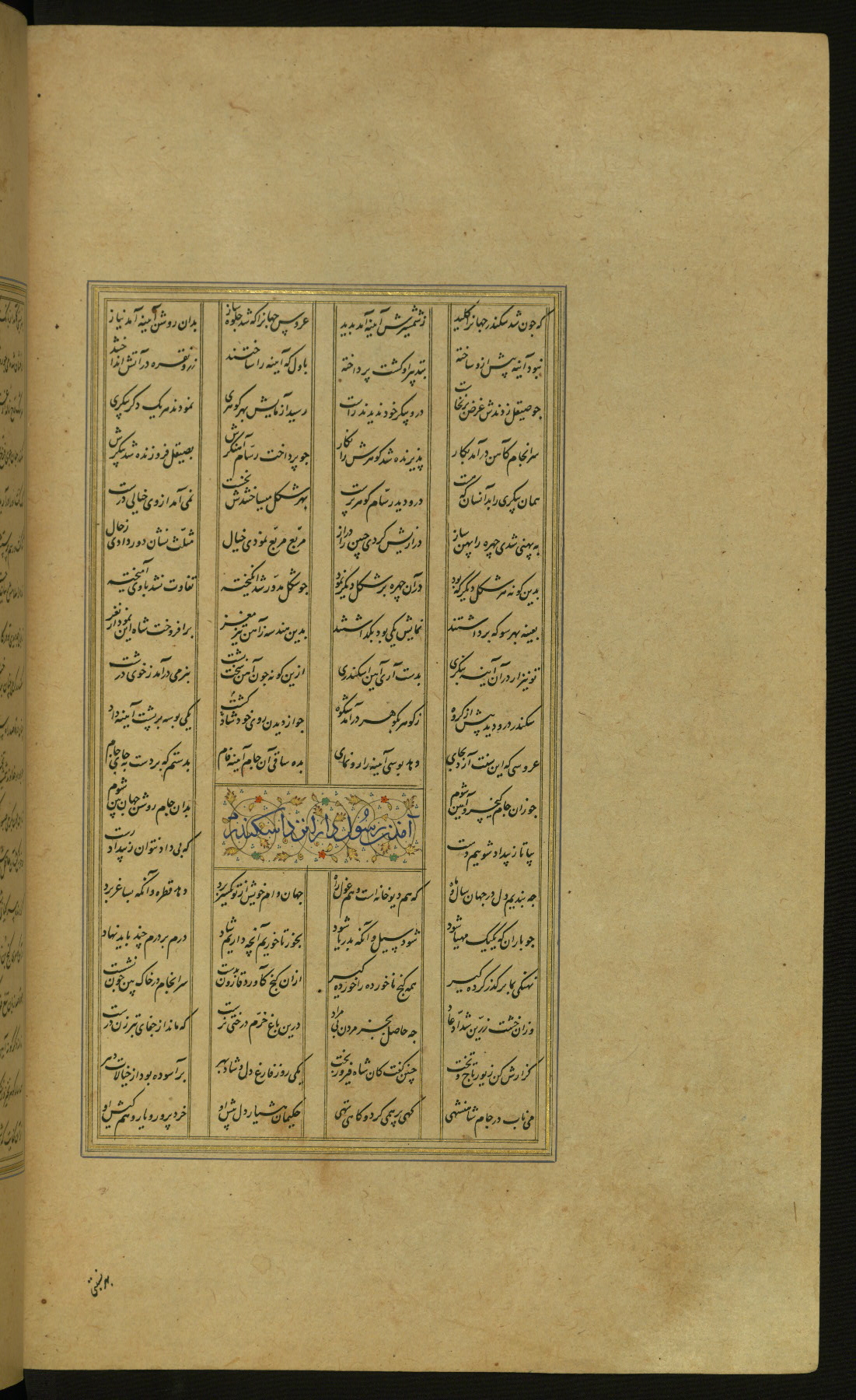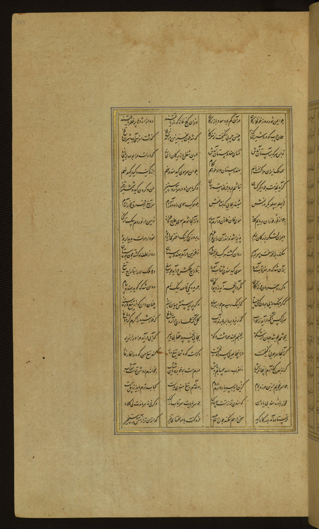 This illuminated and illustrated copy of the Khamsah (quintet) of Niẓāmī Ganjavī (d. 605 AH / 1209 CE) was written by Yār Muḥammad al-Haravī in 922 AH / 1516 CE. Written in four columns in black nastaʿlīq script, this manuscript opens with a double-page illuminated frontispiece signed by ʿAbd al-Wahhāb ibn ʿAbd al-Fattāḥ ibn ʿAlī. It contains thirty-five illustrations that were repainted in India during the twelfth century AH / eighteenth CE. The seal of Muḥammad Asharf ibn Muḥammad Khātam al-Ḥusaynī, dated 1173 AH / 1759-60 CE appears on fols. 1a and 401a. It is possible that the brown leather binding with center and side panels brushed with gold is original to the manuscript but was repaired at a later stage in the codex's history.