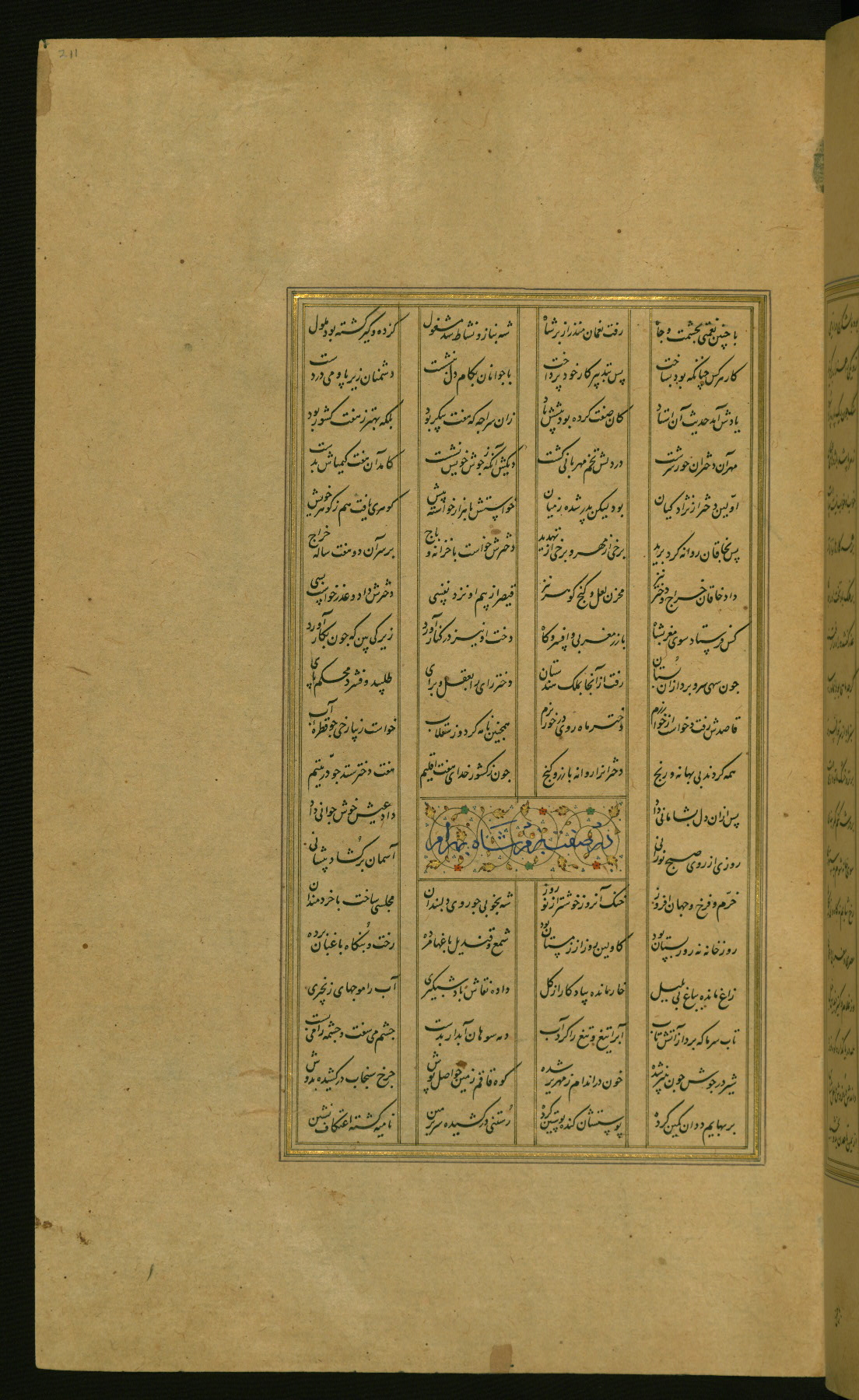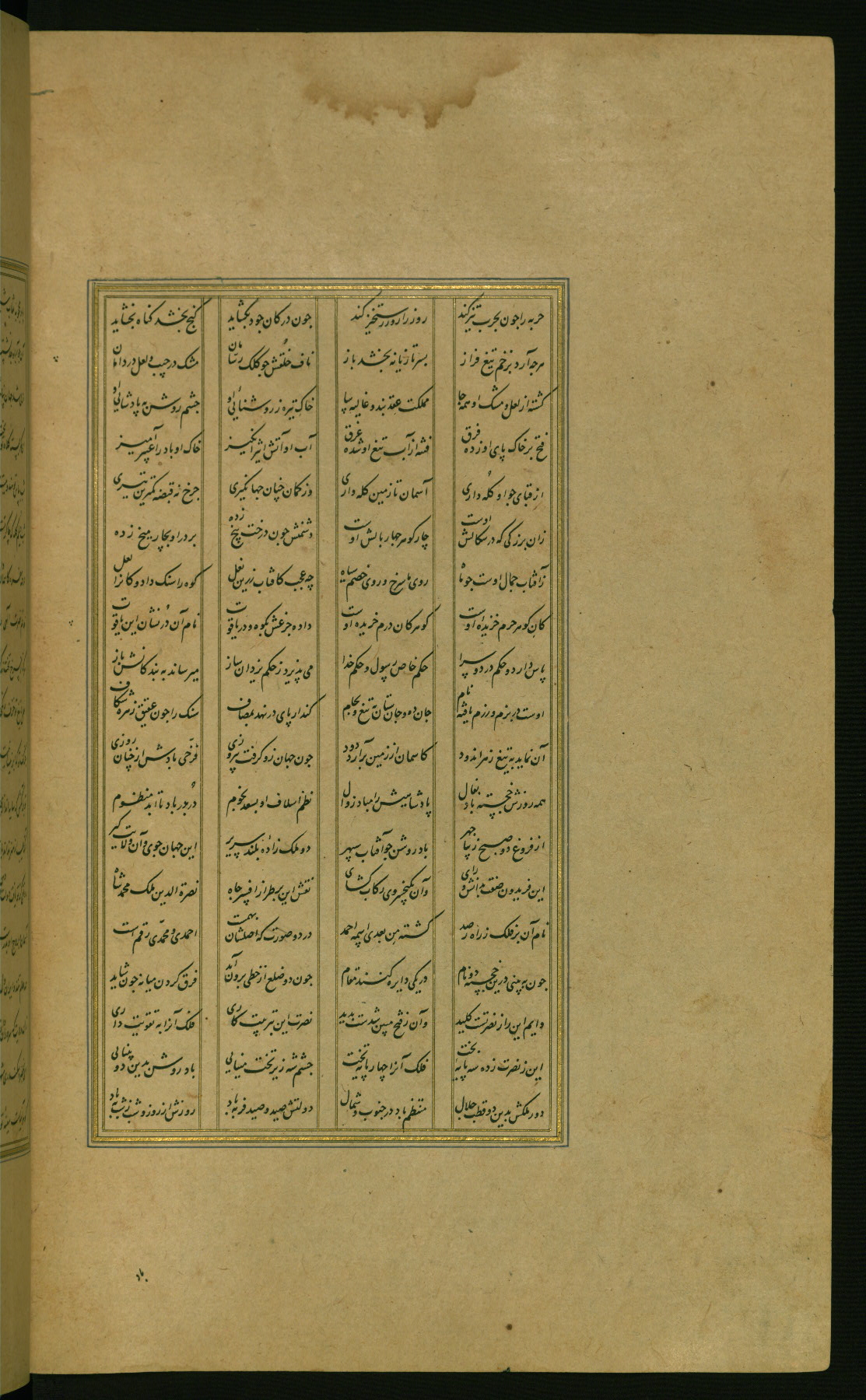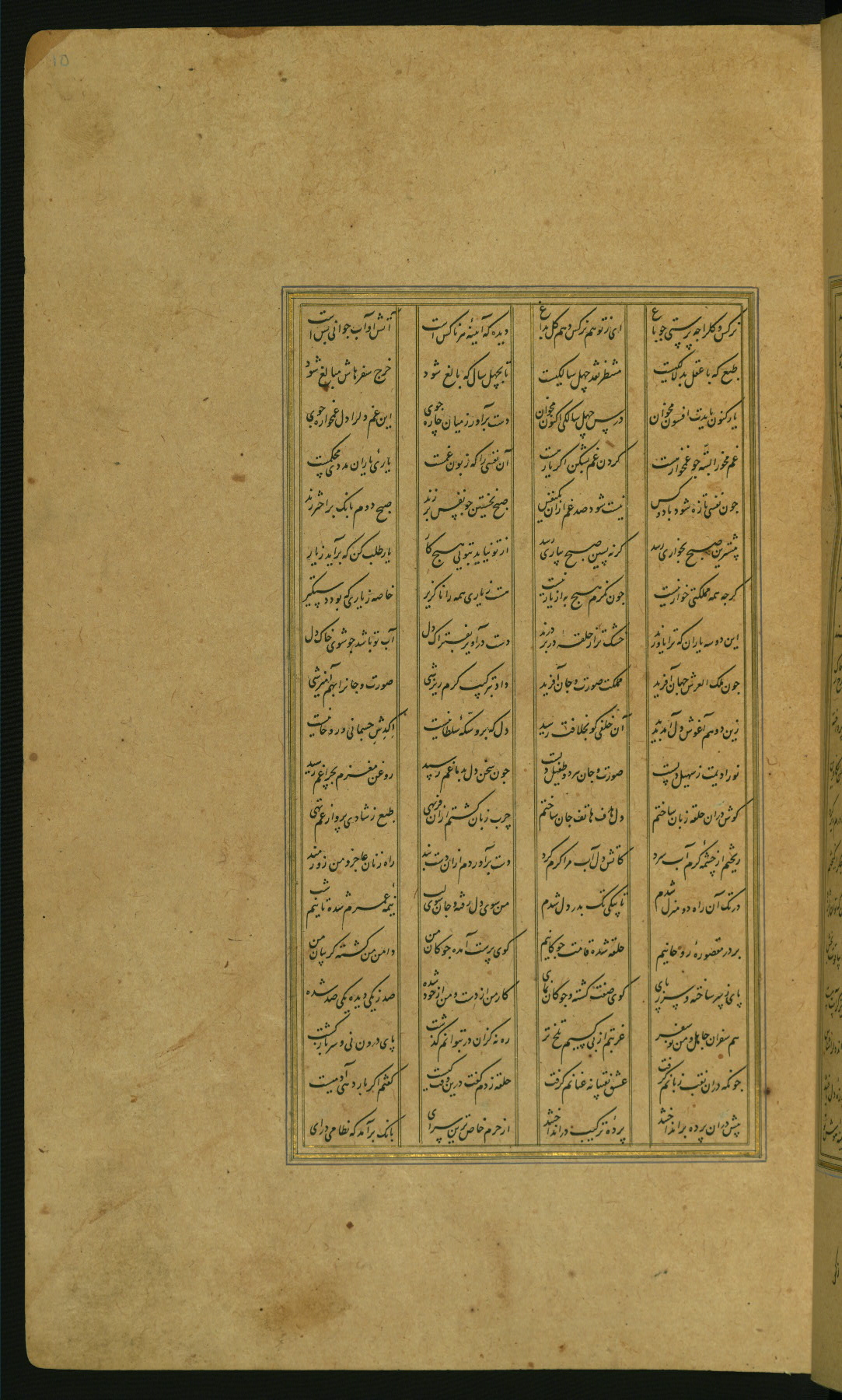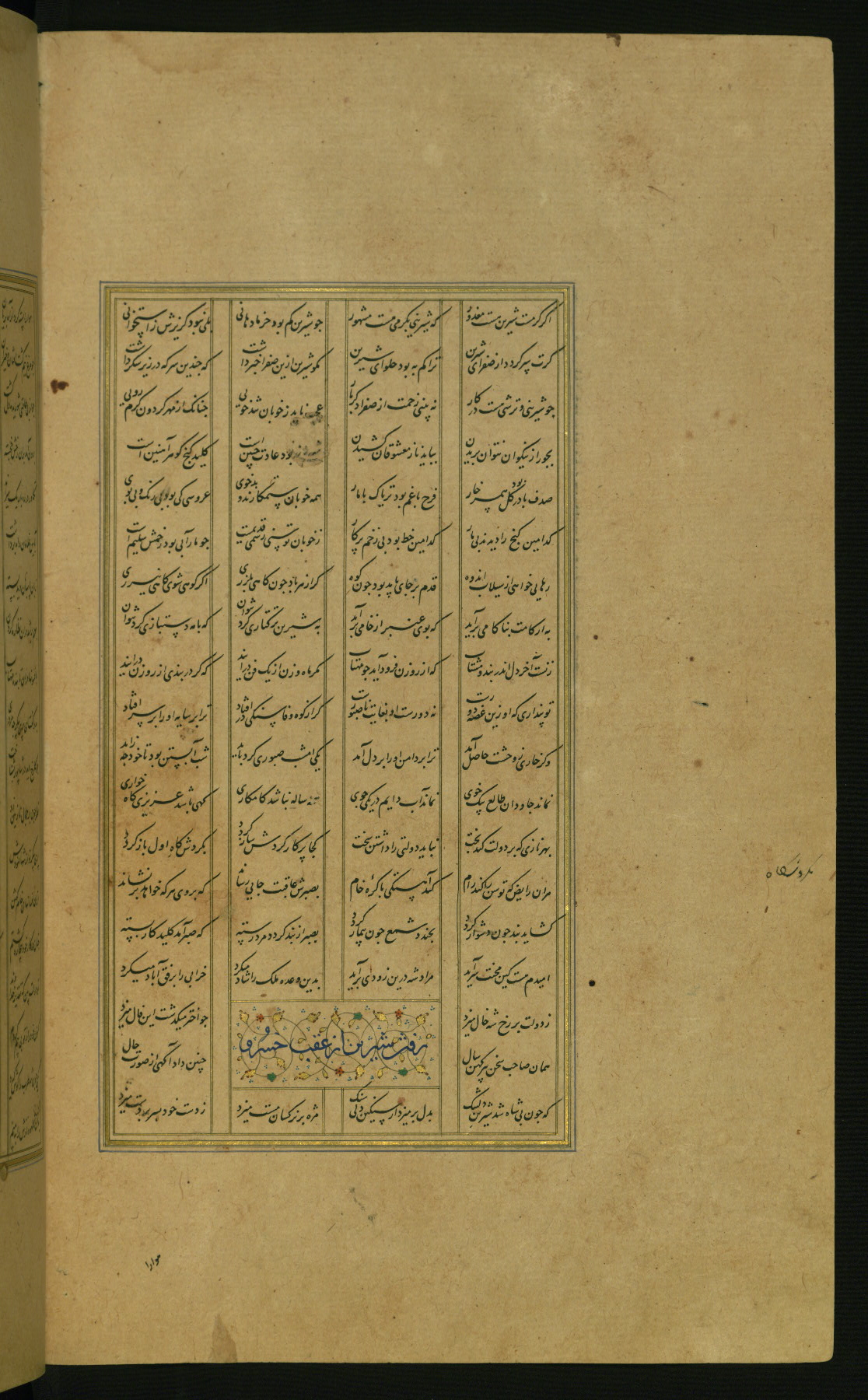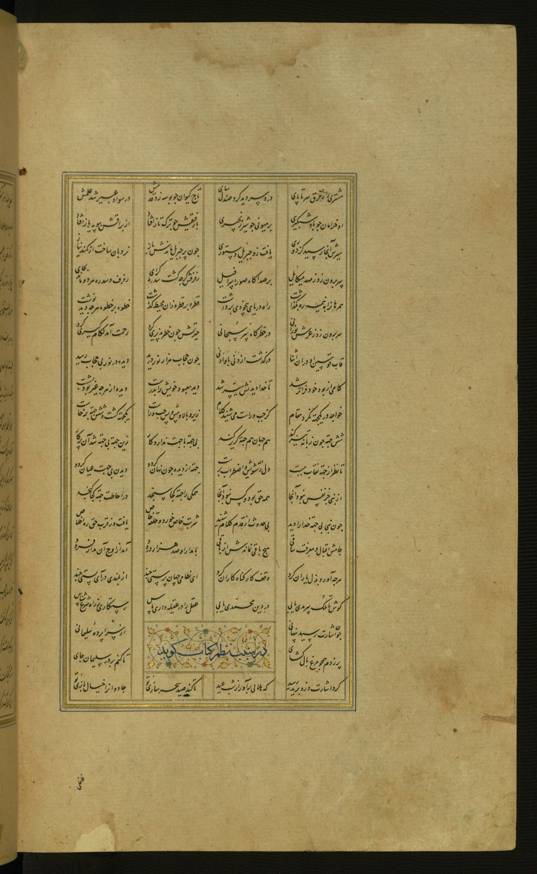 This illuminated and illustrated copy of the Khamsah (quintet) of Niẓāmī Ganjavī (d. 605 AH / 1209 CE) was written by Yār Muḥammad al-Haravī in 922 AH / 1516 CE. Written in four columns in black nastaʿlīq script, this manuscript opens with a double-page illuminated frontispiece signed by ʿAbd al-Wahhāb ibn ʿAbd al-Fattāḥ ibn ʿAlī. It contains thirty-five illustrations that were repainted in India during the twelfth century AH / eighteenth CE. The seal of Muḥammad Asharf ibn Muḥammad Khātam al-Ḥusaynī, dated 1173 AH / 1759-60 CE appears on fols. 1a and 401a. It is possible that the brown leather binding with center and side panels brushed with gold is original to the manuscript but was repaired at a later stage in the codex's history.
