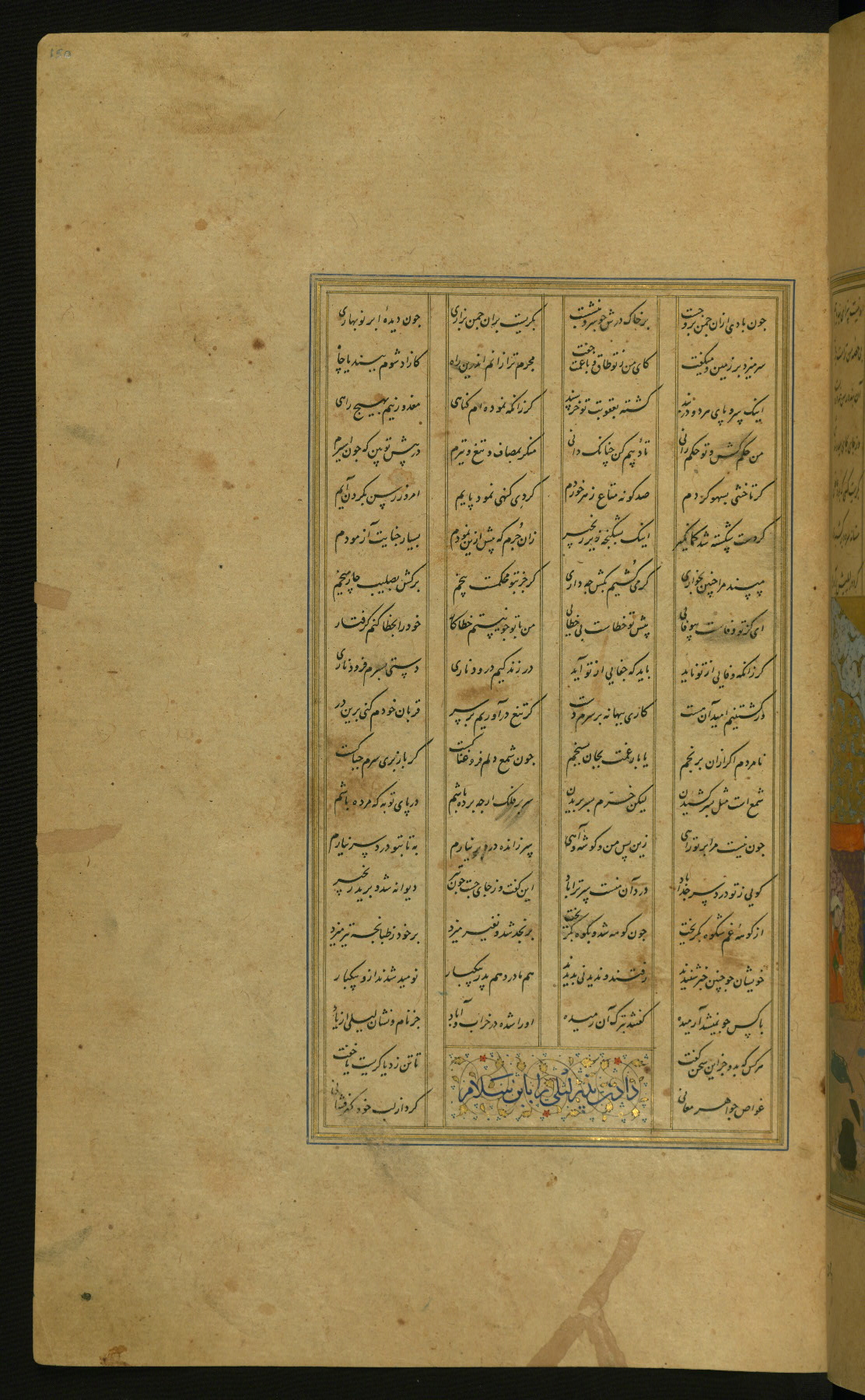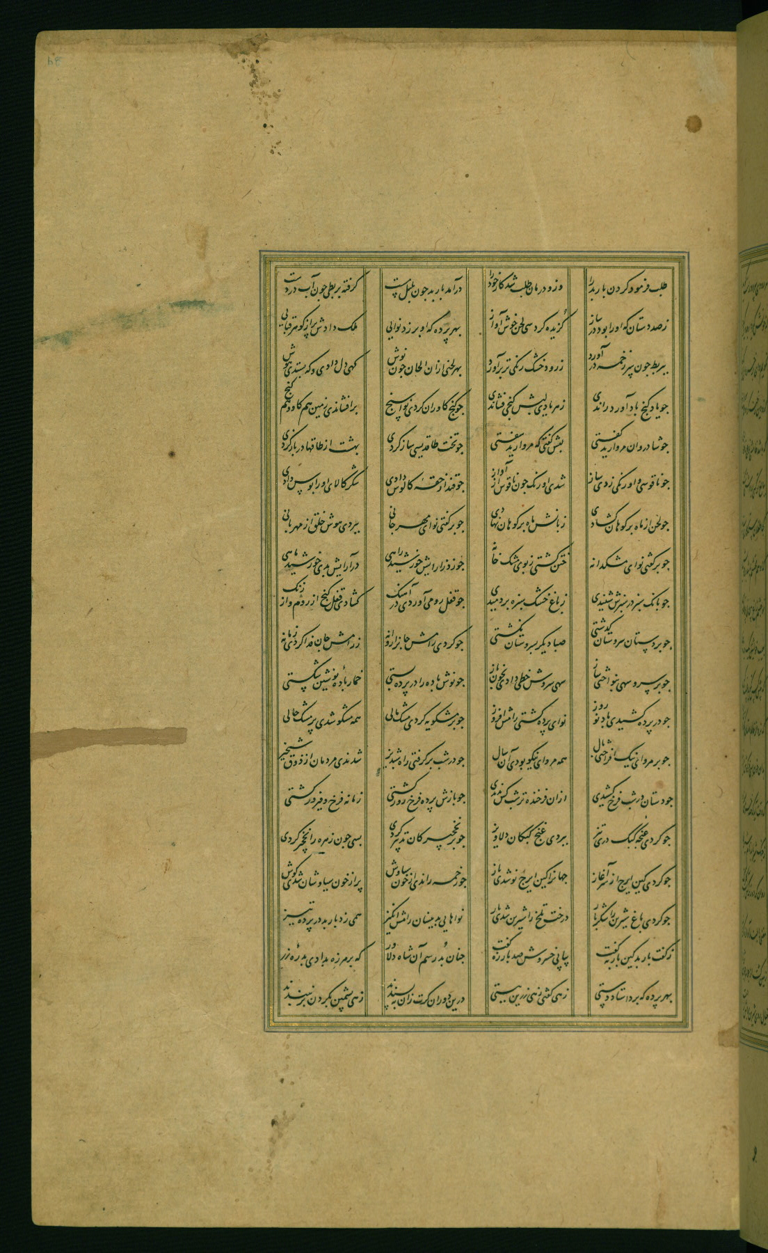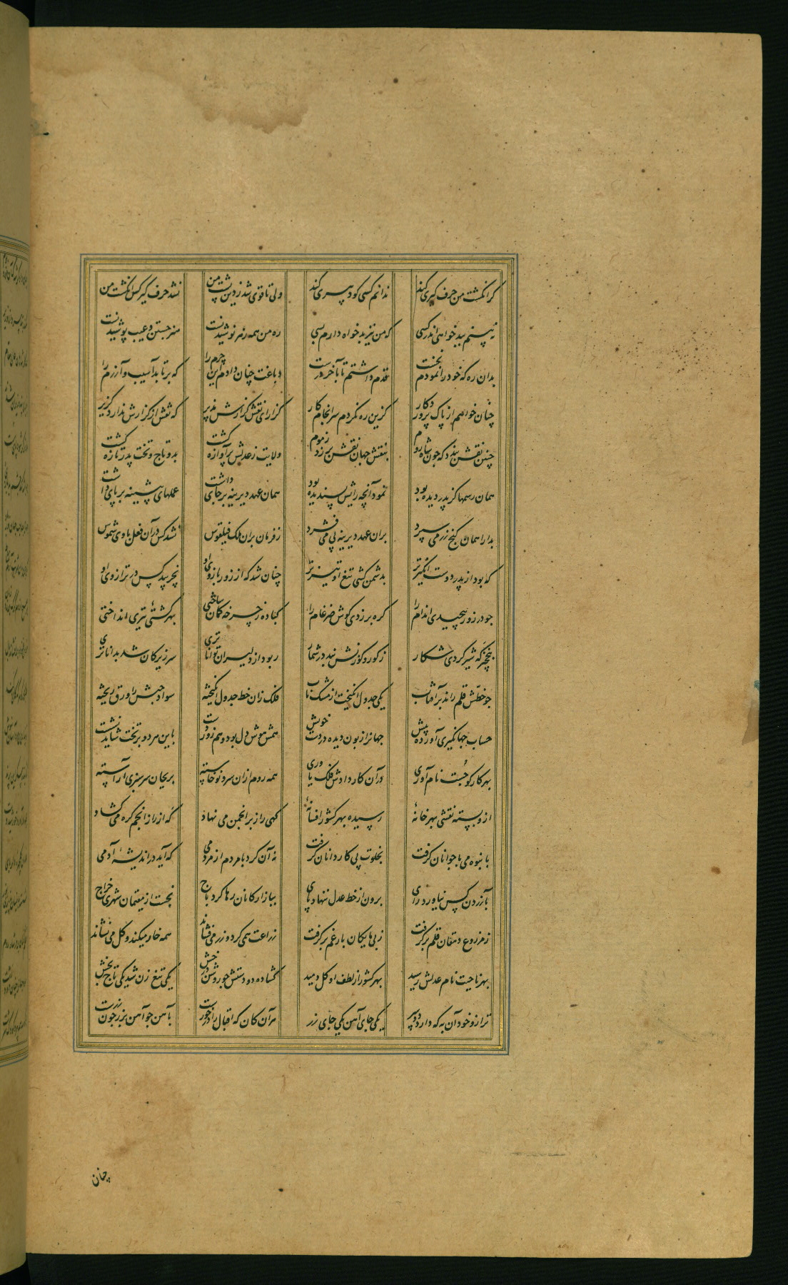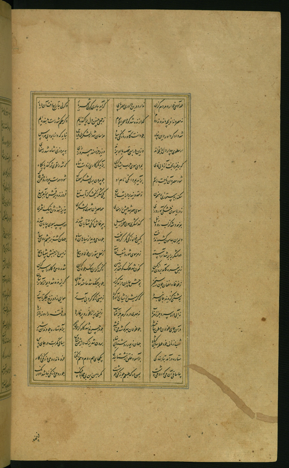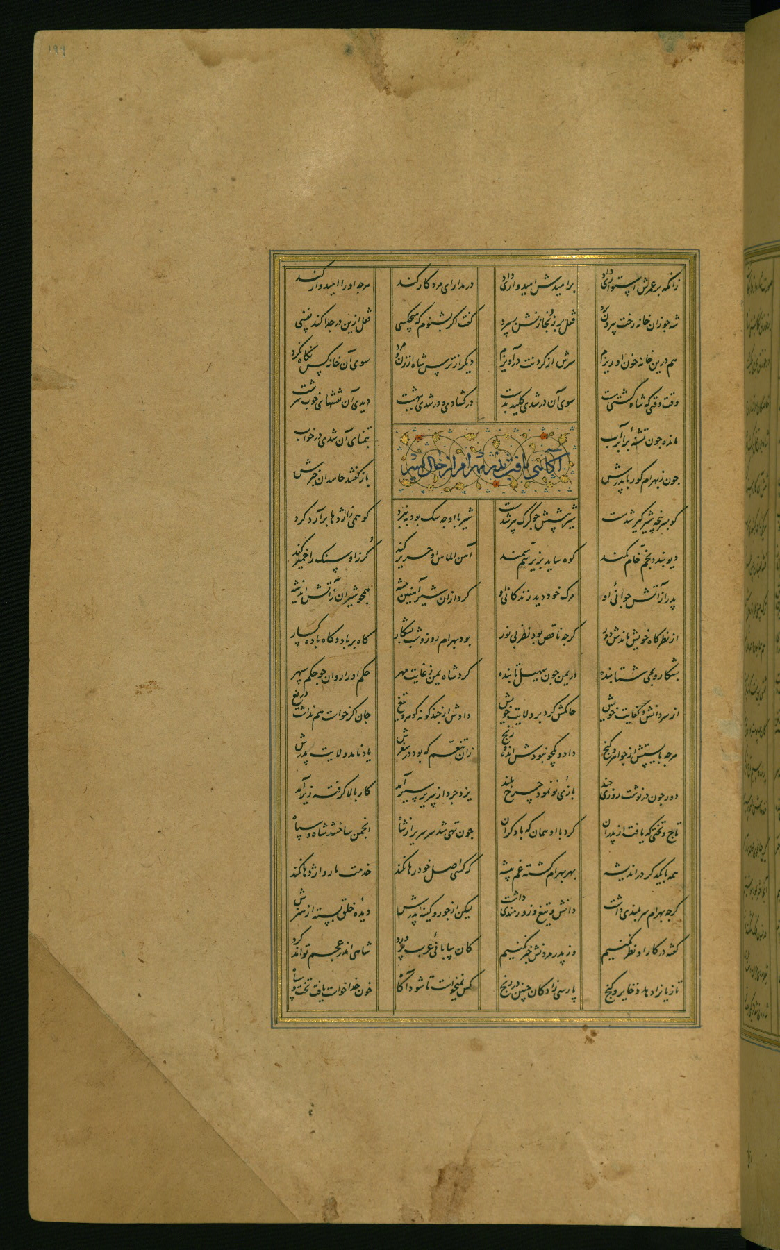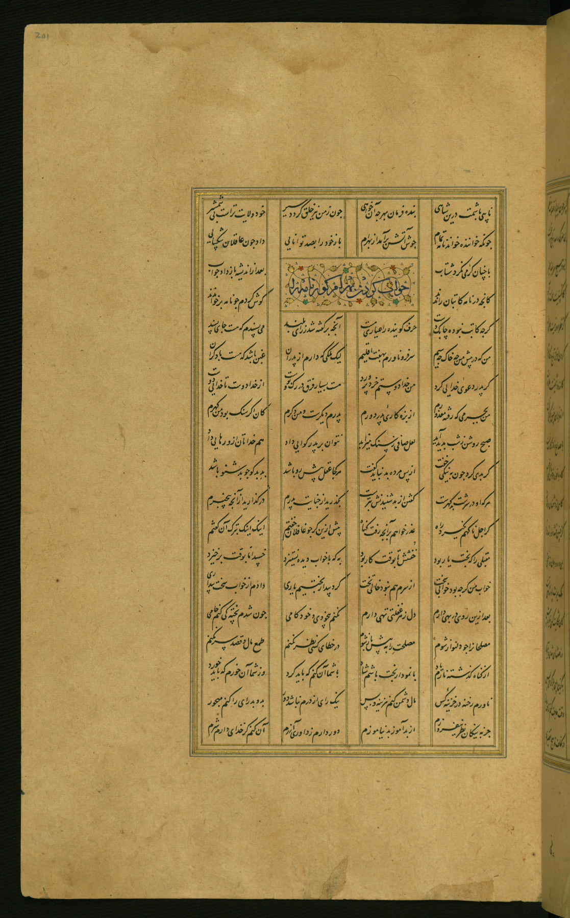 This illuminated and illustrated copy of the Khamsah (quintet) of Niẓāmī Ganjavī (d. 605 AH / 1209 CE) was written by Yār Muḥammad al-Haravī in 922 AH / 1516 CE. Written in four columns in black nastaʿlīq script, this manuscript opens with a double-page illuminated frontispiece signed by ʿAbd al-Wahhāb ibn ʿAbd al-Fattāḥ ibn ʿAlī. It contains thirty-five illustrations that were repainted in India during the twelfth century AH / eighteenth CE. The seal of Muḥammad Asharf ibn Muḥammad Khātam al-Ḥusaynī, dated 1173 AH / 1759-60 CE appears on fols. 1a and 401a. It is possible that the brown leather binding with center and side panels brushed with gold is original to the manuscript but was repaired at a later stage in the codex's history.