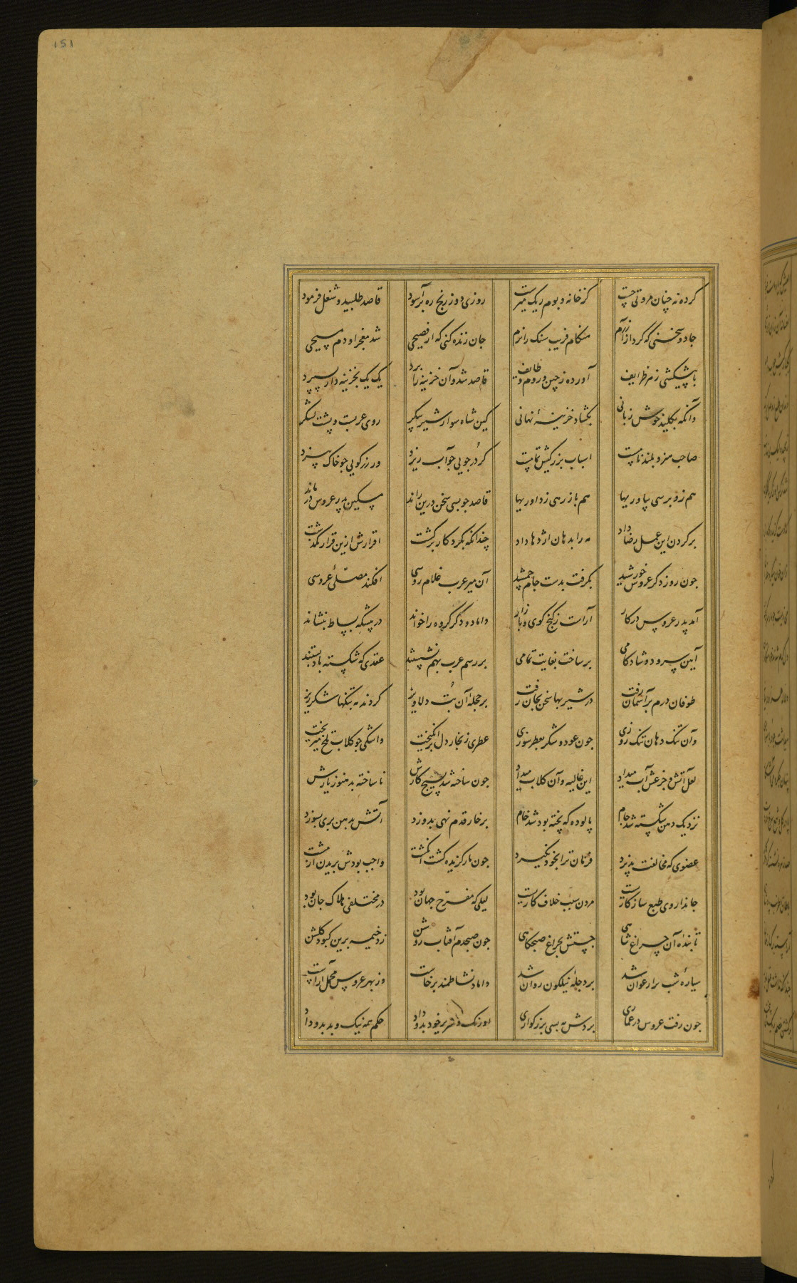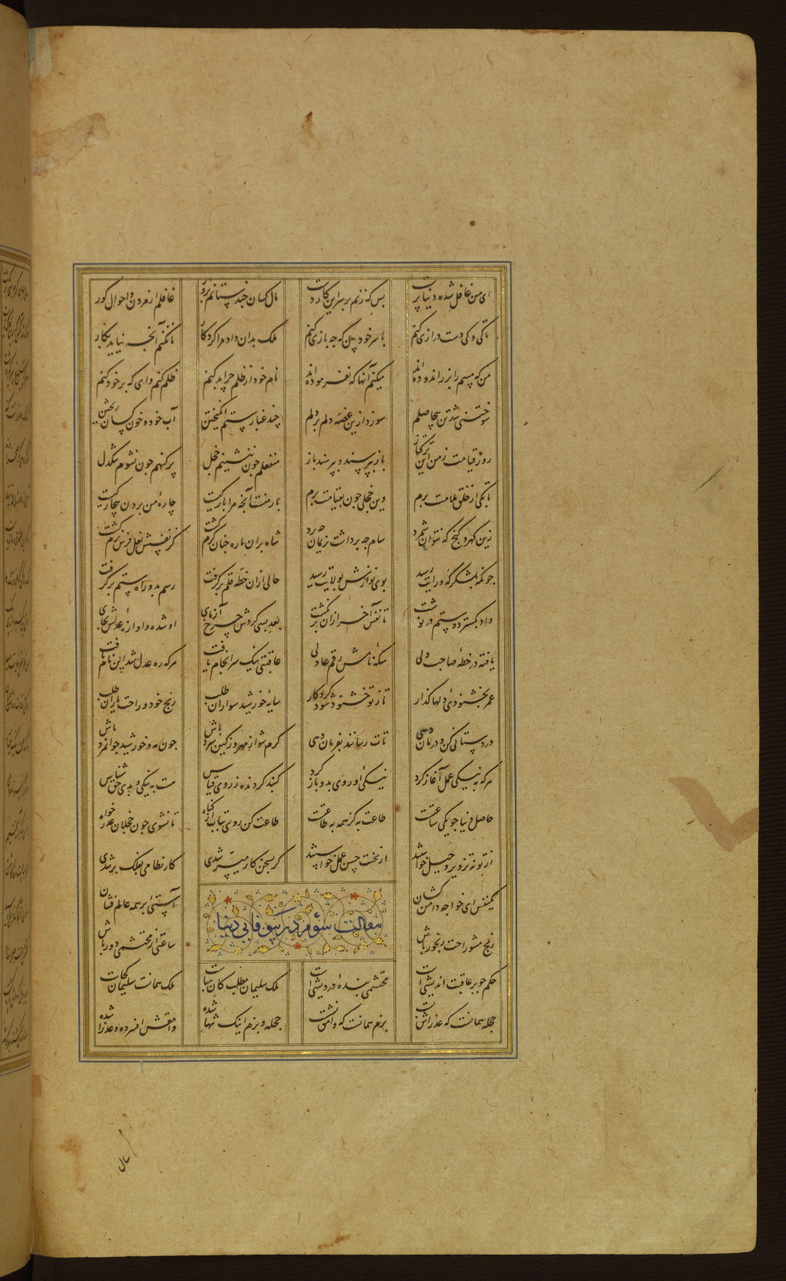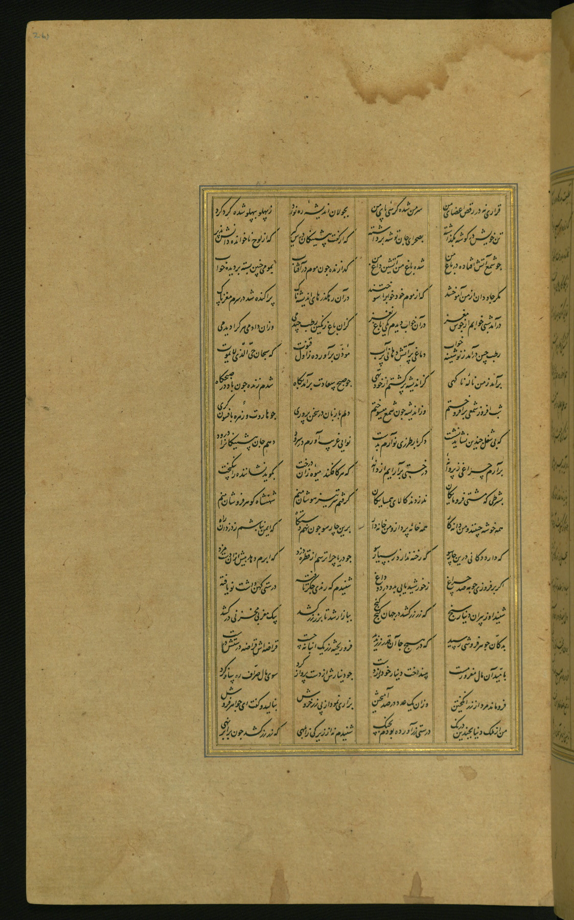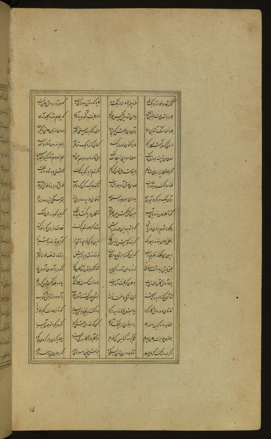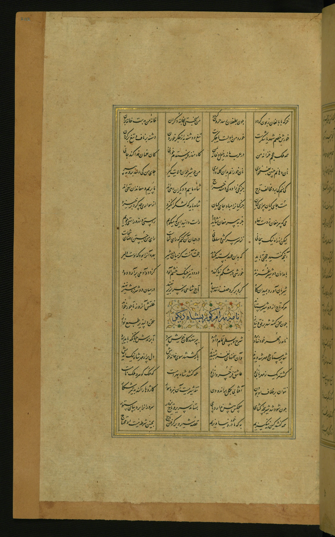 This illuminated and illustrated copy of the Khamsah (quintet) of Niẓāmī Ganjavī (d. 605 AH / 1209 CE) was written by Yār Muḥammad al-Haravī in 922 AH / 1516 CE. Written in four columns in black nastaʿlīq script, this manuscript opens with a double-page illuminated frontispiece signed by ʿAbd al-Wahhāb ibn ʿAbd al-Fattāḥ ibn ʿAlī. It contains thirty-five illustrations that were repainted in India during the twelfth century AH / eighteenth CE. The seal of Muḥammad Asharf ibn Muḥammad Khātam al-Ḥusaynī, dated 1173 AH / 1759-60 CE appears on fols. 1a and 401a. It is possible that the brown leather binding with center and side panels brushed with gold is original to the manuscript but was repaired at a later stage in the codex's history.