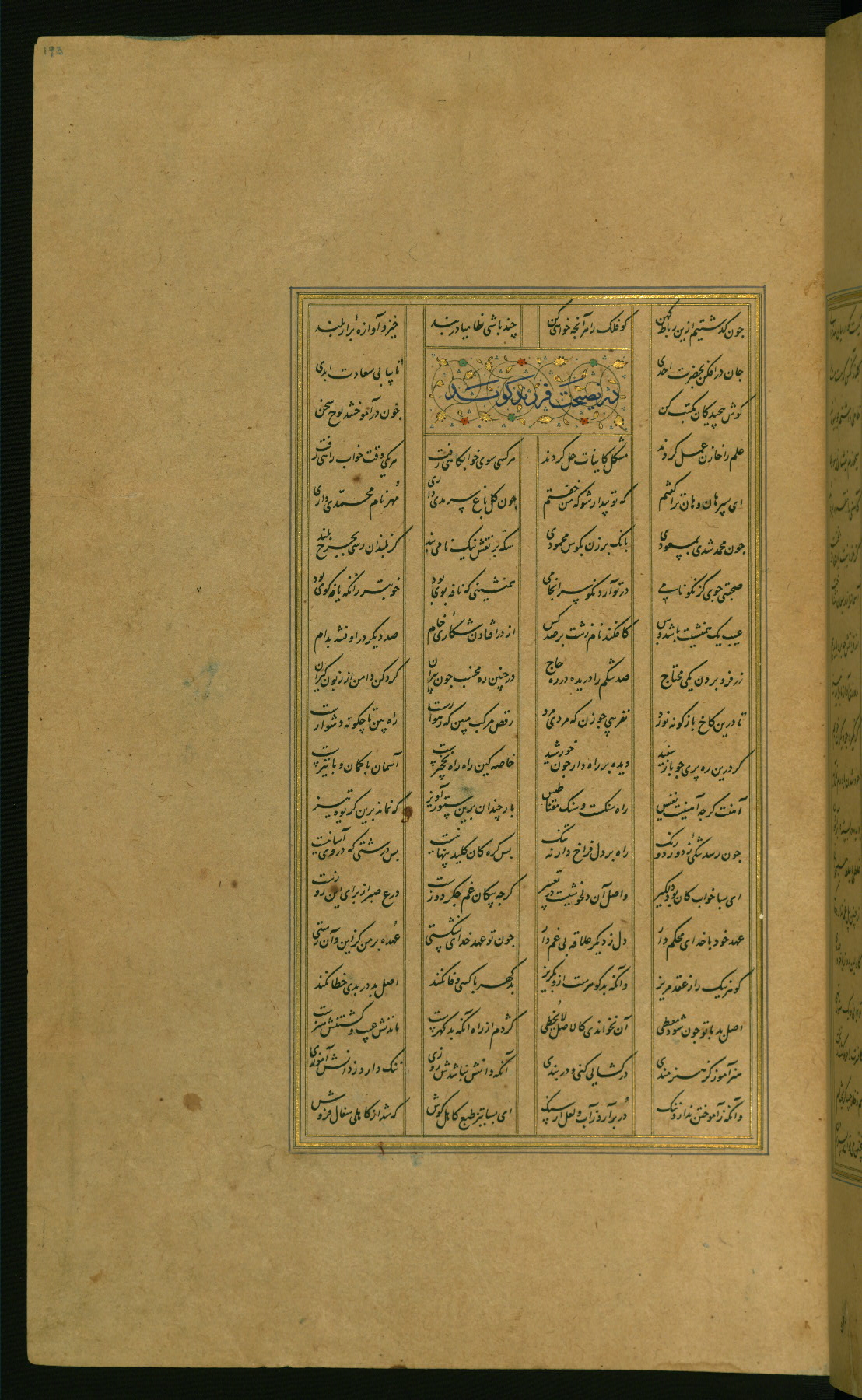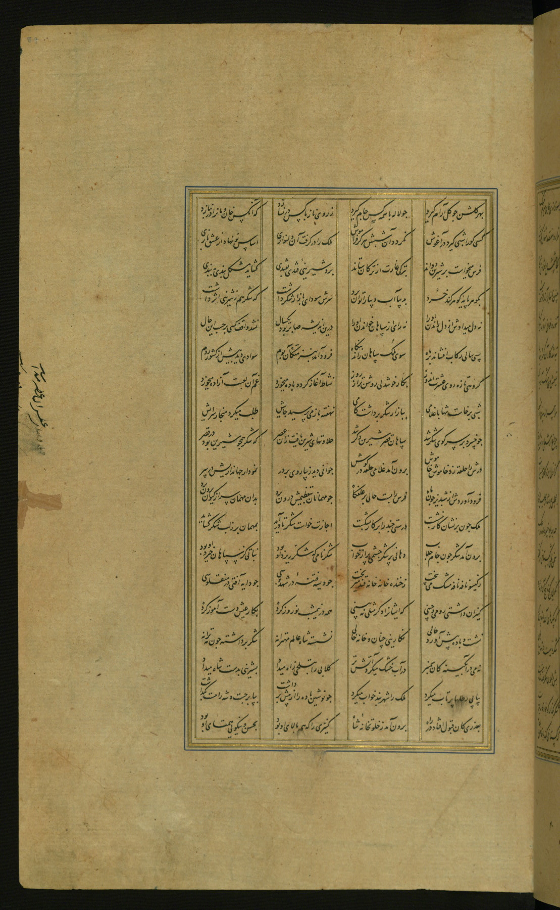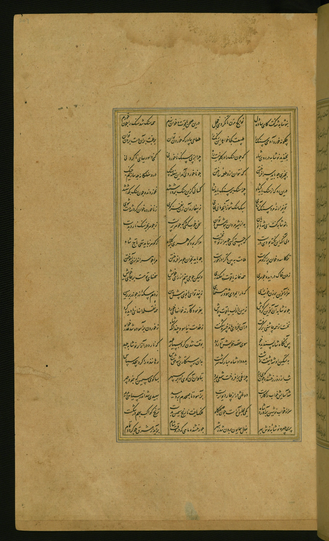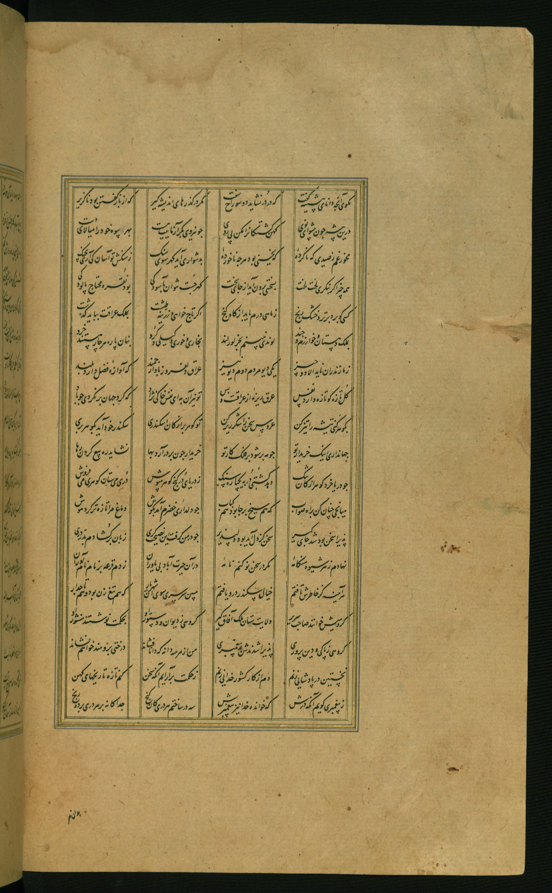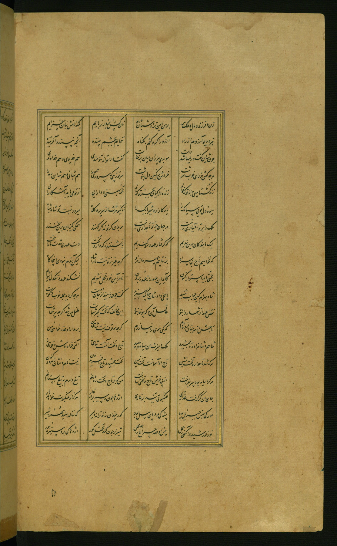This illuminated and illustrated copy of the Khamsah (quintet) of Niẓāmī Ganjavī (d. 605 AH / 1209 CE) was written by Yār Muḥammad al-Haravī in 922 AH / 1516 CE. Written in four columns in black nastaʿlīq script, this manuscript opens with a double-page illuminated frontispiece signed by ʿAbd al-Wahhāb ibn ʿAbd al-Fattāḥ ibn ʿAlī. It contains thirty-five illustrations that were repainted in India during the twelfth century AH / eighteenth CE. The seal of Muḥammad Asharf ibn Muḥammad Khātam al-Ḥusaynī, dated 1173 AH / 1759-60 CE appears on fols. 1a and 401a. It is possible that the brown leather binding with center and side panels brushed with gold is original to the manuscript but was repaired at a later stage in the codex's history.