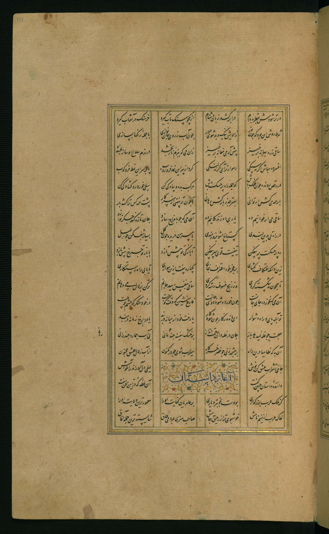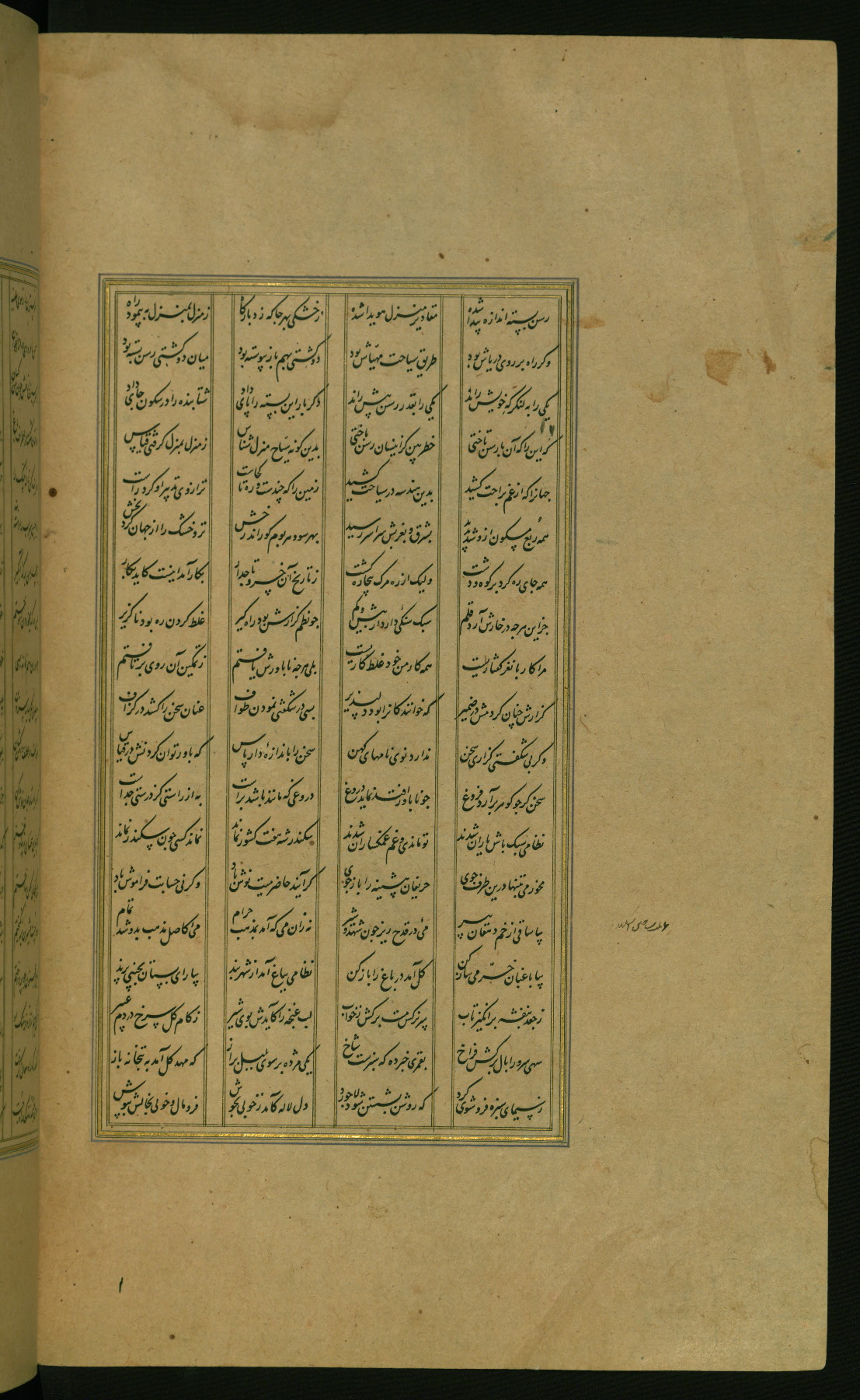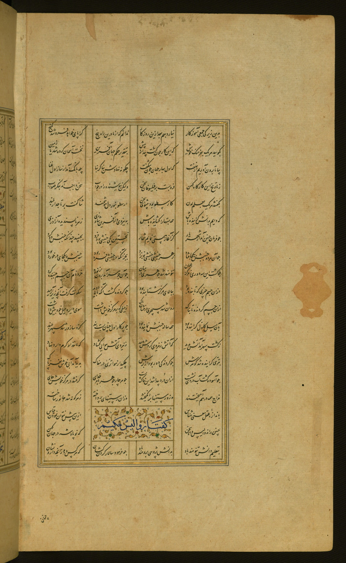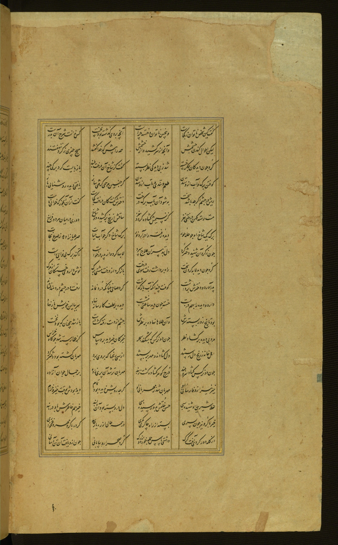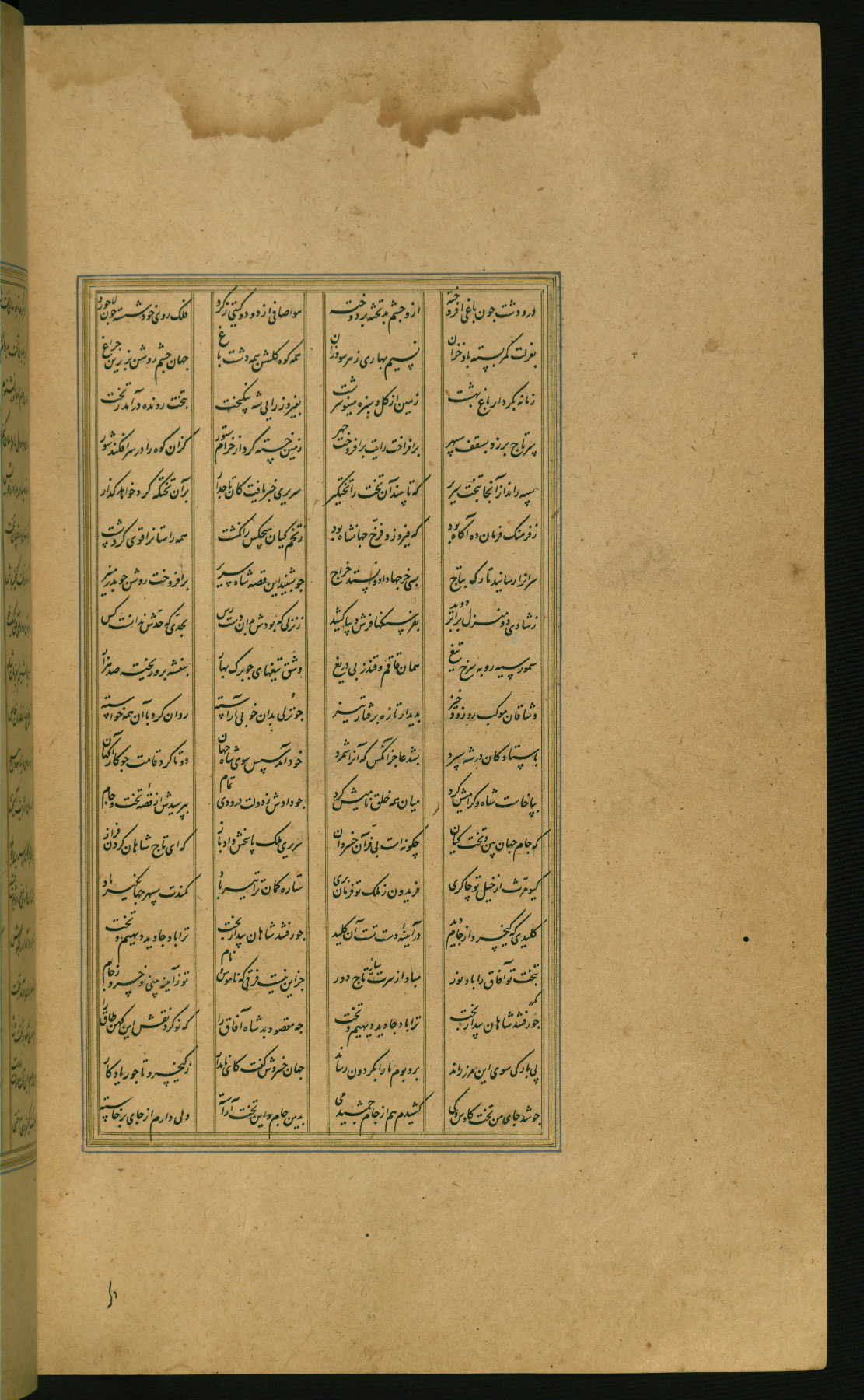 This illuminated and illustrated copy of the Khamsah (quintet) of Niẓāmī Ganjavī (d. 605 AH / 1209 CE) was written by Yār Muḥammad al-Haravī in 922 AH / 1516 CE. Written in four columns in black nastaʿlīq script, this manuscript opens with a double-page illuminated frontispiece signed by ʿAbd al-Wahhāb ibn ʿAbd al-Fattāḥ ibn ʿAlī. It contains thirty-five illustrations that were repainted in India during the twelfth century AH / eighteenth CE. The seal of Muḥammad Asharf ibn Muḥammad Khātam al-Ḥusaynī, dated 1173 AH / 1759-60 CE appears on fols. 1a and 401a. It is possible that the brown leather binding with center and side panels brushed with gold is original to the manuscript but was repaired at a later stage in the codex's history.