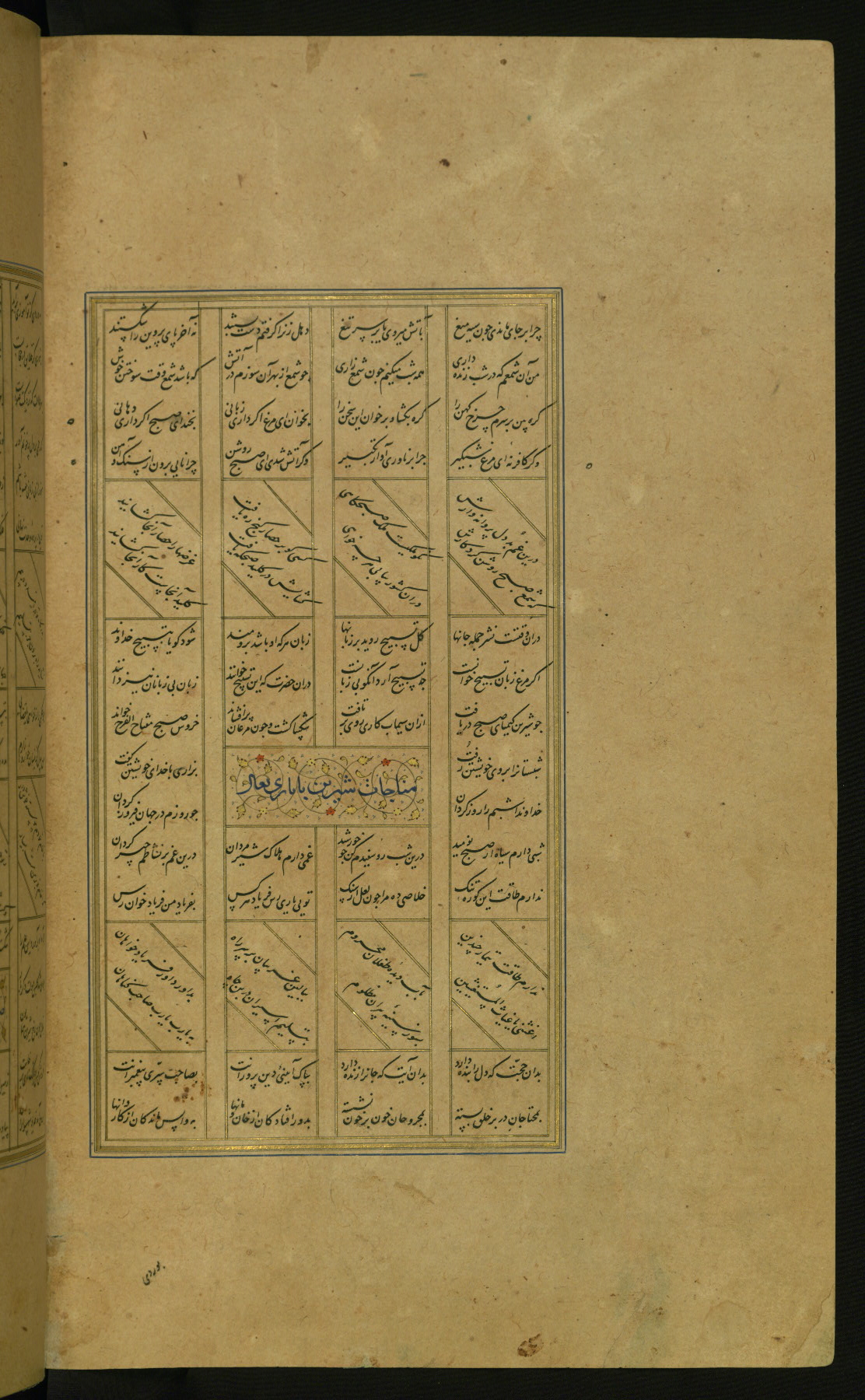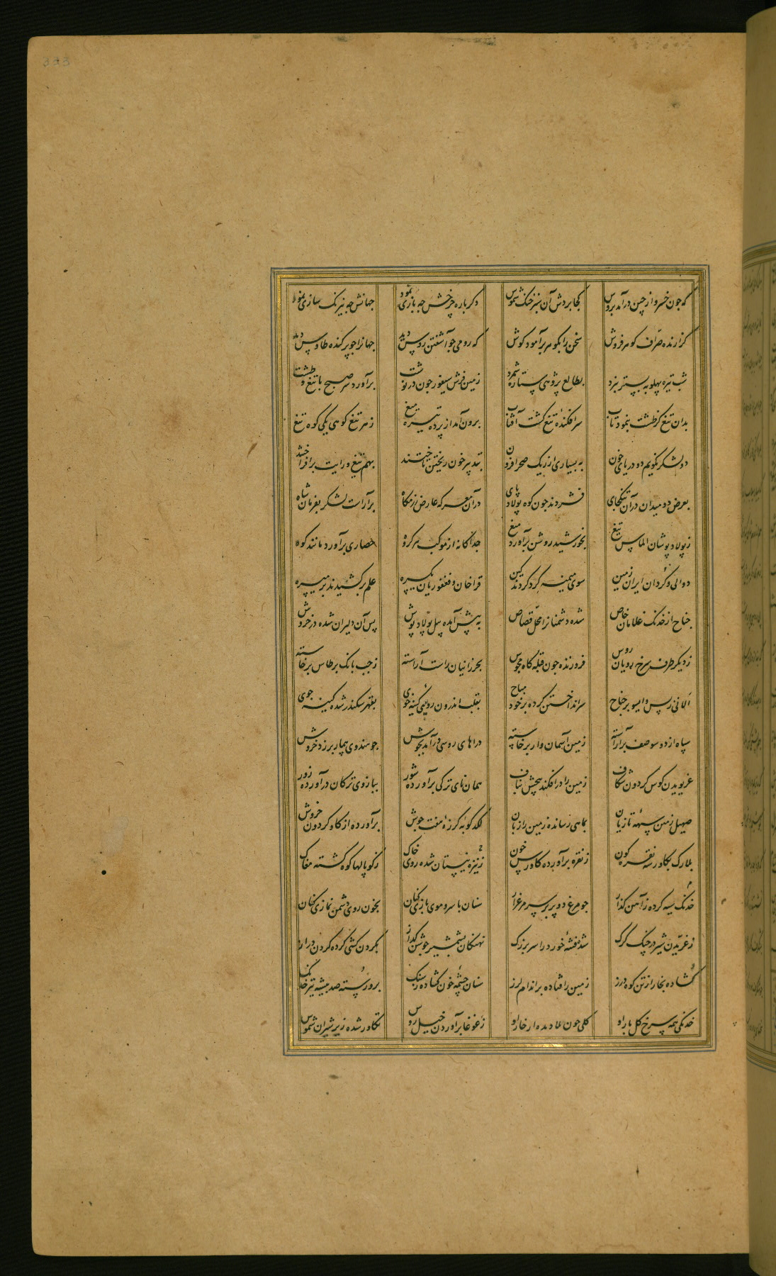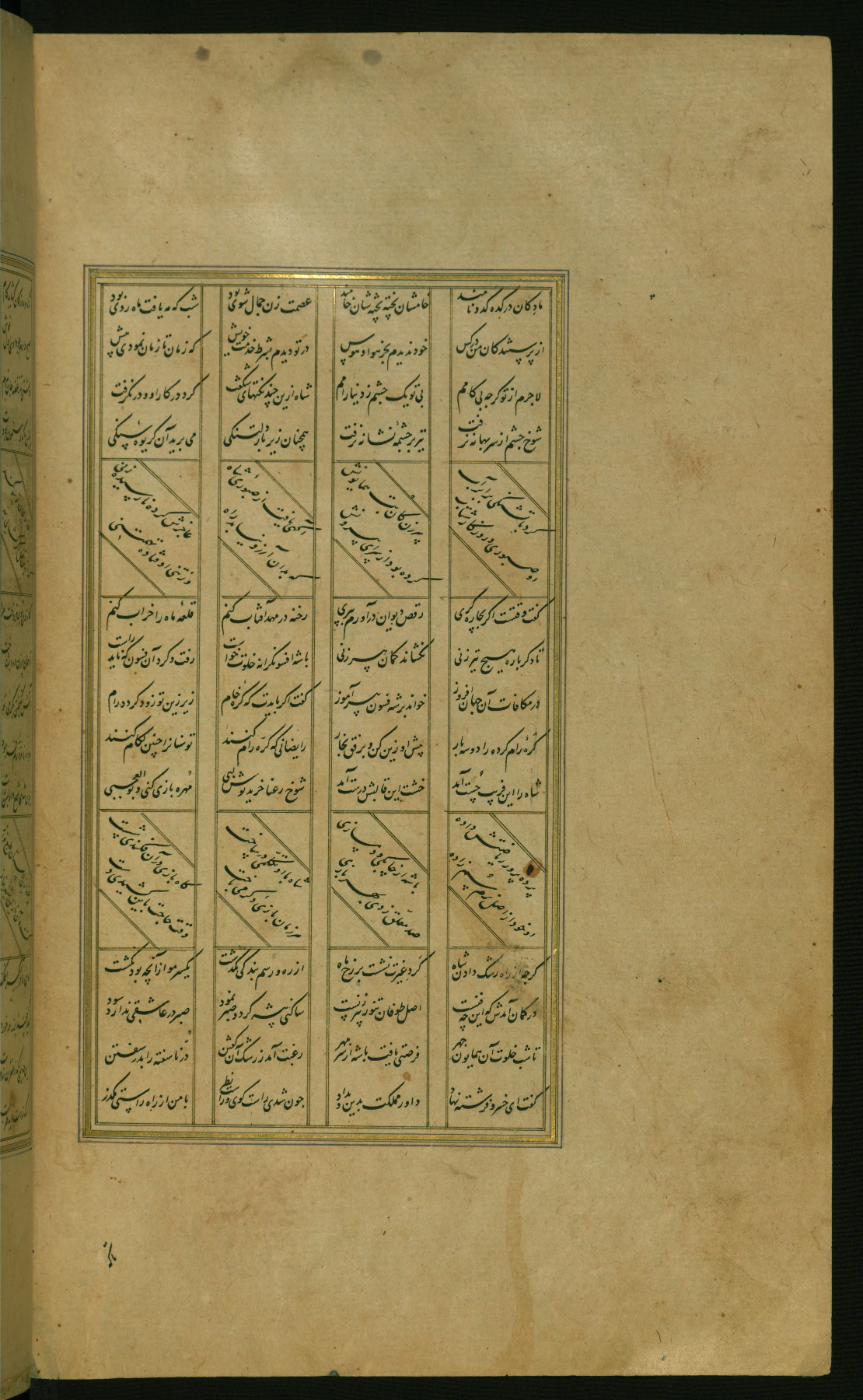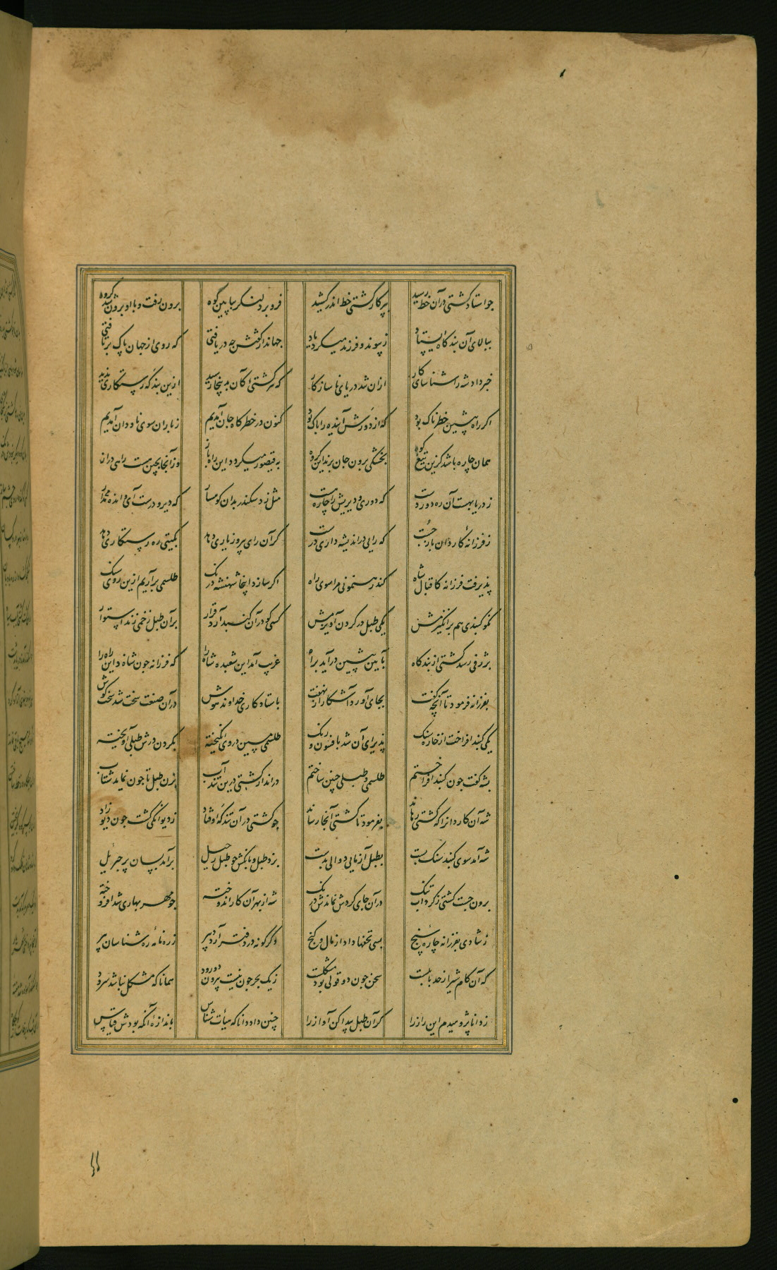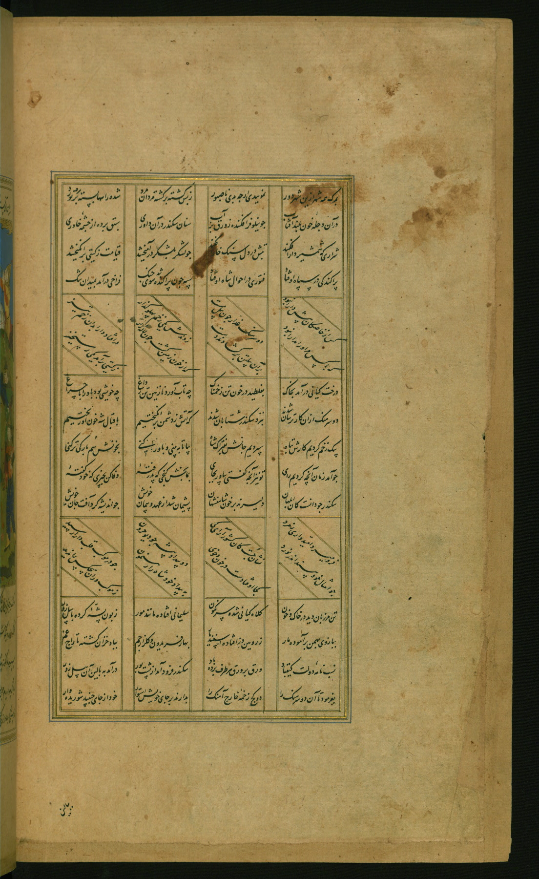 This illuminated and illustrated copy of the Khamsah (quintet) of Niẓāmī Ganjavī (d. 605 AH / 1209 CE) was written by Yār Muḥammad al-Haravī in 922 AH / 1516 CE. Written in four columns in black nastaʿlīq script, this manuscript opens with a double-page illuminated frontispiece signed by ʿAbd al-Wahhāb ibn ʿAbd al-Fattāḥ ibn ʿAlī. It contains thirty-five illustrations that were repainted in India during the twelfth century AH / eighteenth CE. The seal of Muḥammad Asharf ibn Muḥammad Khātam al-Ḥusaynī, dated 1173 AH / 1759-60 CE appears on fols. 1a and 401a. It is possible that the brown leather binding with center and side panels brushed with gold is original to the manuscript but was repaired at a later stage in the codex's history.