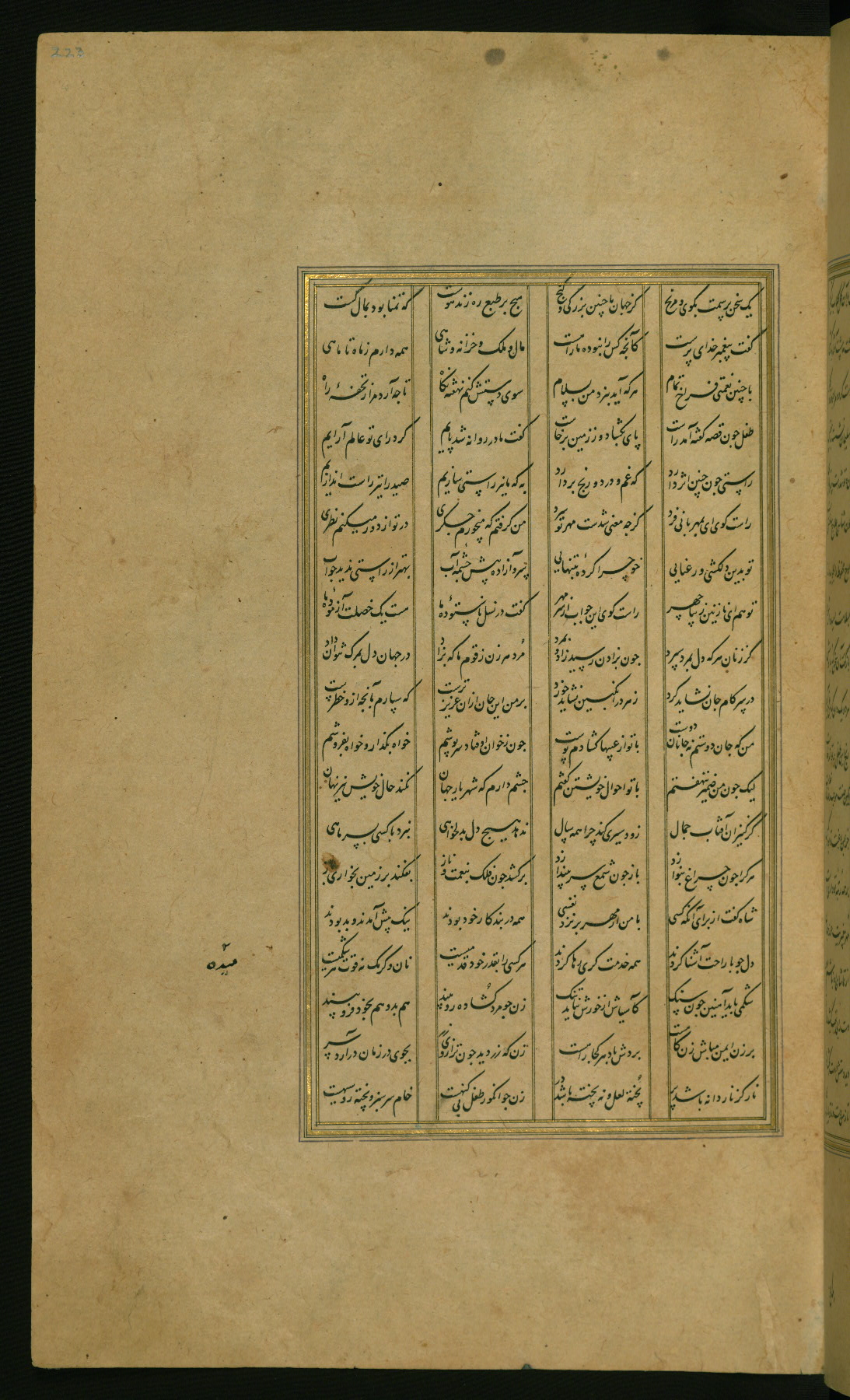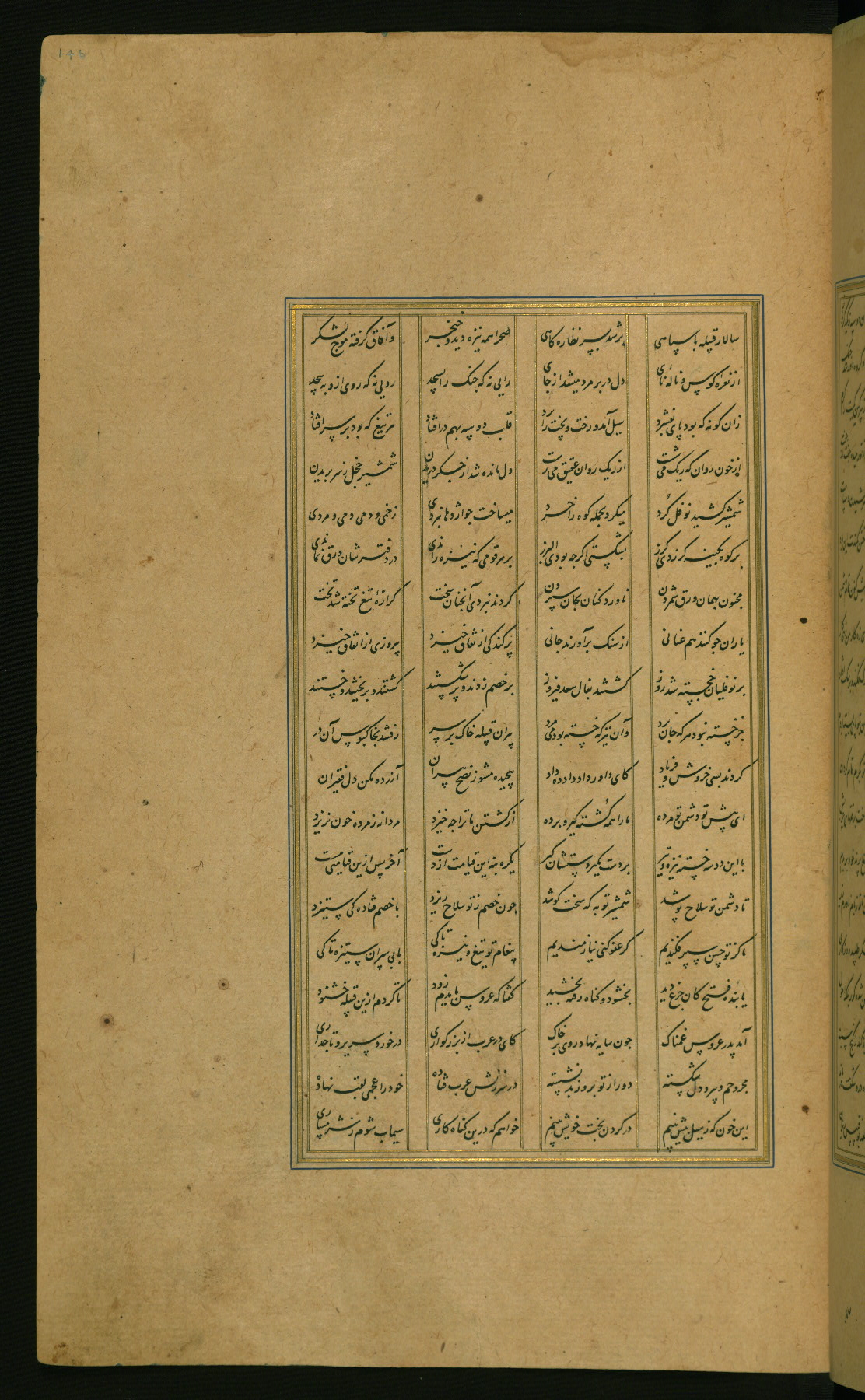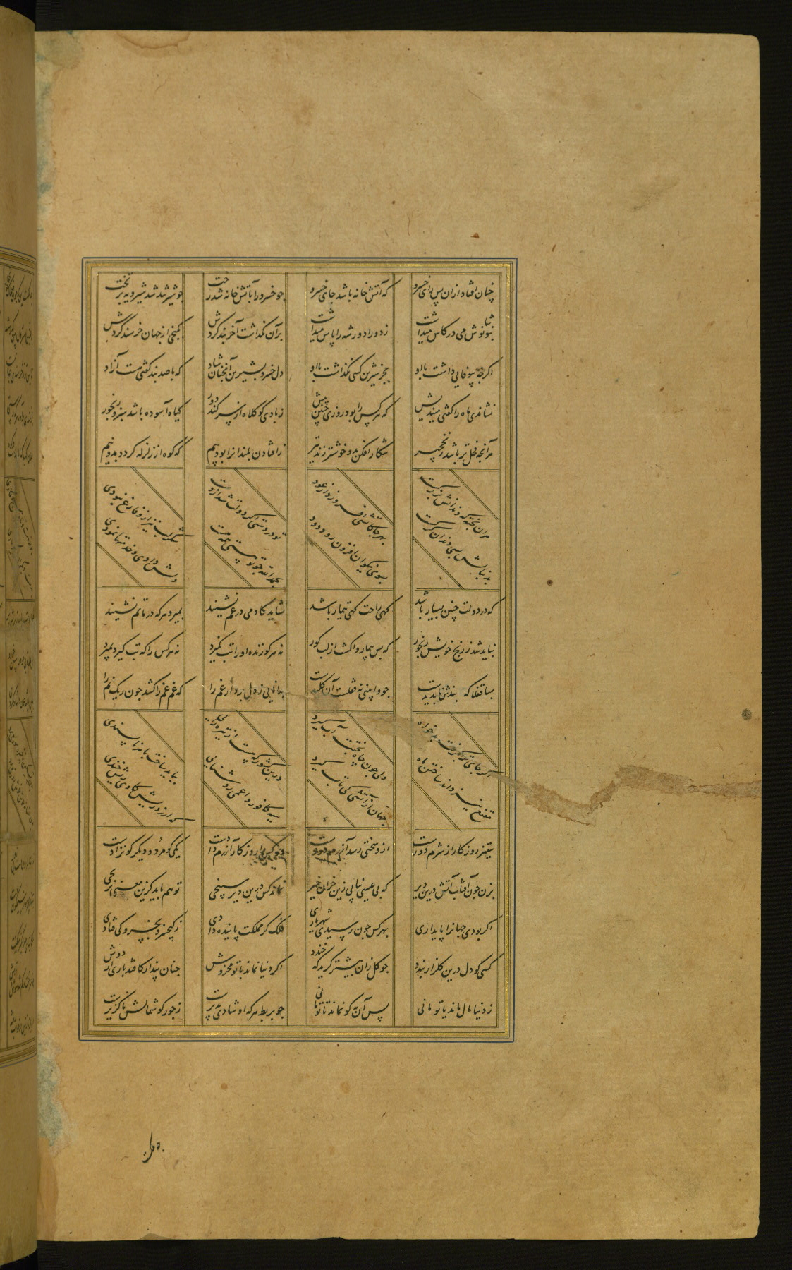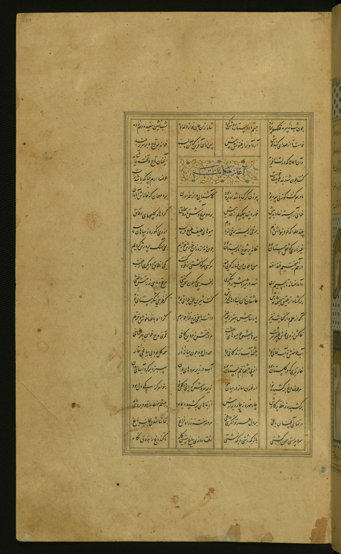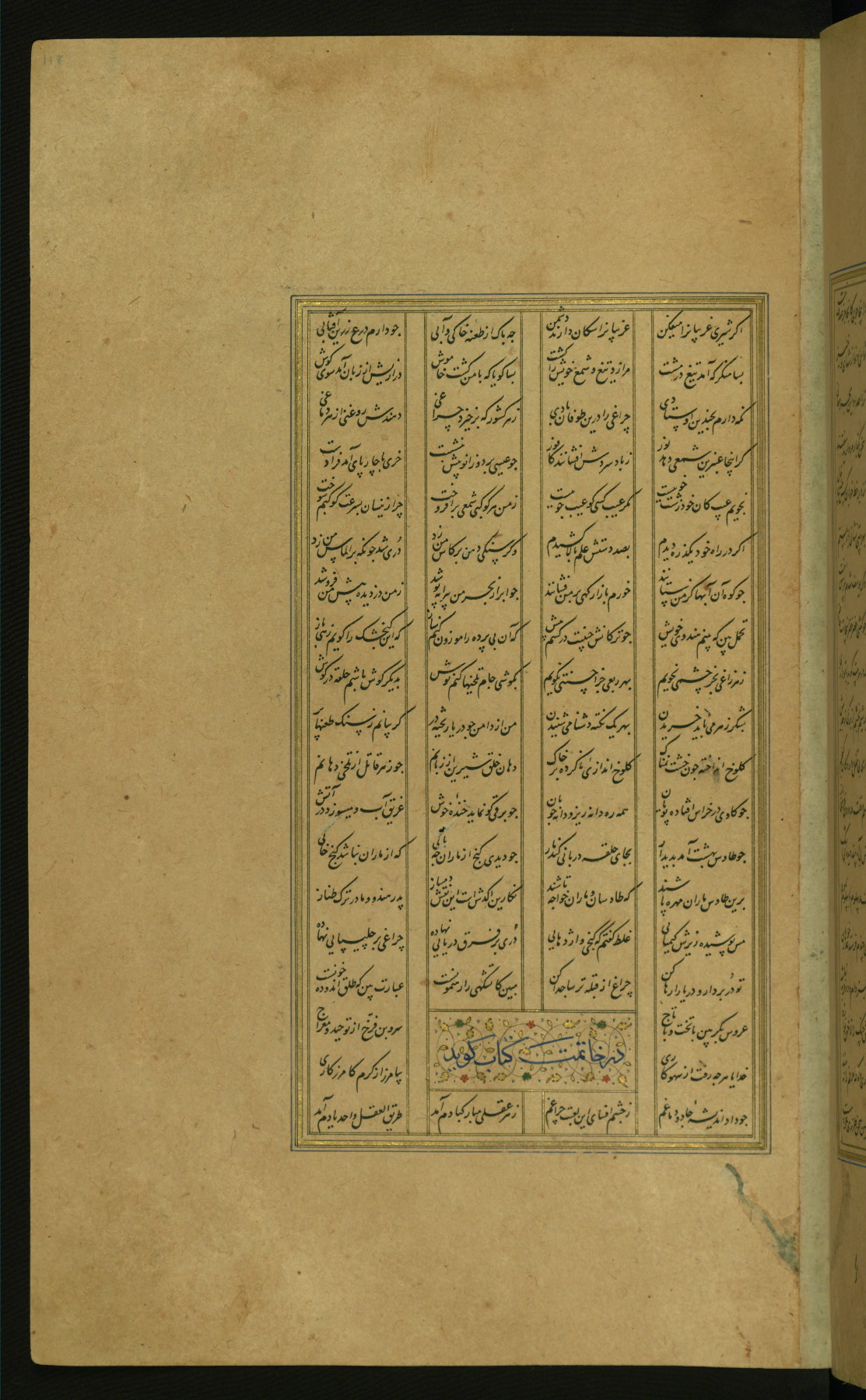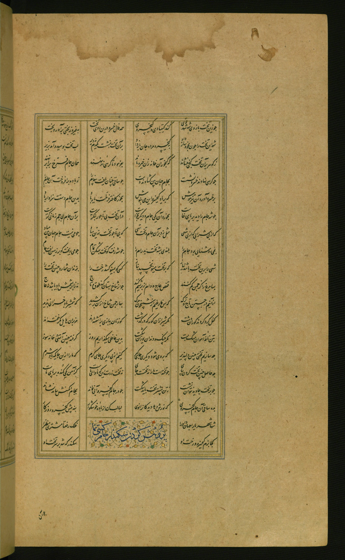 This illuminated and illustrated copy of the Khamsah (quintet) of Niẓāmī Ganjavī (d. 605 AH / 1209 CE) was written by Yār Muḥammad al-Haravī in 922 AH / 1516 CE. Written in four columns in black nastaʿlīq script, this manuscript opens with a double-page illuminated frontispiece signed by ʿAbd al-Wahhāb ibn ʿAbd al-Fattāḥ ibn ʿAlī. It contains thirty-five illustrations that were repainted in India during the twelfth century AH / eighteenth CE. The seal of Muḥammad Asharf ibn Muḥammad Khātam al-Ḥusaynī, dated 1173 AH / 1759-60 CE appears on fols. 1a and 401a. It is possible that the brown leather binding with center and side panels brushed with gold is original to the manuscript but was repaired at a later stage in the codex's history.