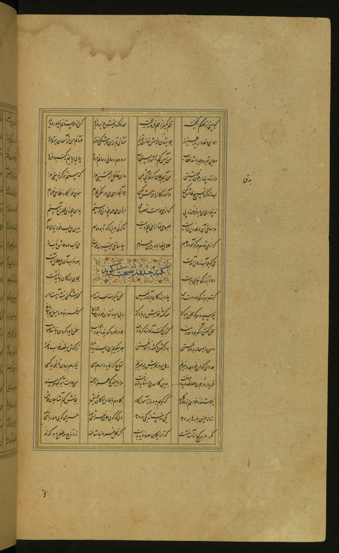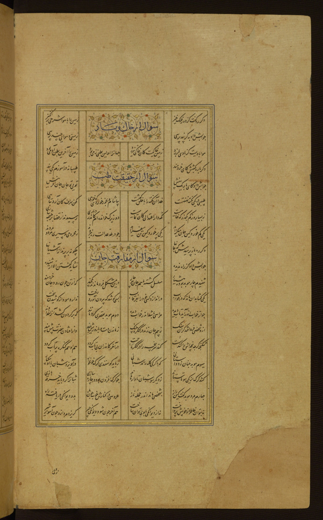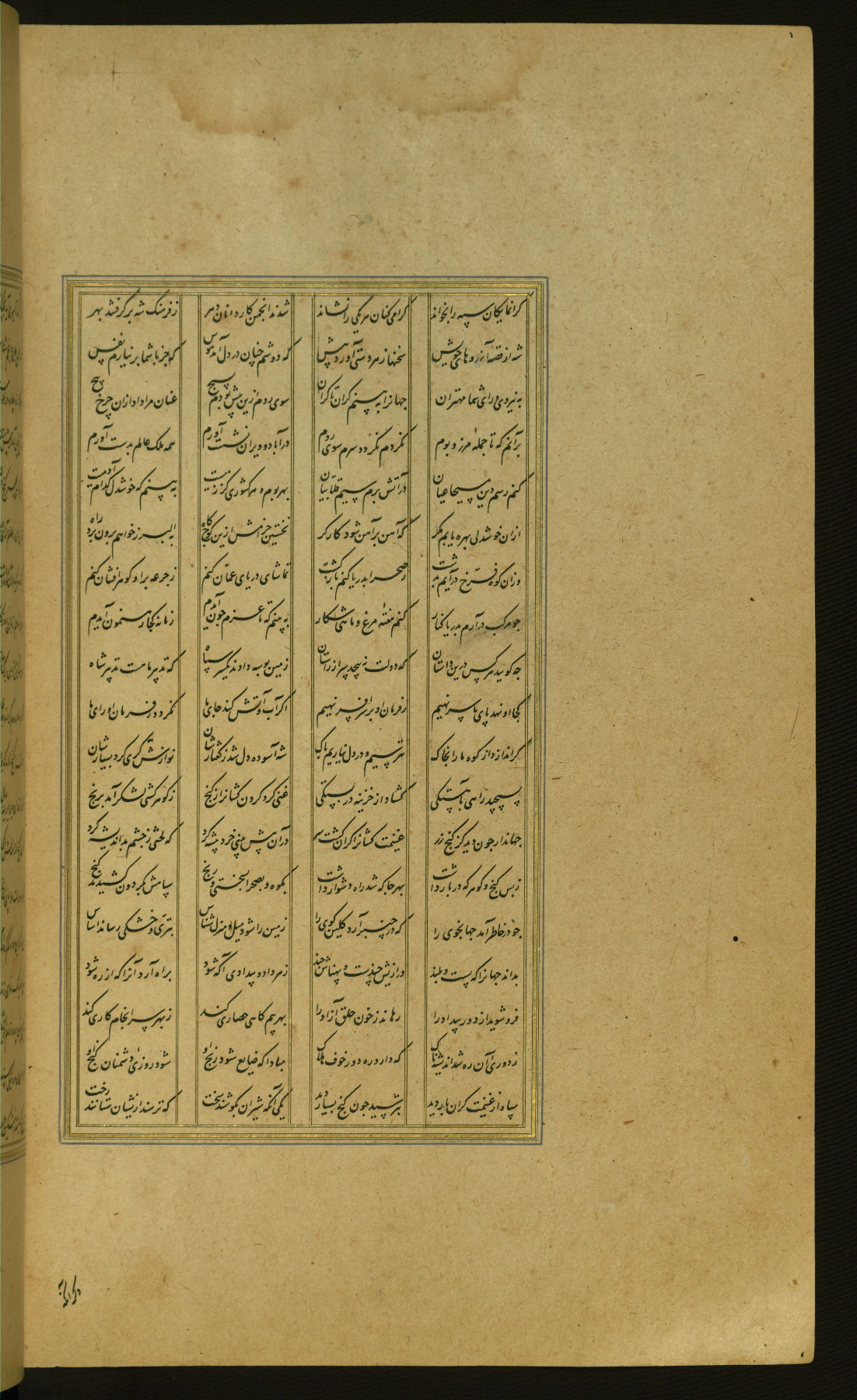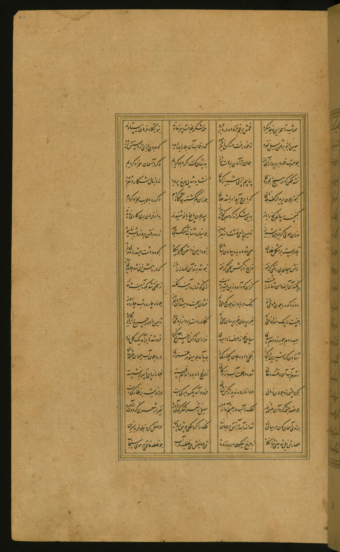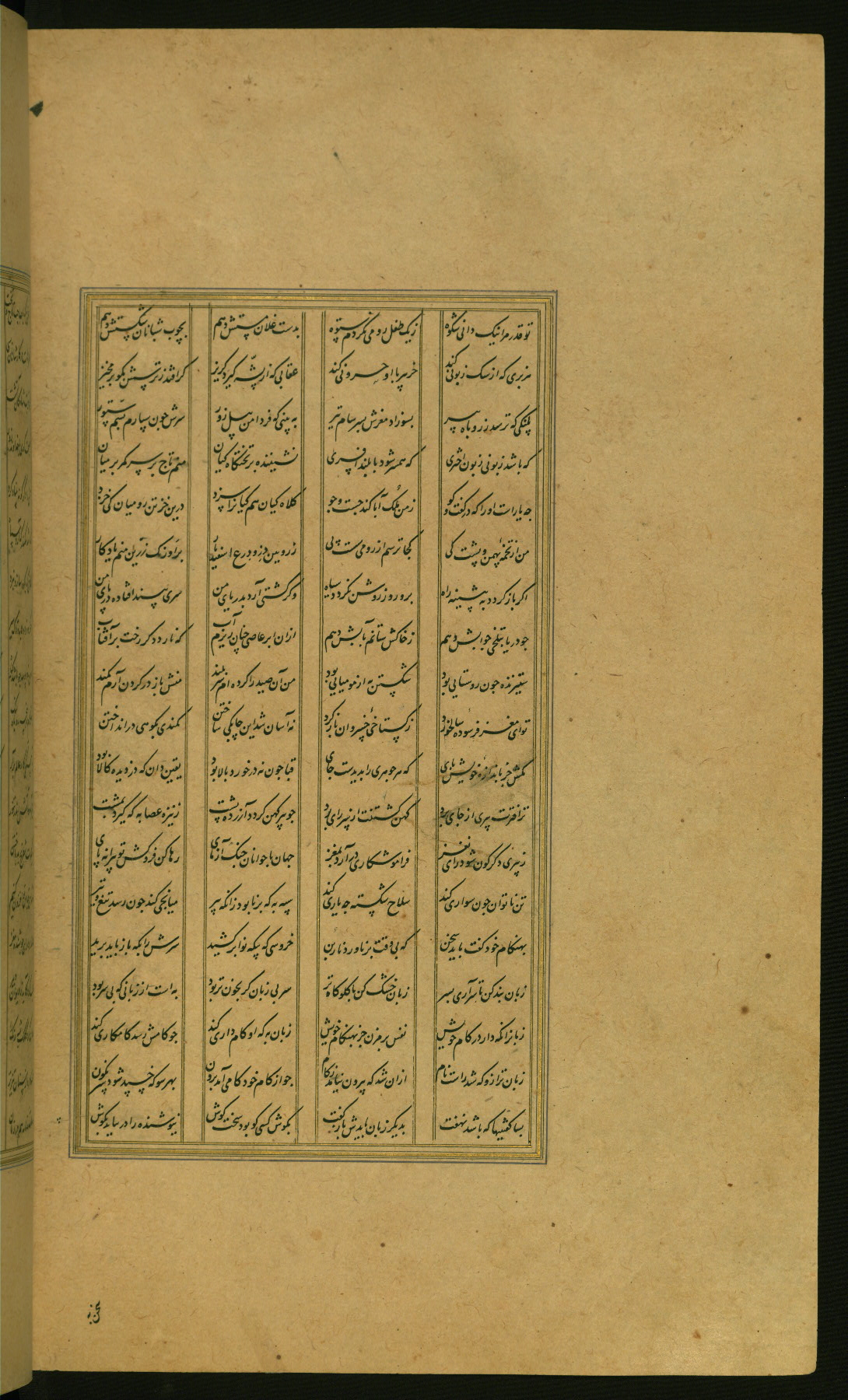 This illuminated and illustrated copy of the Khamsah (quintet) of Niẓāmī Ganjavī (d. 605 AH / 1209 CE) was written by Yār Muḥammad al-Haravī in 922 AH / 1516 CE. Written in four columns in black nastaʿlīq script, this manuscript opens with a double-page illuminated frontispiece signed by ʿAbd al-Wahhāb ibn ʿAbd al-Fattāḥ ibn ʿAlī. It contains thirty-five illustrations that were repainted in India during the twelfth century AH / eighteenth CE. The seal of Muḥammad Asharf ibn Muḥammad Khātam al-Ḥusaynī, dated 1173 AH / 1759-60 CE appears on fols. 1a and 401a. It is possible that the brown leather binding with center and side panels brushed with gold is original to the manuscript but was repaired at a later stage in the codex's history.