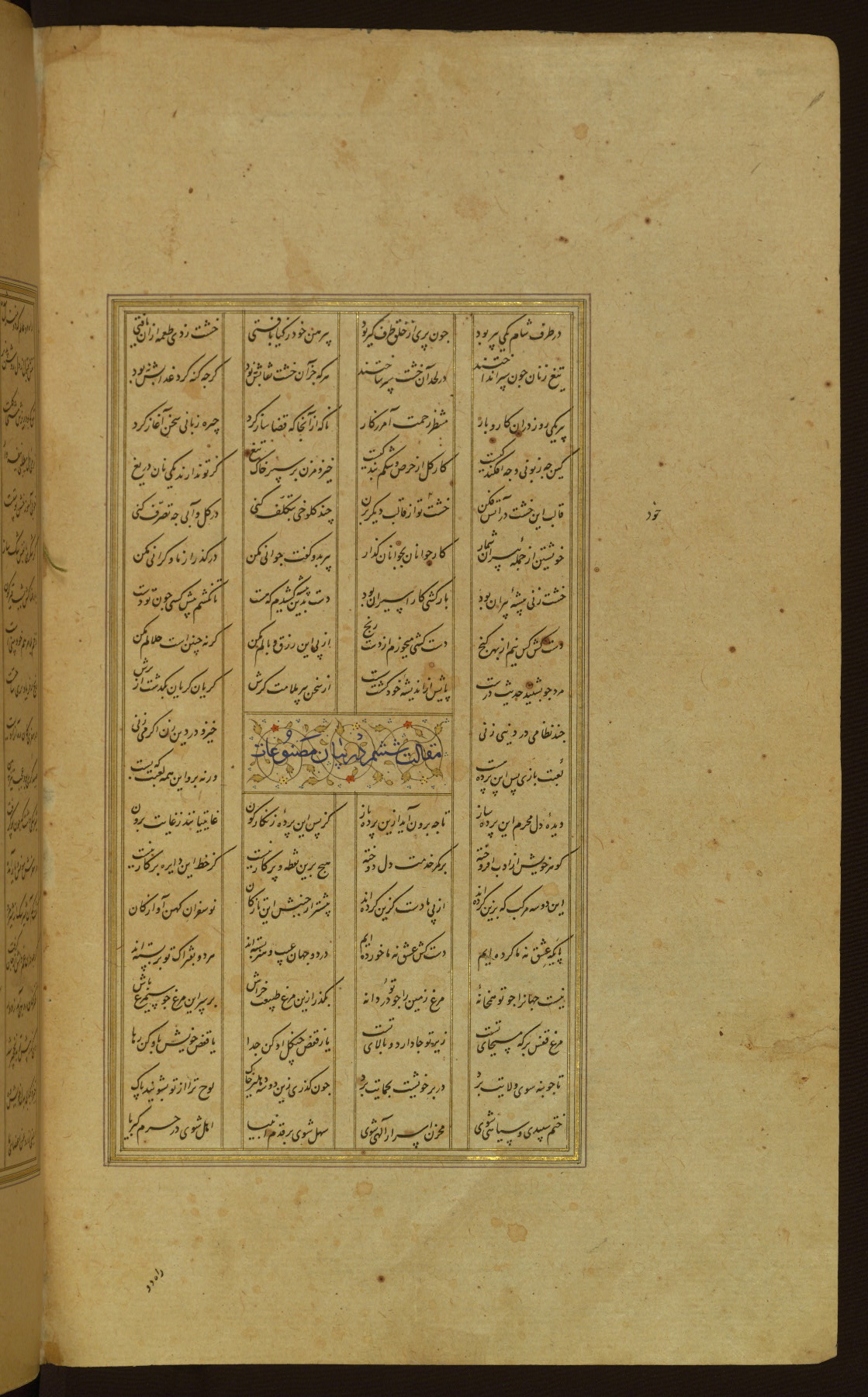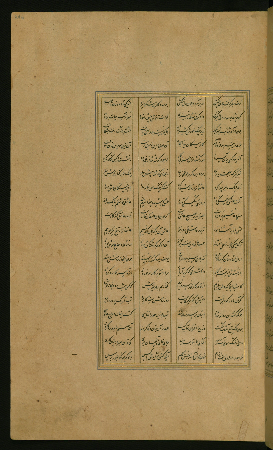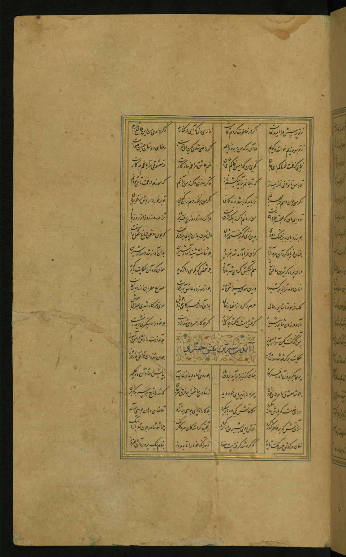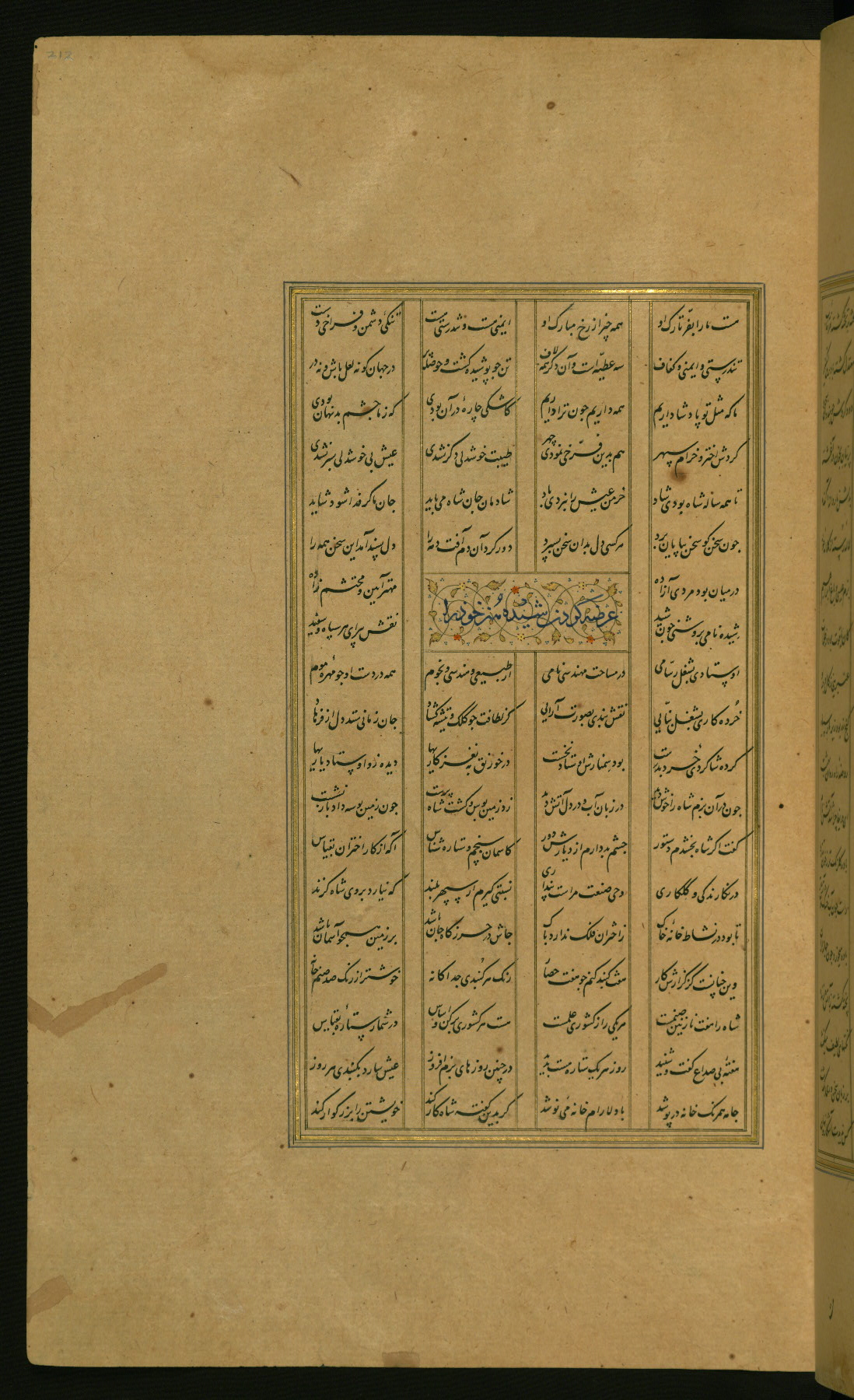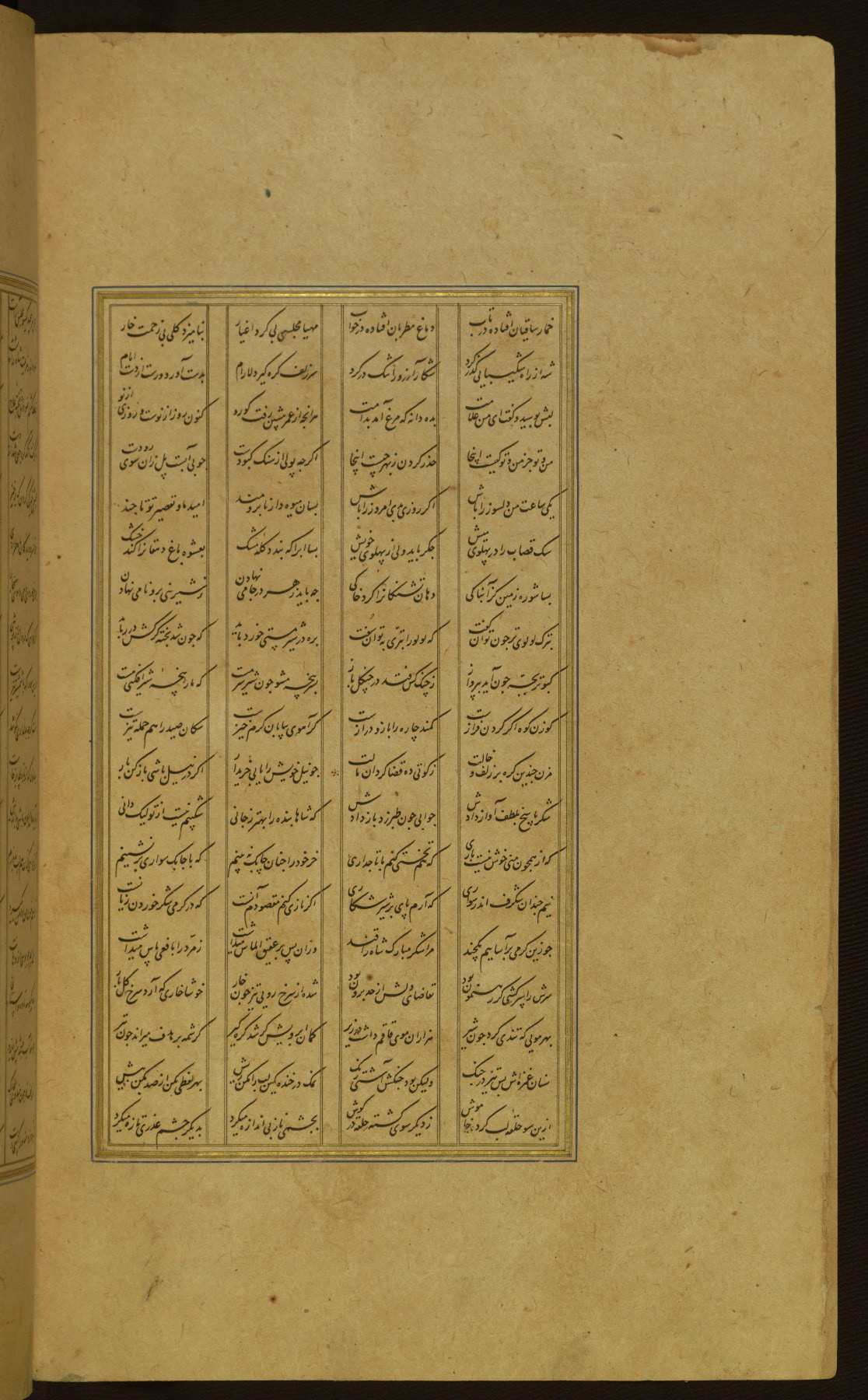 This illuminated and illustrated copy of the Khamsah (quintet) of Niẓāmī Ganjavī (d. 605 AH / 1209 CE) was written by Yār Muḥammad al-Haravī in 922 AH / 1516 CE. Written in four columns in black nastaʿlīq script, this manuscript opens with a double-page illuminated frontispiece signed by ʿAbd al-Wahhāb ibn ʿAbd al-Fattāḥ ibn ʿAlī. It contains thirty-five illustrations that were repainted in India during the twelfth century AH / eighteenth CE. The seal of Muḥammad Asharf ibn Muḥammad Khātam al-Ḥusaynī, dated 1173 AH / 1759-60 CE appears on fols. 1a and 401a. It is possible that the brown leather binding with center and side panels brushed with gold is original to the manuscript but was repaired at a later stage in the codex's history.