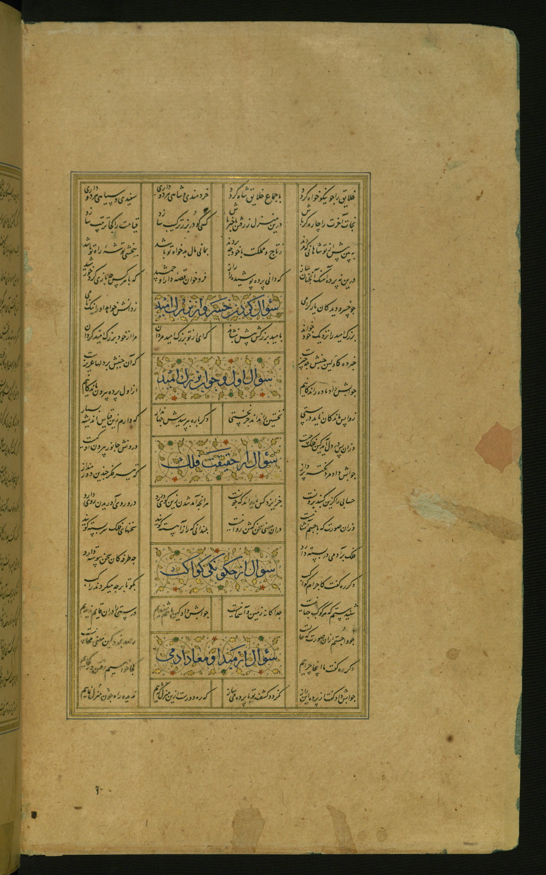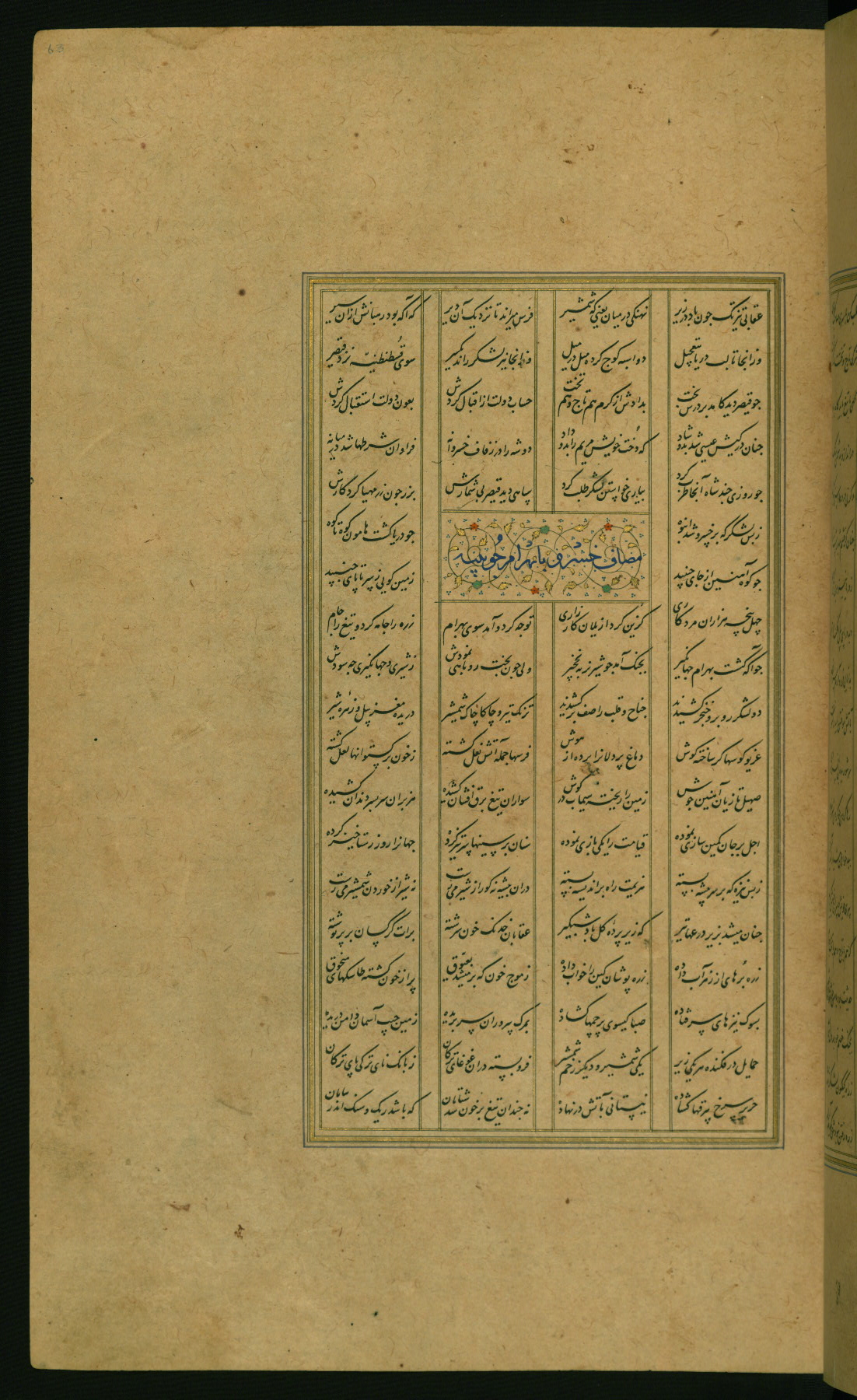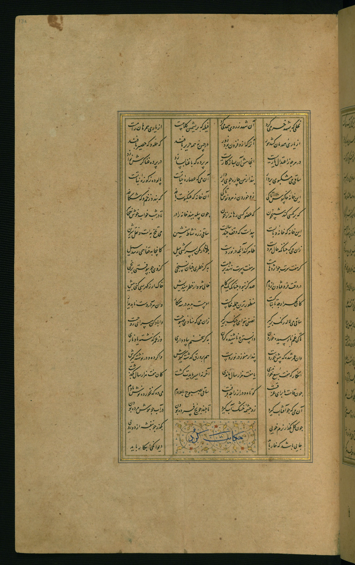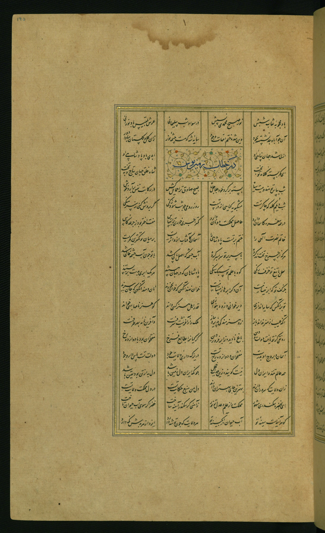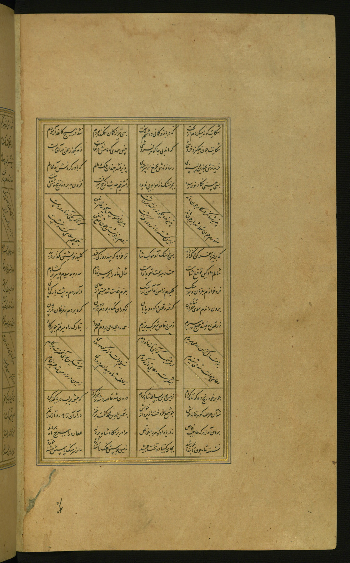 This illuminated and illustrated copy of the Khamsah (quintet) of Niẓāmī Ganjavī (d. 605 AH / 1209 CE) was written by Yār Muḥammad al-Haravī in 922 AH / 1516 CE. Written in four columns in black nastaʿlīq script, this manuscript opens with a double-page illuminated frontispiece signed by ʿAbd al-Wahhāb ibn ʿAbd al-Fattāḥ ibn ʿAlī. It contains thirty-five illustrations that were repainted in India during the twelfth century AH / eighteenth CE. The seal of Muḥammad Asharf ibn Muḥammad Khātam al-Ḥusaynī, dated 1173 AH / 1759-60 CE appears on fols. 1a and 401a. It is possible that the brown leather binding with center and side panels brushed with gold is original to the manuscript but was repaired at a later stage in the codex's history.