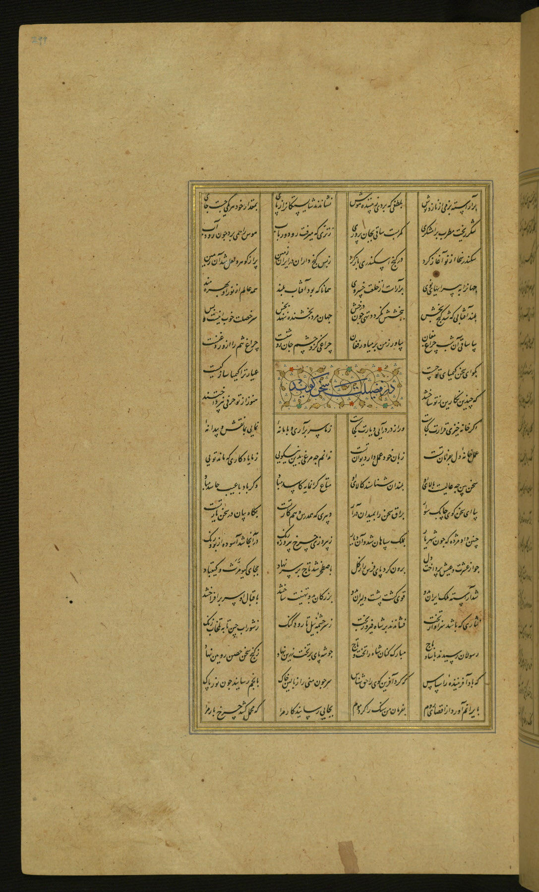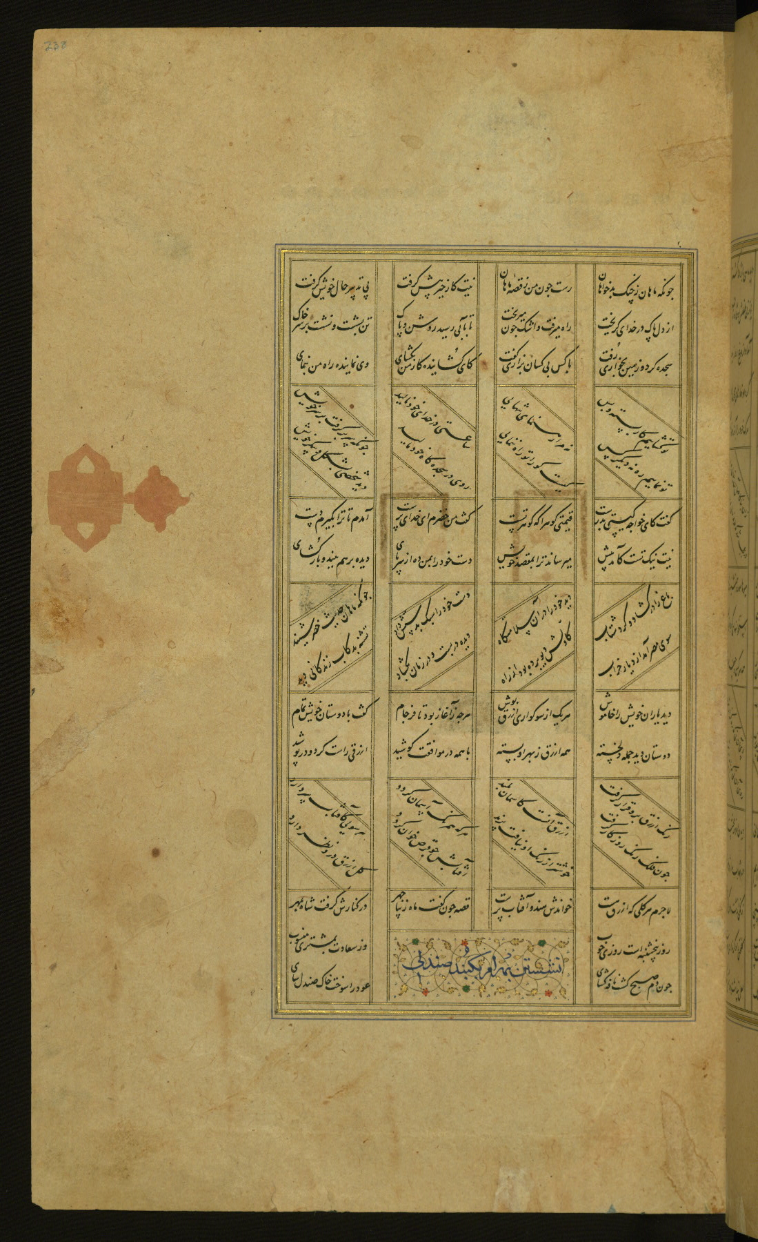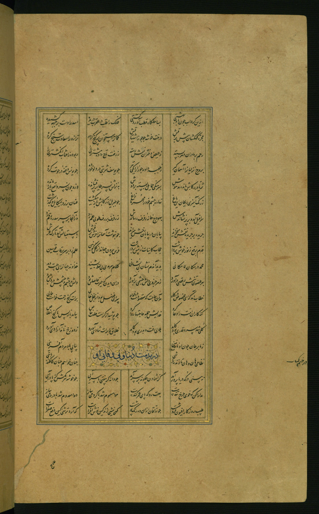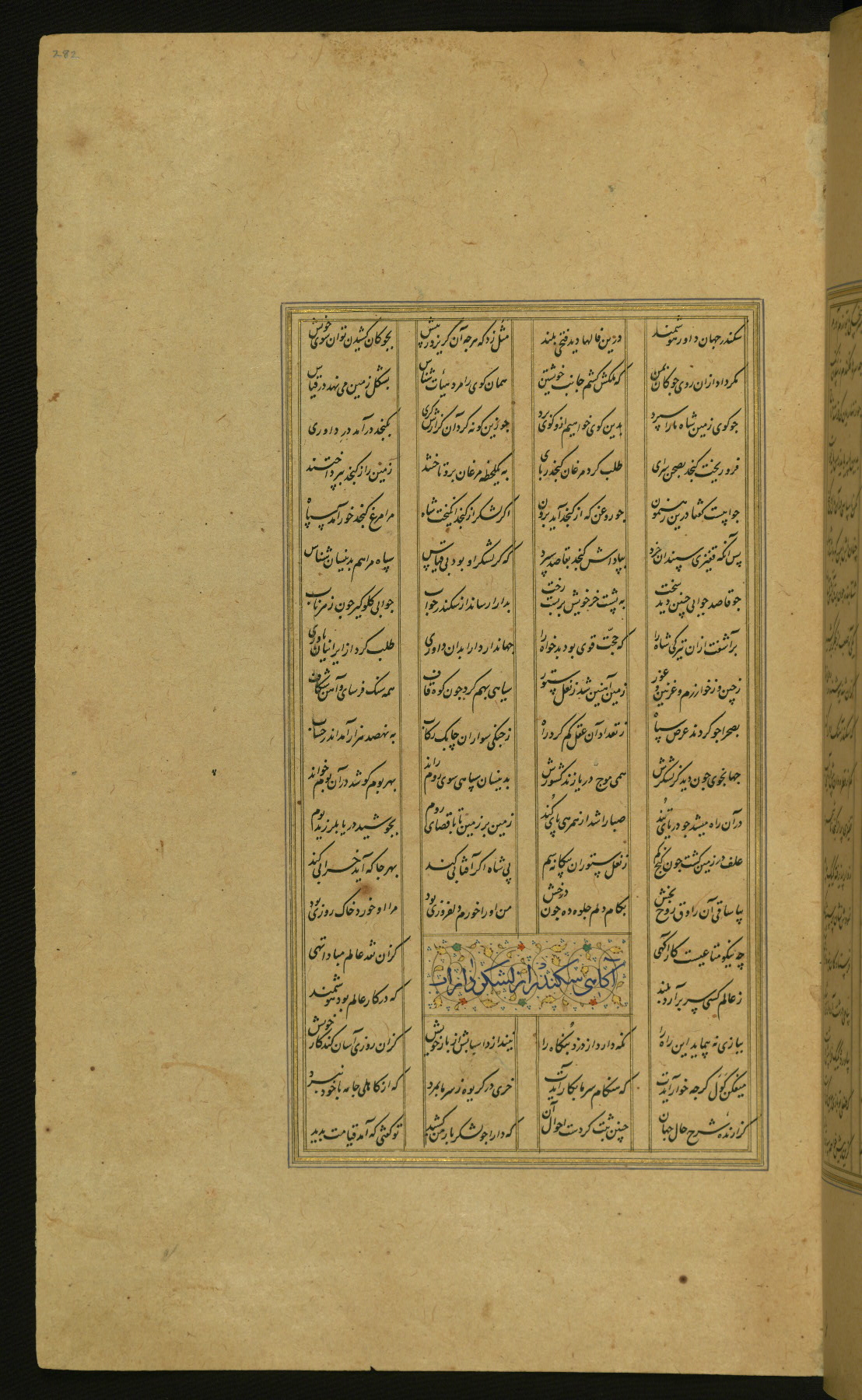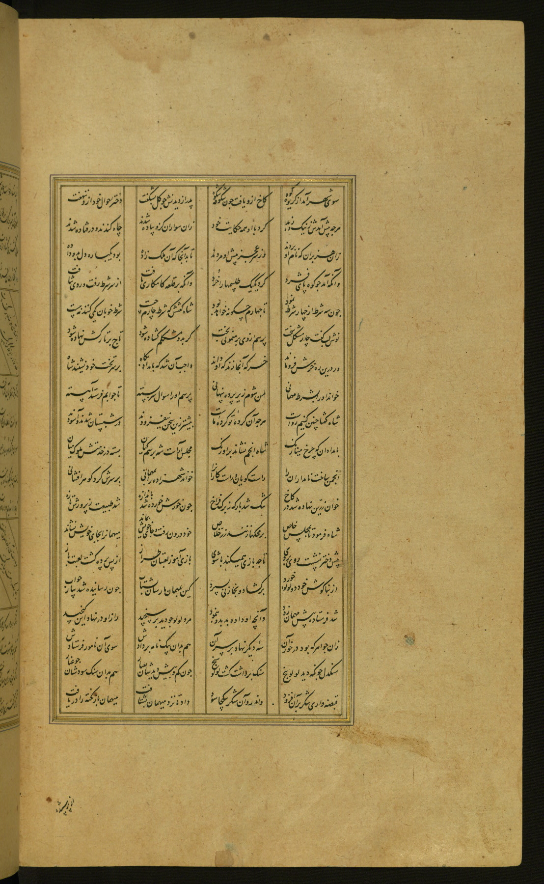 This illuminated and illustrated copy of the Khamsah (quintet) of Niẓāmī Ganjavī (d. 605 AH / 1209 CE) was written by Yār Muḥammad al-Haravī in 922 AH / 1516 CE. Written in four columns in black nastaʿlīq script, this manuscript opens with a double-page illuminated frontispiece signed by ʿAbd al-Wahhāb ibn ʿAbd al-Fattāḥ ibn ʿAlī. It contains thirty-five illustrations that were repainted in India during the twelfth century AH / eighteenth CE. The seal of Muḥammad Asharf ibn Muḥammad Khātam al-Ḥusaynī, dated 1173 AH / 1759-60 CE appears on fols. 1a and 401a. It is possible that the brown leather binding with center and side panels brushed with gold is original to the manuscript but was repaired at a later stage in the codex's history.
