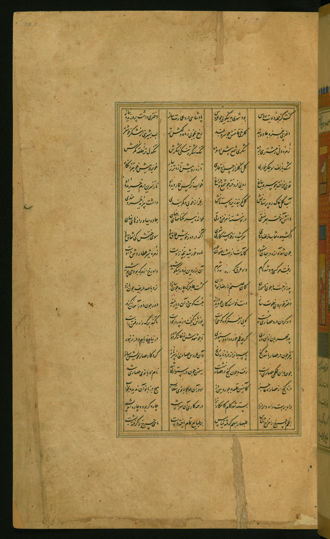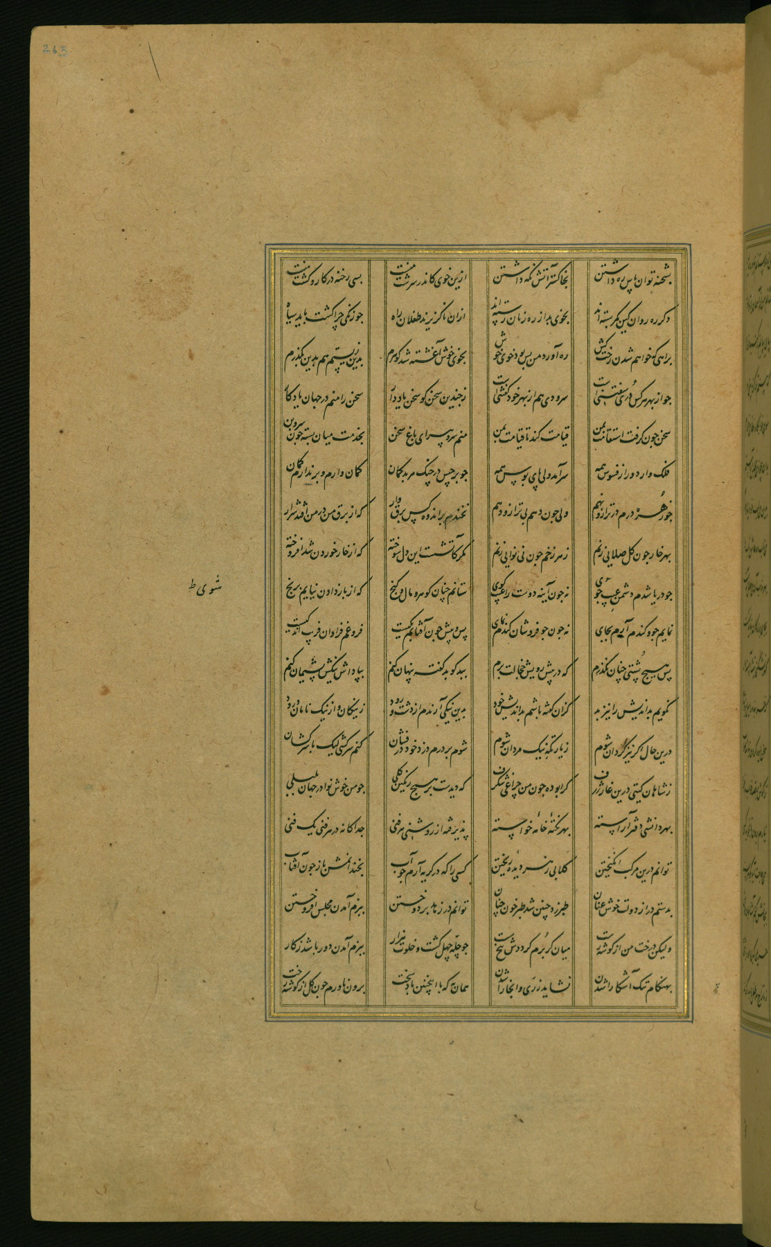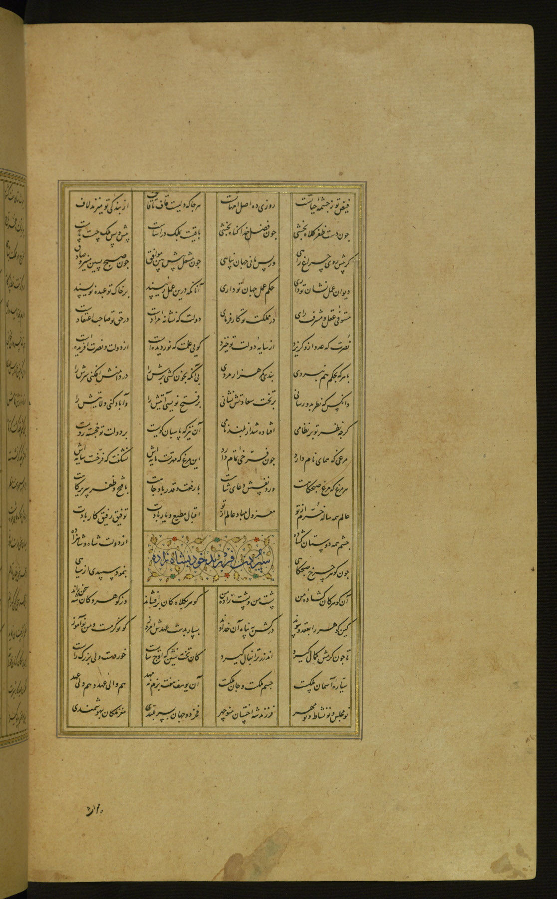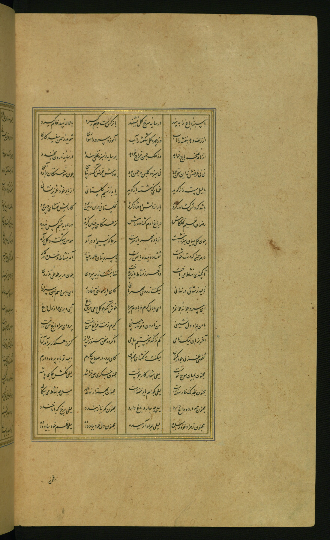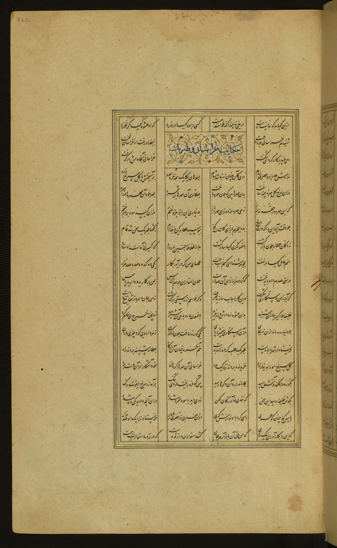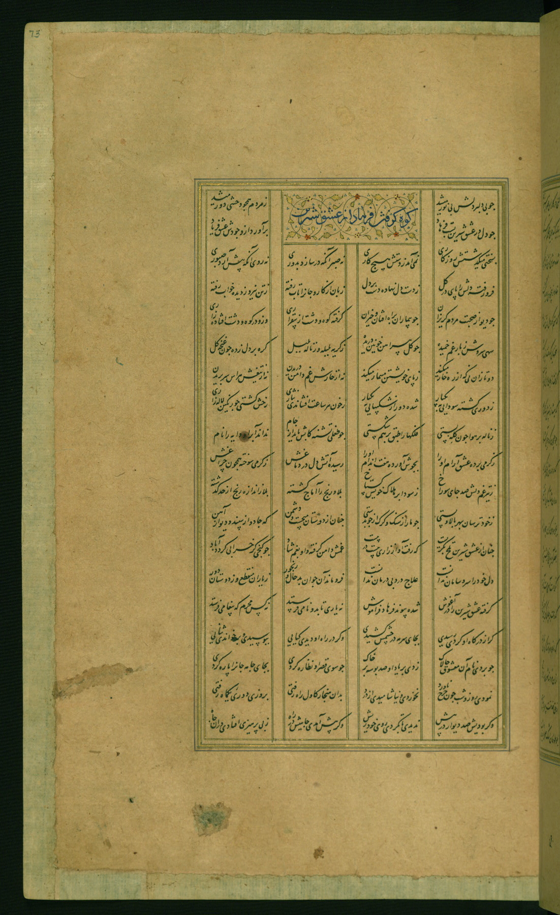 This illuminated and illustrated copy of the Khamsah (quintet) of Niẓāmī Ganjavī (d. 605 AH / 1209 CE) was written by Yār Muḥammad al-Haravī in 922 AH / 1516 CE. Written in four columns in black nastaʿlīq script, this manuscript opens with a double-page illuminated frontispiece signed by ʿAbd al-Wahhāb ibn ʿAbd al-Fattāḥ ibn ʿAlī. It contains thirty-five illustrations that were repainted in India during the twelfth century AH / eighteenth CE. The seal of Muḥammad Asharf ibn Muḥammad Khātam al-Ḥusaynī, dated 1173 AH / 1759-60 CE appears on fols. 1a and 401a. It is possible that the brown leather binding with center and side panels brushed with gold is original to the manuscript but was repaired at a later stage in the codex's history.