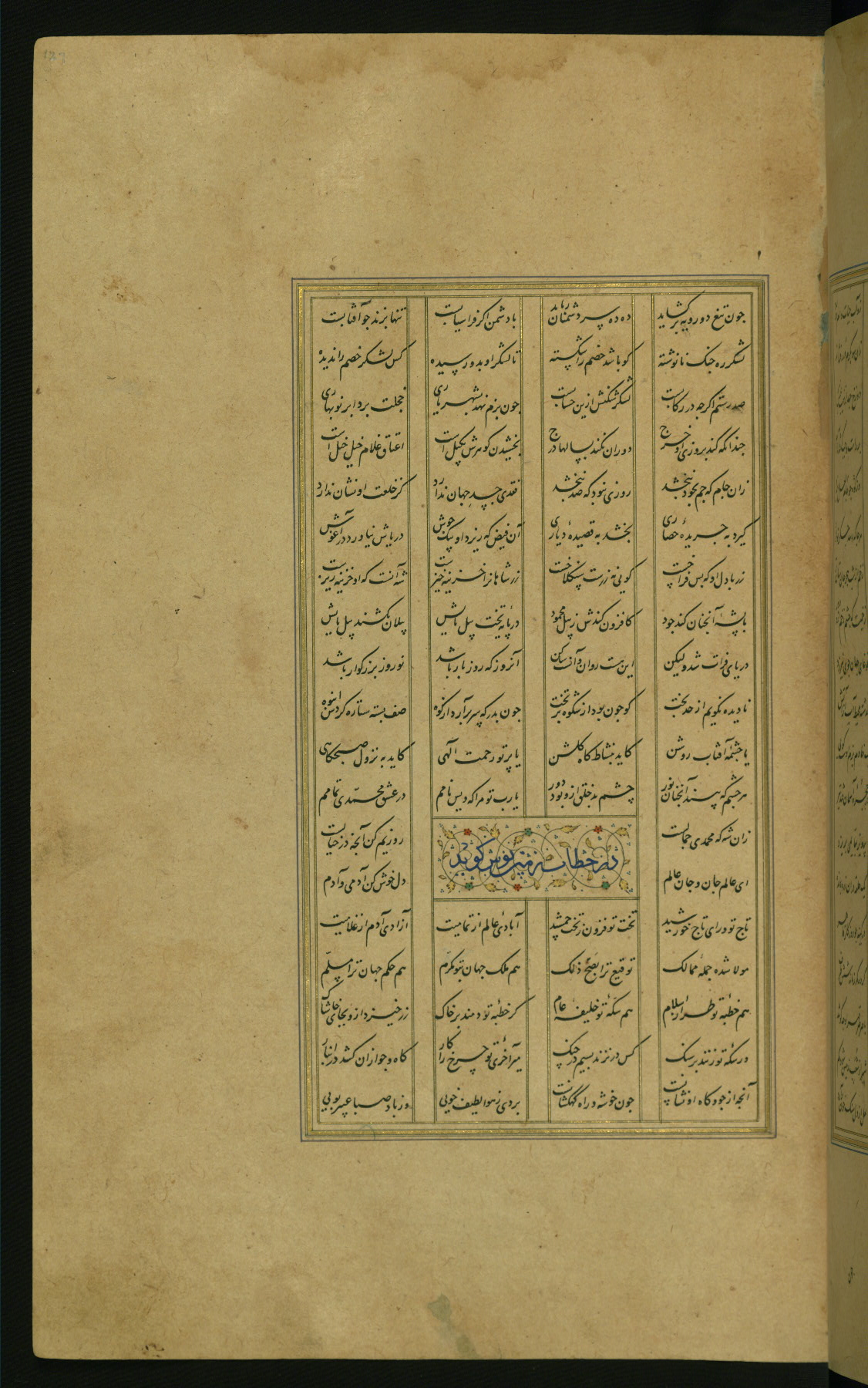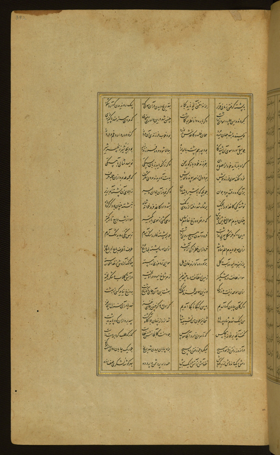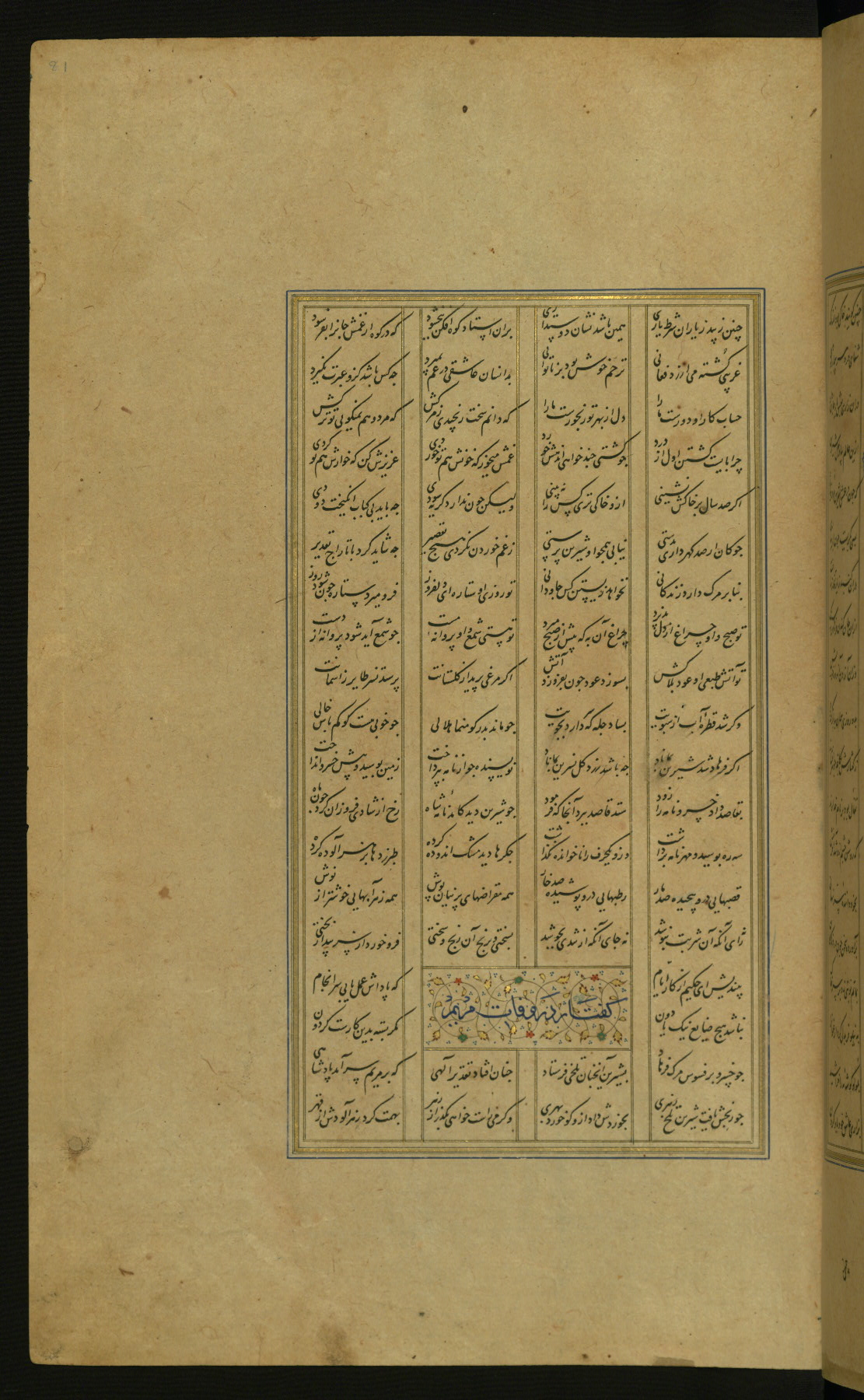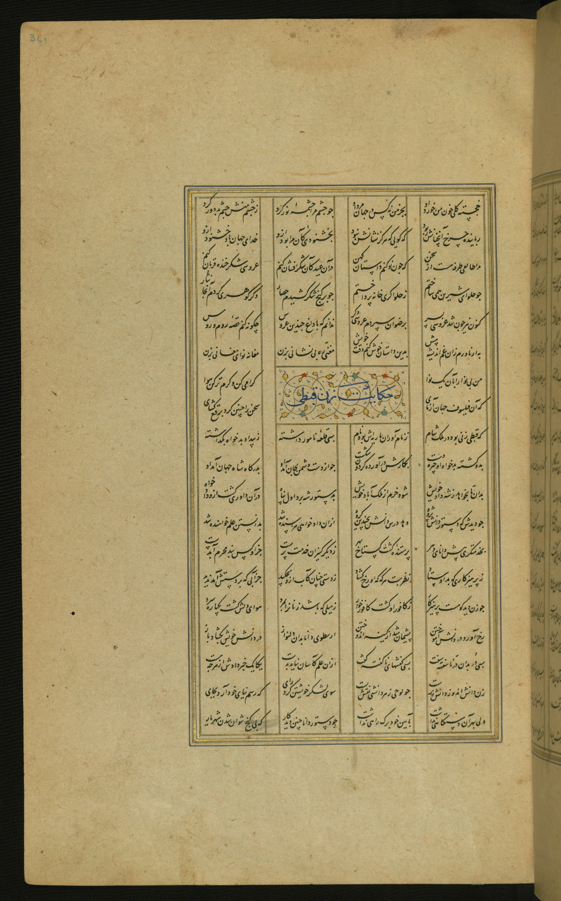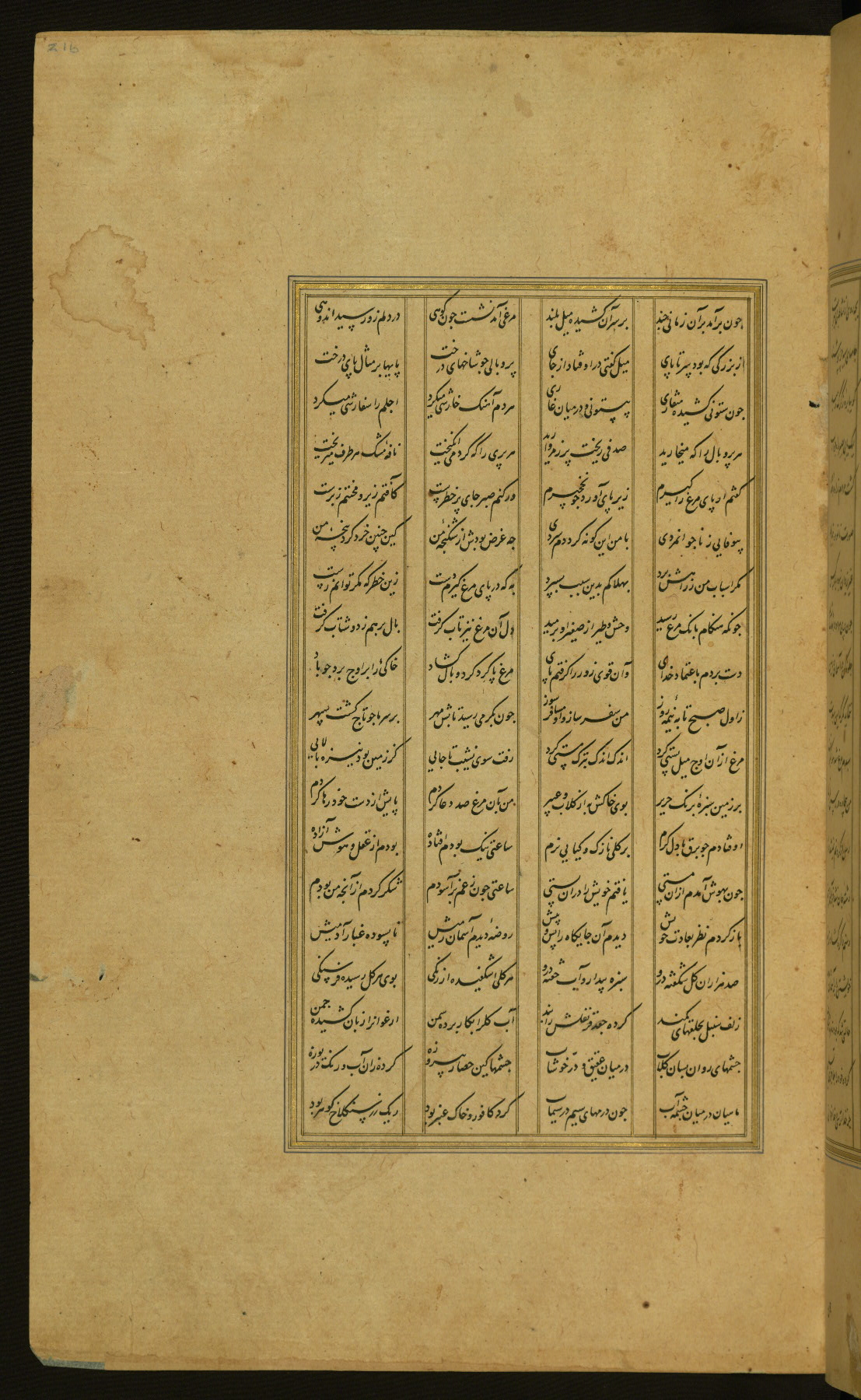 This illuminated and illustrated copy of the Khamsah (quintet) of Niẓāmī Ganjavī (d. 605 AH / 1209 CE) was written by Yār Muḥammad al-Haravī in 922 AH / 1516 CE. Written in four columns in black nastaʿlīq script, this manuscript opens with a double-page illuminated frontispiece signed by ʿAbd al-Wahhāb ibn ʿAbd al-Fattāḥ ibn ʿAlī. It contains thirty-five illustrations that were repainted in India during the twelfth century AH / eighteenth CE. The seal of Muḥammad Asharf ibn Muḥammad Khātam al-Ḥusaynī, dated 1173 AH / 1759-60 CE appears on fols. 1a and 401a. It is possible that the brown leather binding with center and side panels brushed with gold is original to the manuscript but was repaired at a later stage in the codex's history.