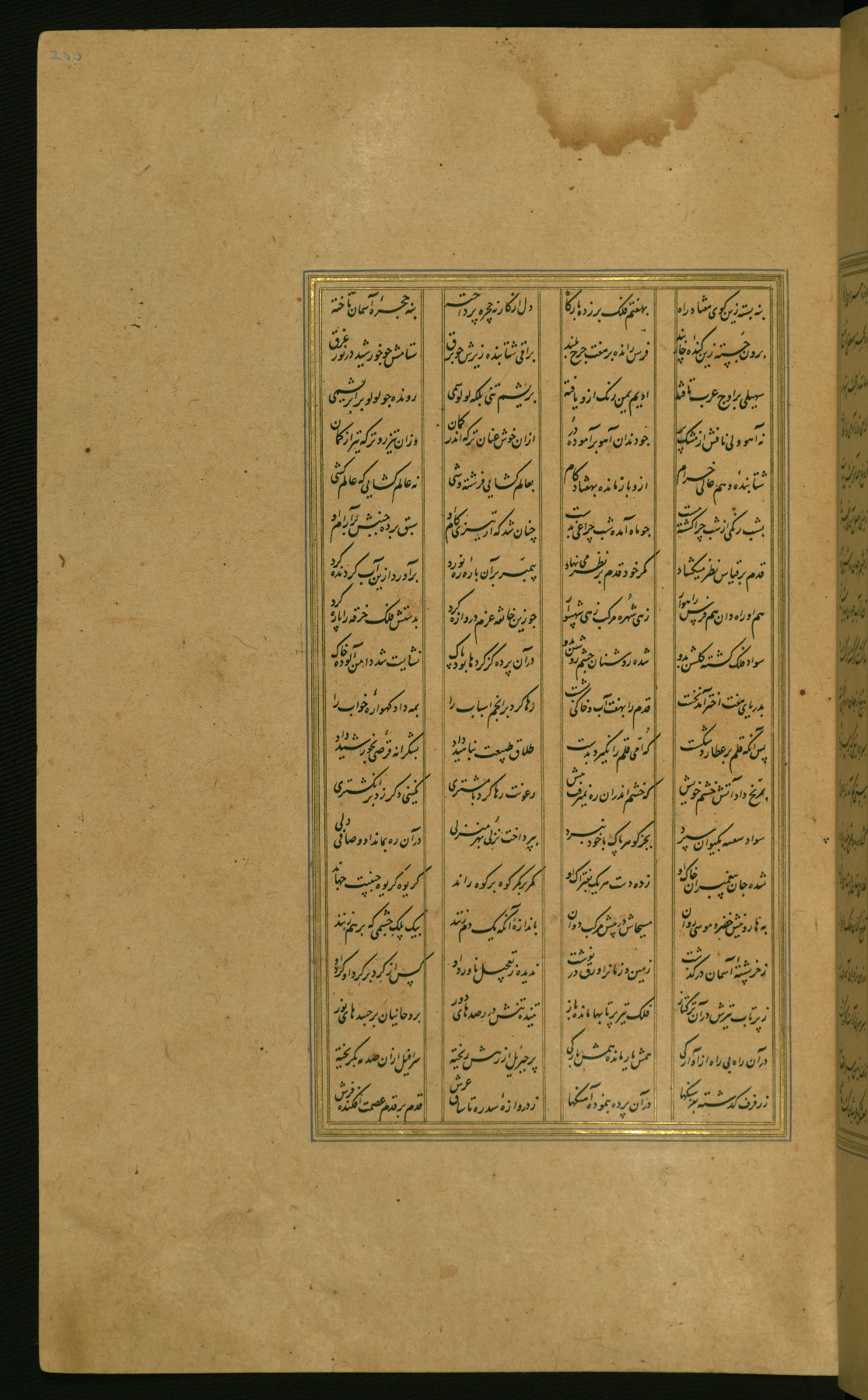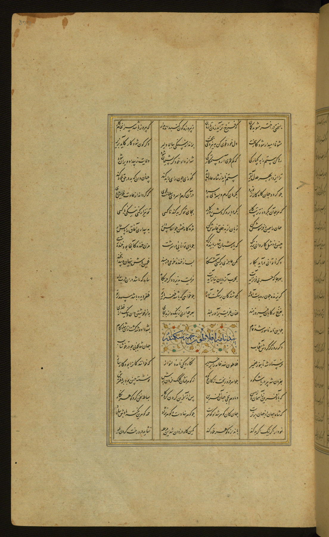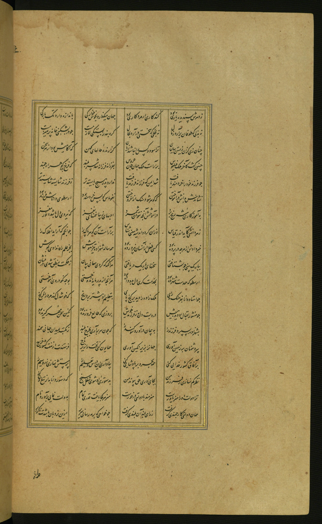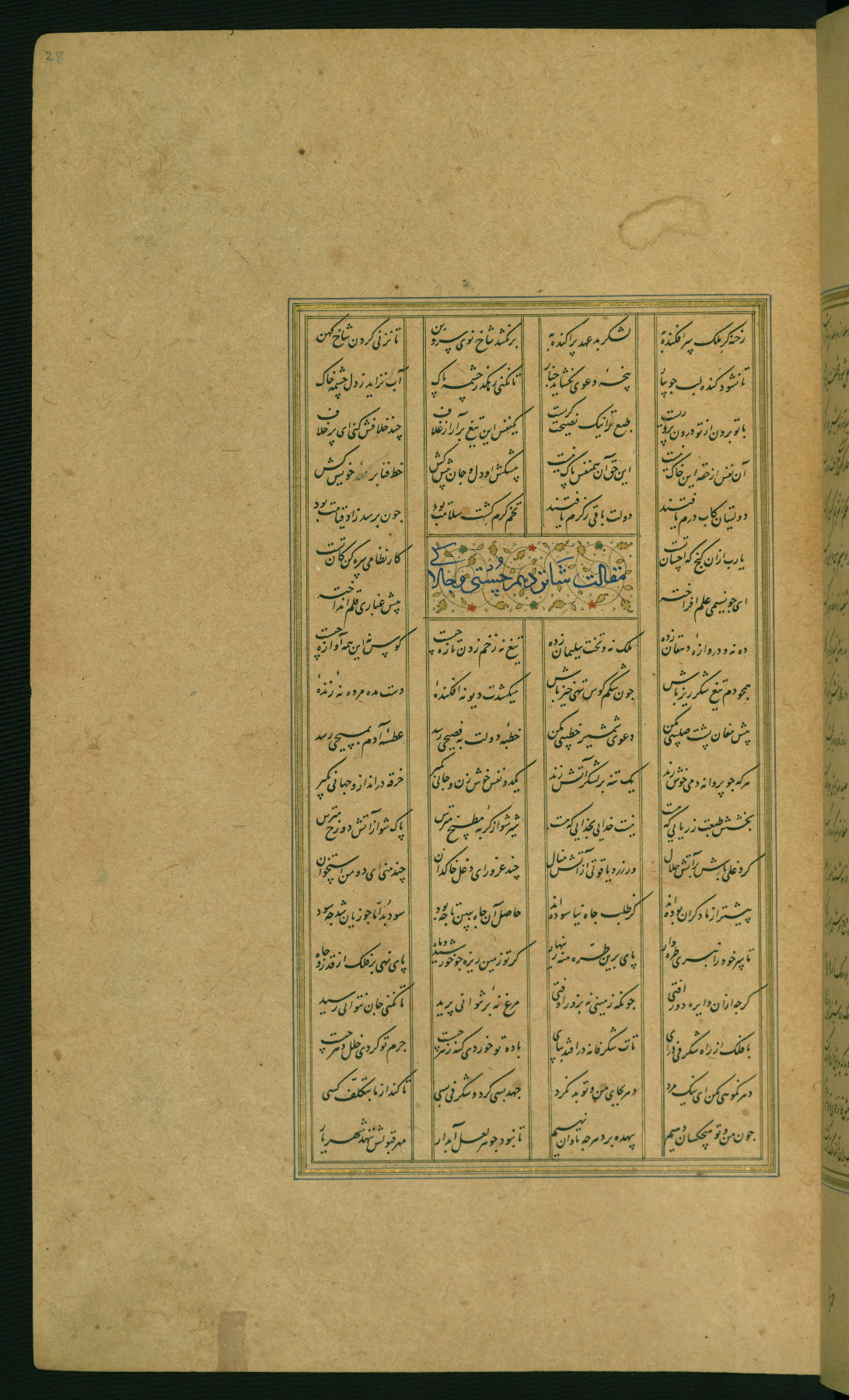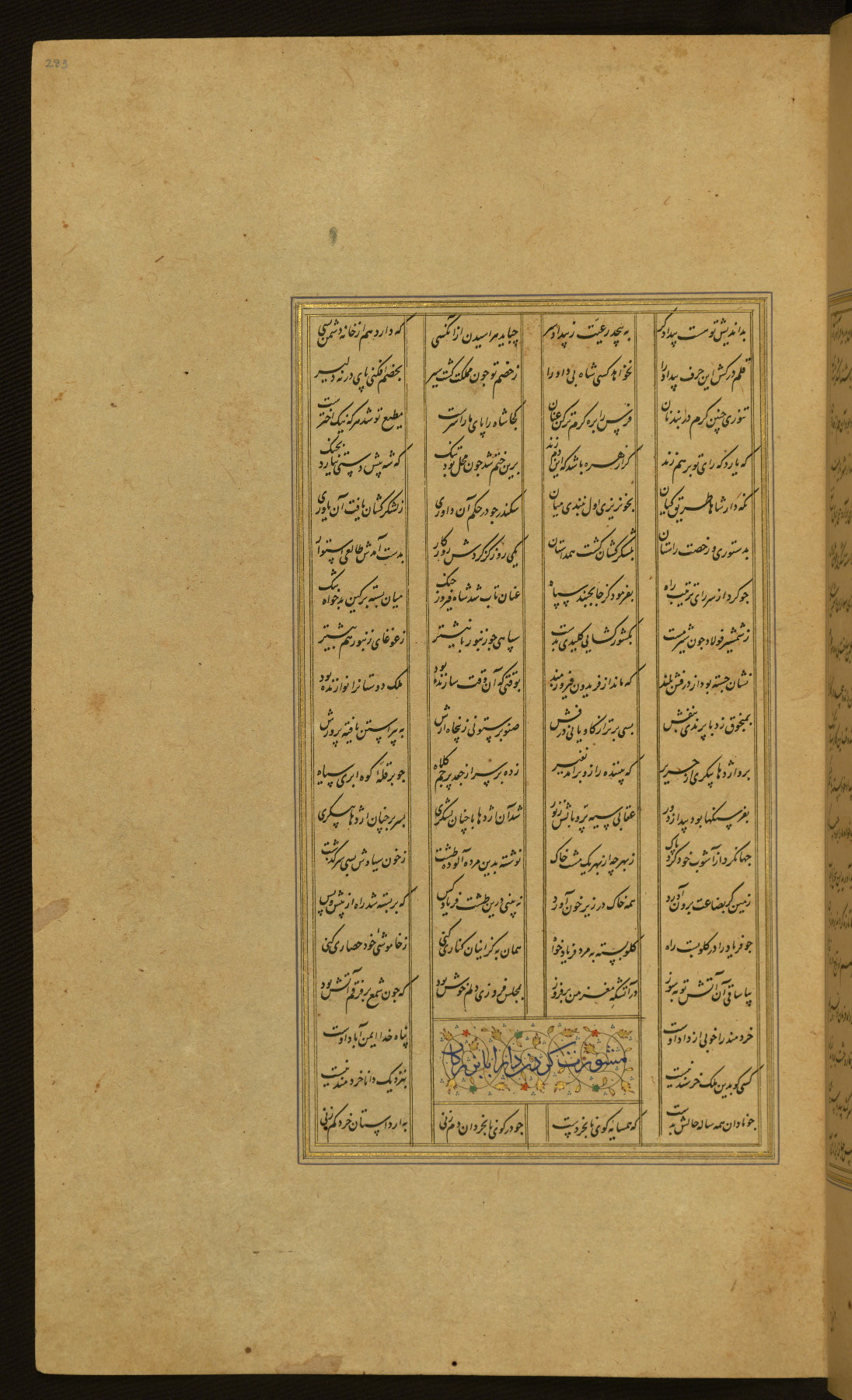 This illuminated and illustrated copy of the Khamsah (quintet) of Niẓāmī Ganjavī (d. 605 AH / 1209 CE) was written by Yār Muḥammad al-Haravī in 922 AH / 1516 CE. Written in four columns in black nastaʿlīq script, this manuscript opens with a double-page illuminated frontispiece signed by ʿAbd al-Wahhāb ibn ʿAbd al-Fattāḥ ibn ʿAlī. It contains thirty-five illustrations that were repainted in India during the twelfth century AH / eighteenth CE. The seal of Muḥammad Asharf ibn Muḥammad Khātam al-Ḥusaynī, dated 1173 AH / 1759-60 CE appears on fols. 1a and 401a. It is possible that the brown leather binding with center and side panels brushed with gold is original to the manuscript but was repaired at a later stage in the codex's history.