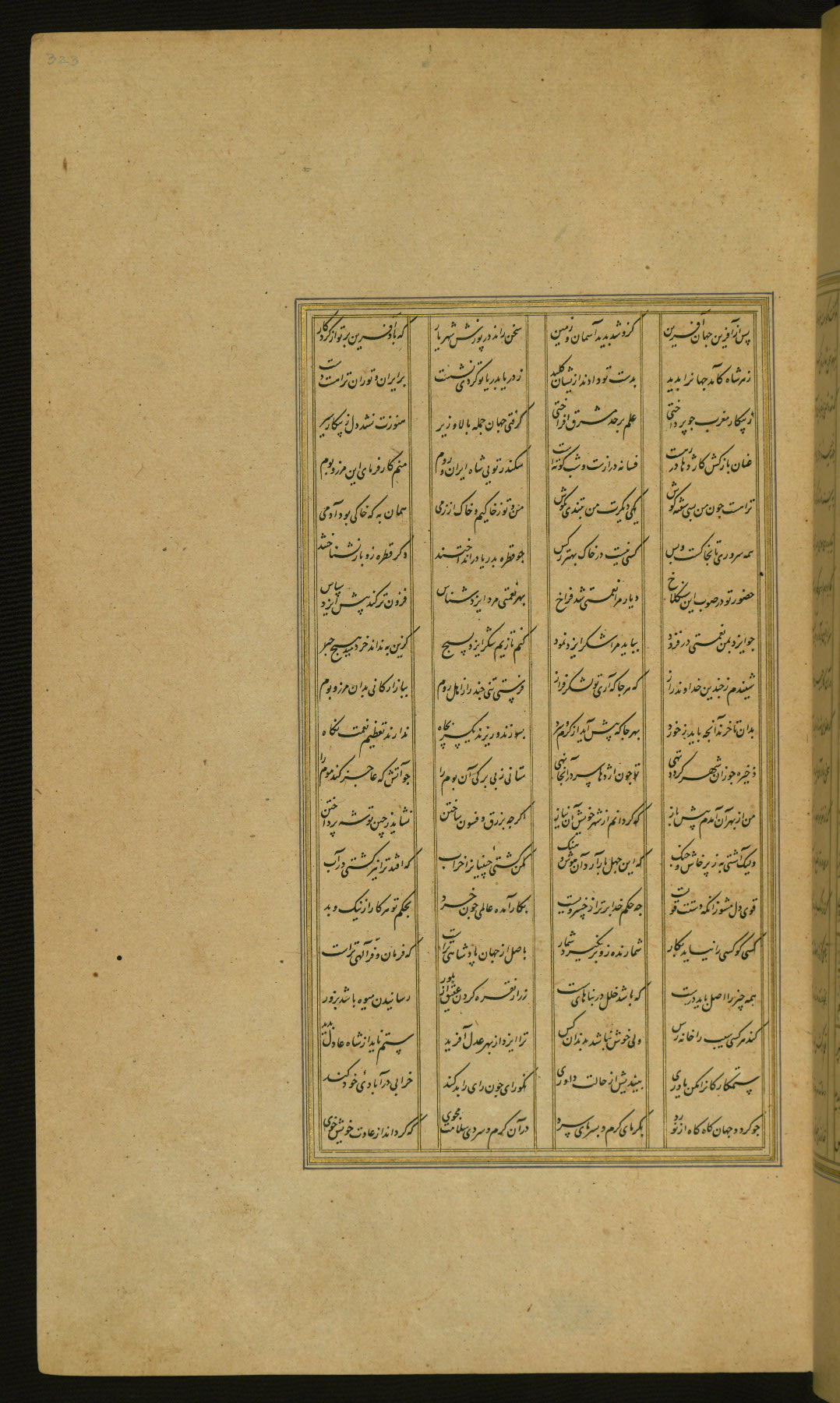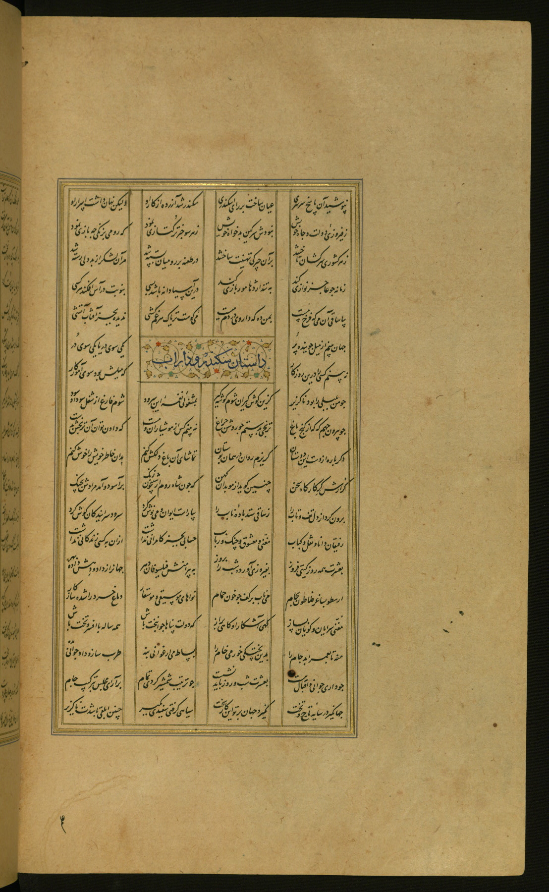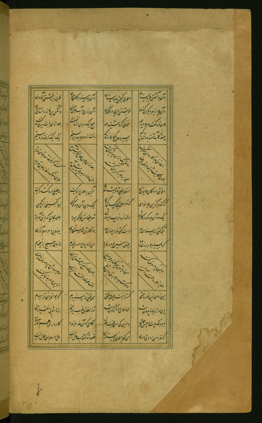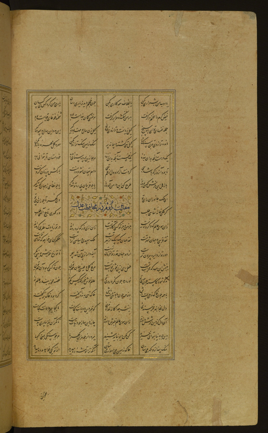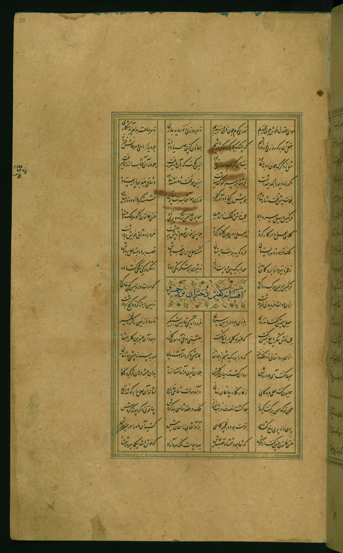 This illuminated and illustrated copy of the Khamsah (quintet) of Niẓāmī Ganjavī (d. 605 AH / 1209 CE) was written by Yār Muḥammad al-Haravī in 922 AH / 1516 CE. Written in four columns in black nastaʿlīq script, this manuscript opens with a double-page illuminated frontispiece signed by ʿAbd al-Wahhāb ibn ʿAbd al-Fattāḥ ibn ʿAlī. It contains thirty-five illustrations that were repainted in India during the twelfth century AH / eighteenth CE. The seal of Muḥammad Asharf ibn Muḥammad Khātam al-Ḥusaynī, dated 1173 AH / 1759-60 CE appears on fols. 1a and 401a. It is possible that the brown leather binding with center and side panels brushed with gold is original to the manuscript but was repaired at a later stage in the codex's history.