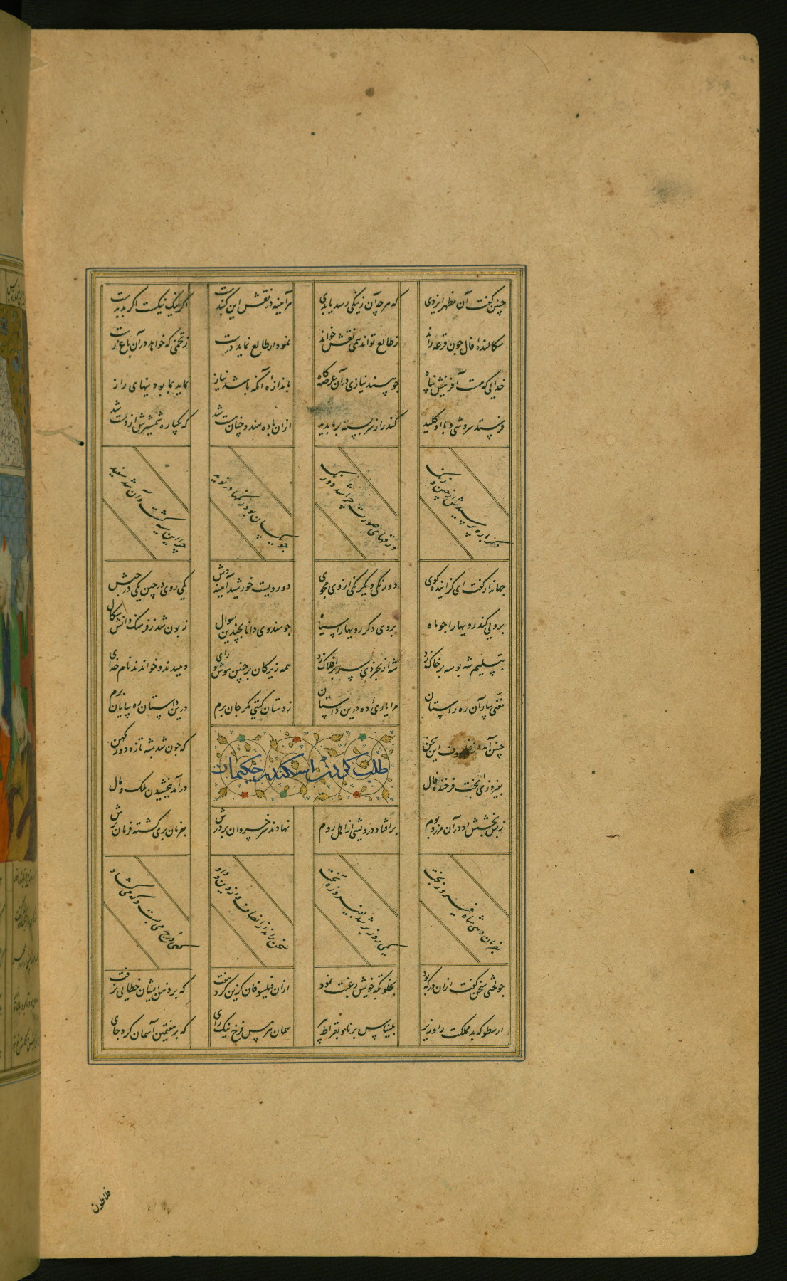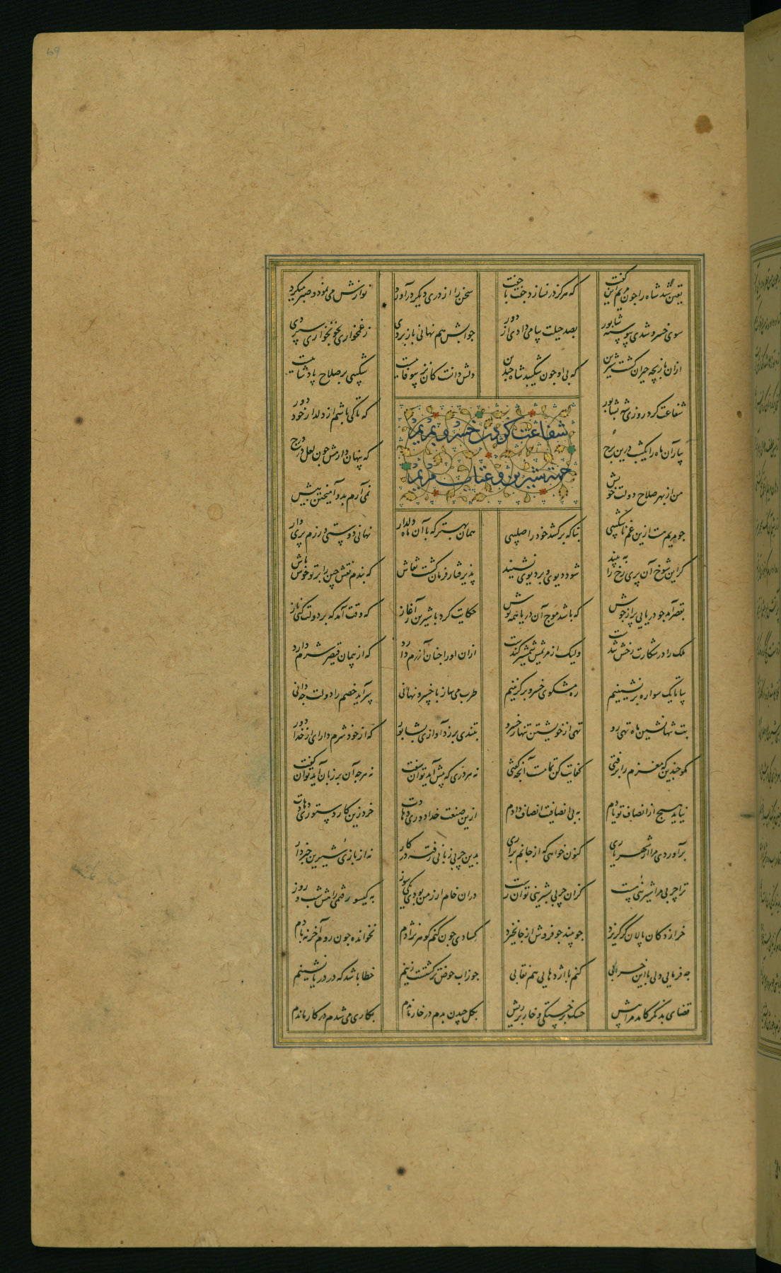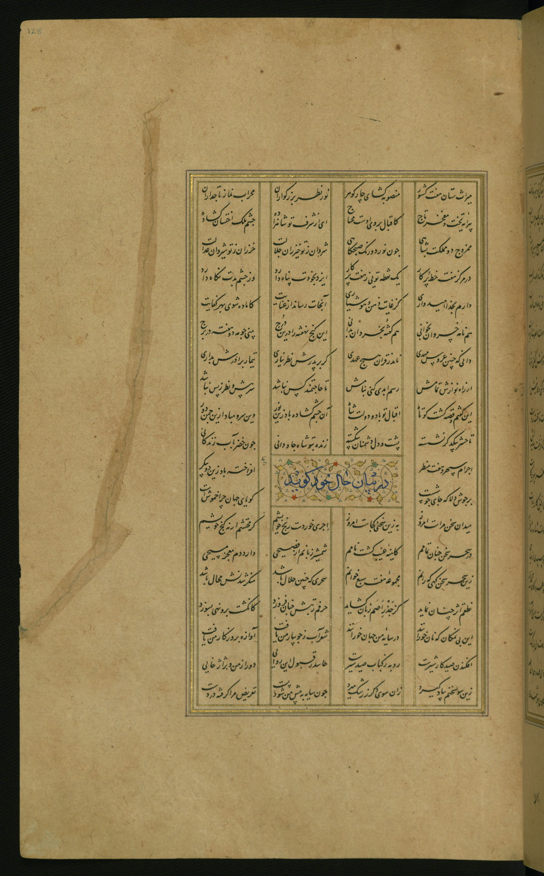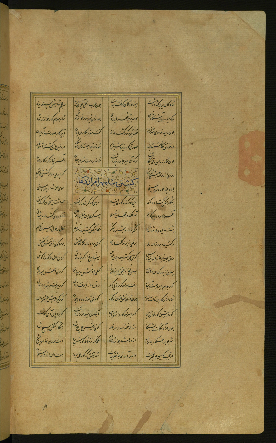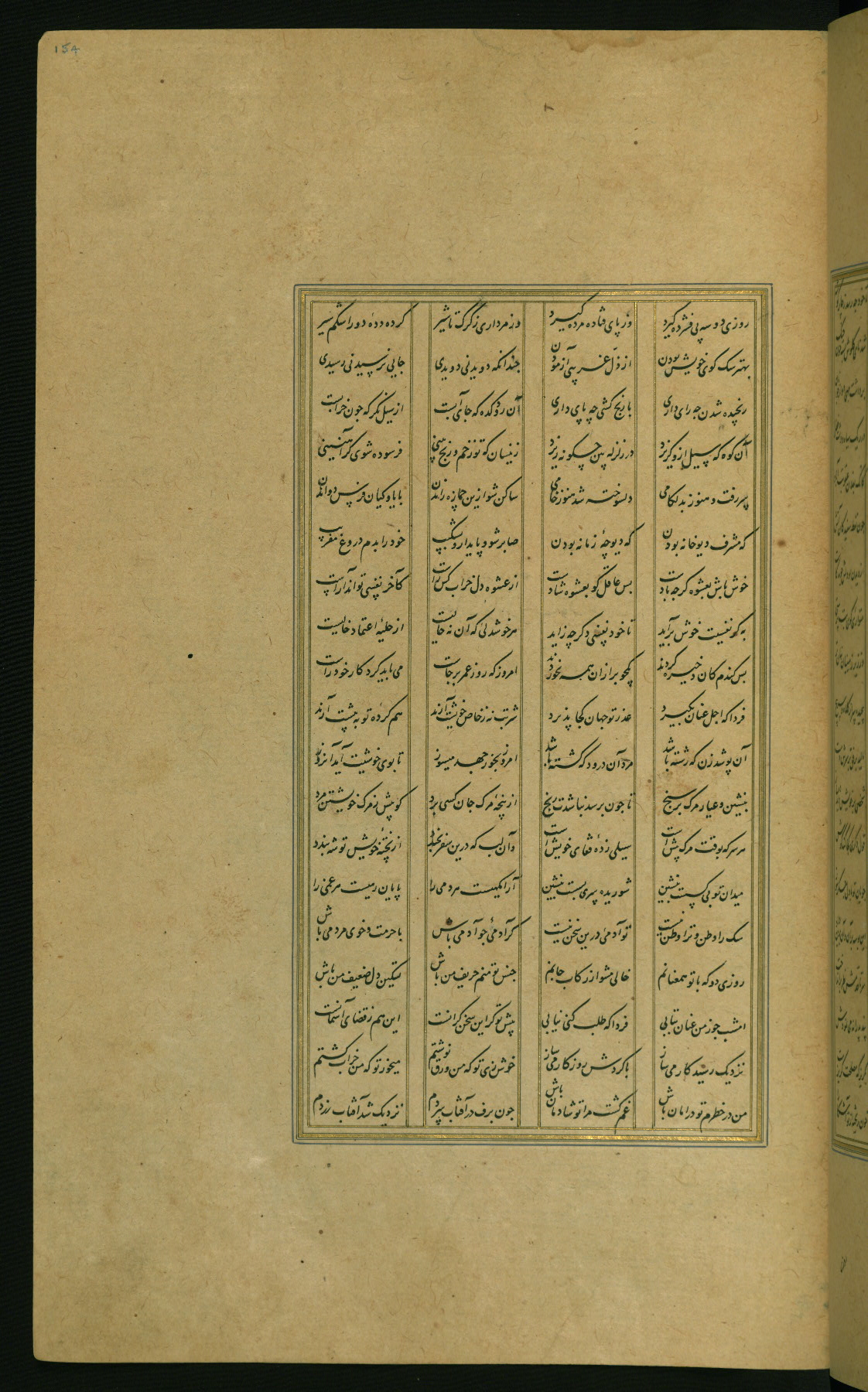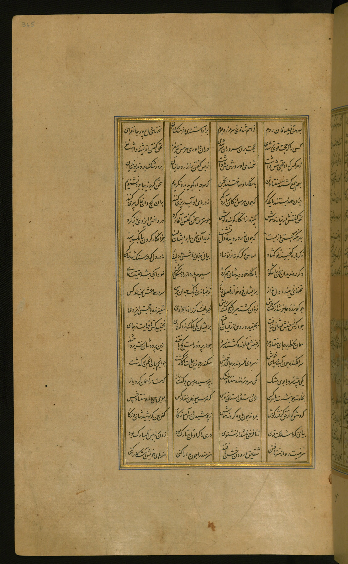 This illuminated and illustrated copy of the Khamsah (quintet) of Niẓāmī Ganjavī (d. 605 AH / 1209 CE) was written by Yār Muḥammad al-Haravī in 922 AH / 1516 CE. Written in four columns in black nastaʿlīq script, this manuscript opens with a double-page illuminated frontispiece signed by ʿAbd al-Wahhāb ibn ʿAbd al-Fattāḥ ibn ʿAlī. It contains thirty-five illustrations that were repainted in India during the twelfth century AH / eighteenth CE. The seal of Muḥammad Asharf ibn Muḥammad Khātam al-Ḥusaynī, dated 1173 AH / 1759-60 CE appears on fols. 1a and 401a. It is possible that the brown leather binding with center and side panels brushed with gold is original to the manuscript but was repaired at a later stage in the codex's history.