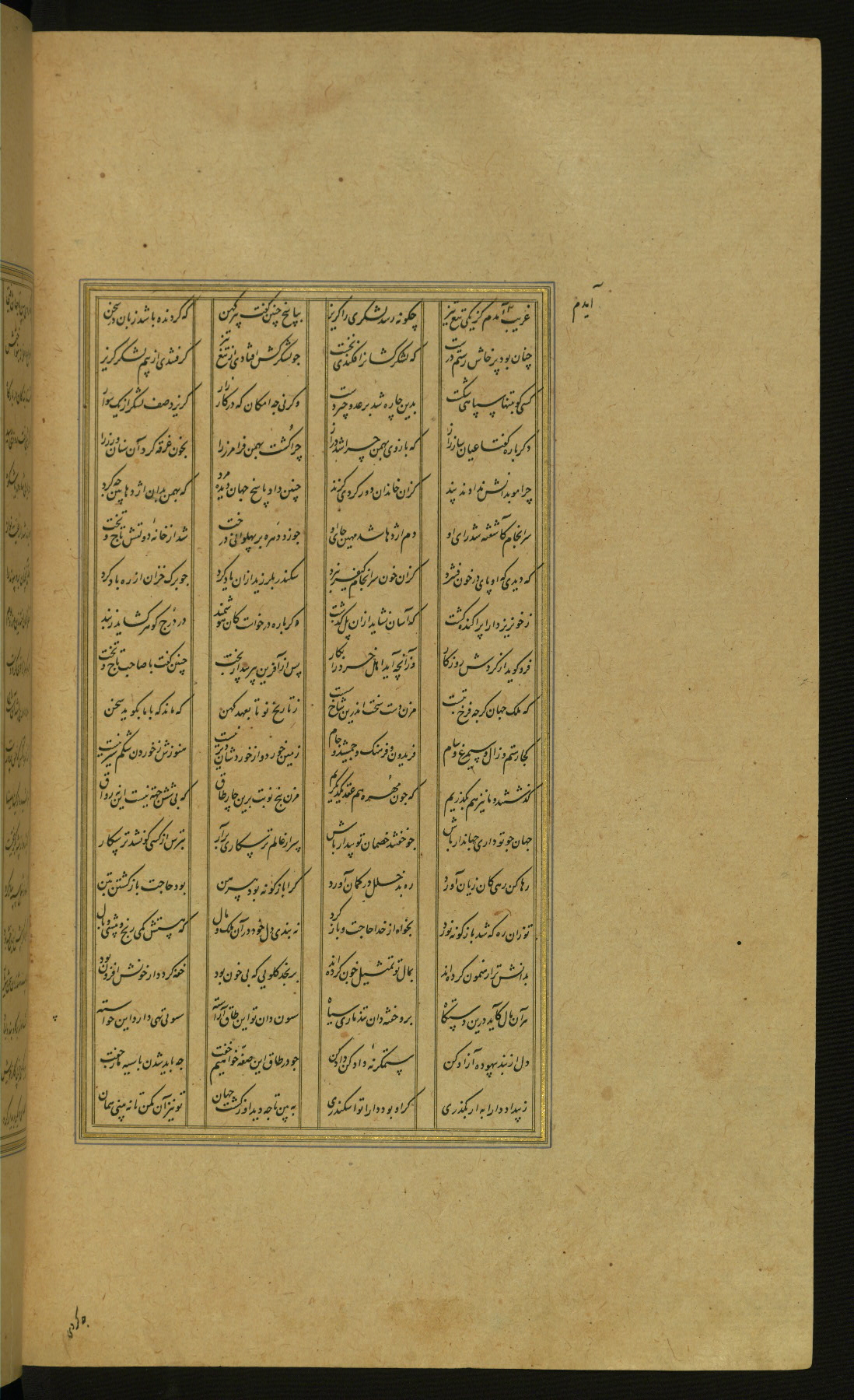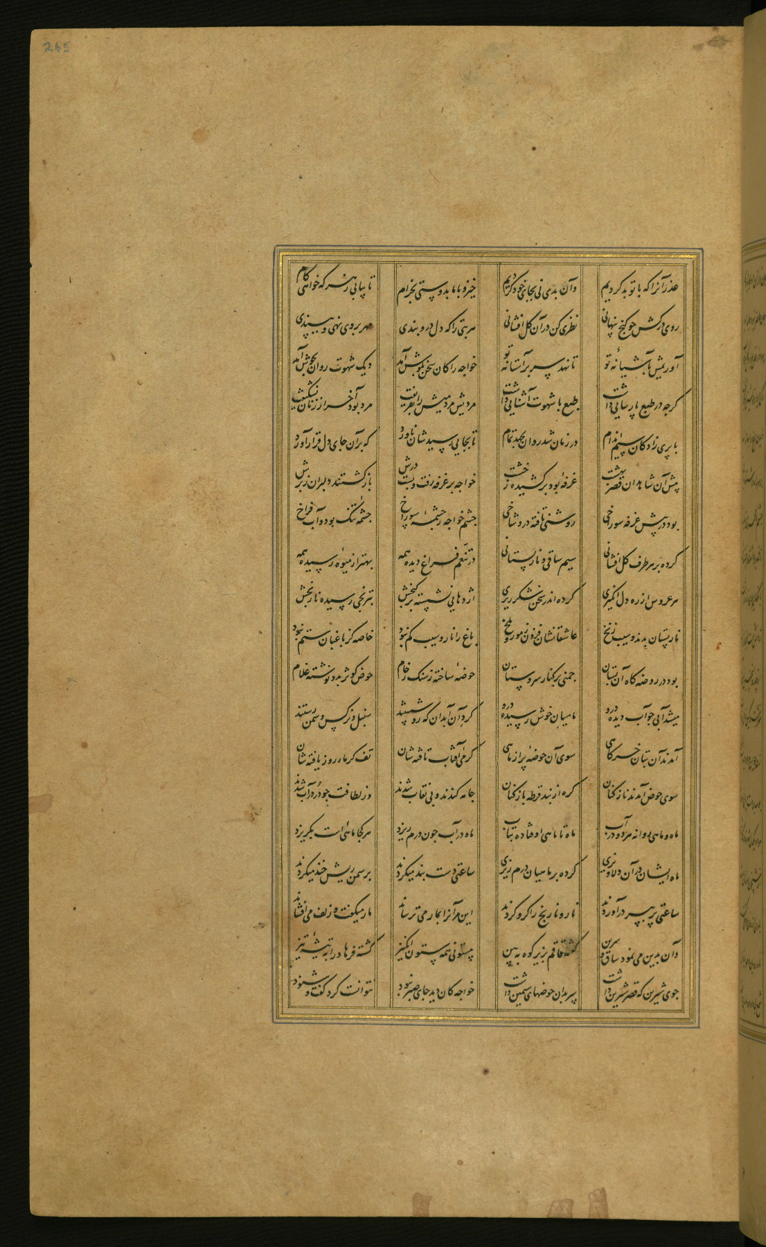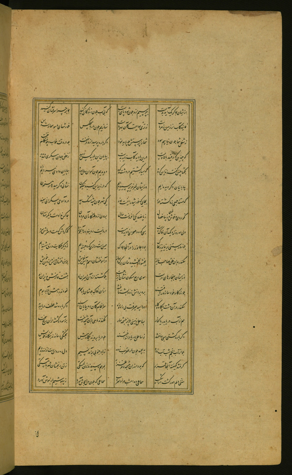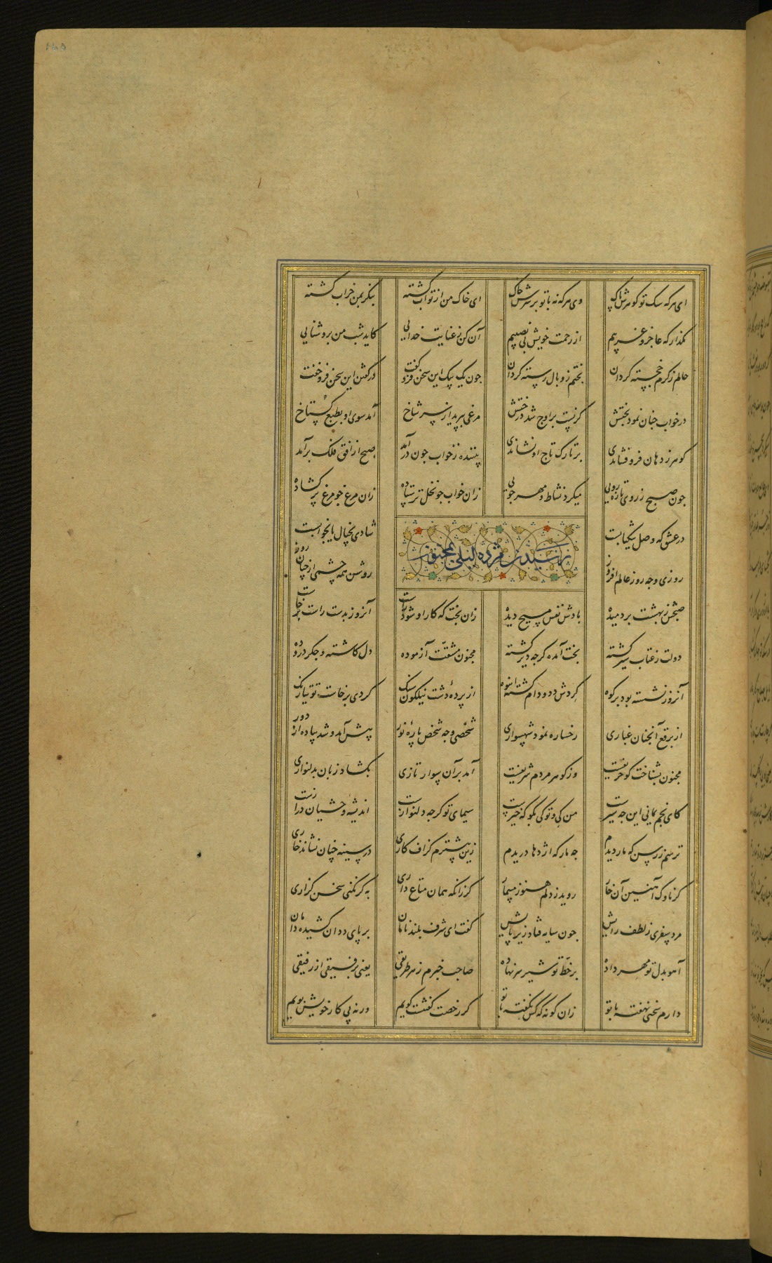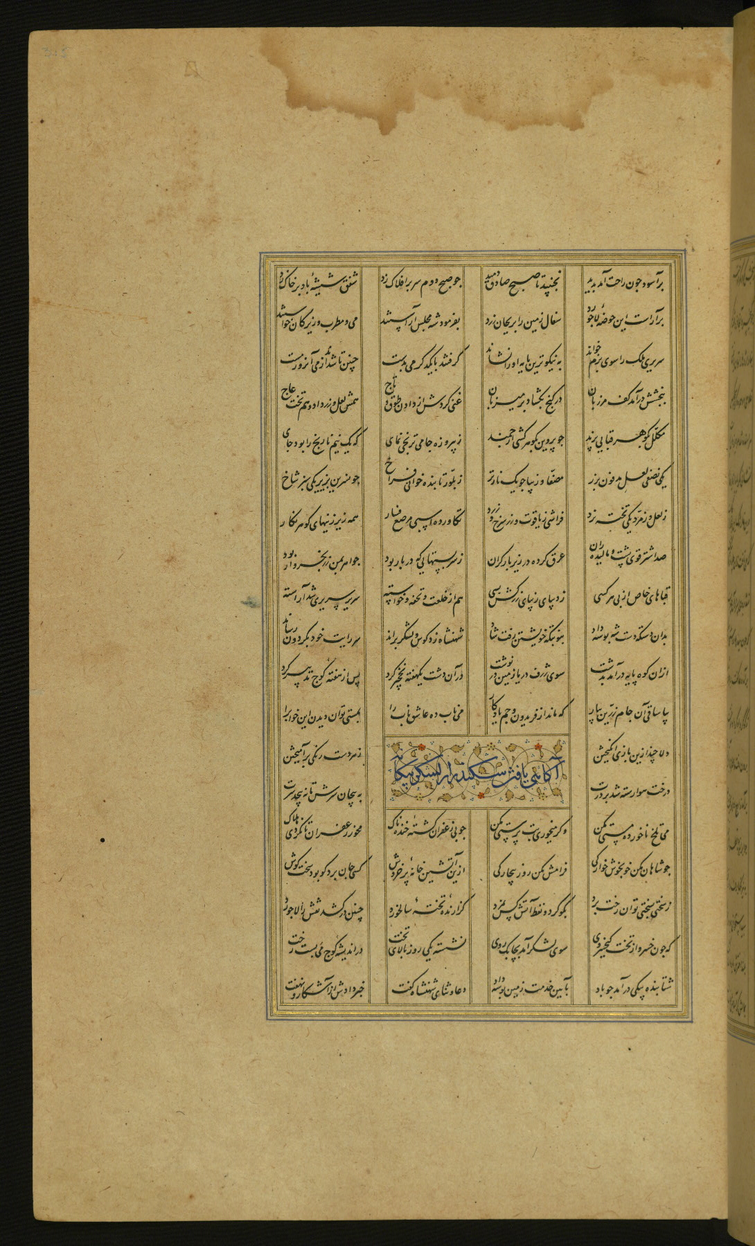 This illuminated and illustrated copy of the Khamsah (quintet) of Niẓāmī Ganjavī (d. 605 AH / 1209 CE) was written by Yār Muḥammad al-Haravī in 922 AH / 1516 CE. Written in four columns in black nastaʿlīq script, this manuscript opens with a double-page illuminated frontispiece signed by ʿAbd al-Wahhāb ibn ʿAbd al-Fattāḥ ibn ʿAlī. It contains thirty-five illustrations that were repainted in India during the twelfth century AH / eighteenth CE. The seal of Muḥammad Asharf ibn Muḥammad Khātam al-Ḥusaynī, dated 1173 AH / 1759-60 CE appears on fols. 1a and 401a. It is possible that the brown leather binding with center and side panels brushed with gold is original to the manuscript but was repaired at a later stage in the codex's history.