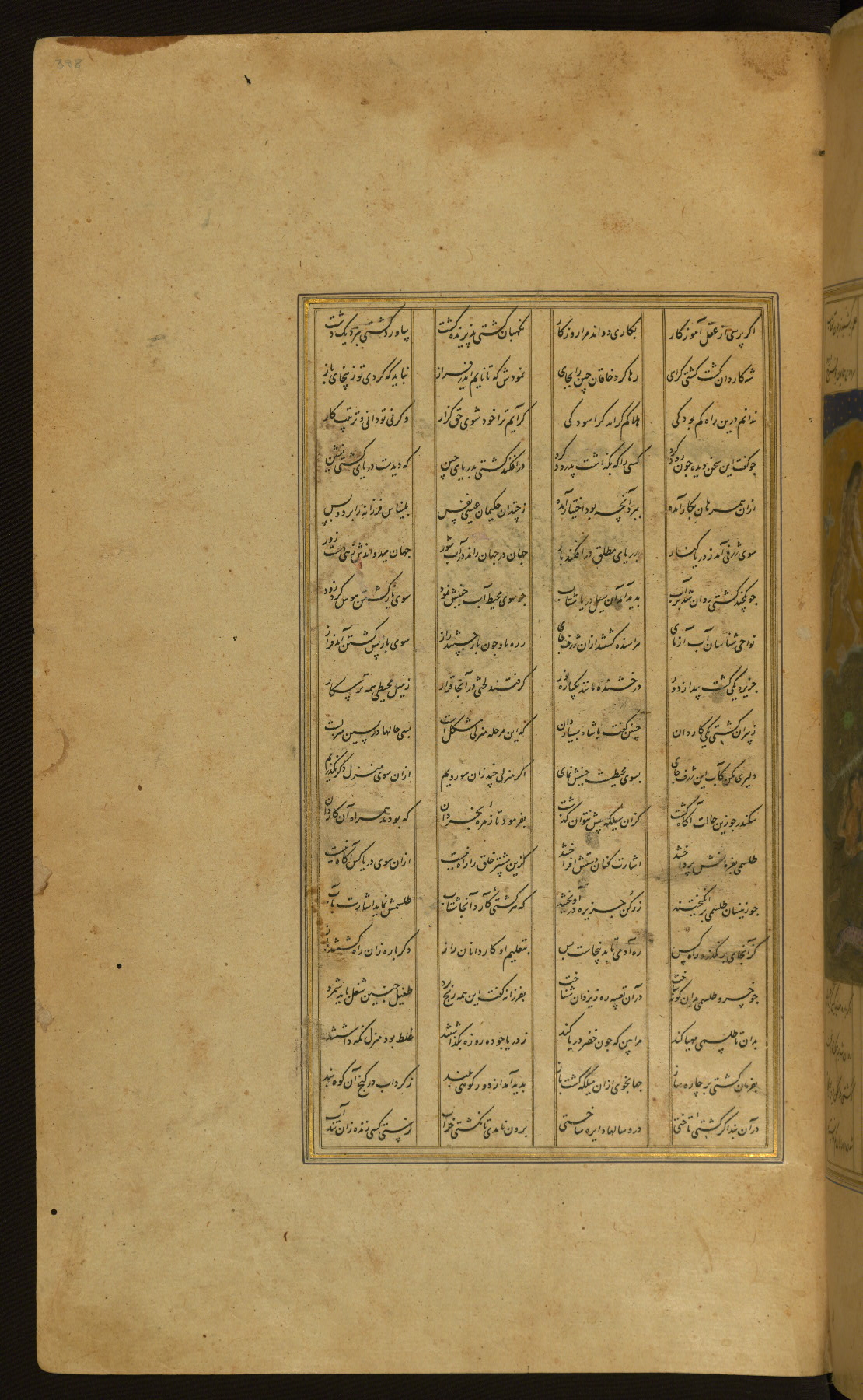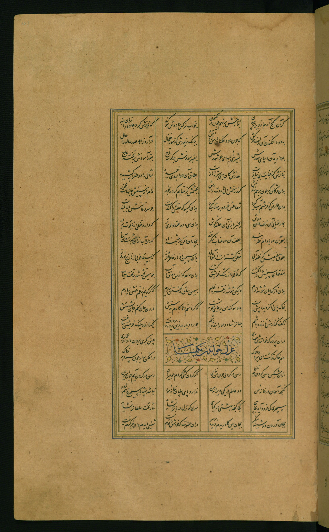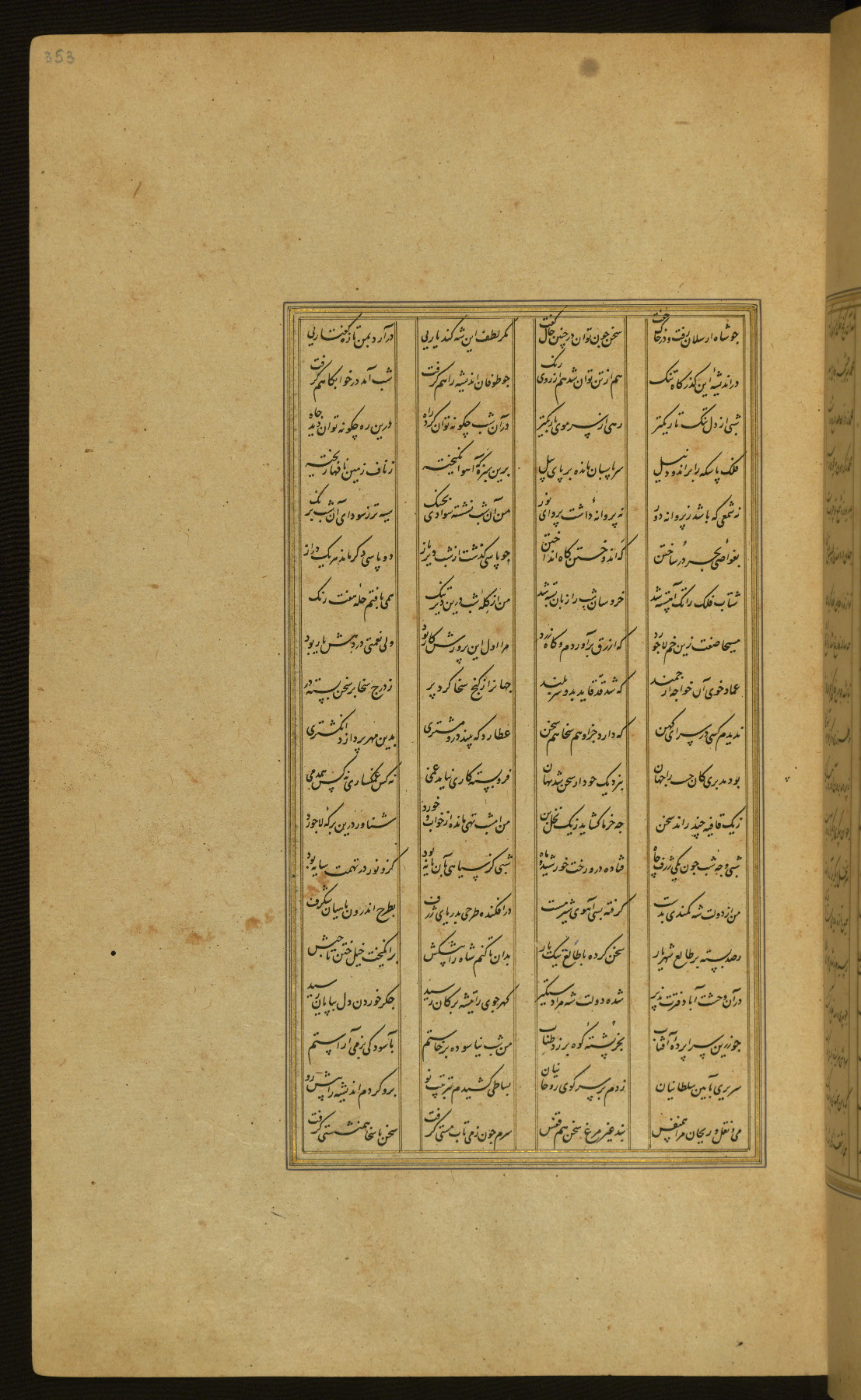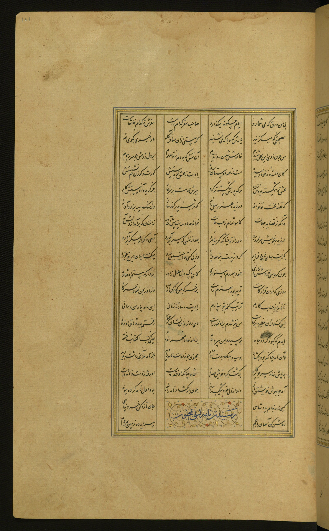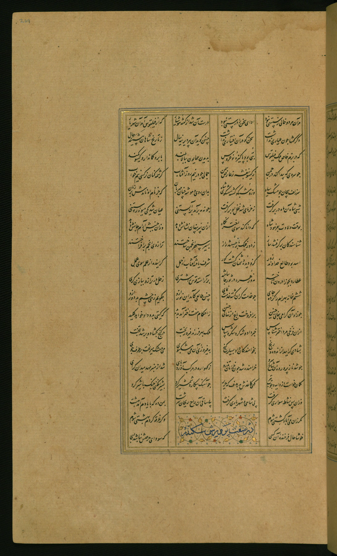 This illuminated and illustrated copy of the Khamsah (quintet) of Niẓāmī Ganjavī (d. 605 AH / 1209 CE) was written by Yār Muḥammad al-Haravī in 922 AH / 1516 CE. Written in four columns in black nastaʿlīq script, this manuscript opens with a double-page illuminated frontispiece signed by ʿAbd al-Wahhāb ibn ʿAbd al-Fattāḥ ibn ʿAlī. It contains thirty-five illustrations that were repainted in India during the twelfth century AH / eighteenth CE. The seal of Muḥammad Asharf ibn Muḥammad Khātam al-Ḥusaynī, dated 1173 AH / 1759-60 CE appears on fols. 1a and 401a. It is possible that the brown leather binding with center and side panels brushed with gold is original to the manuscript but was repaired at a later stage in the codex's history.